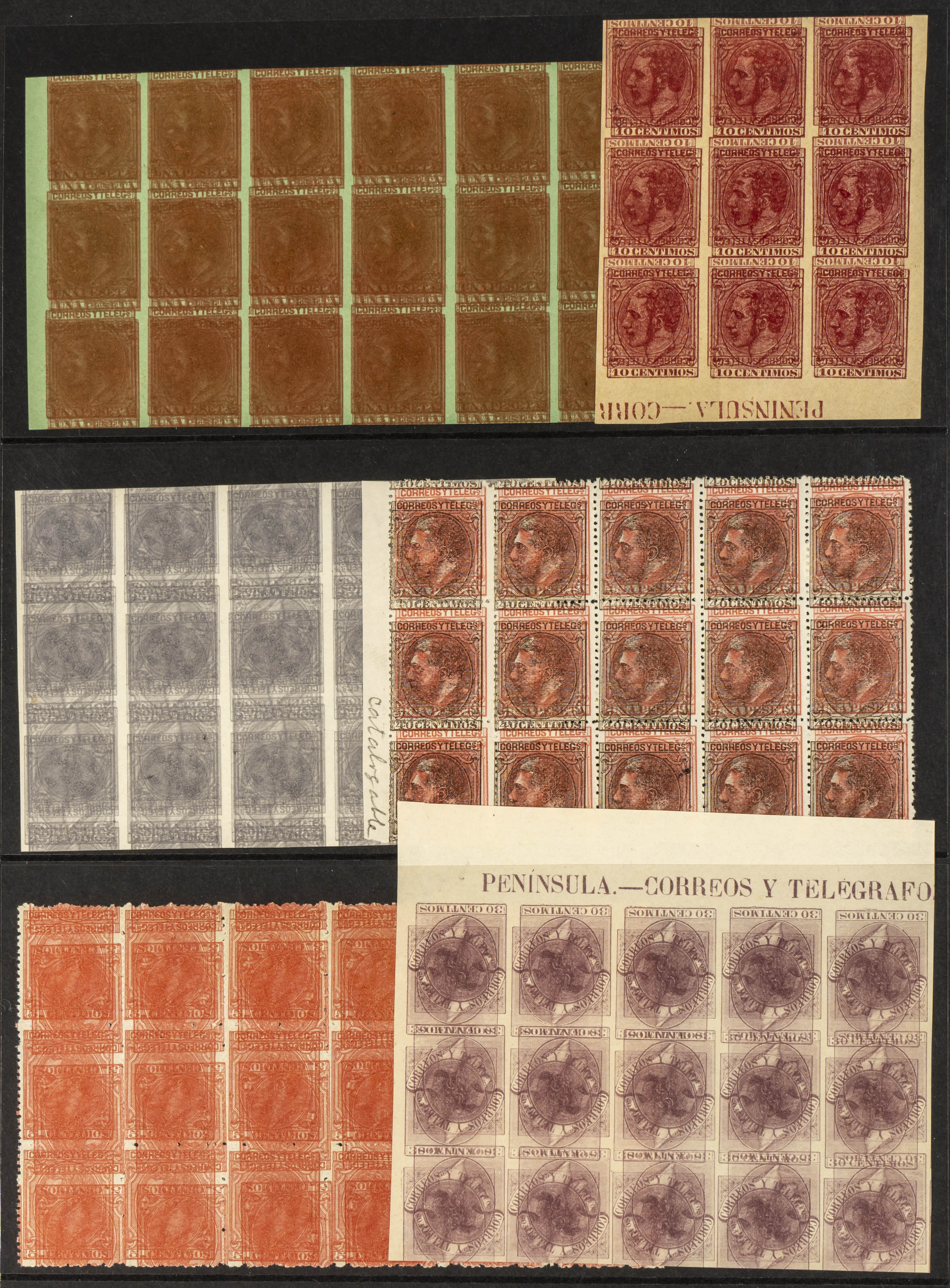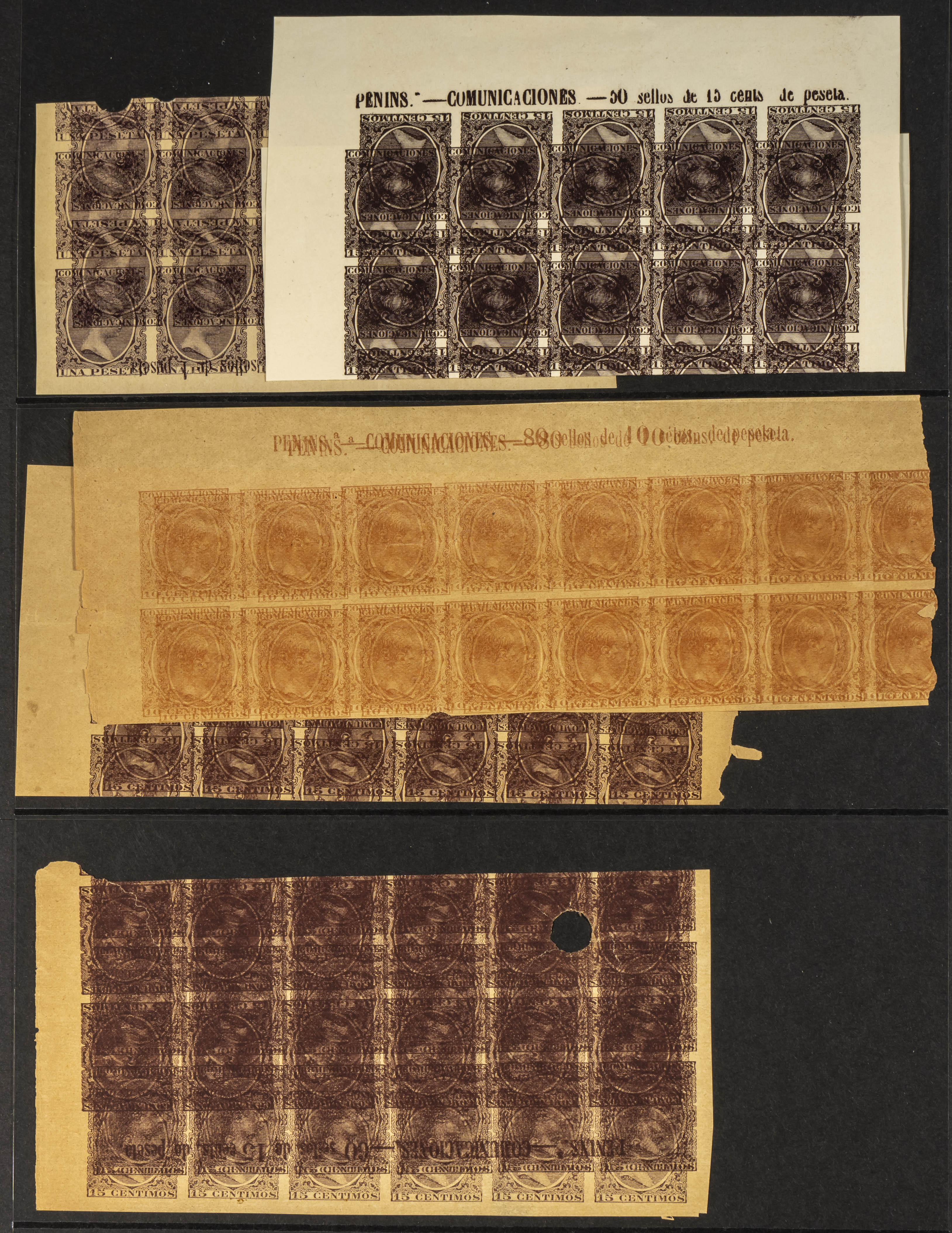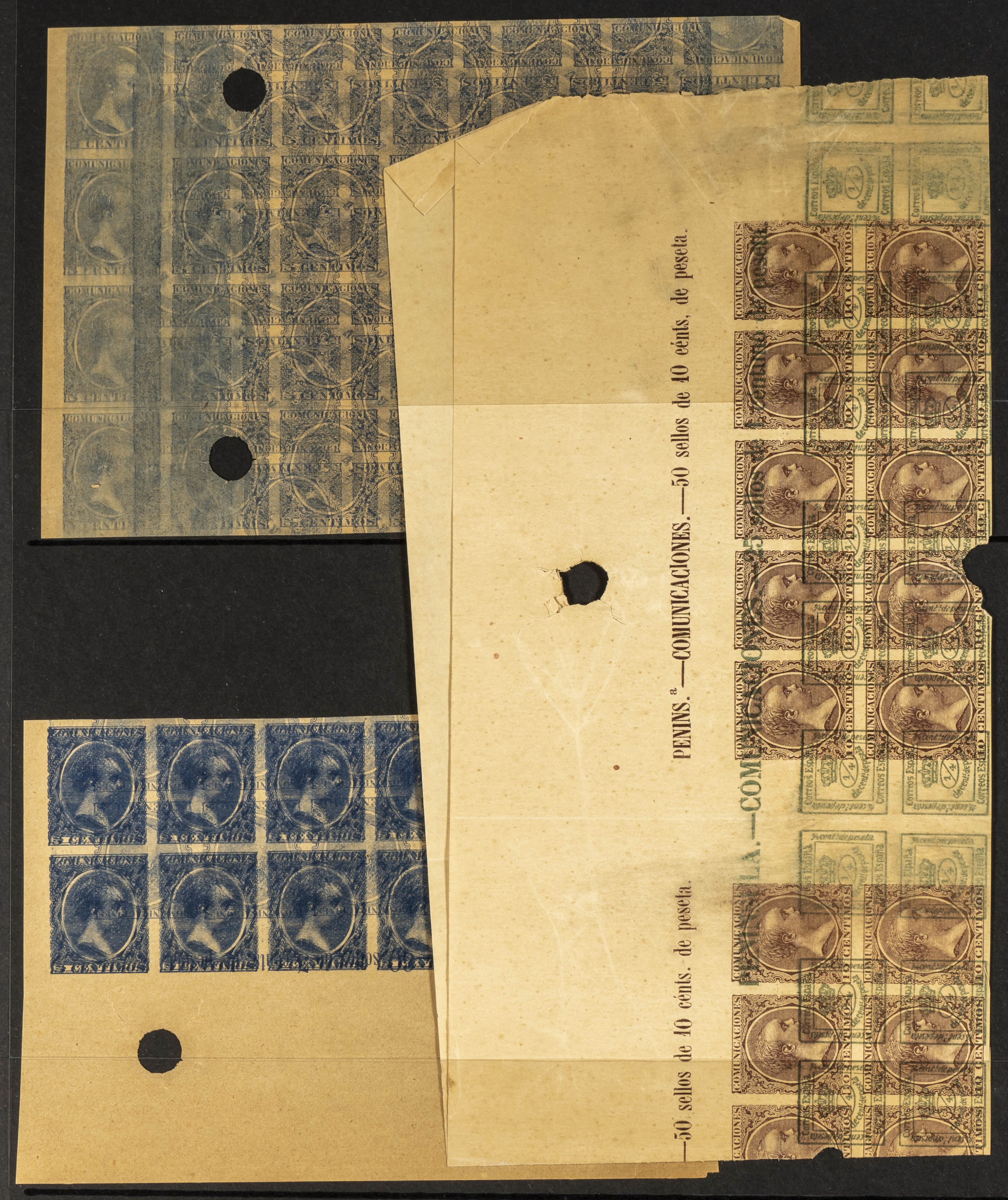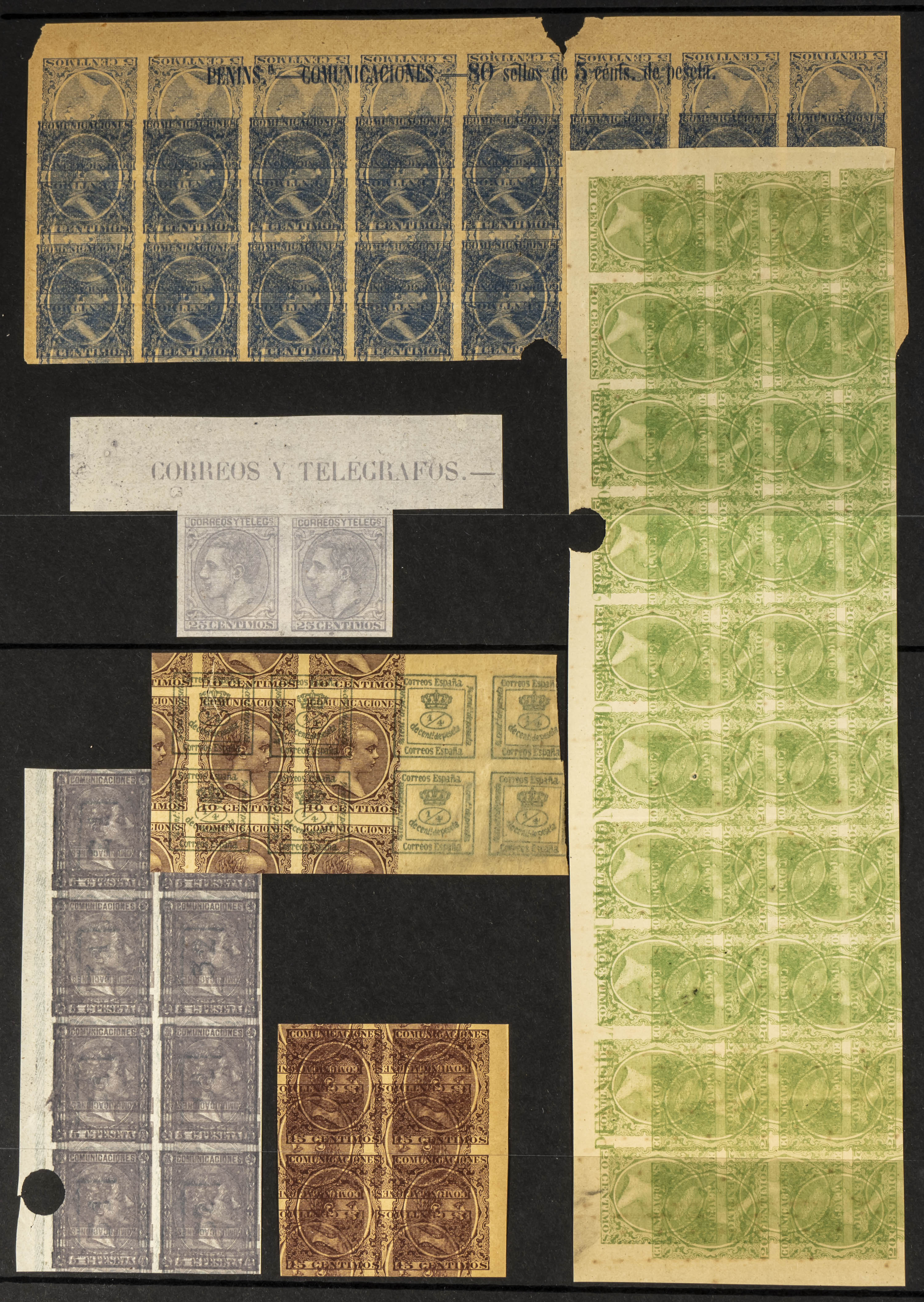 (★)(1875ca). An interesting and spectacular collection of Maculaturas from the issues of Alfonso XII (issues of 1875, 1878, and 1882) and Alfonso XIII (Pelón issue). It includes large blocks, perforated, imperforate, impressions from different issues and values, etc., many with sheet headers. A MUST-SEE.