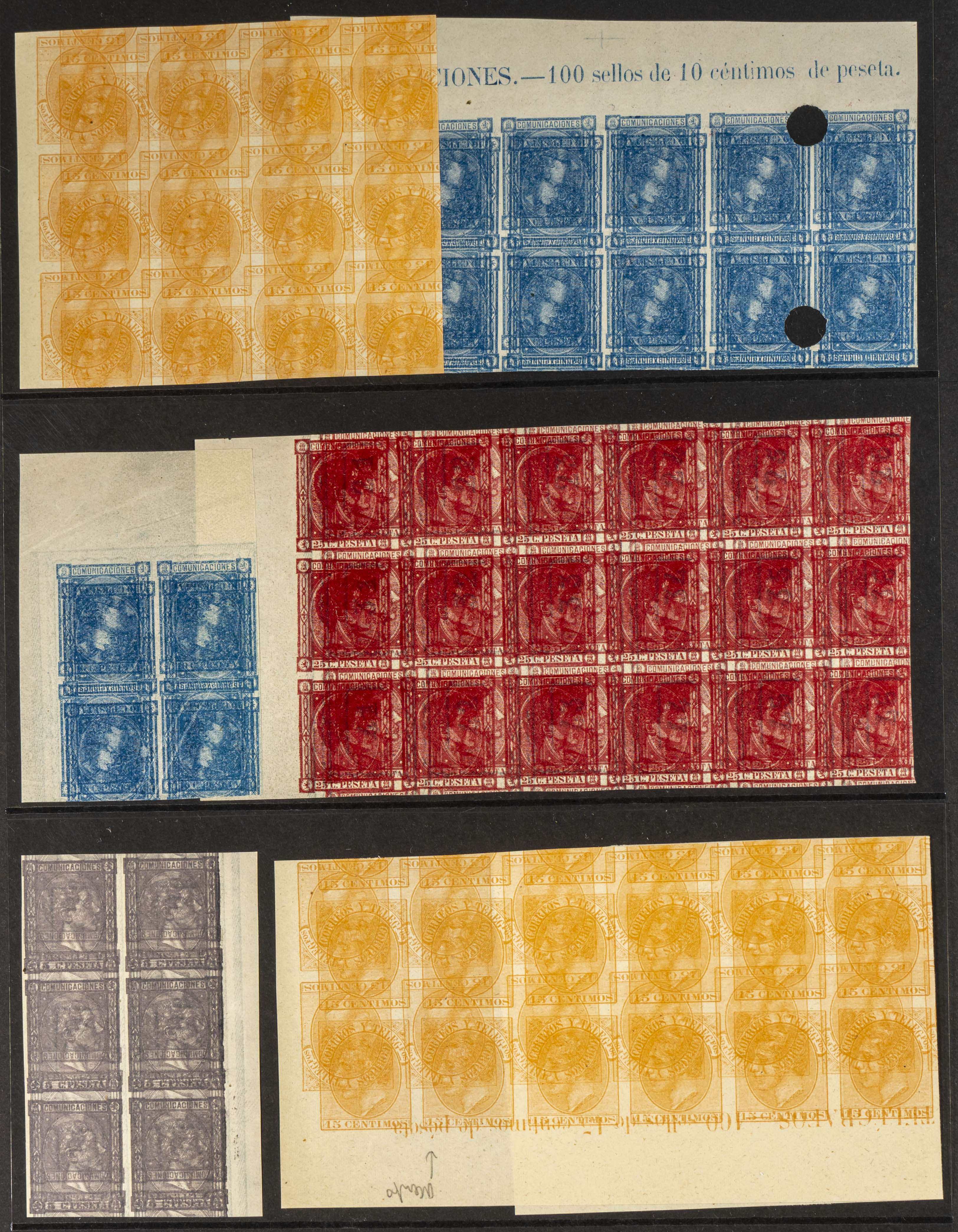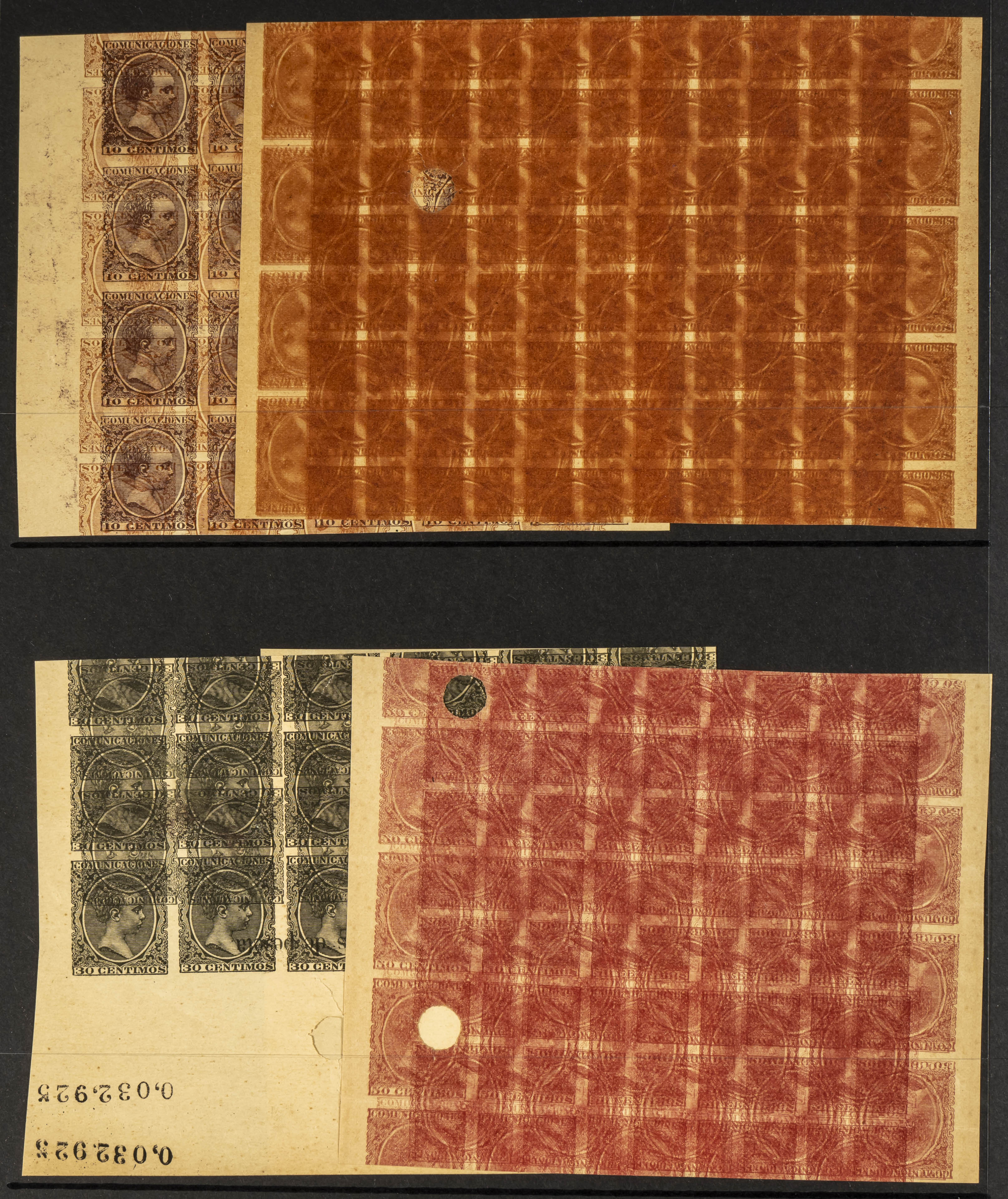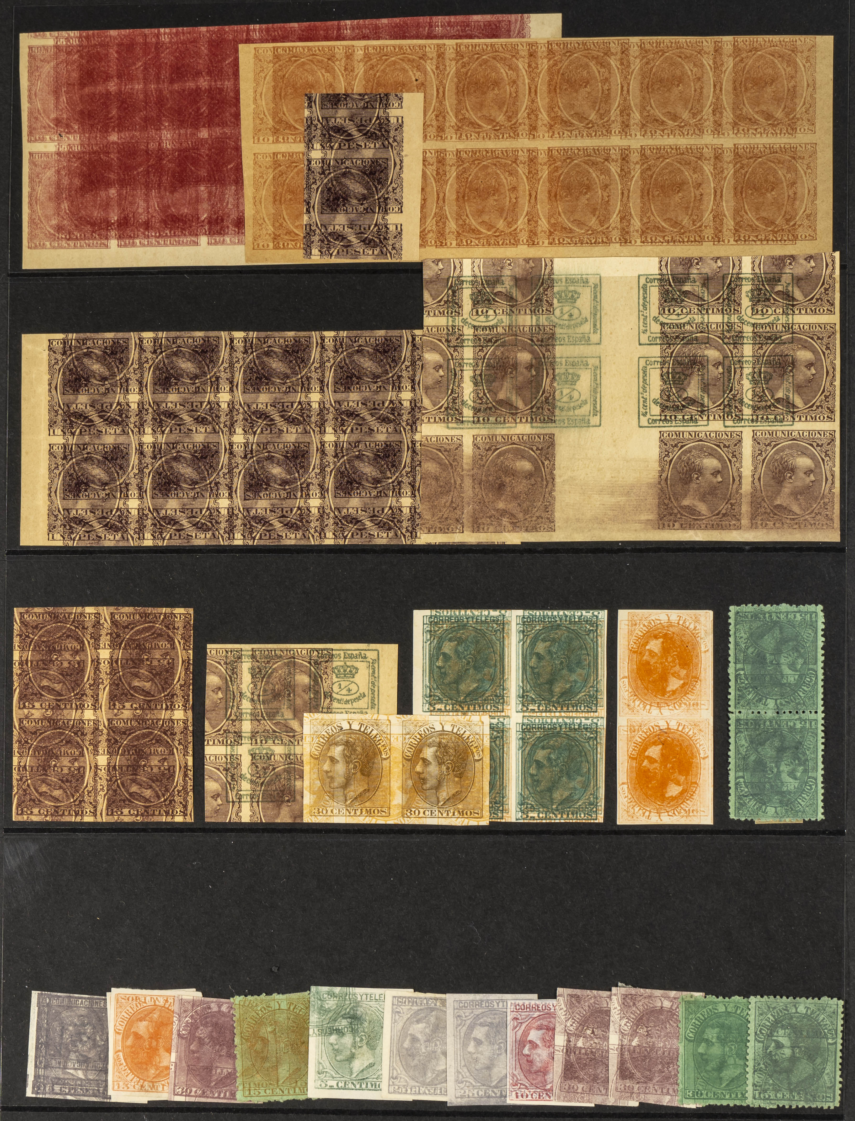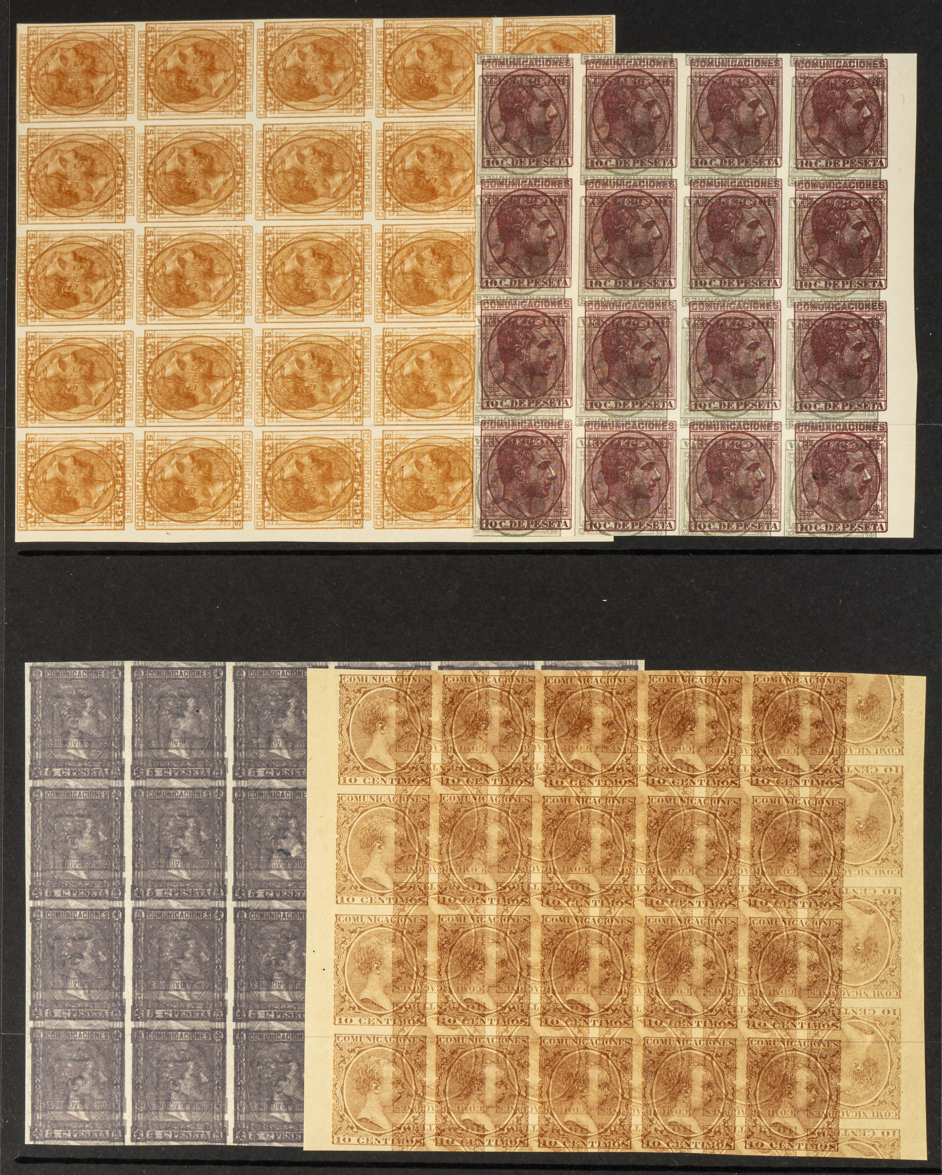 (★)(1875ca). An interesting and spectacular collection of Maculaturas from the issues of Alfonso XII (issues of 1875, 1878, and 1882) and Alfonso XIII (Pelón issue). It includes large blocks, perforated, imperforate, impressions from different issues and values, etc., many with sheet headers. A MUST-SEE.