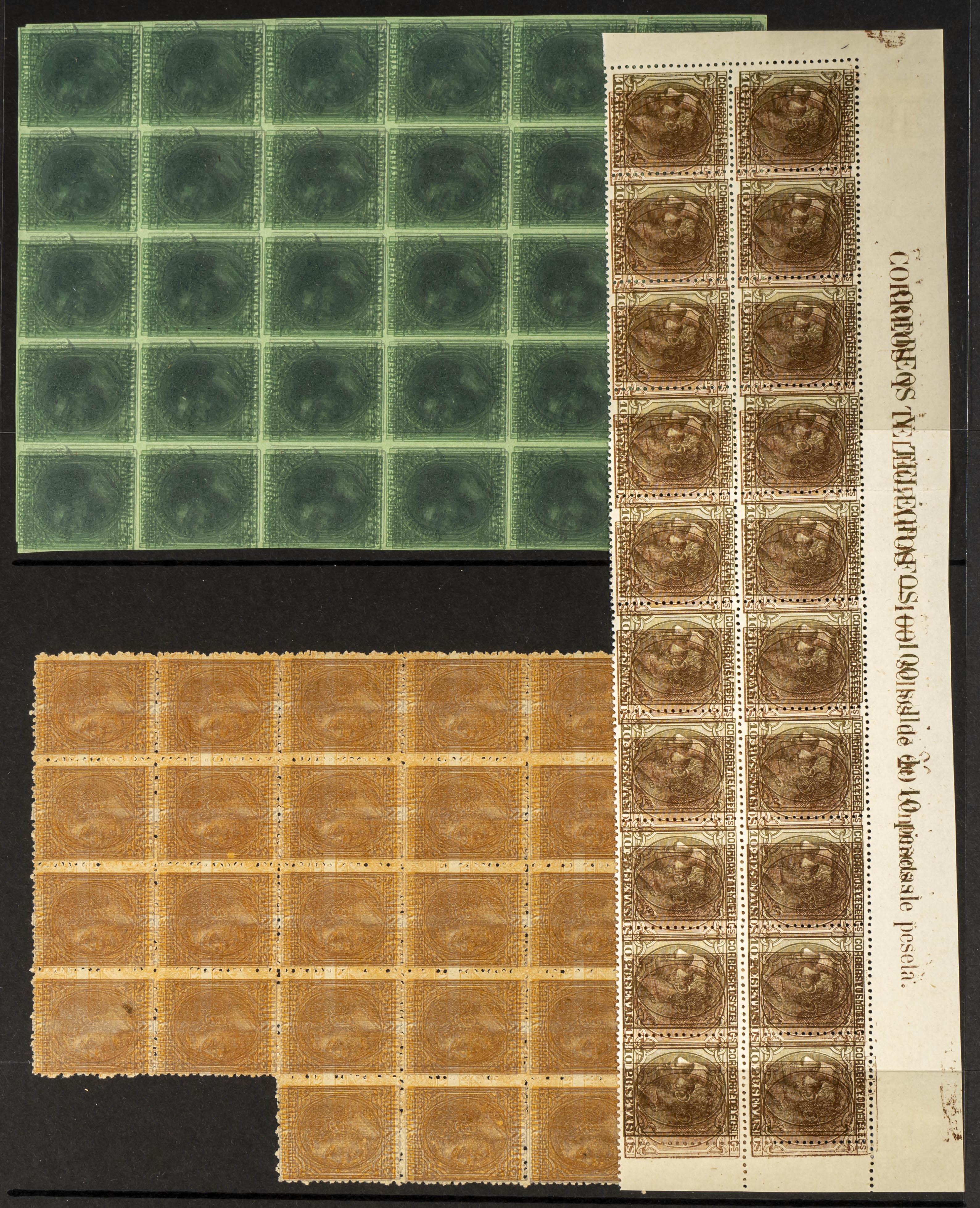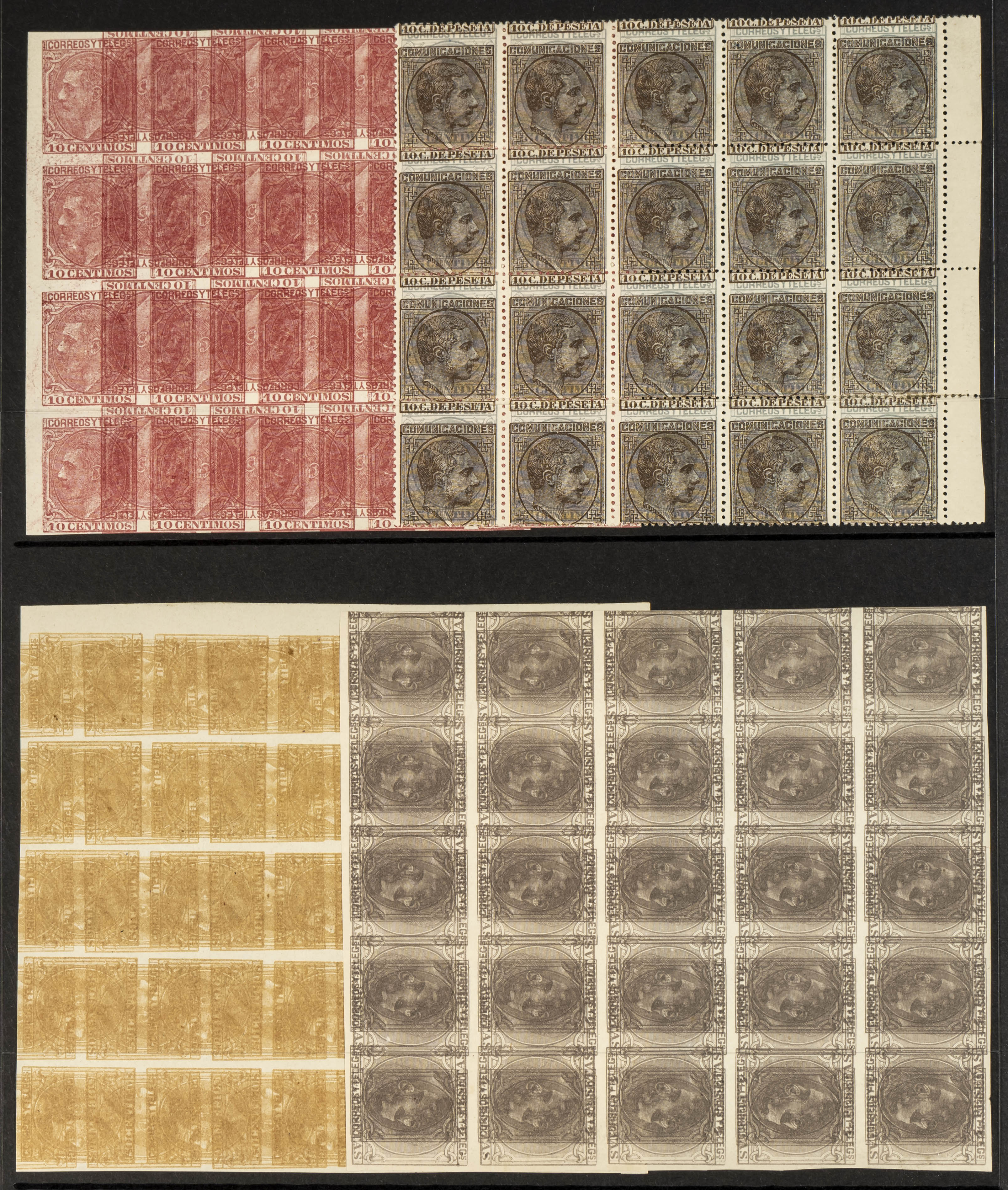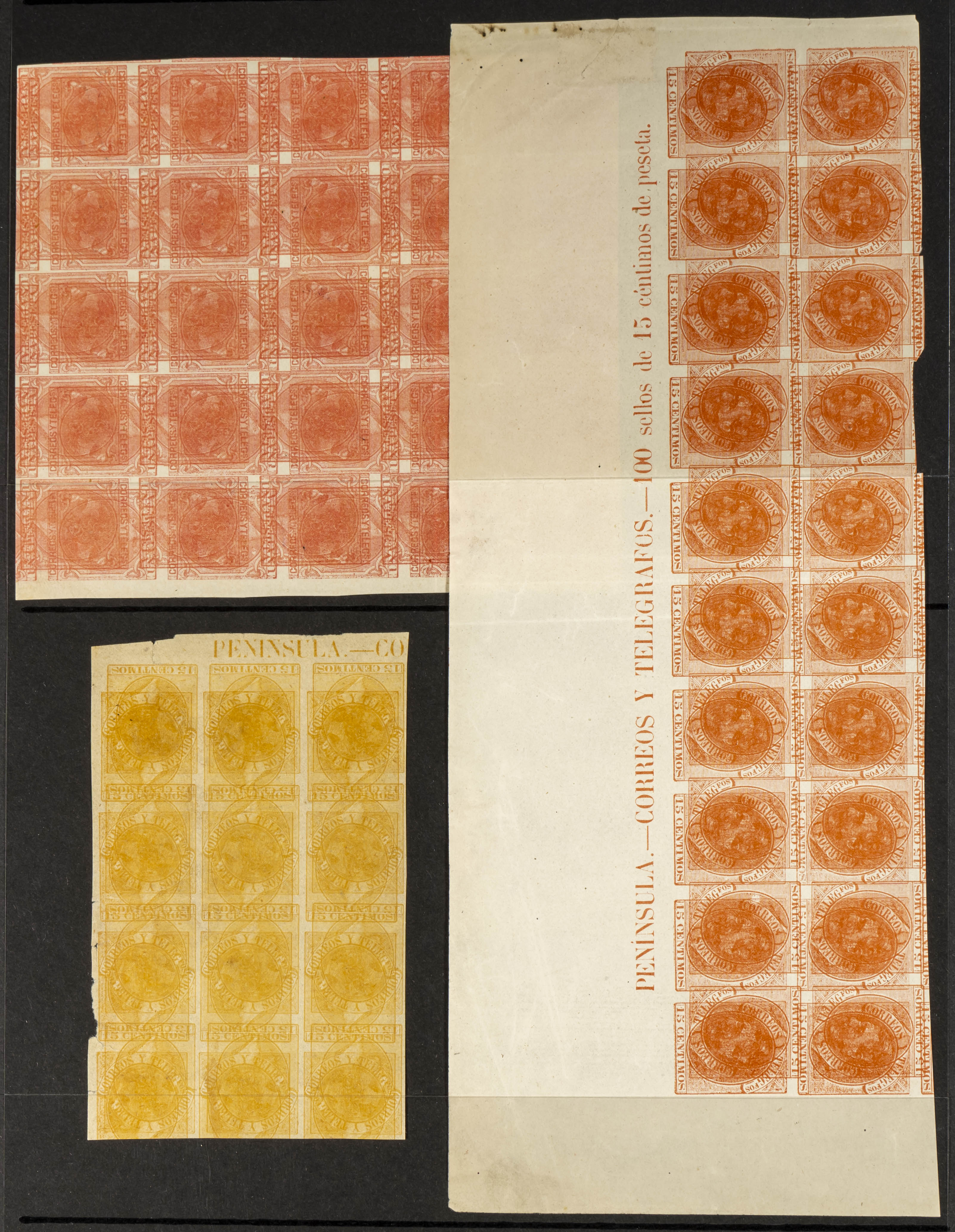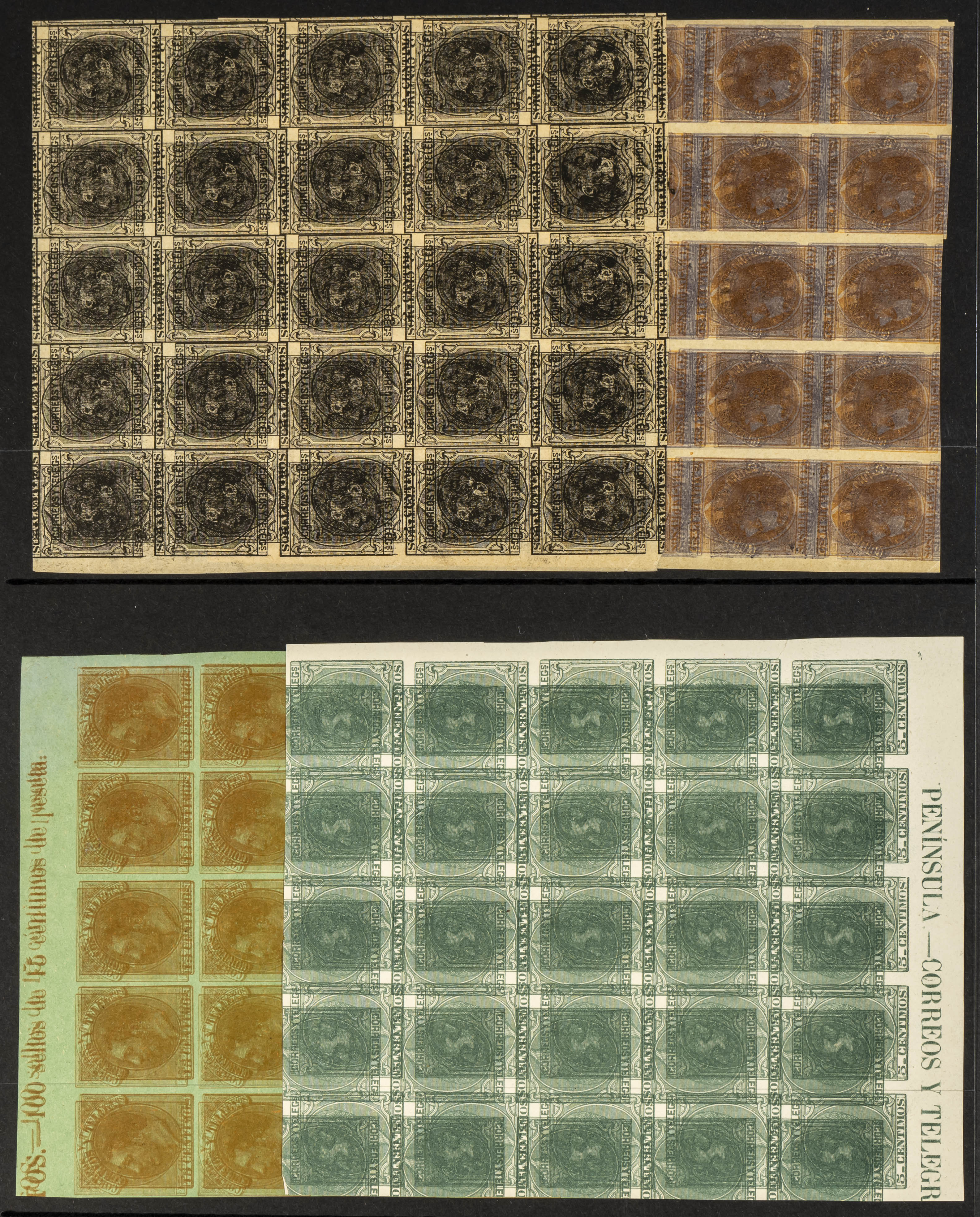 (★)(1875ca). An interesting and spectacular collection of Maculaturas from the issues of Alfonso XII (issues of 1875, 1878, and 1882) and Alfonso XIII (Pelón issue). It includes large blocks, perforated, imperforate, impressions from different issues and values, etc., many with sheet headers. A MUST-SEE.