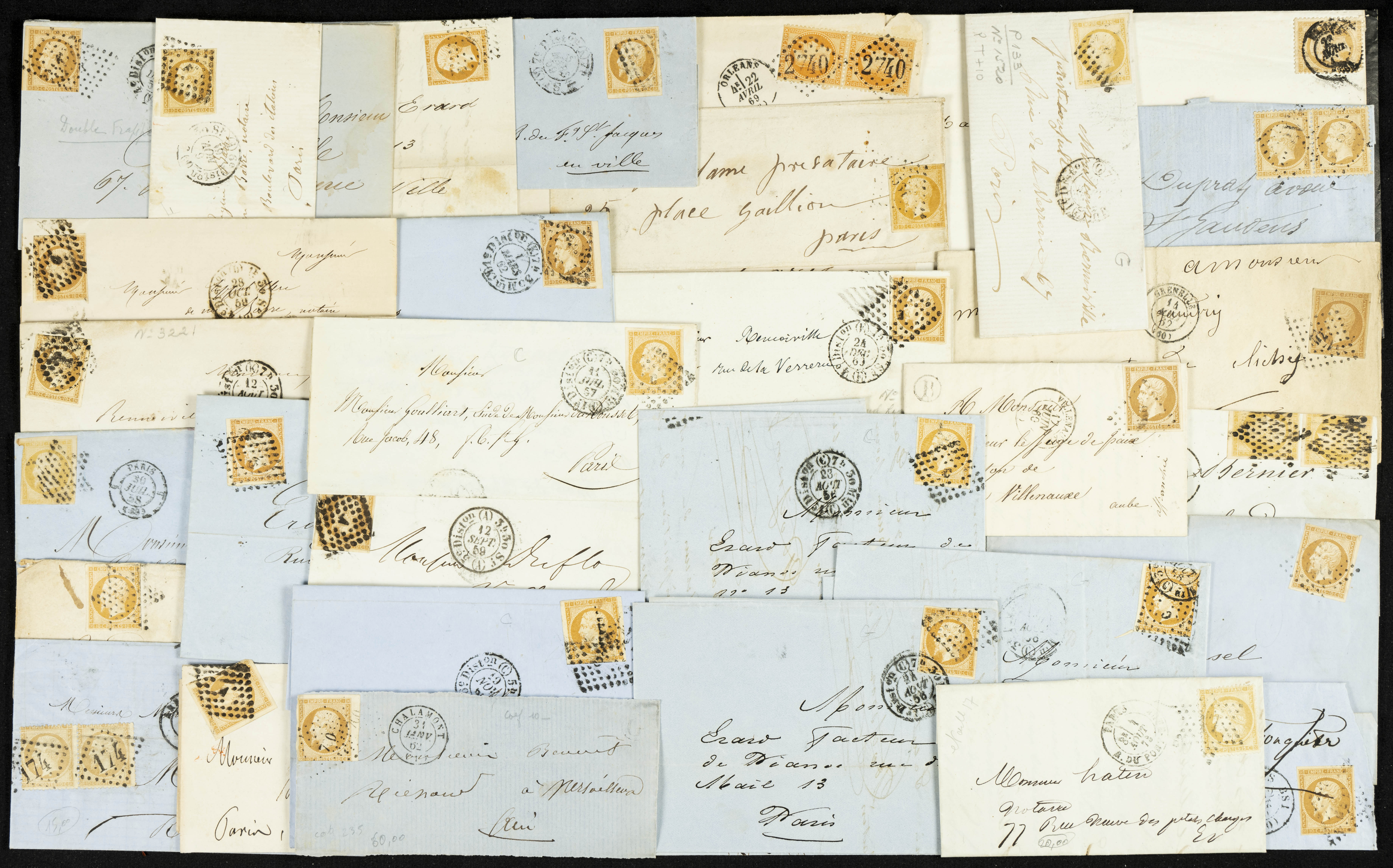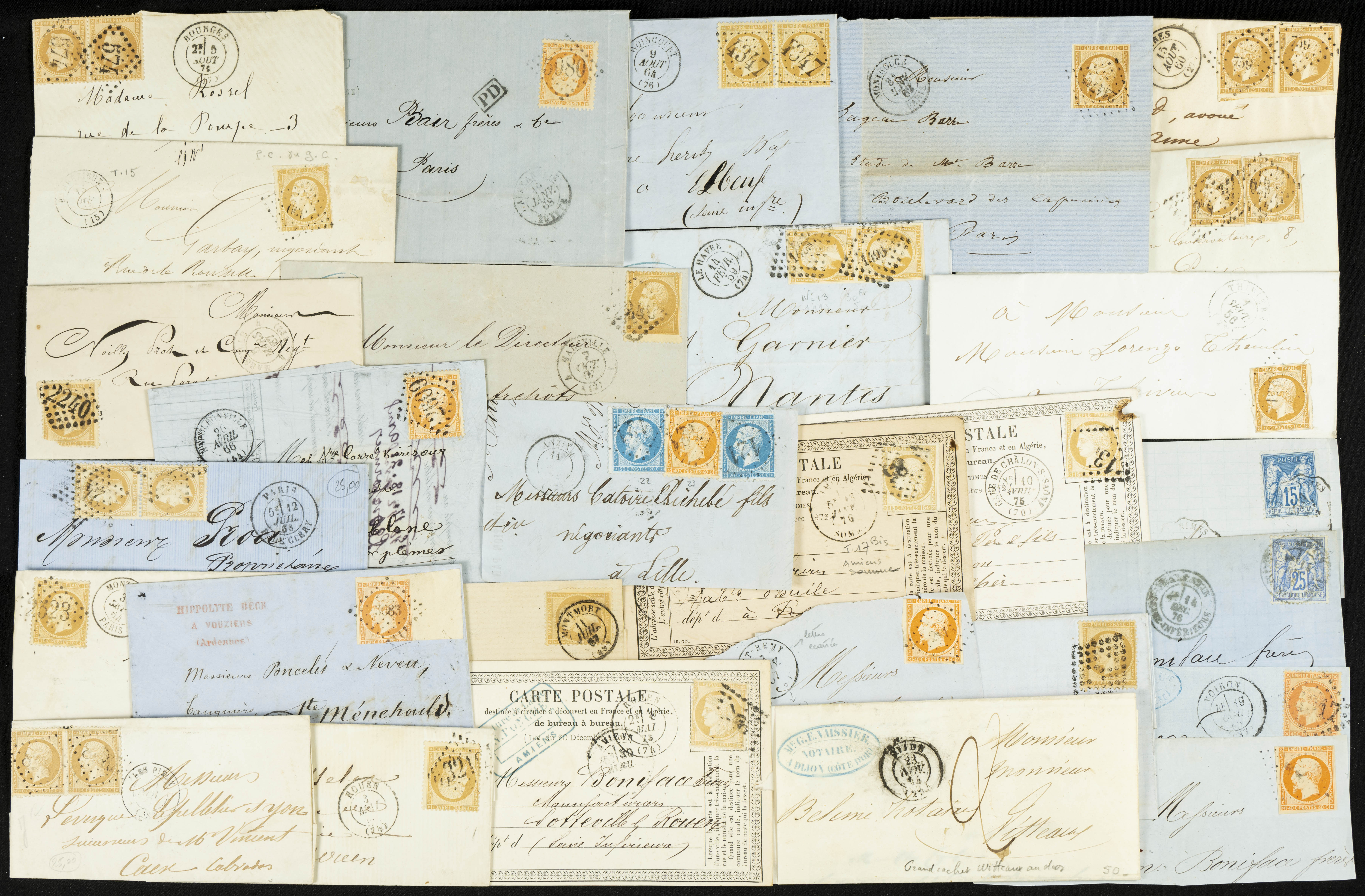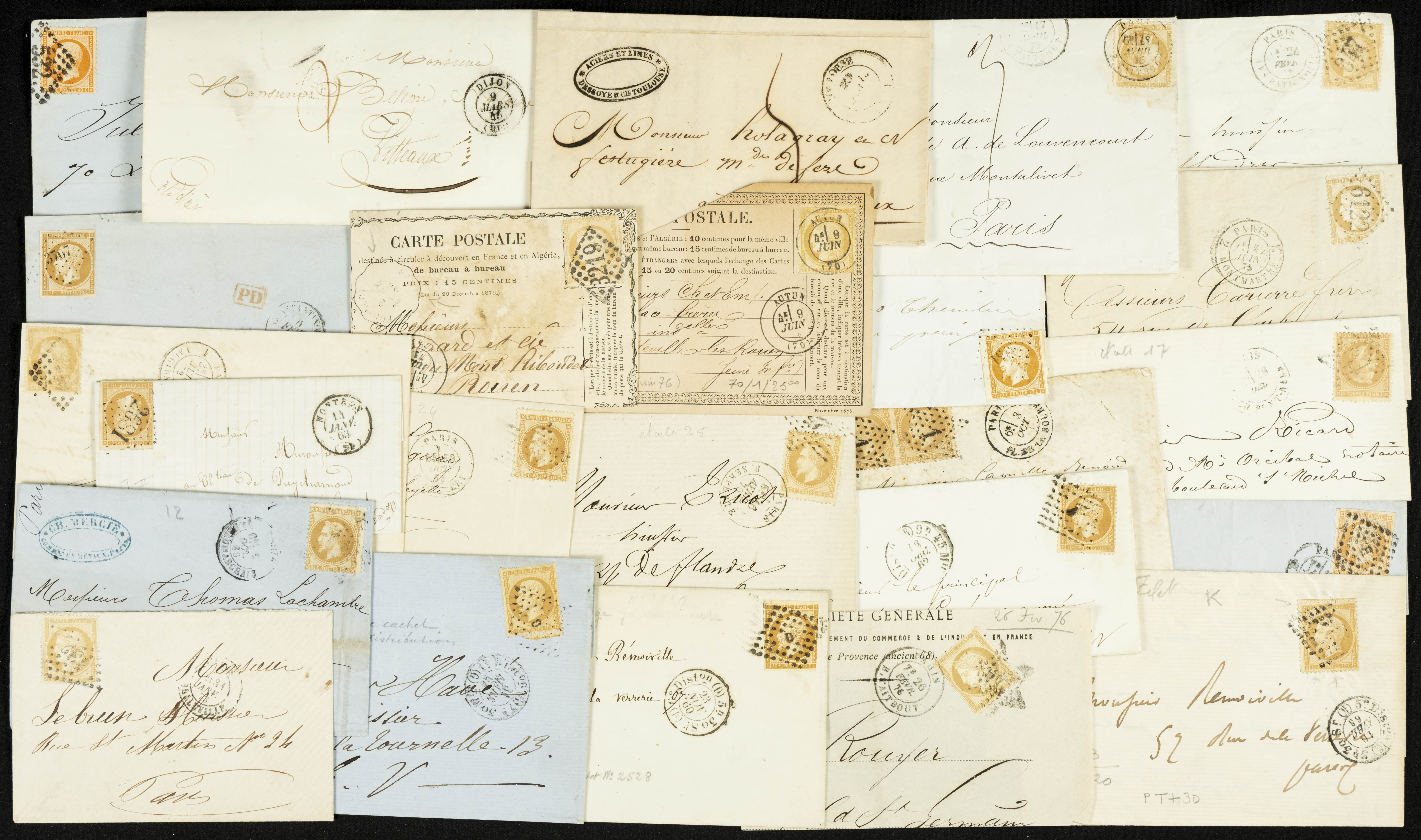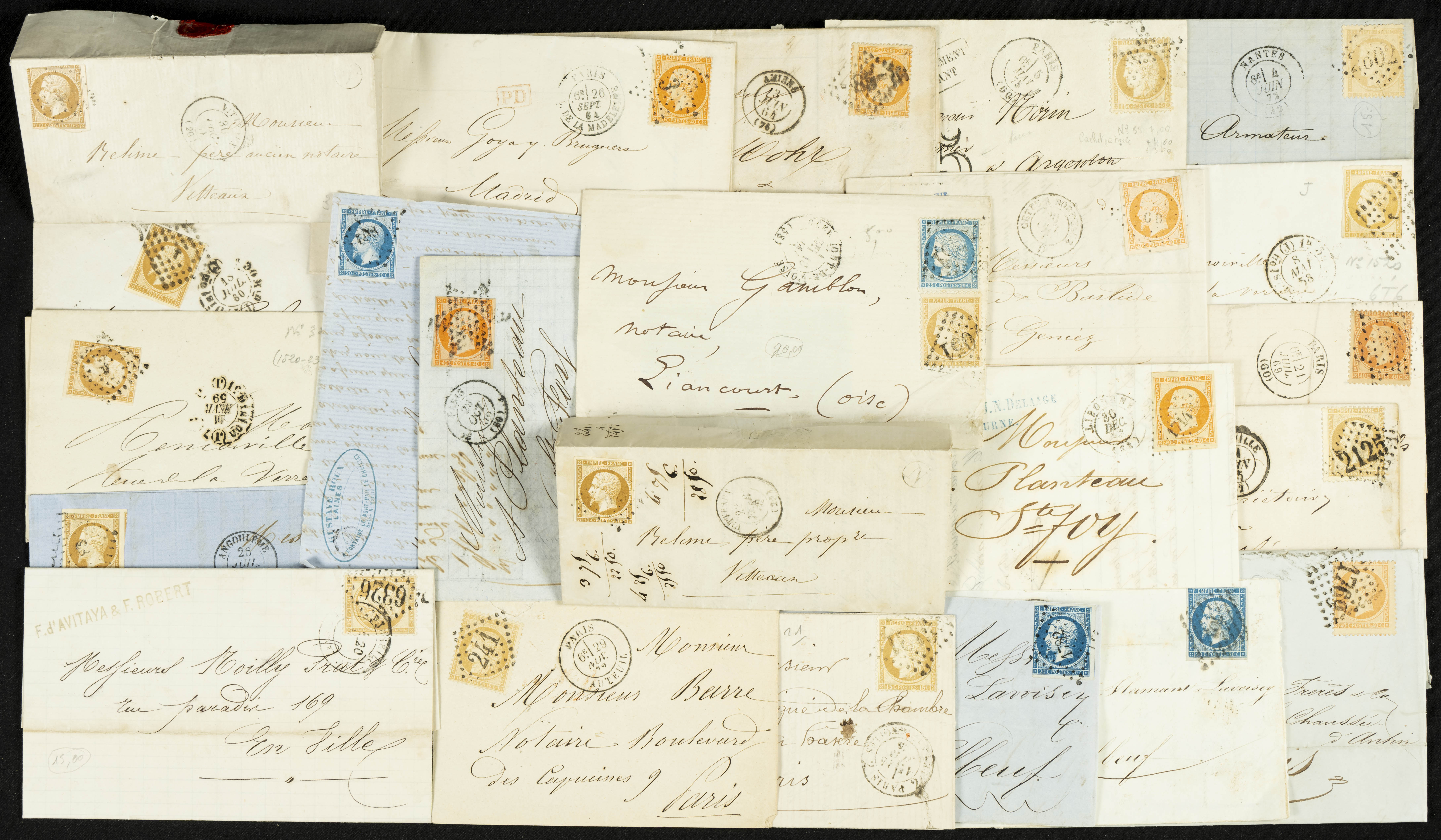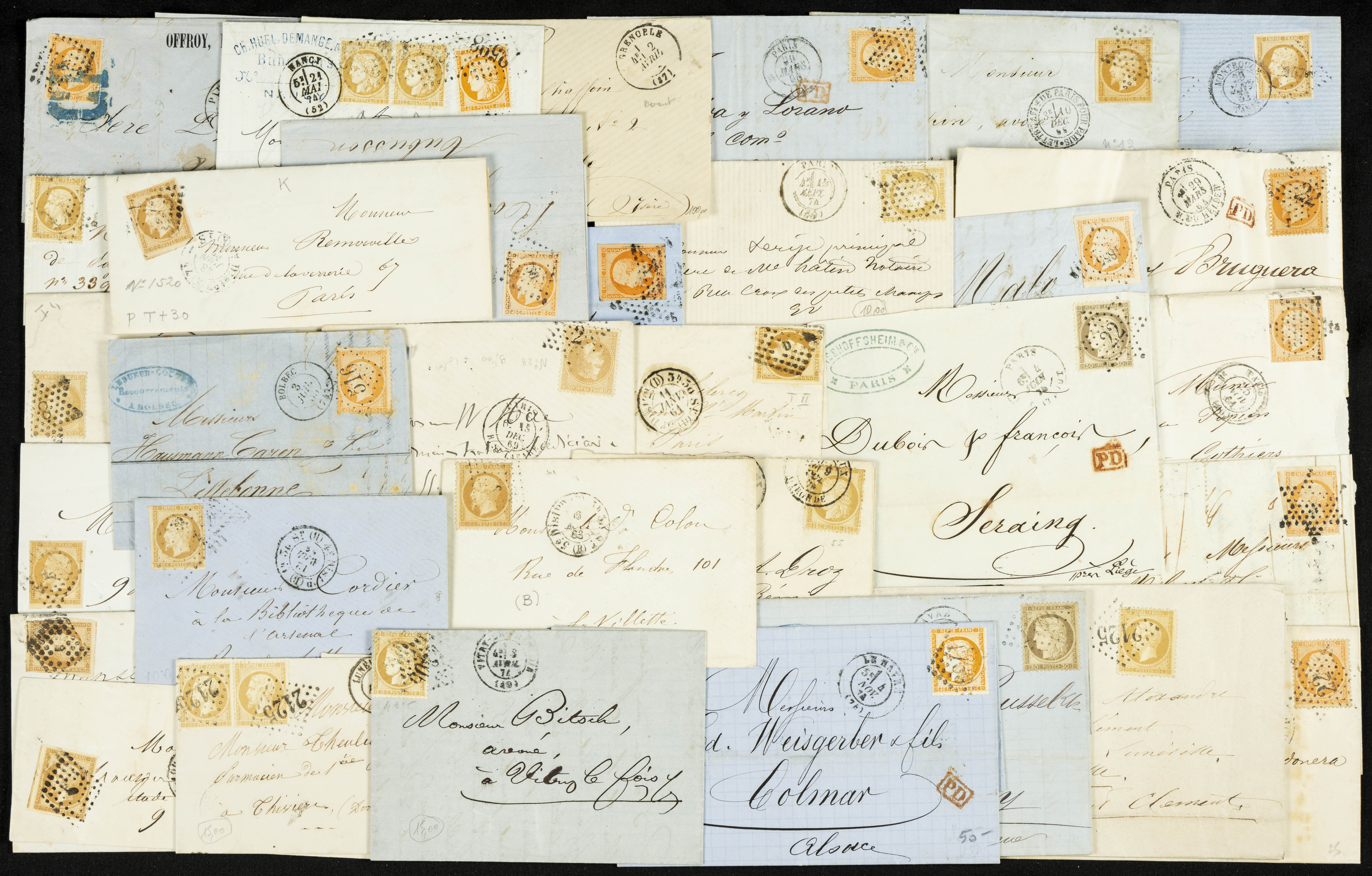 English (circa 1845). An interesting collection of over one hundred and thirty letters and fronts from France circulated between 1845 and 1874, including some postcards and fragments of various issues. TO BE EXAMINED.