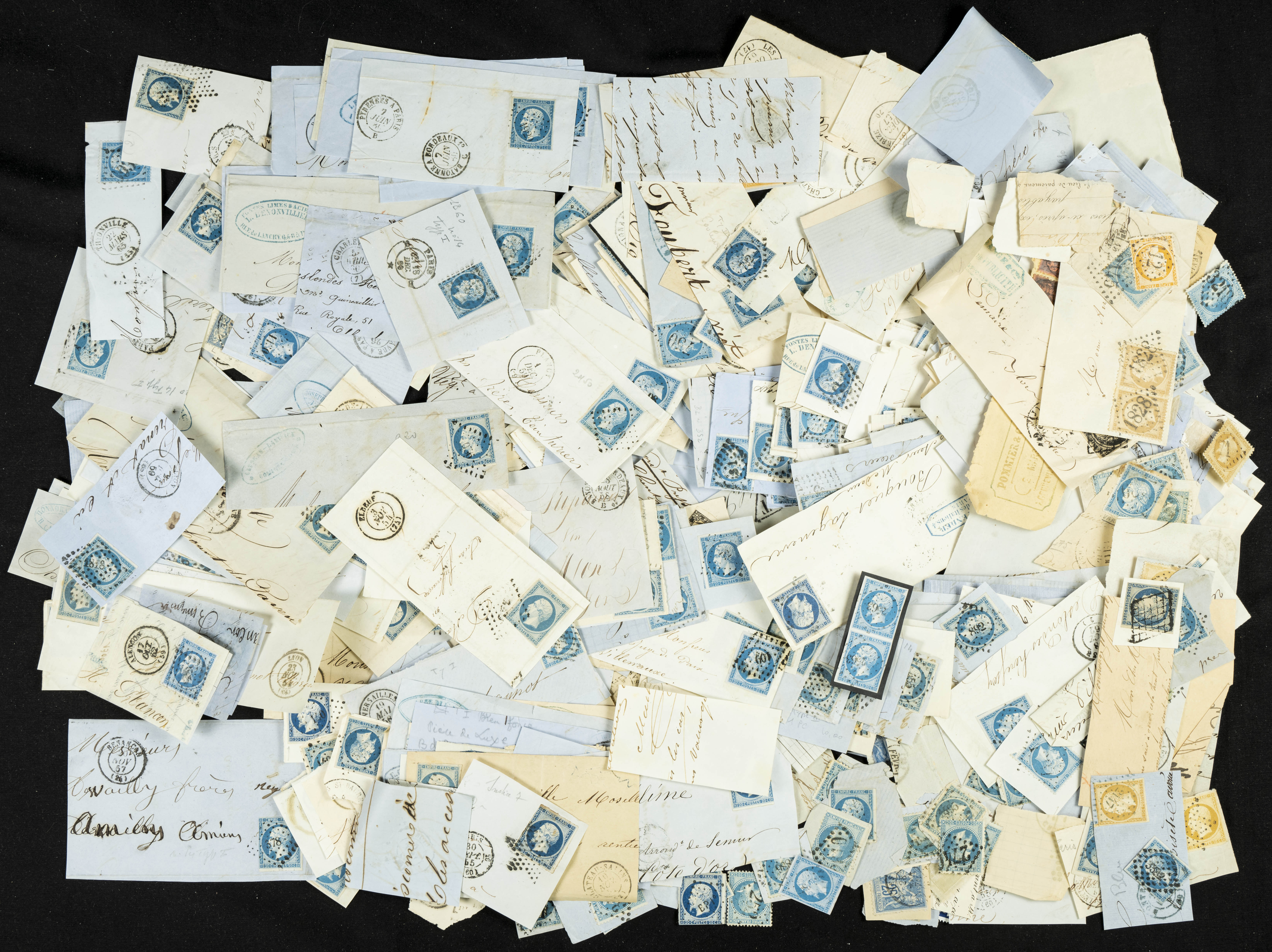 (1849ca). Collection of hundreds of classic French stamps, mostly 20-cent blue stamps from 1854, 1862, and 1867, in used condition and on fragments. TO BE EXAMINED.