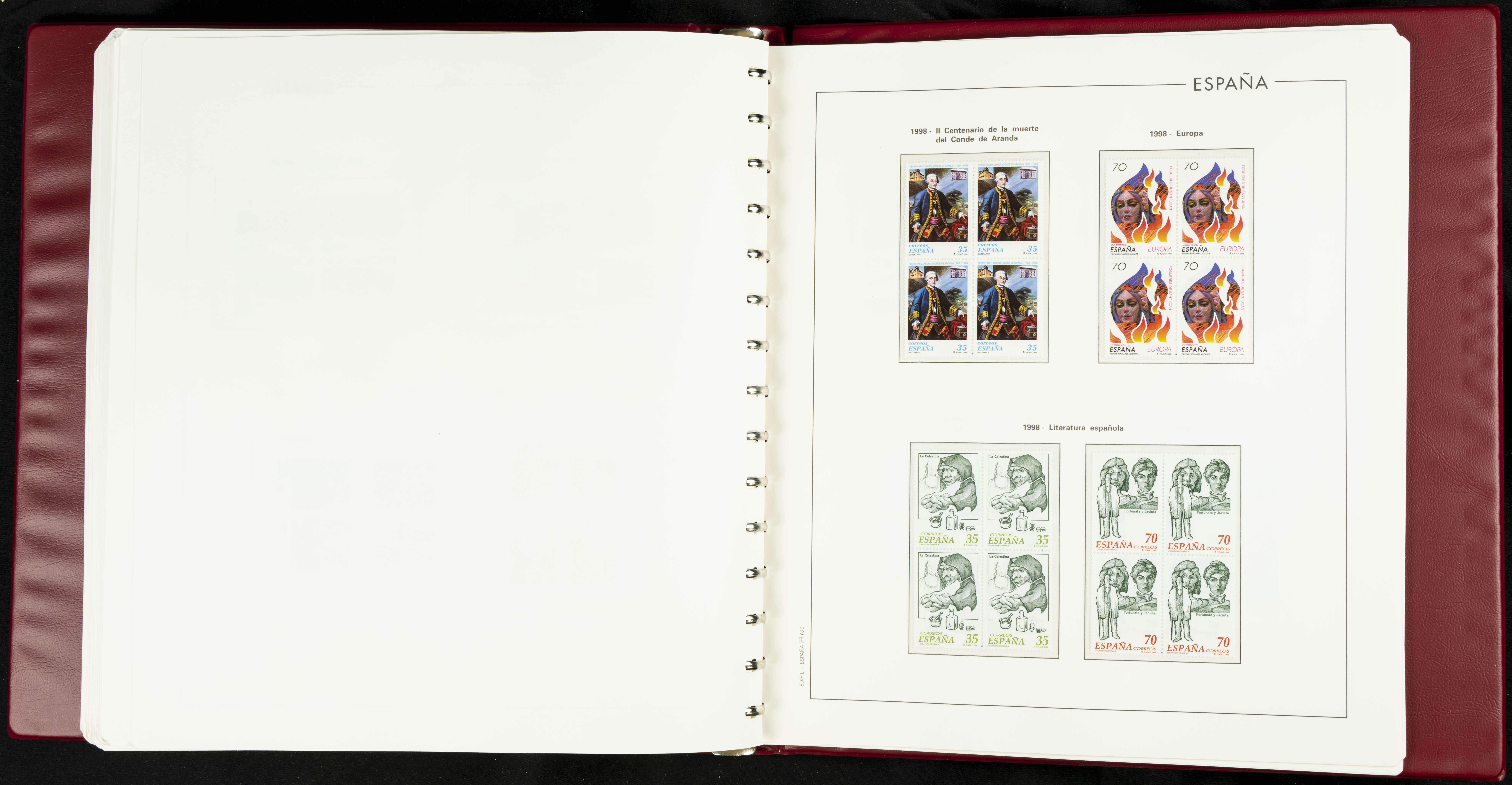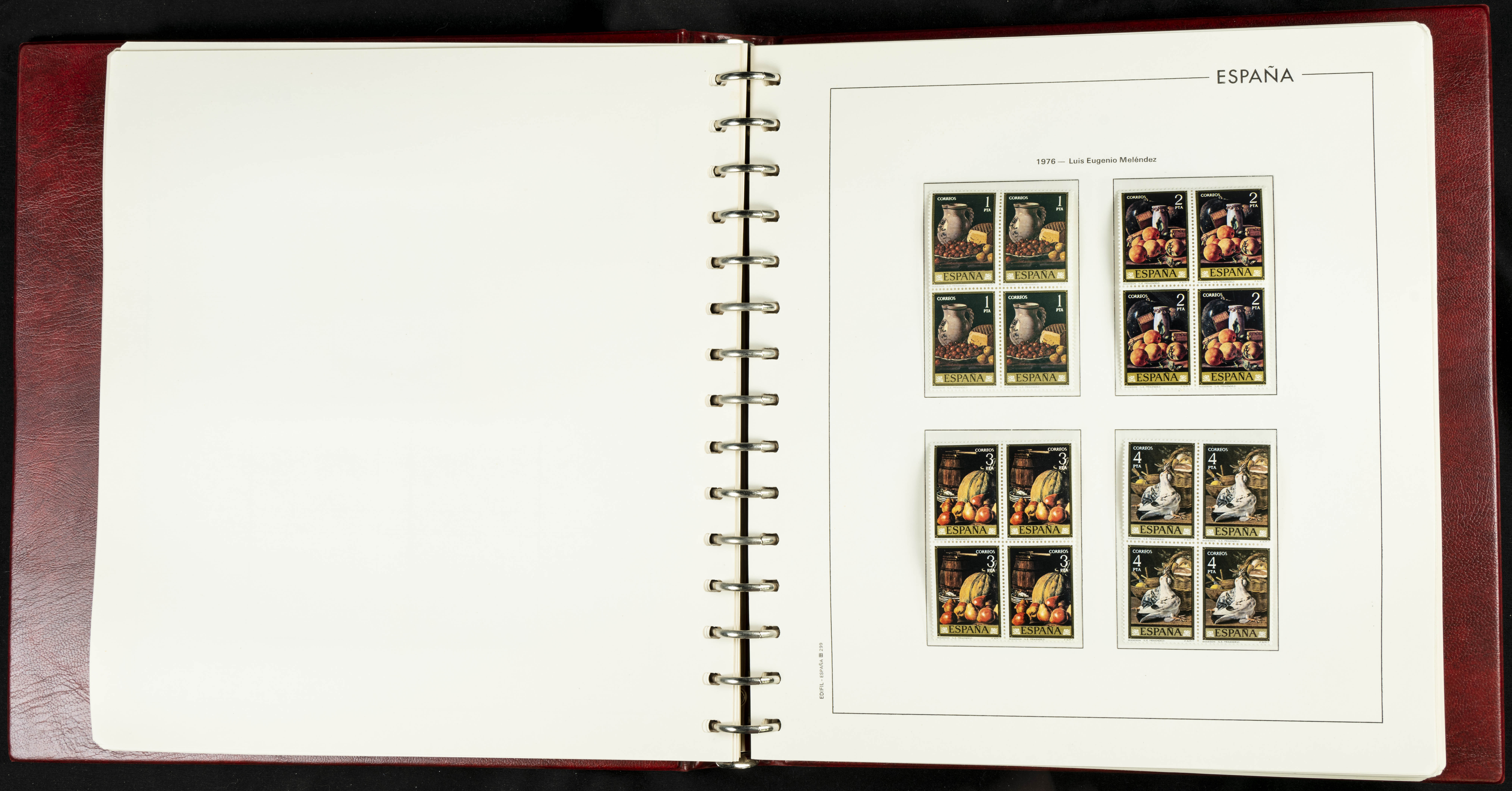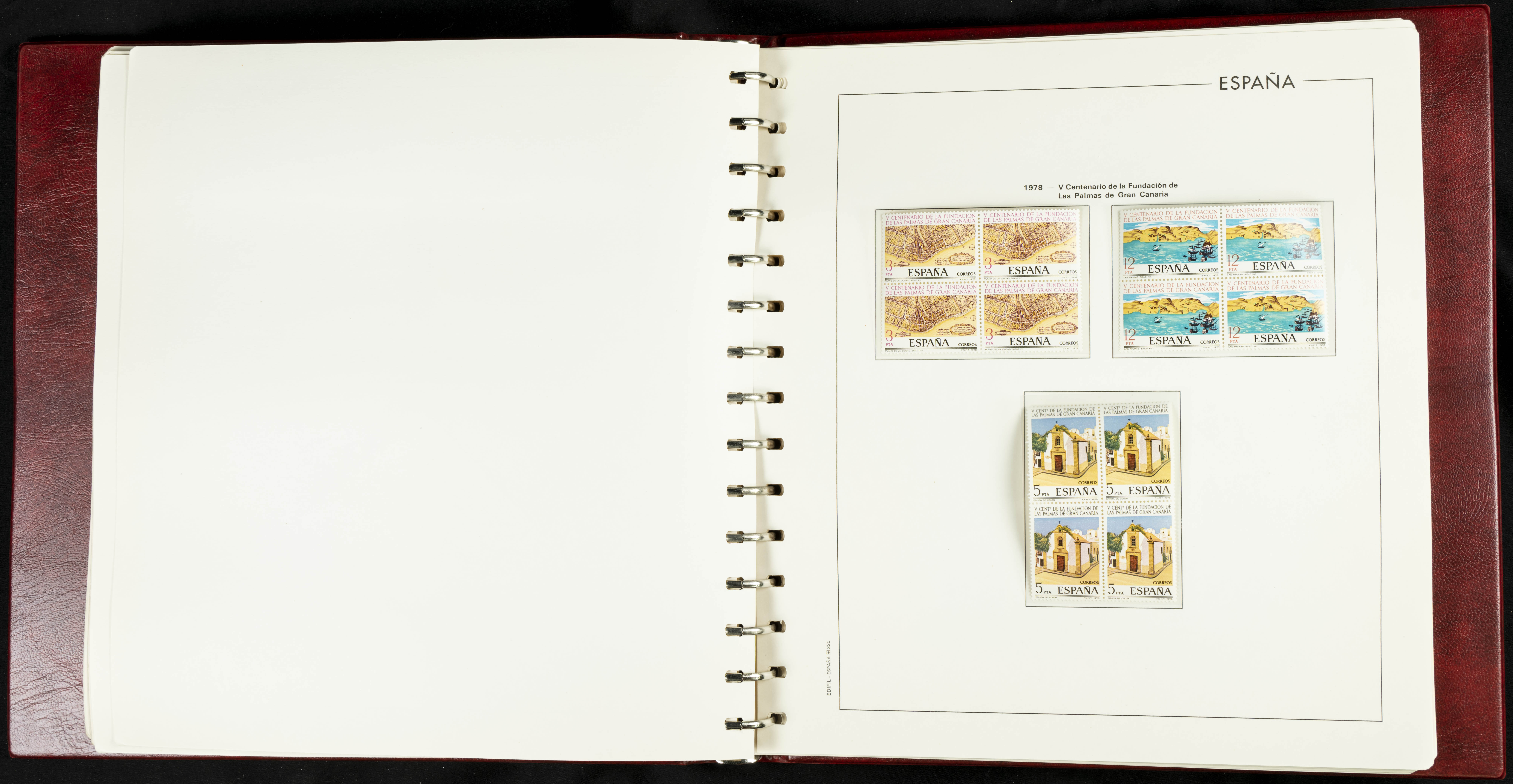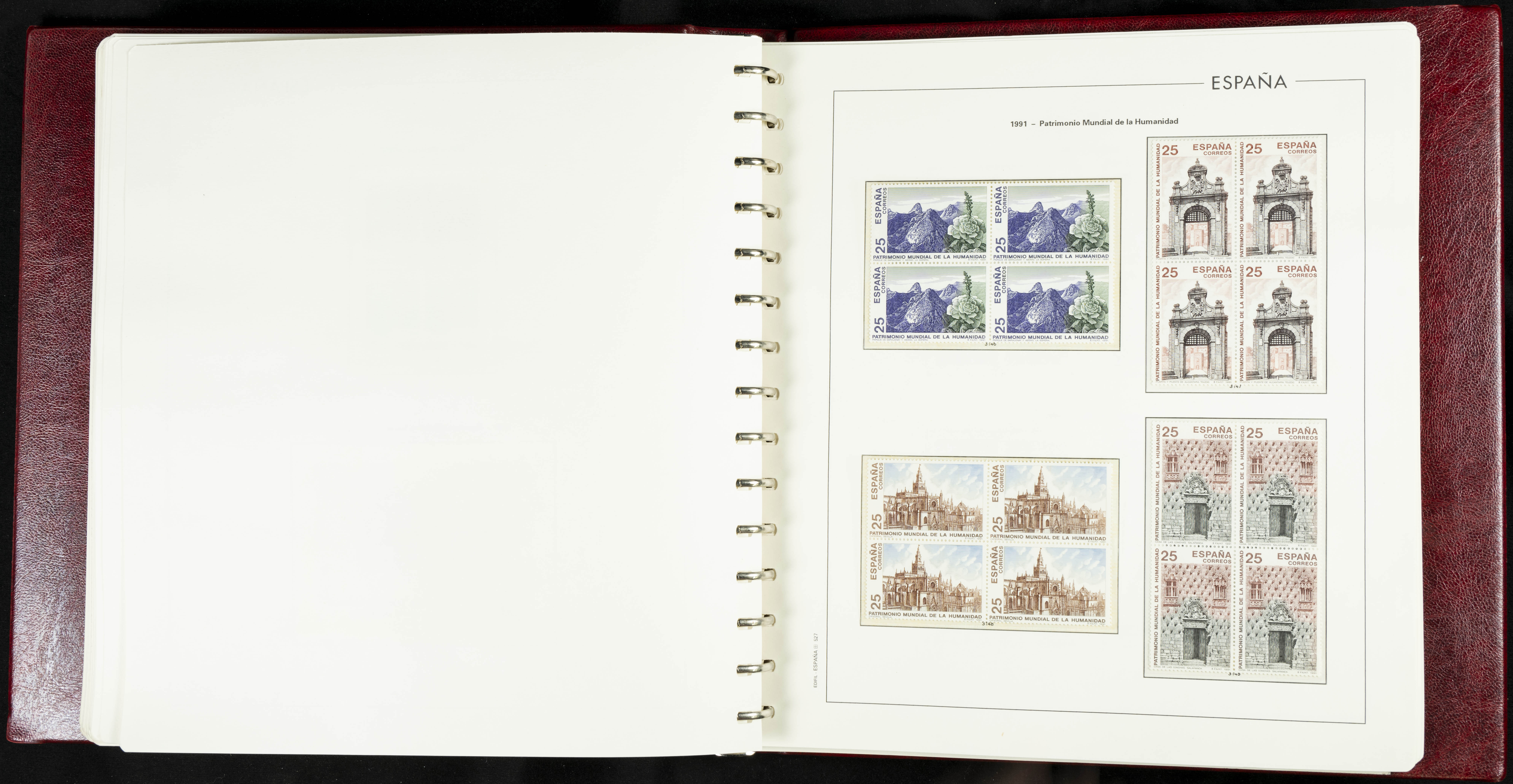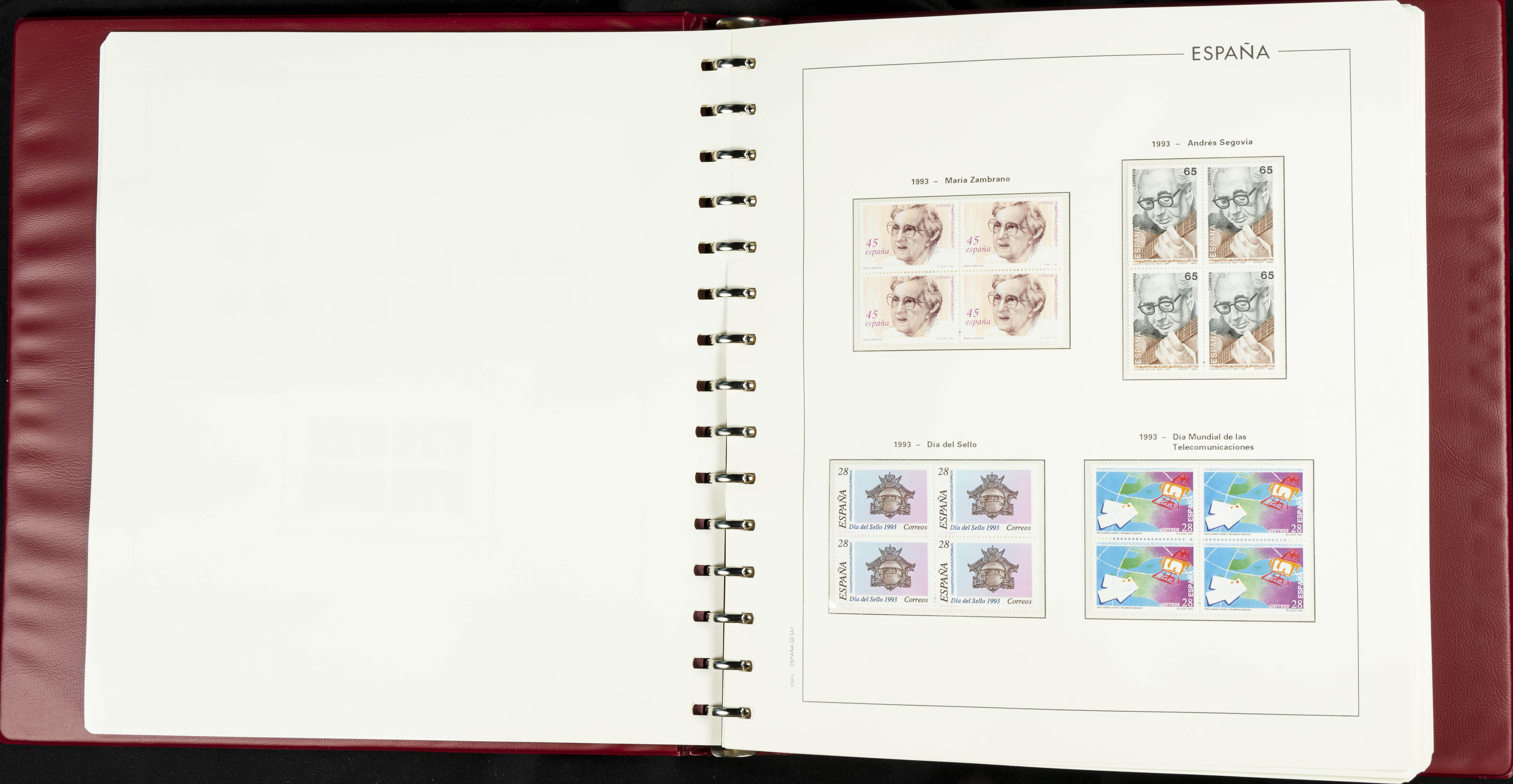 ★★(1976ca). Complete collection between 1976 and 1999, including the 2000 portion denominated exclusively in pesetas, in blocks of four (with a souvenir sheet), in mint condition (mounted in albums). HIGH CATALOGUE VALUE. TO BE EXAMINED.