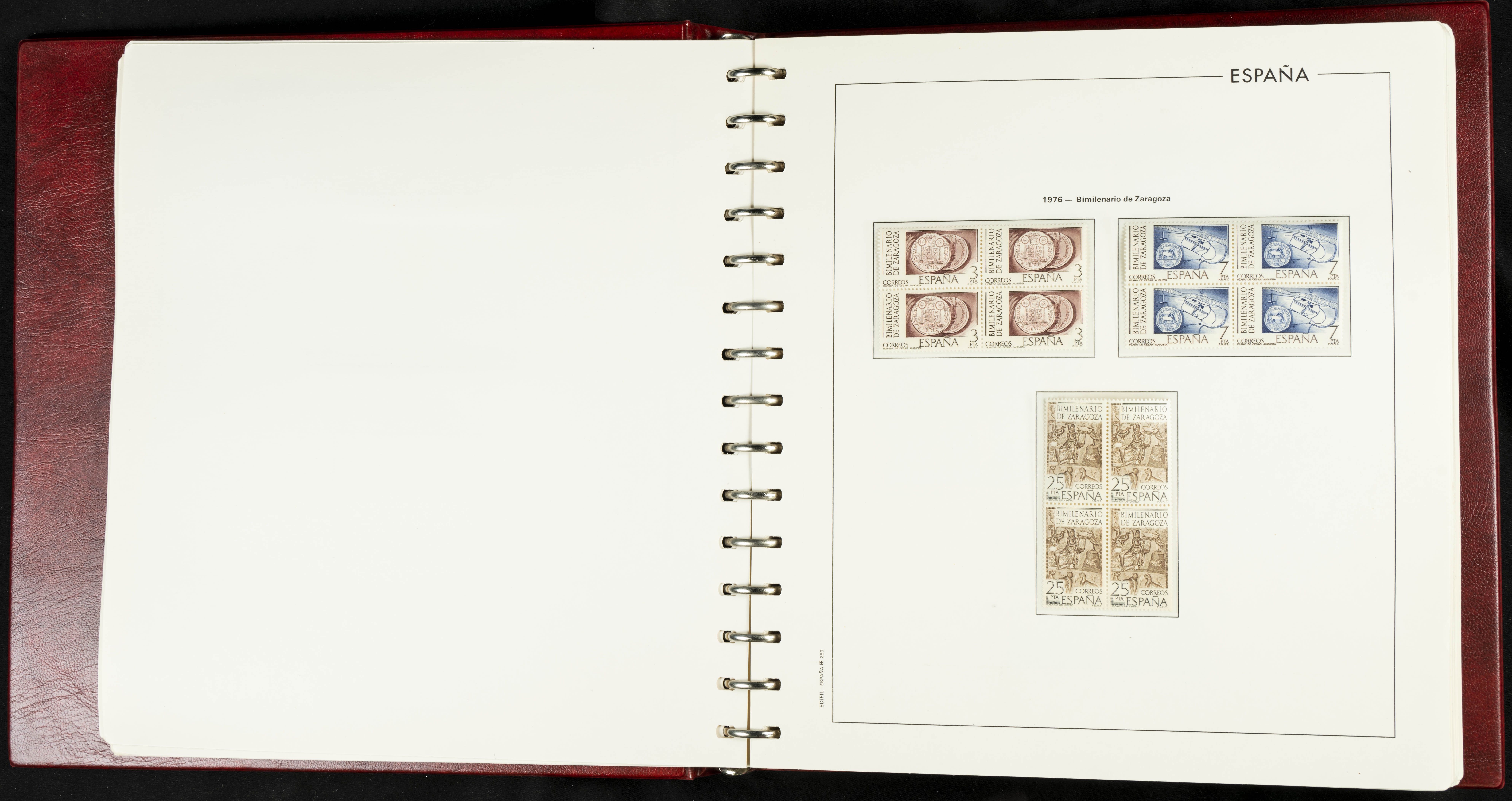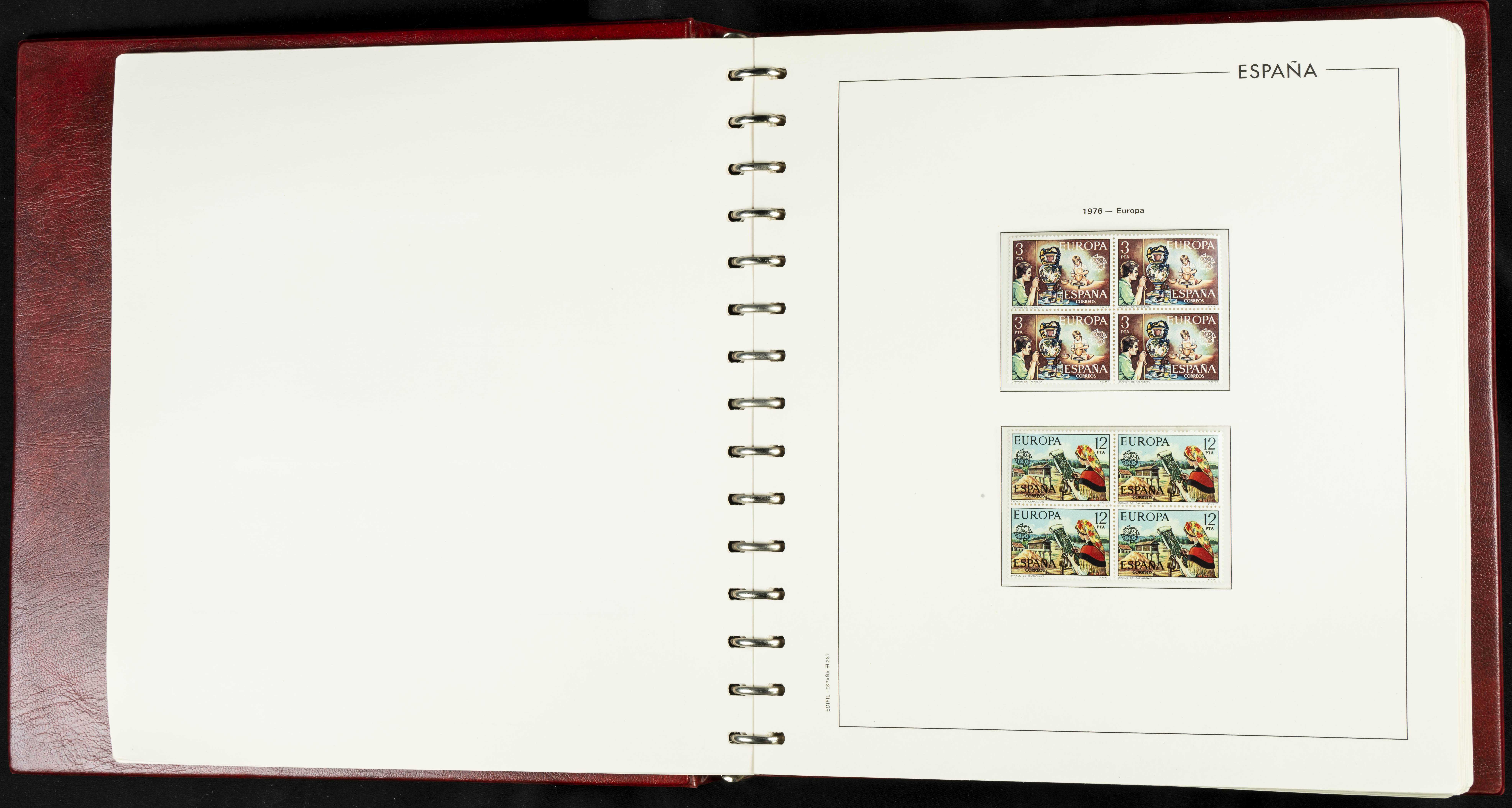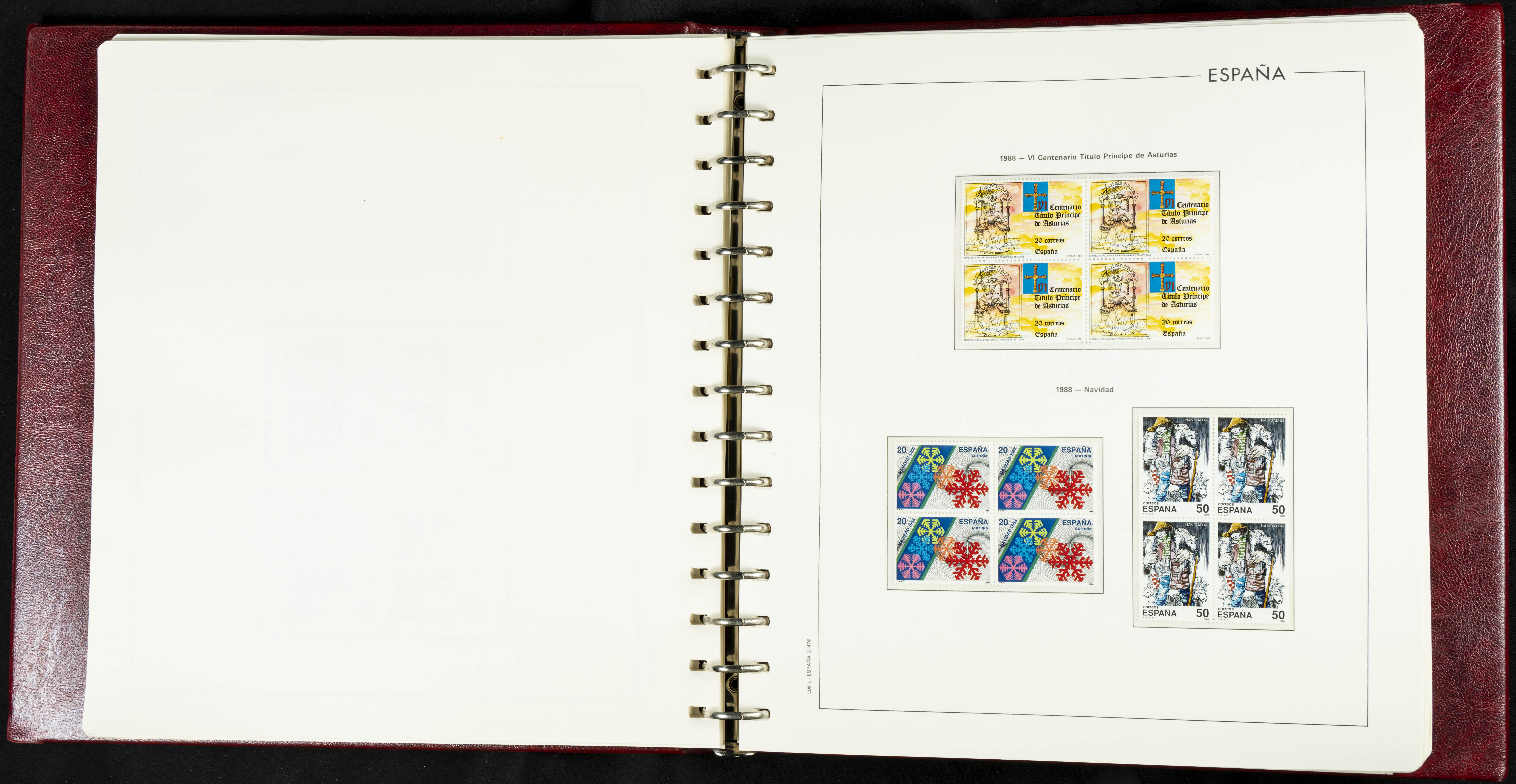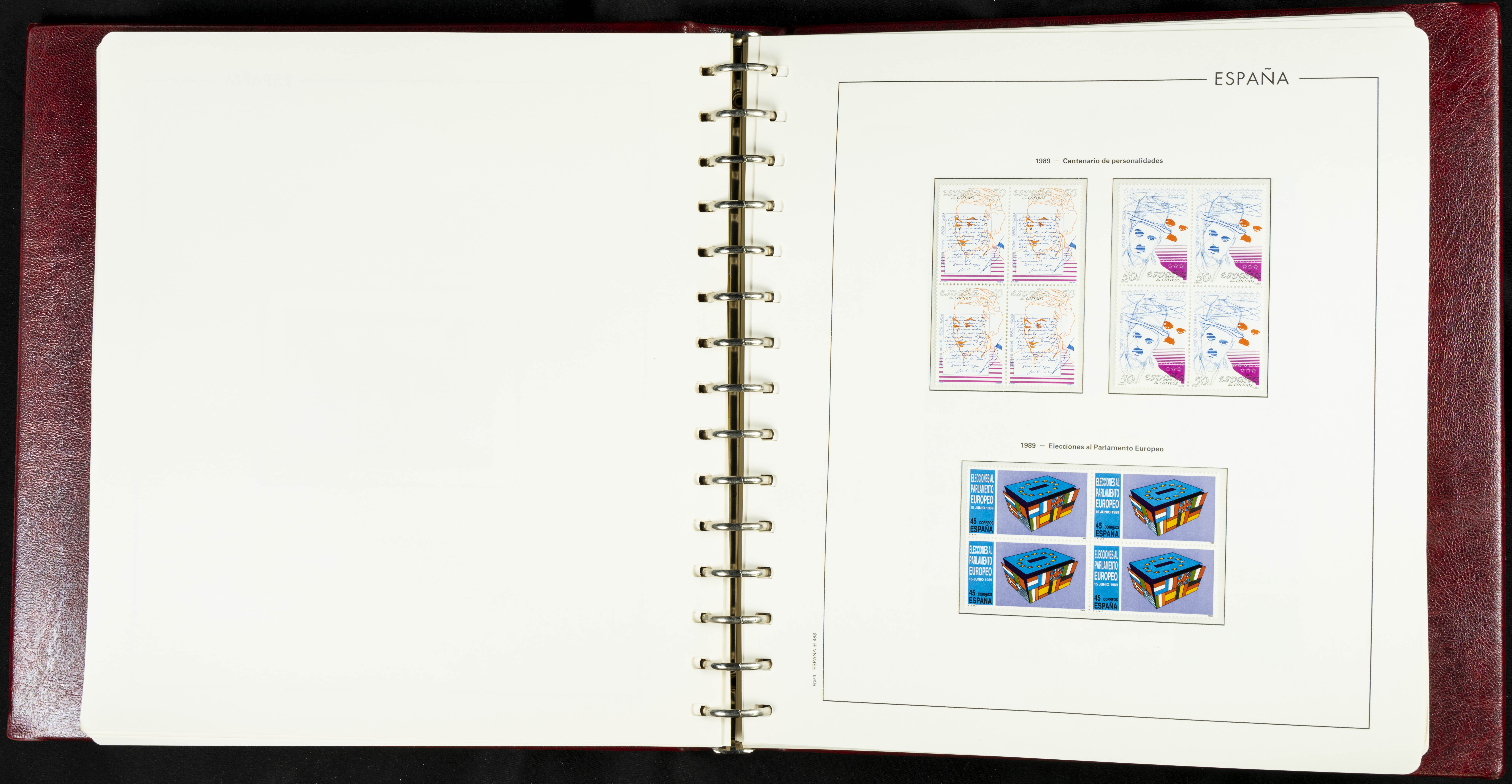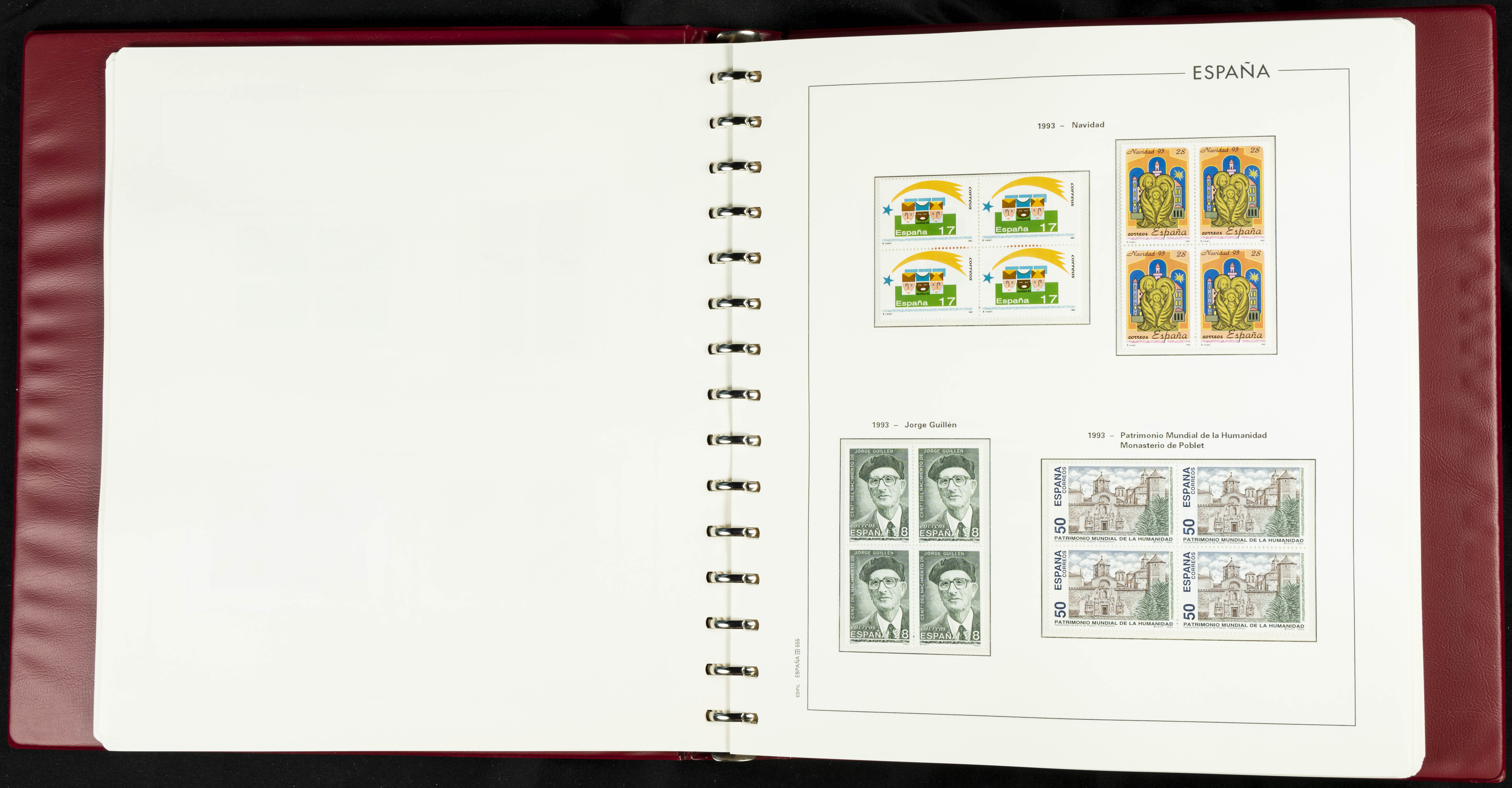 ★★(1976ca). Complete collection between 1976 and 1999, including the 2000 portion denominated exclusively in pesetas, in blocks of four (with a souvenir sheet), in mint condition (mounted in albums). HIGH CATALOGUE VALUE. TO BE EXAMINED.