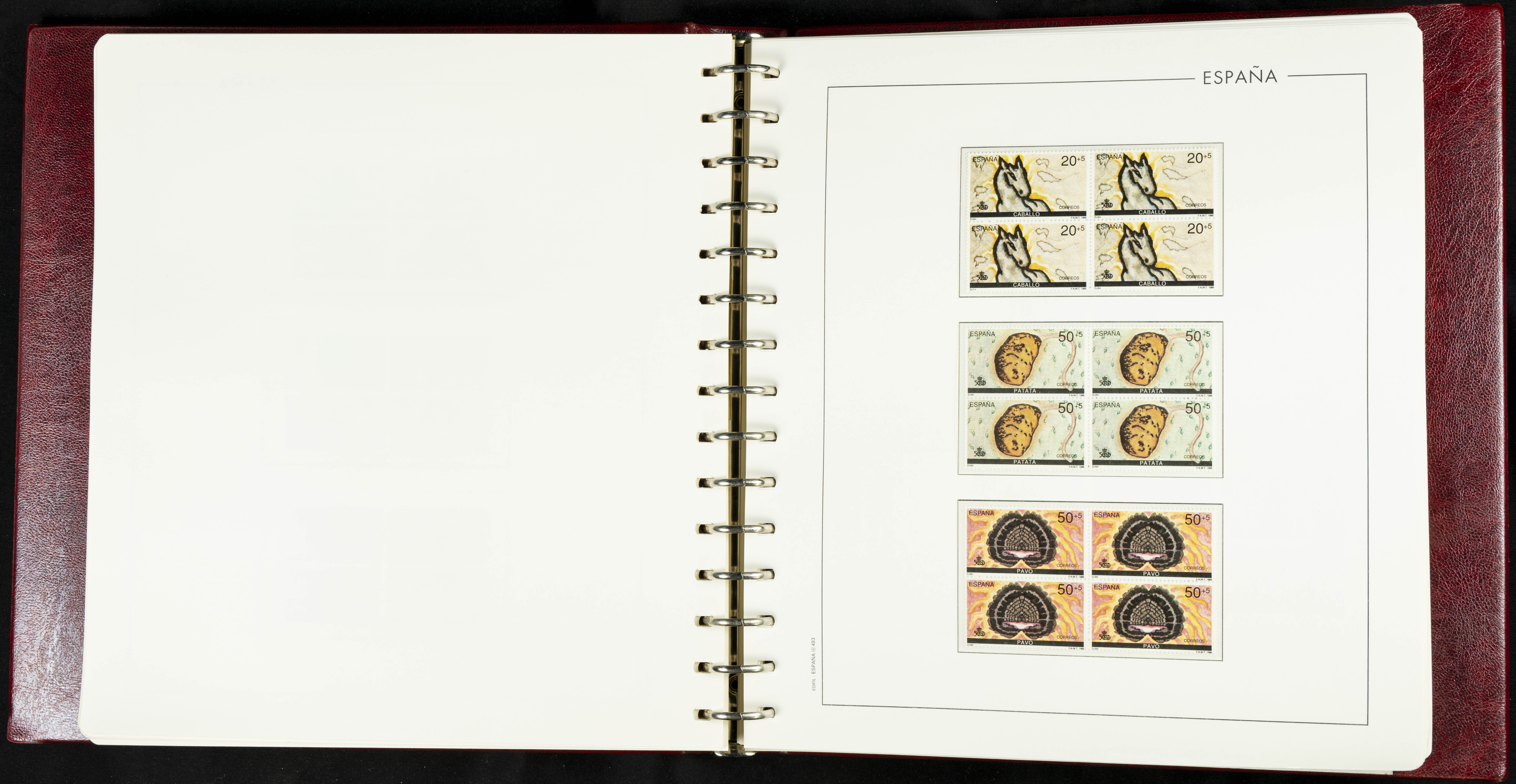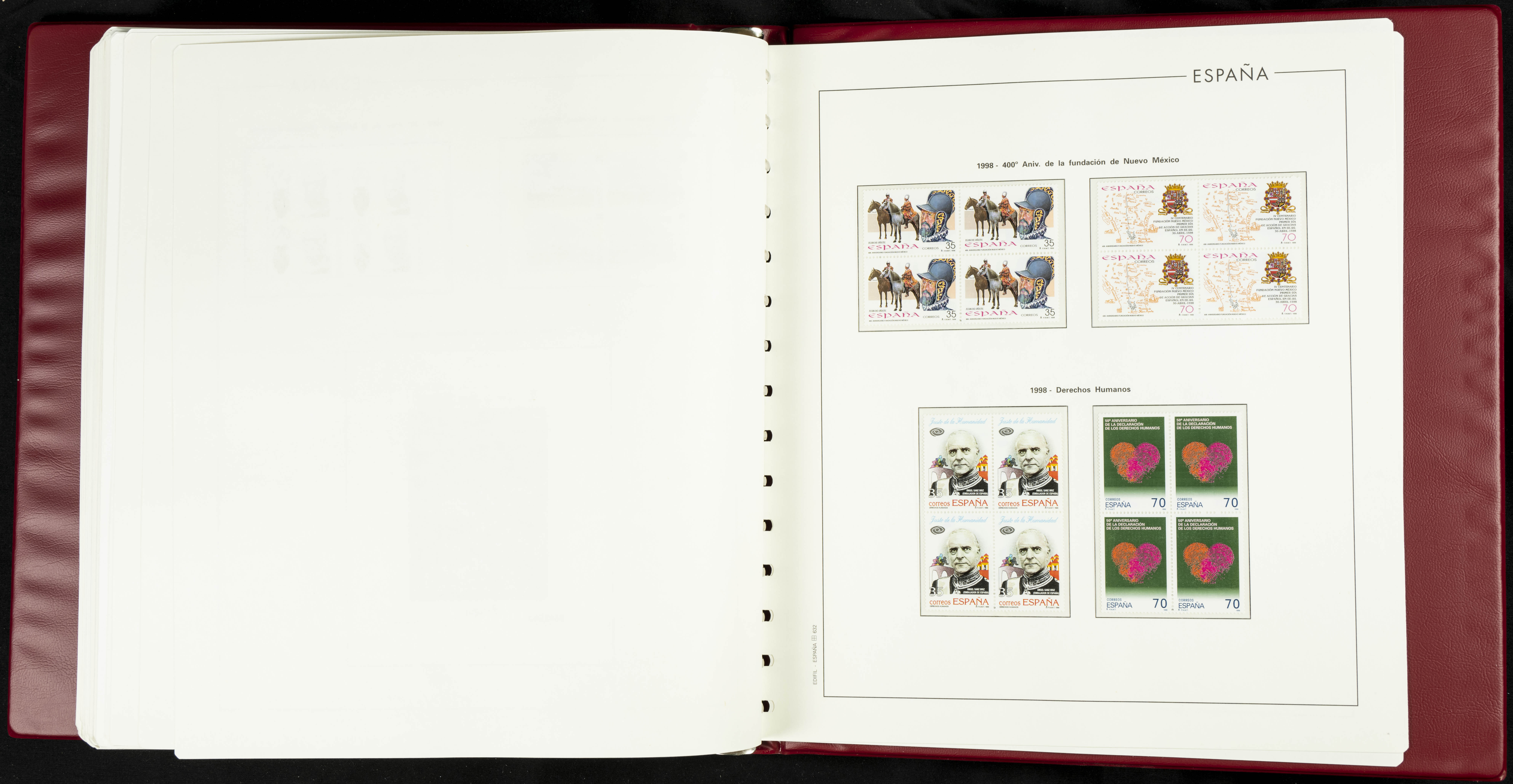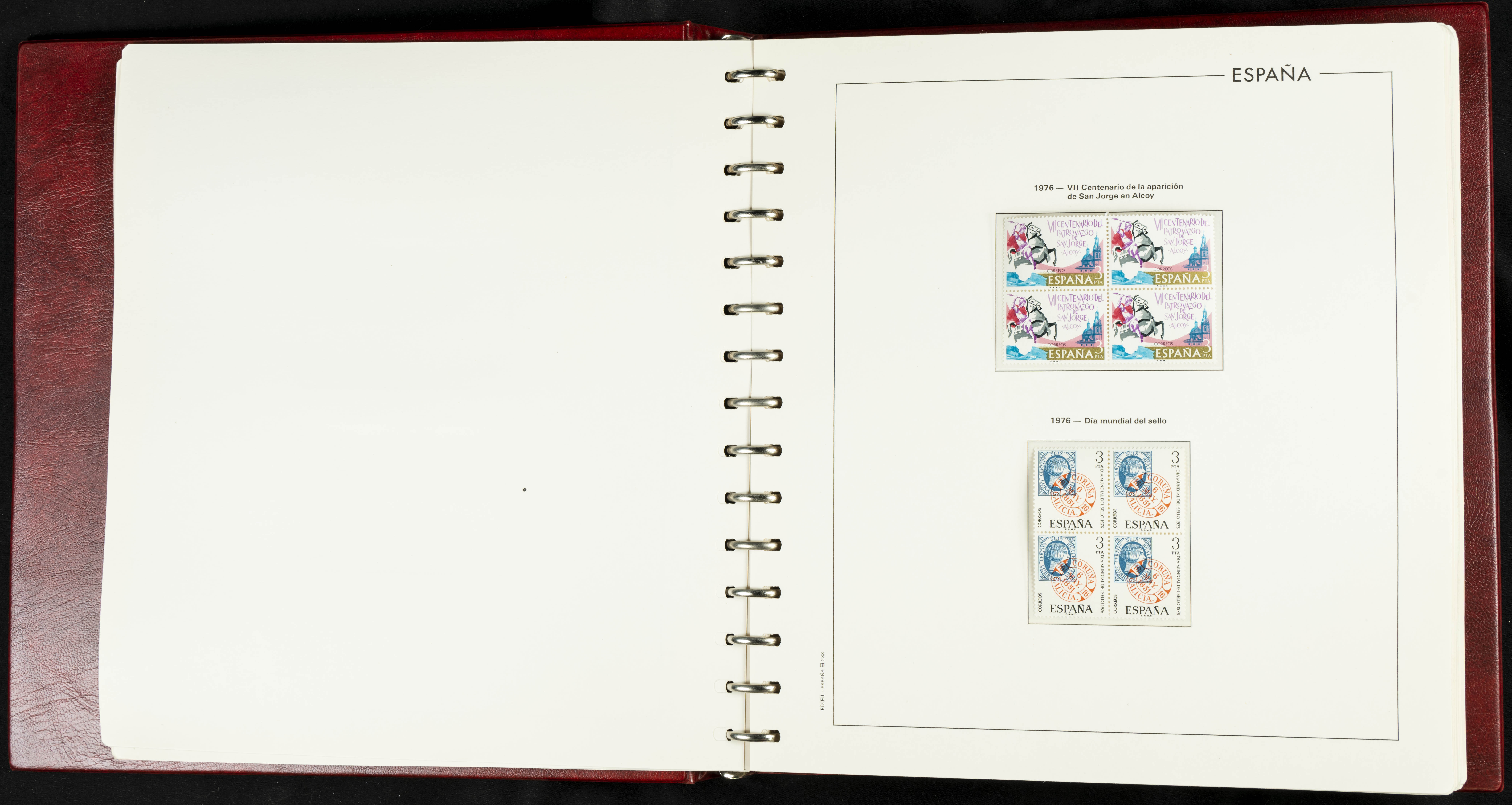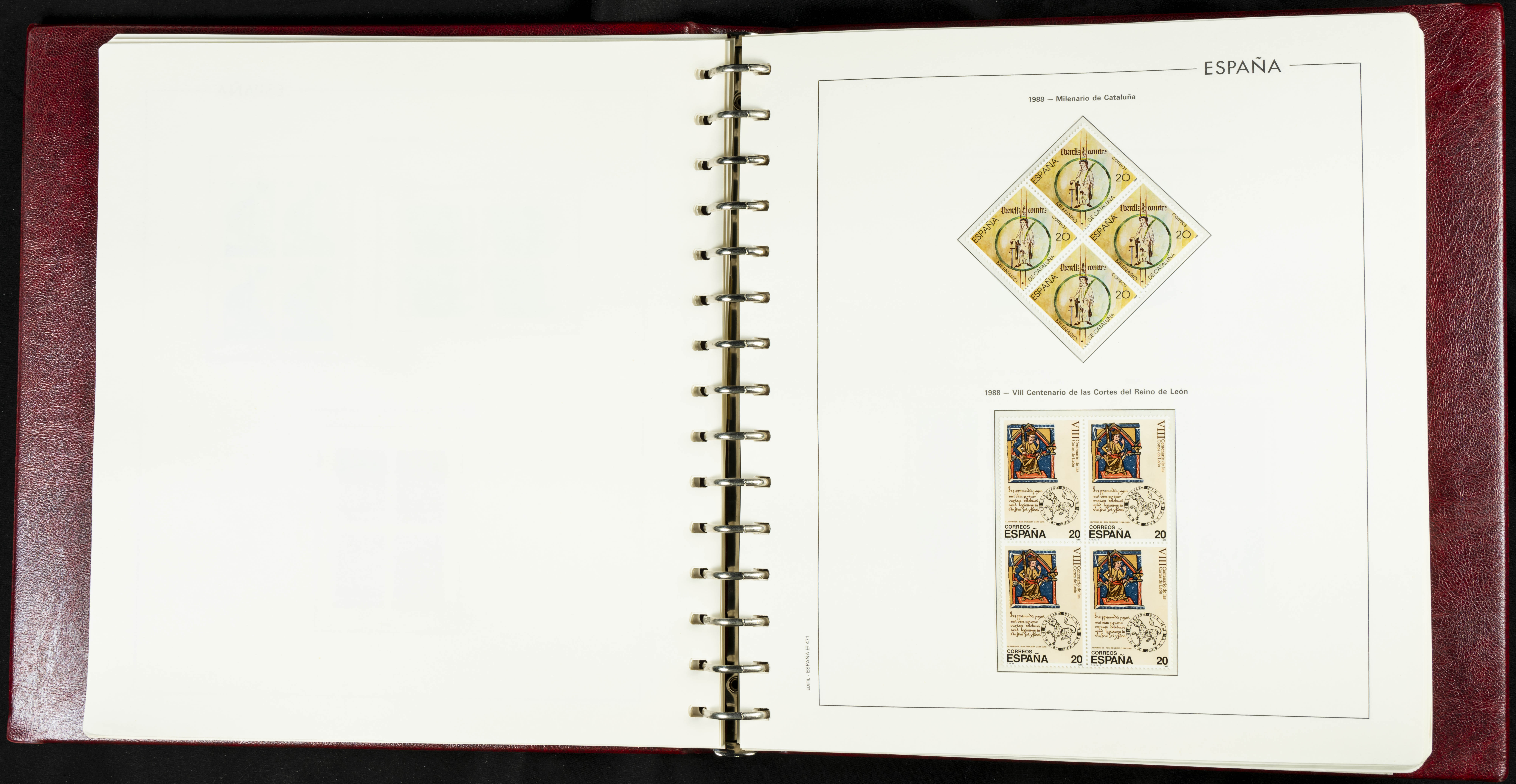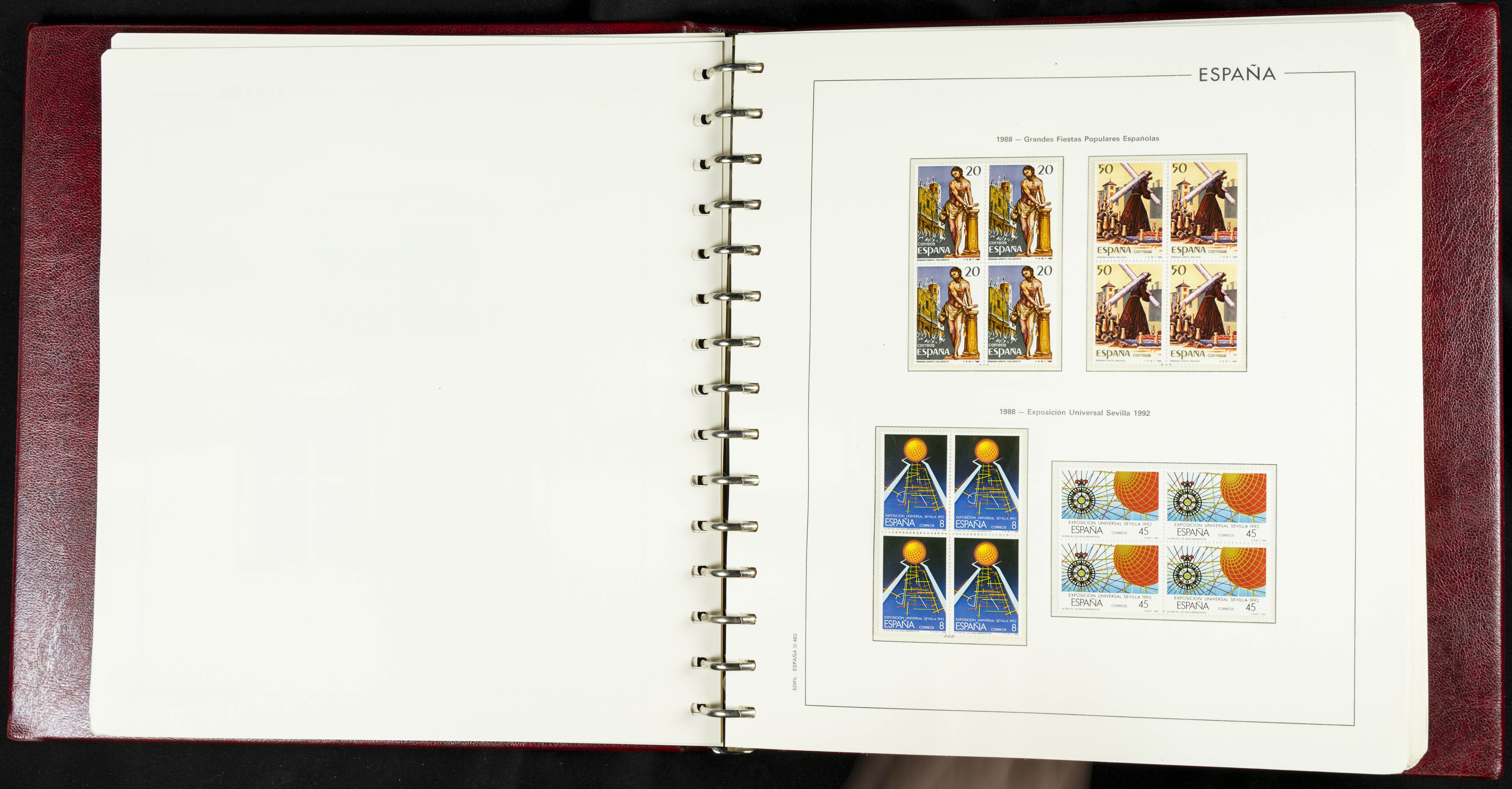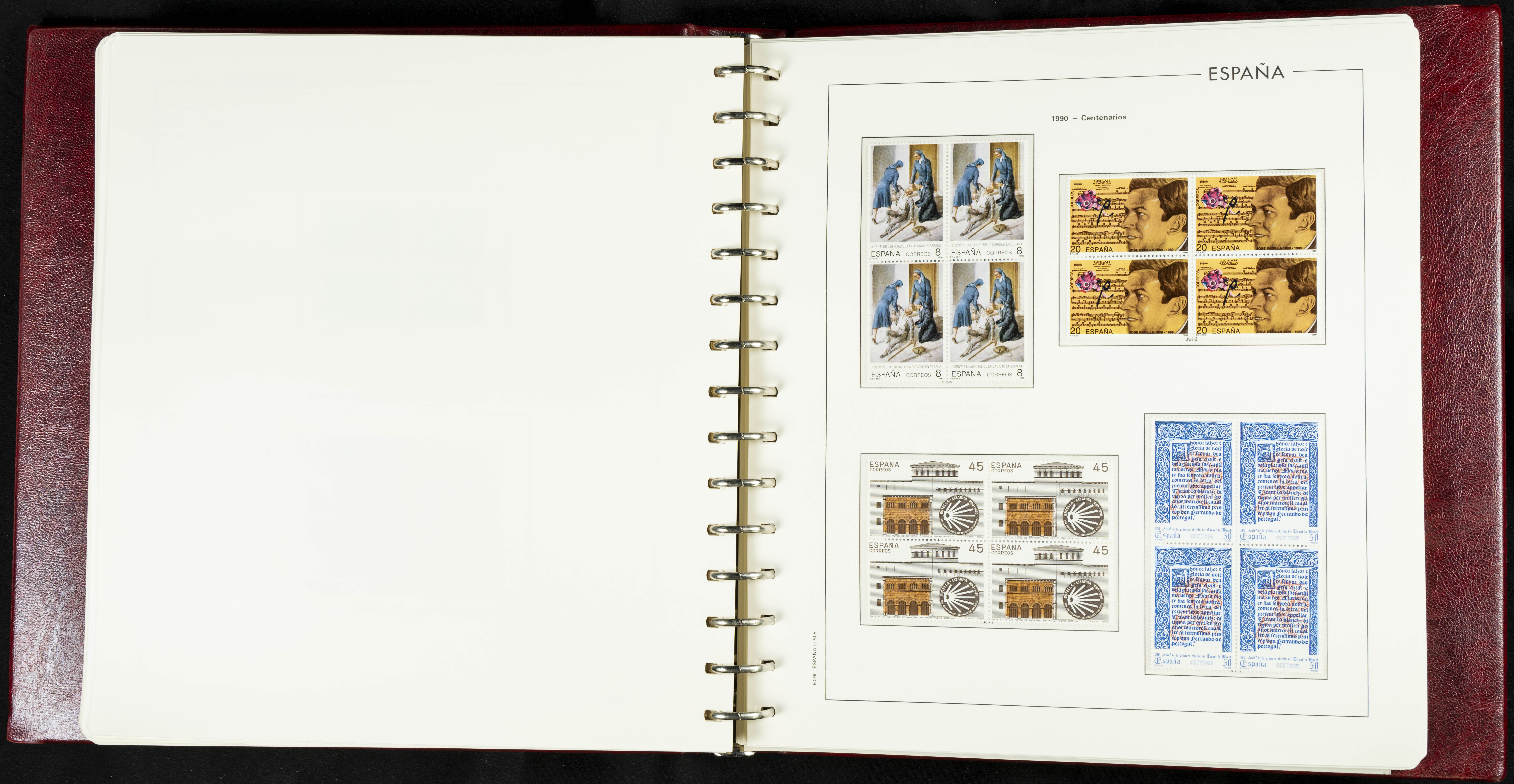 ★★(1976ca). Complete collection between 1976 and 1999, including the 2000 portion denominated exclusively in pesetas, in blocks of four (with a souvenir sheet), in mint condition (mounted in albums). HIGH CATALOGUE VALUE. TO BE EXAMINED.