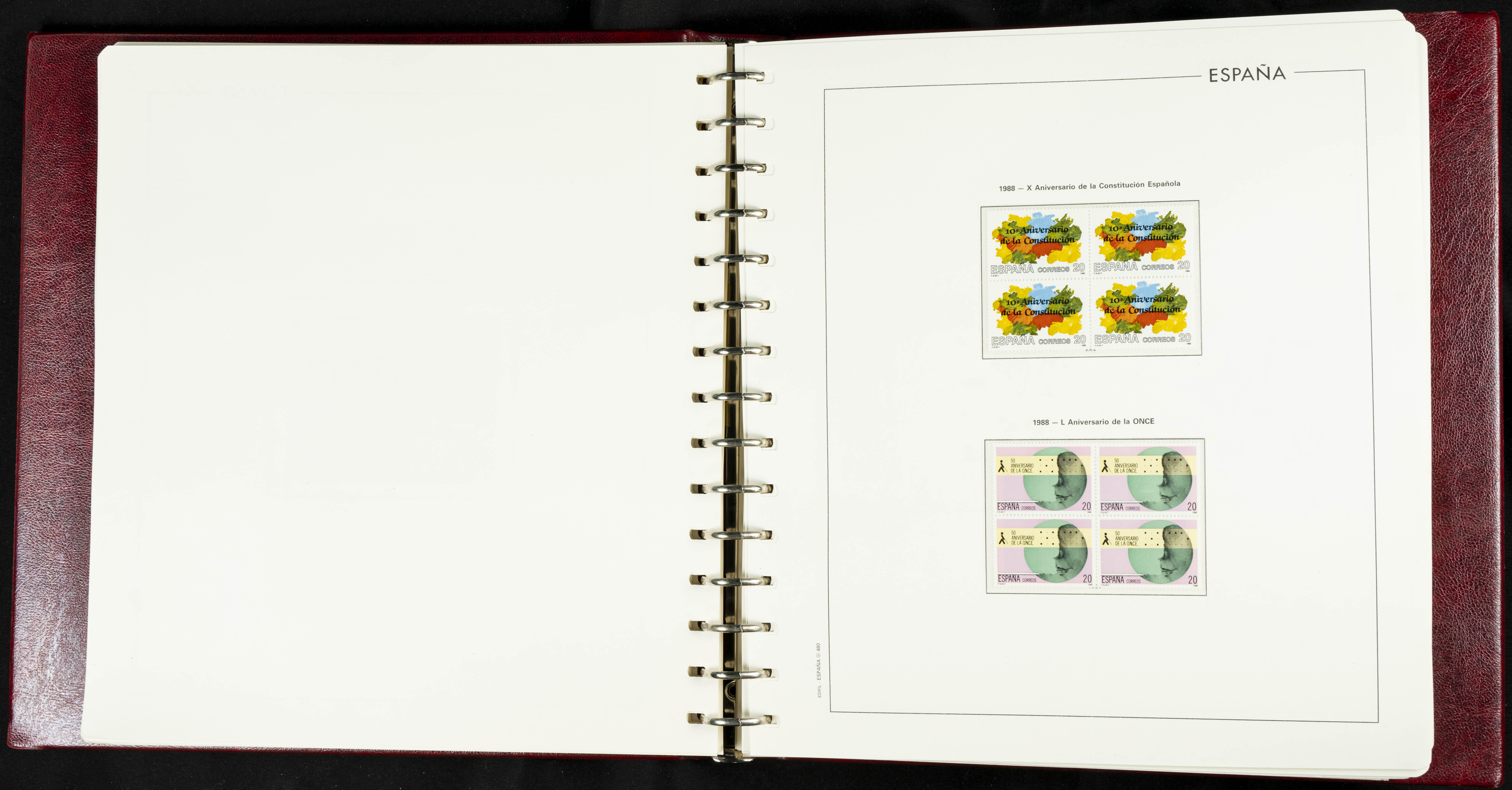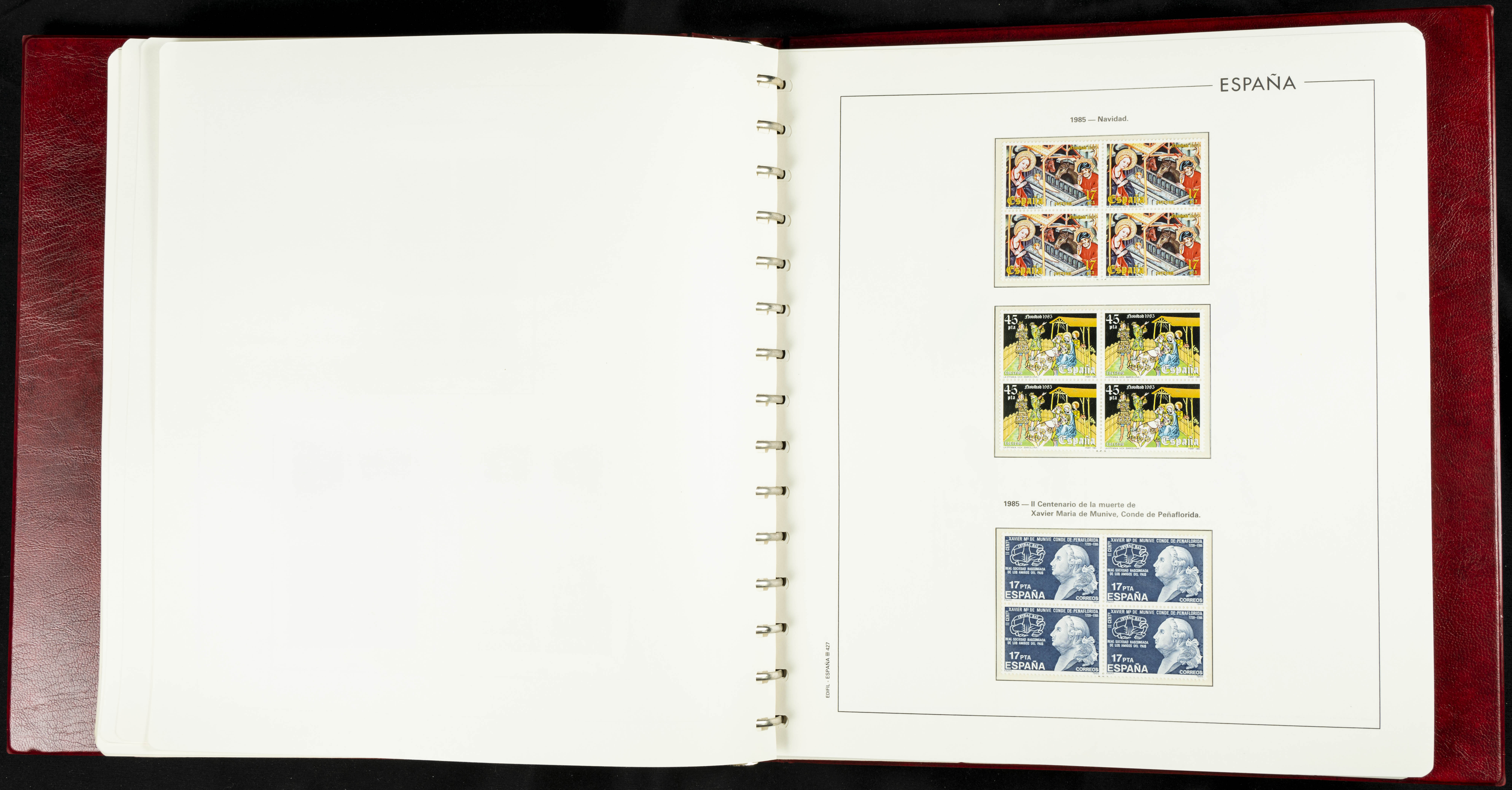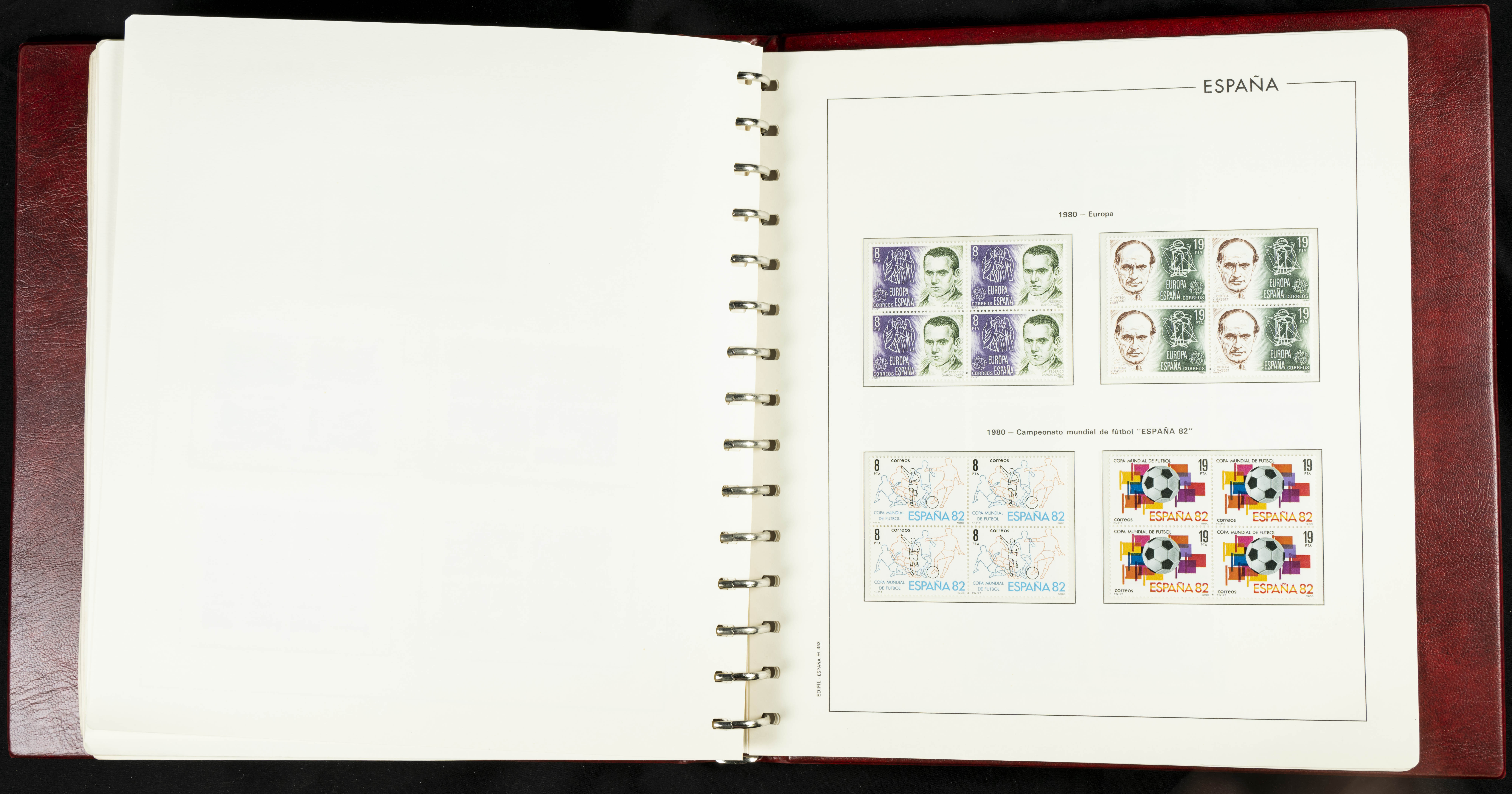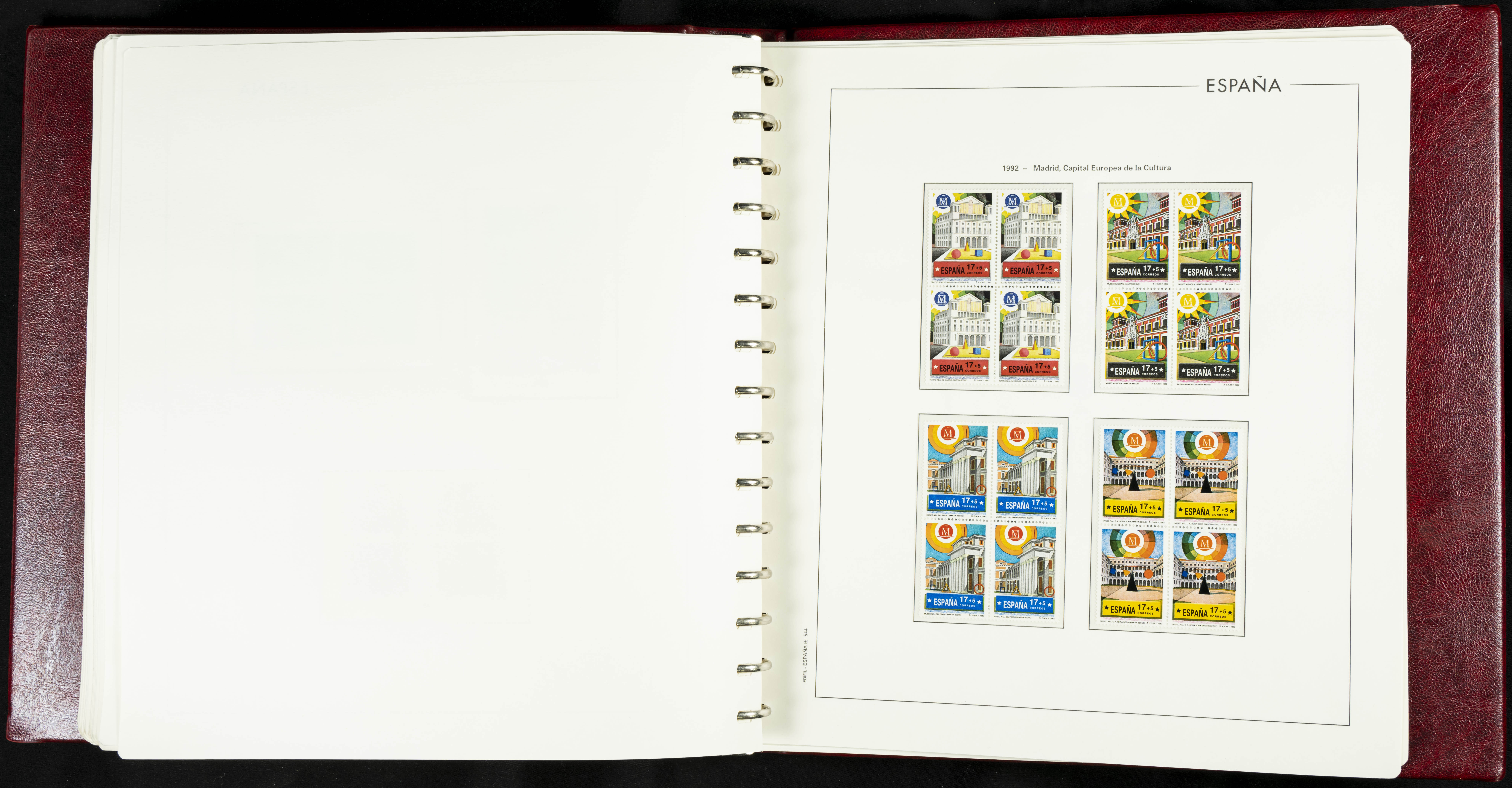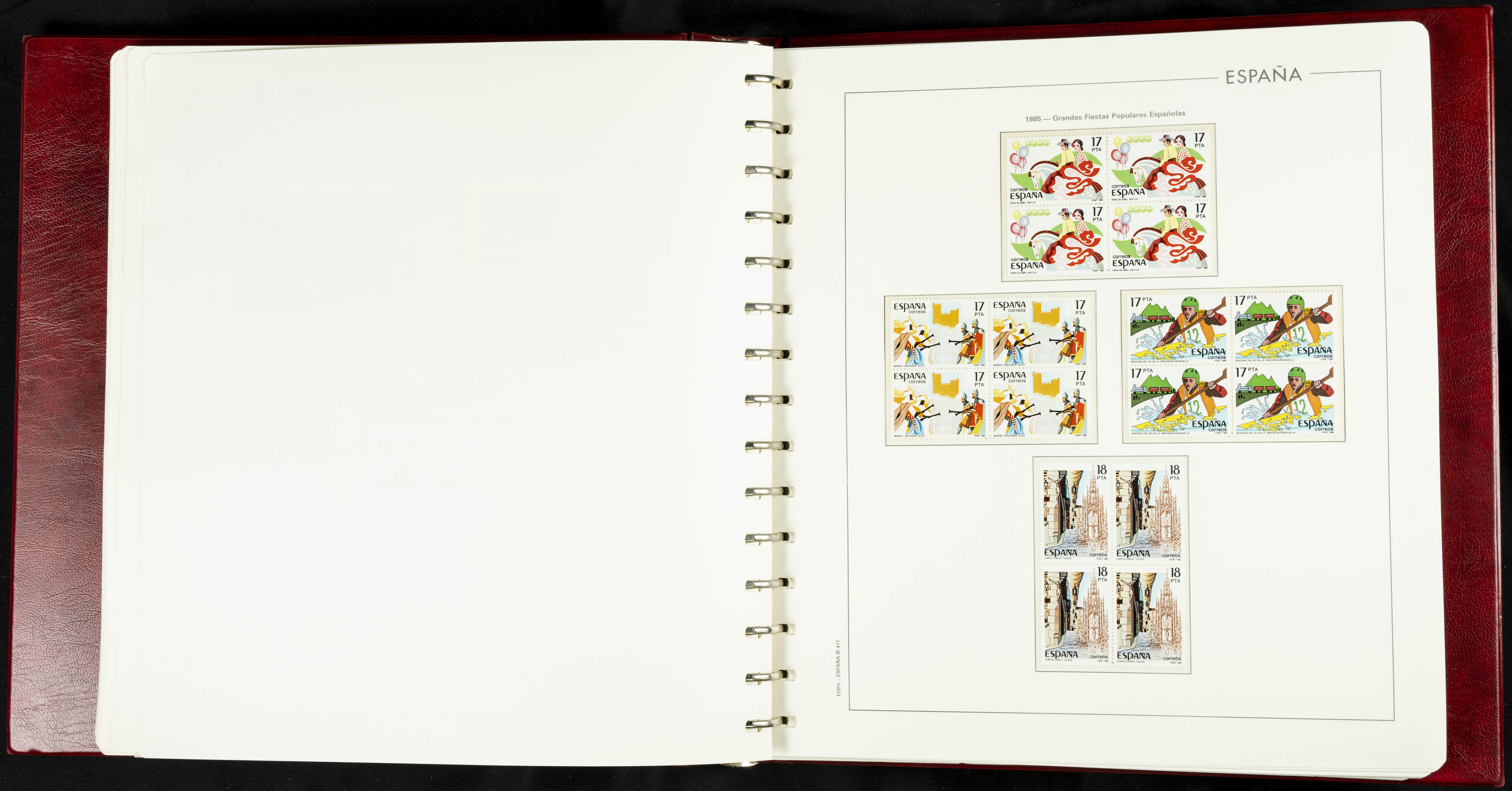 ★★(1976ca). Complete collection between 1976 and 1999, including the 2000 portion denominated exclusively in pesetas, in blocks of four (with a souvenir sheet), in mint condition (mounted in albums). HIGH CATALOGUE VALUE. TO BE EXAMINED.