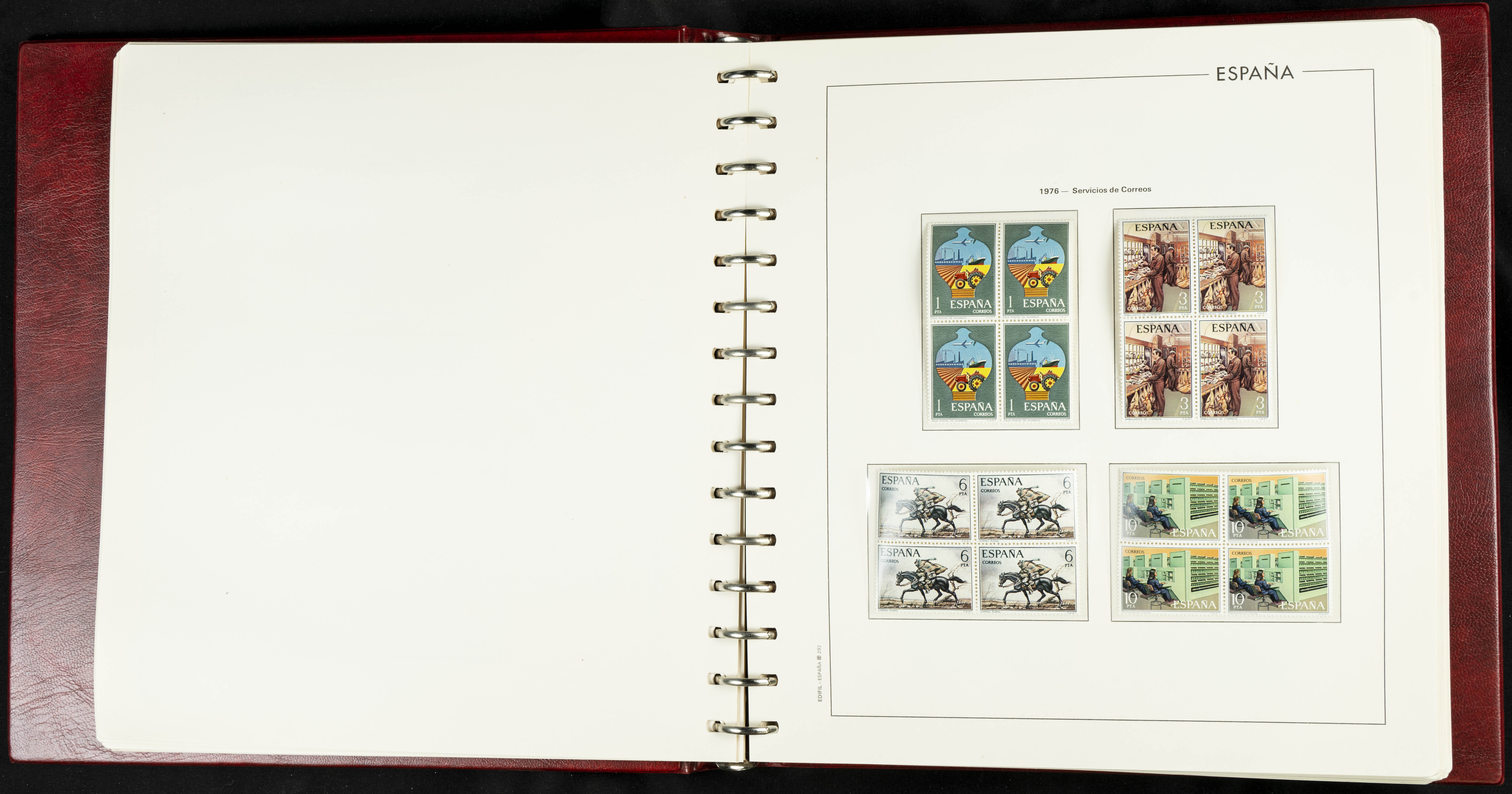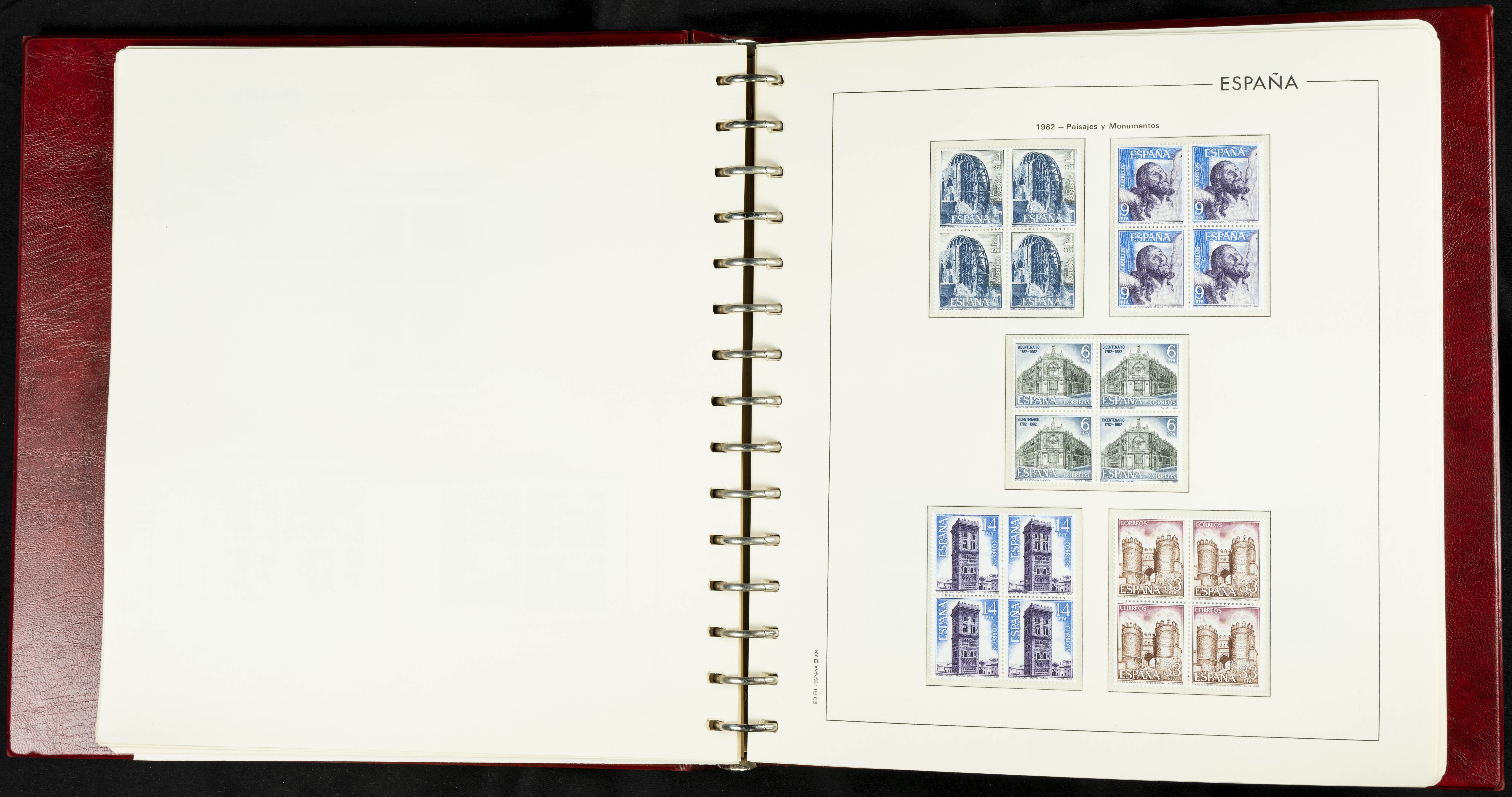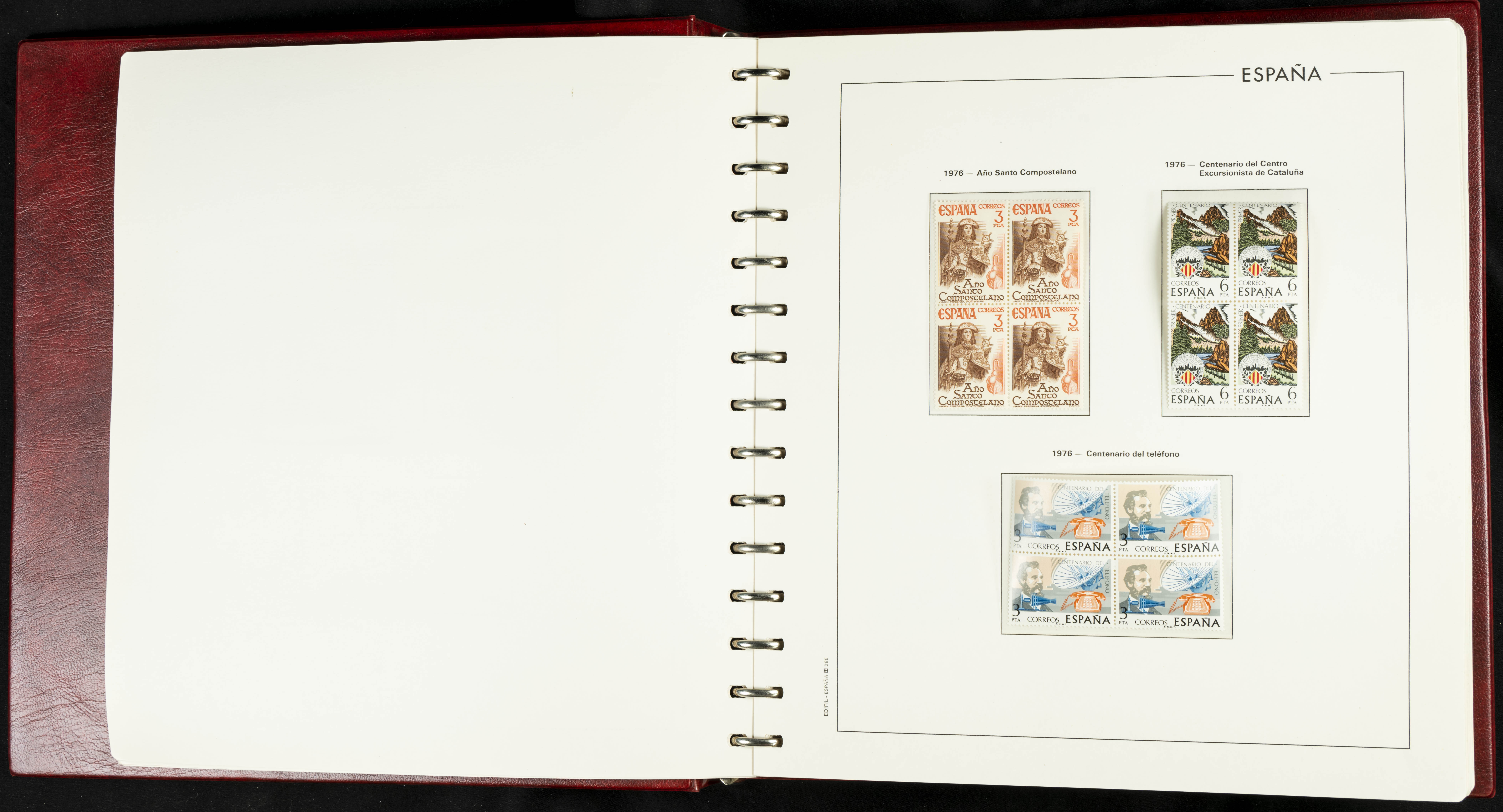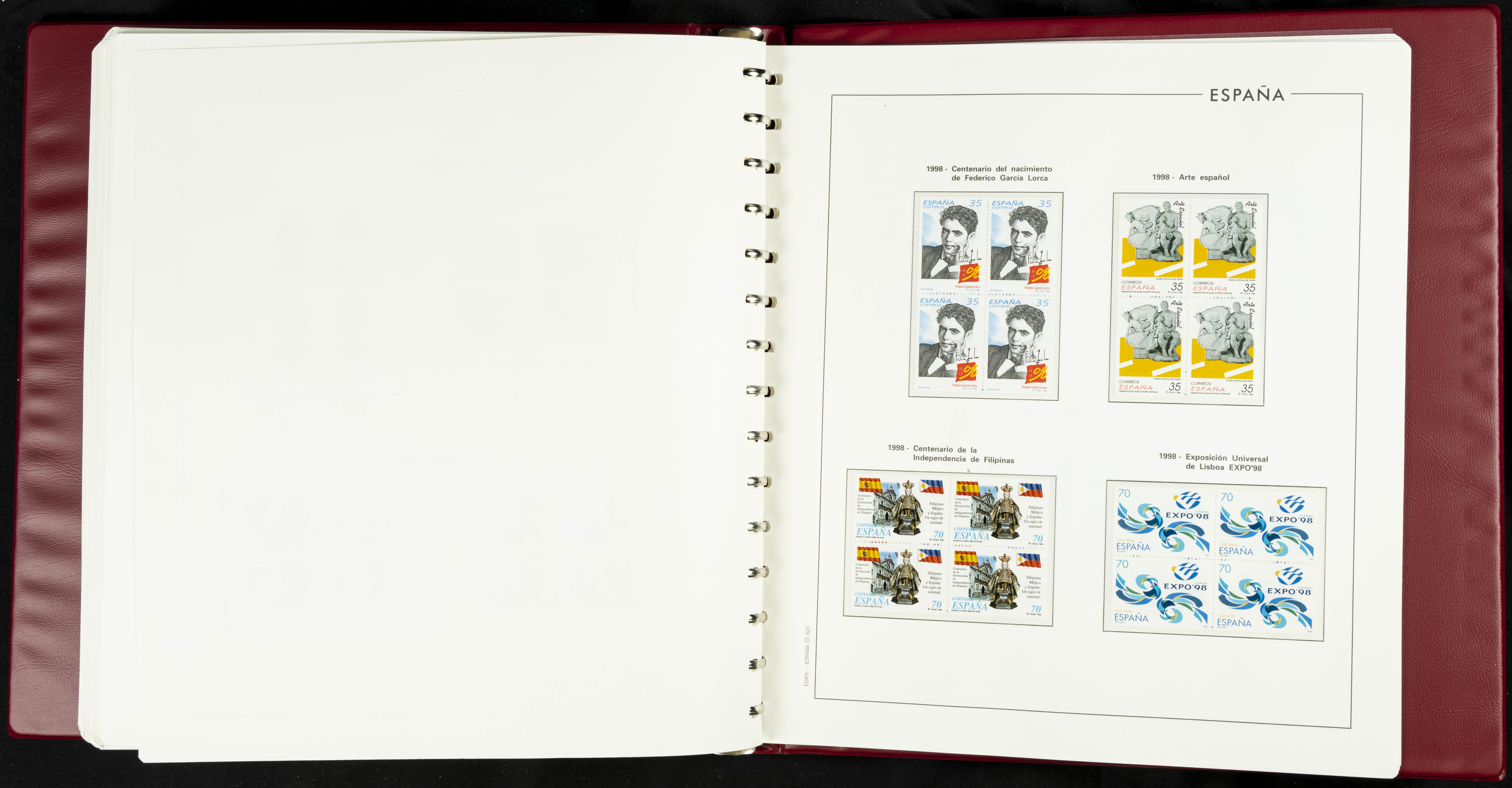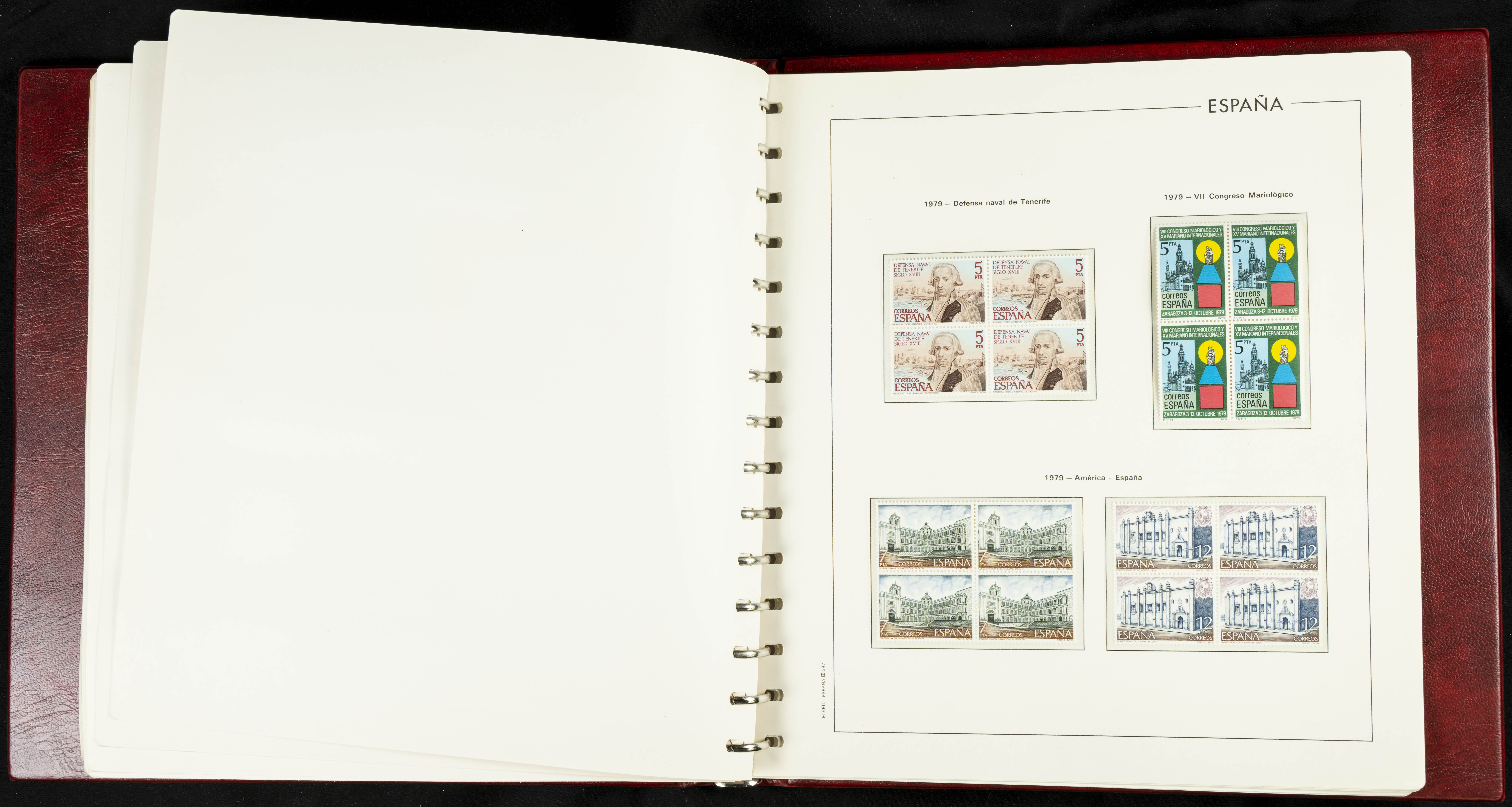 ★★(1976ca). Complete collection between 1976 and 1999, including the 2000 portion denominated exclusively in pesetas, in blocks of four (with a souvenir sheet), in mint condition (mounted in albums). HIGH CATALOGUE VALUE. TO BE EXAMINED.