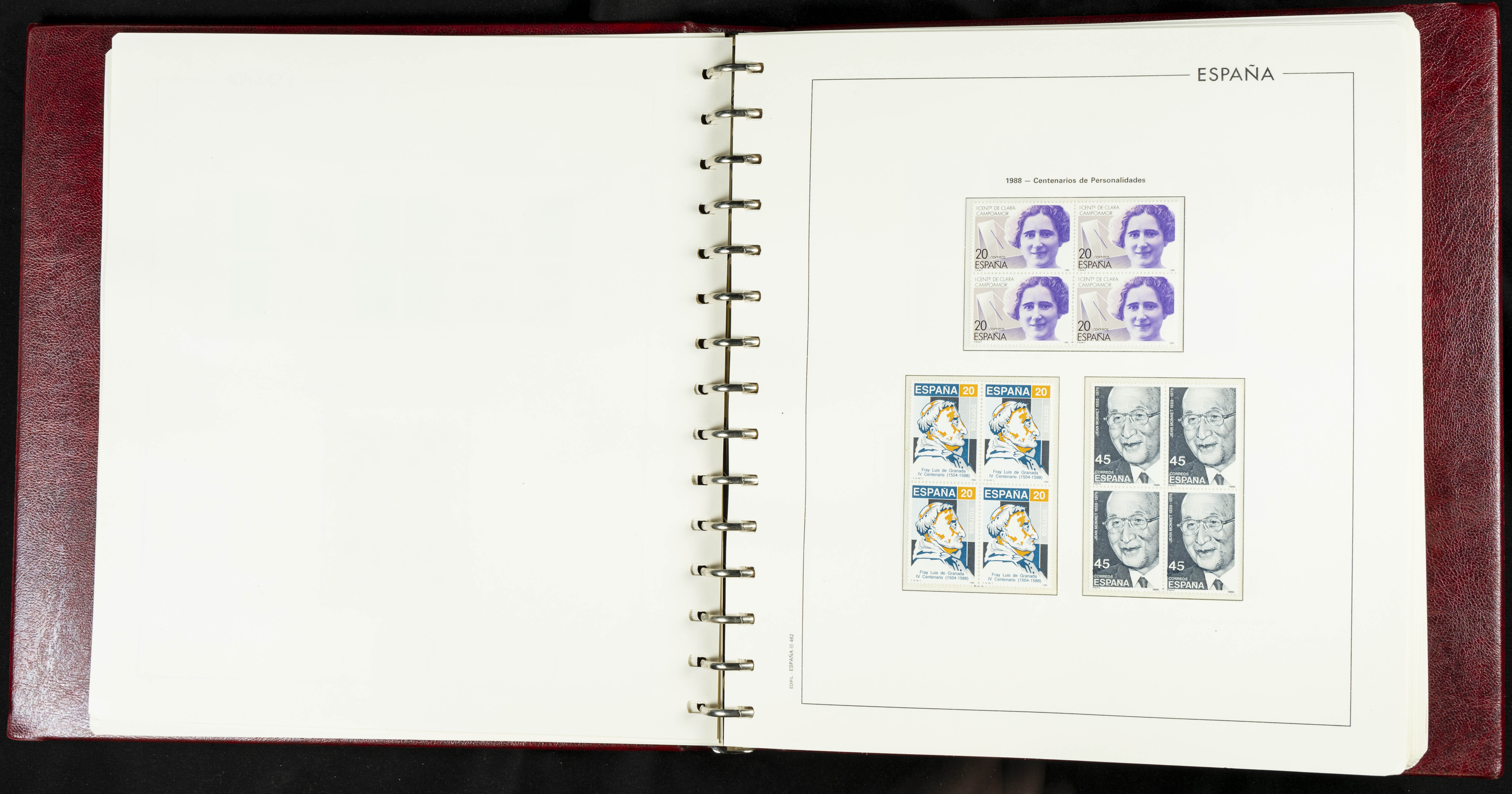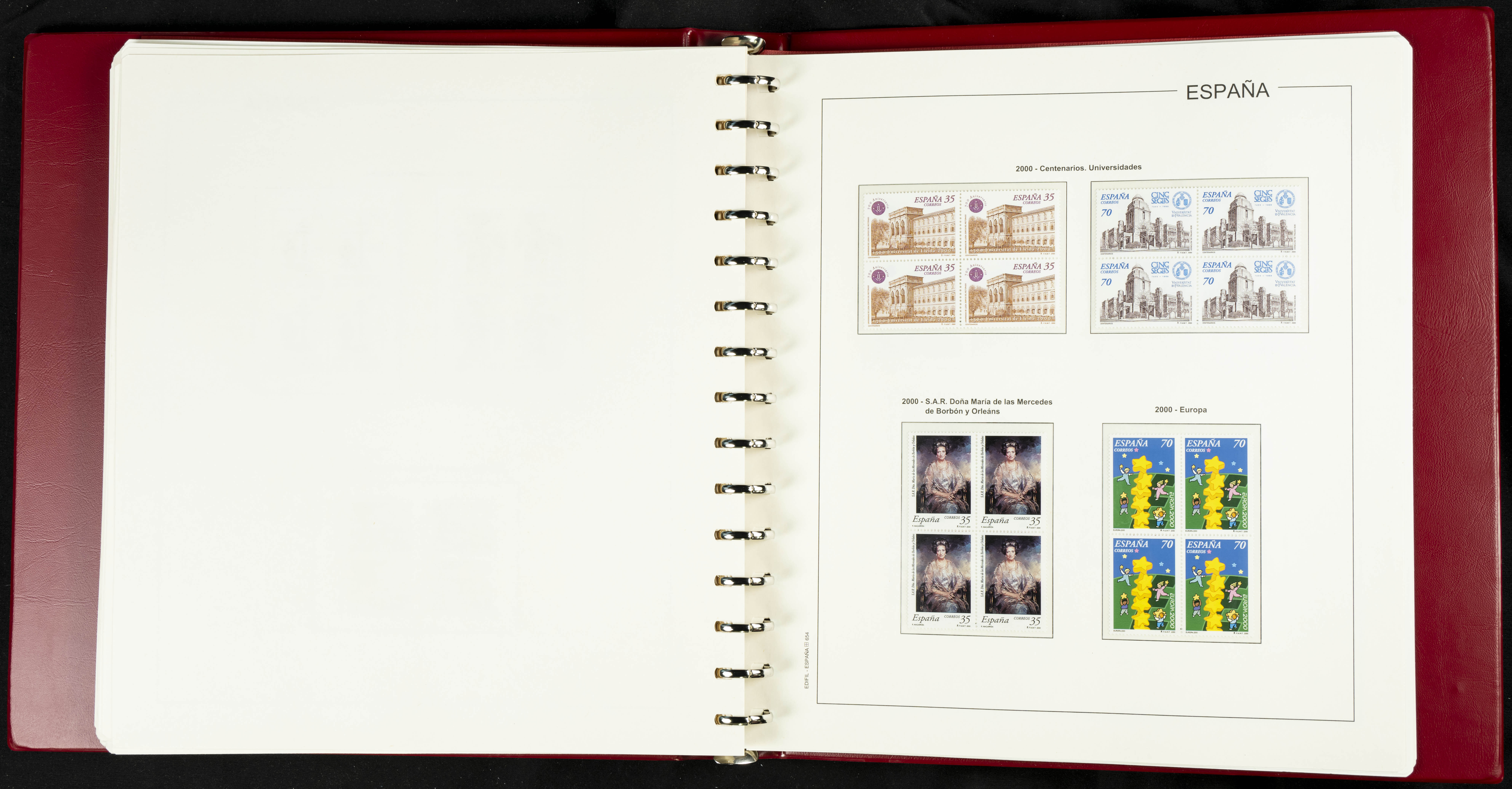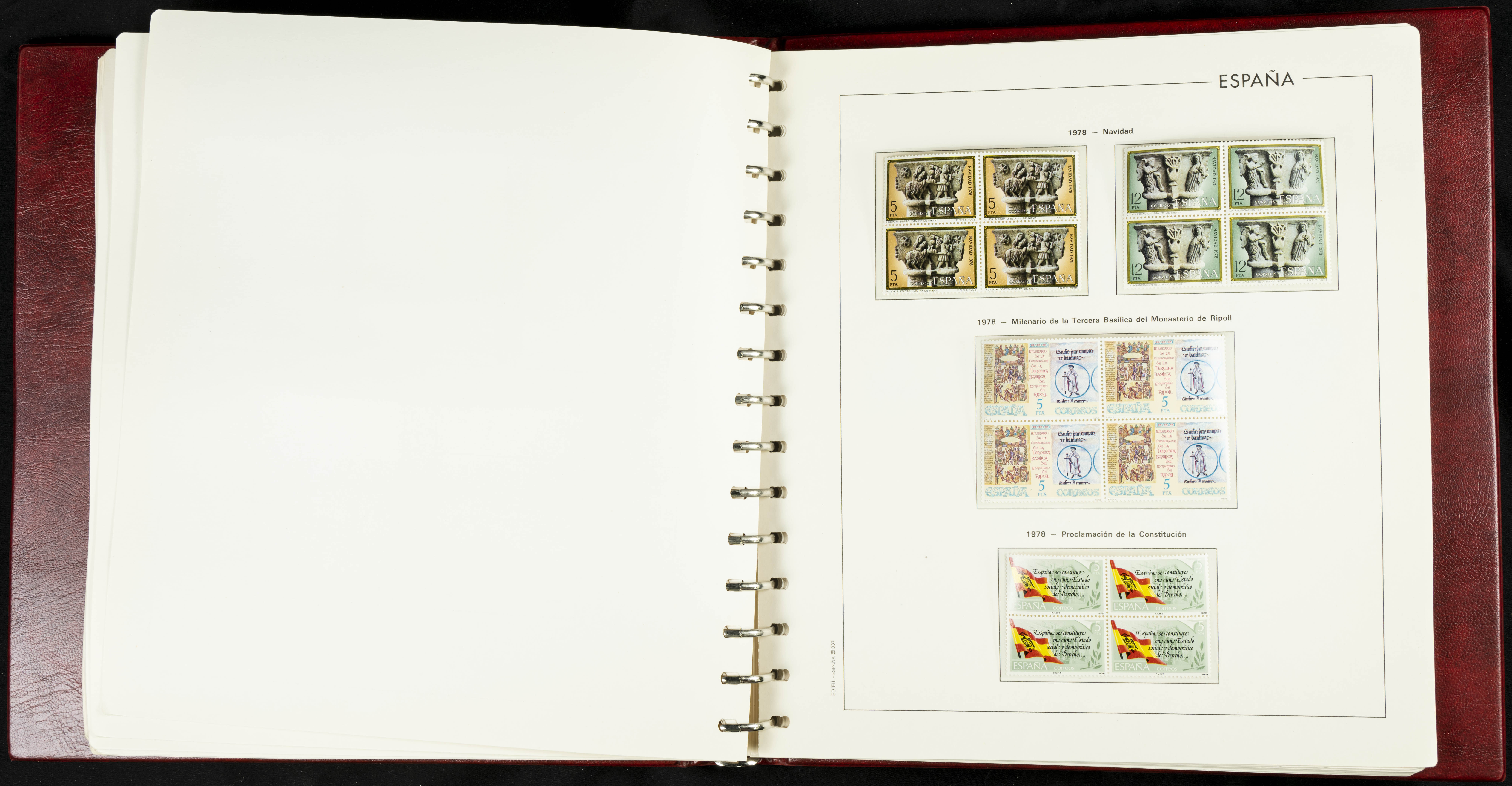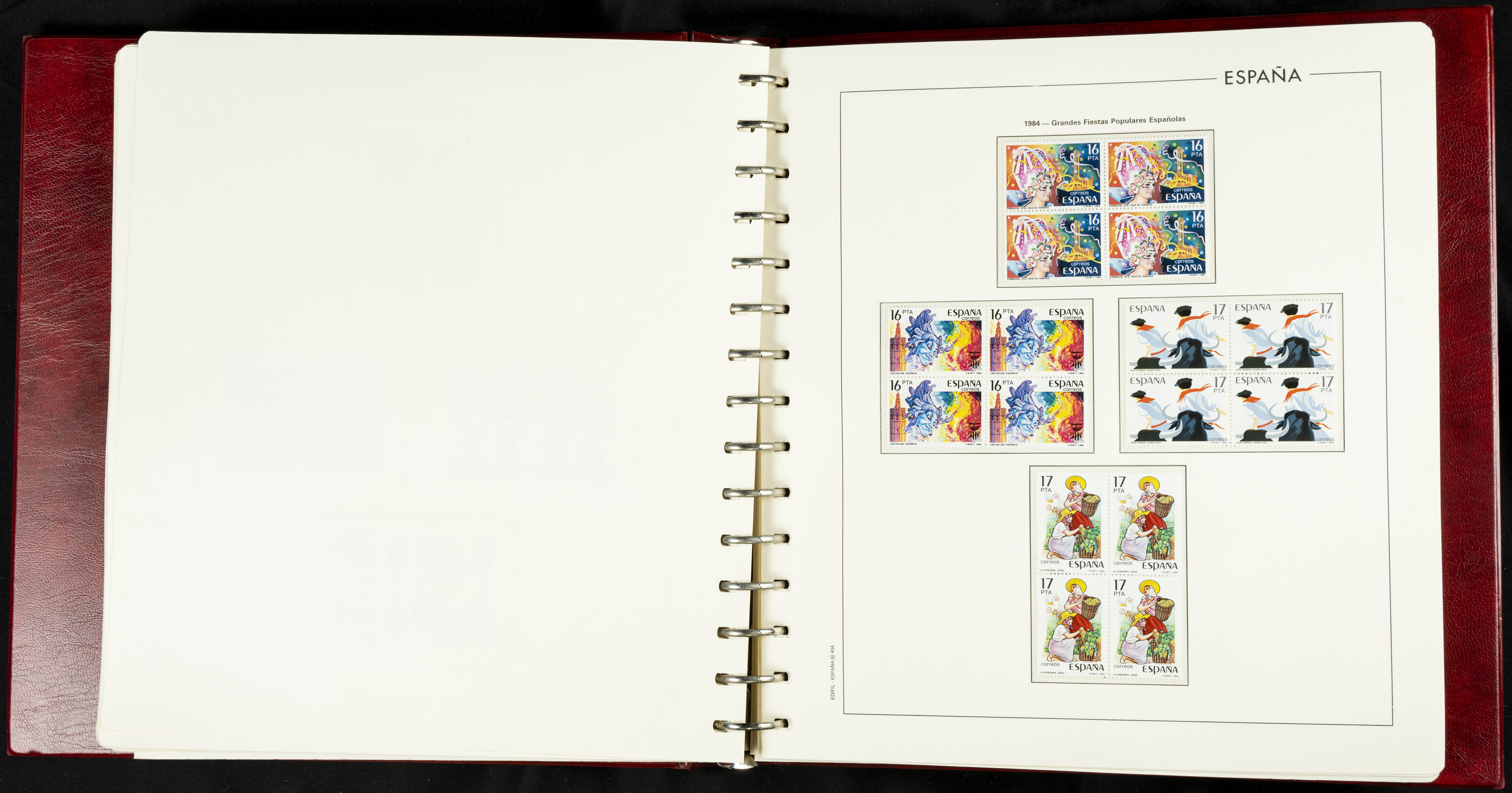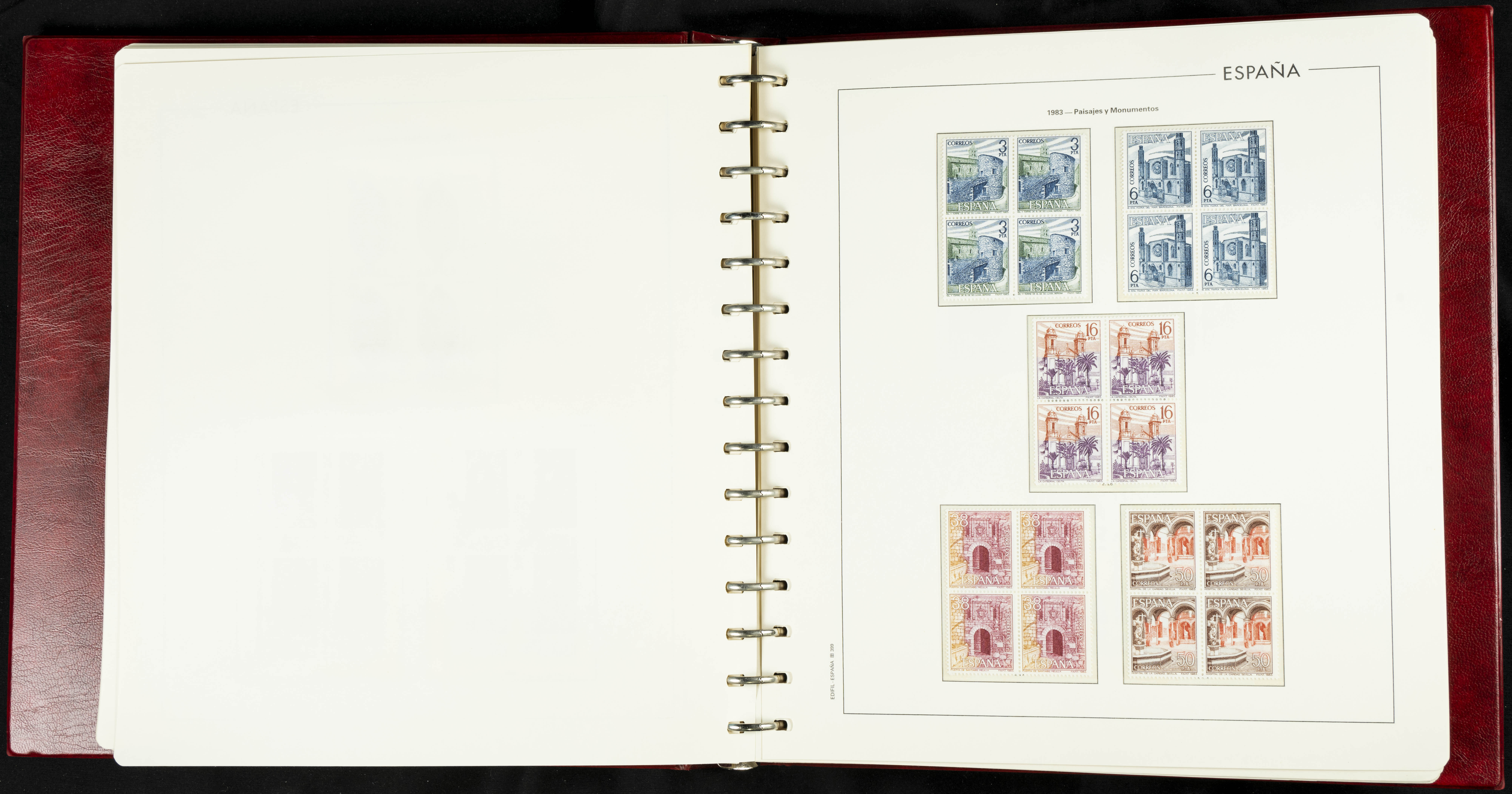 ★★(1976ca). Complete collection between 1976 and 1999, including the 2000 portion denominated exclusively in pesetas, in blocks of four (with a souvenir sheet), in mint condition (mounted in albums). HIGH CATALOGUE VALUE. TO BE EXAMINED.