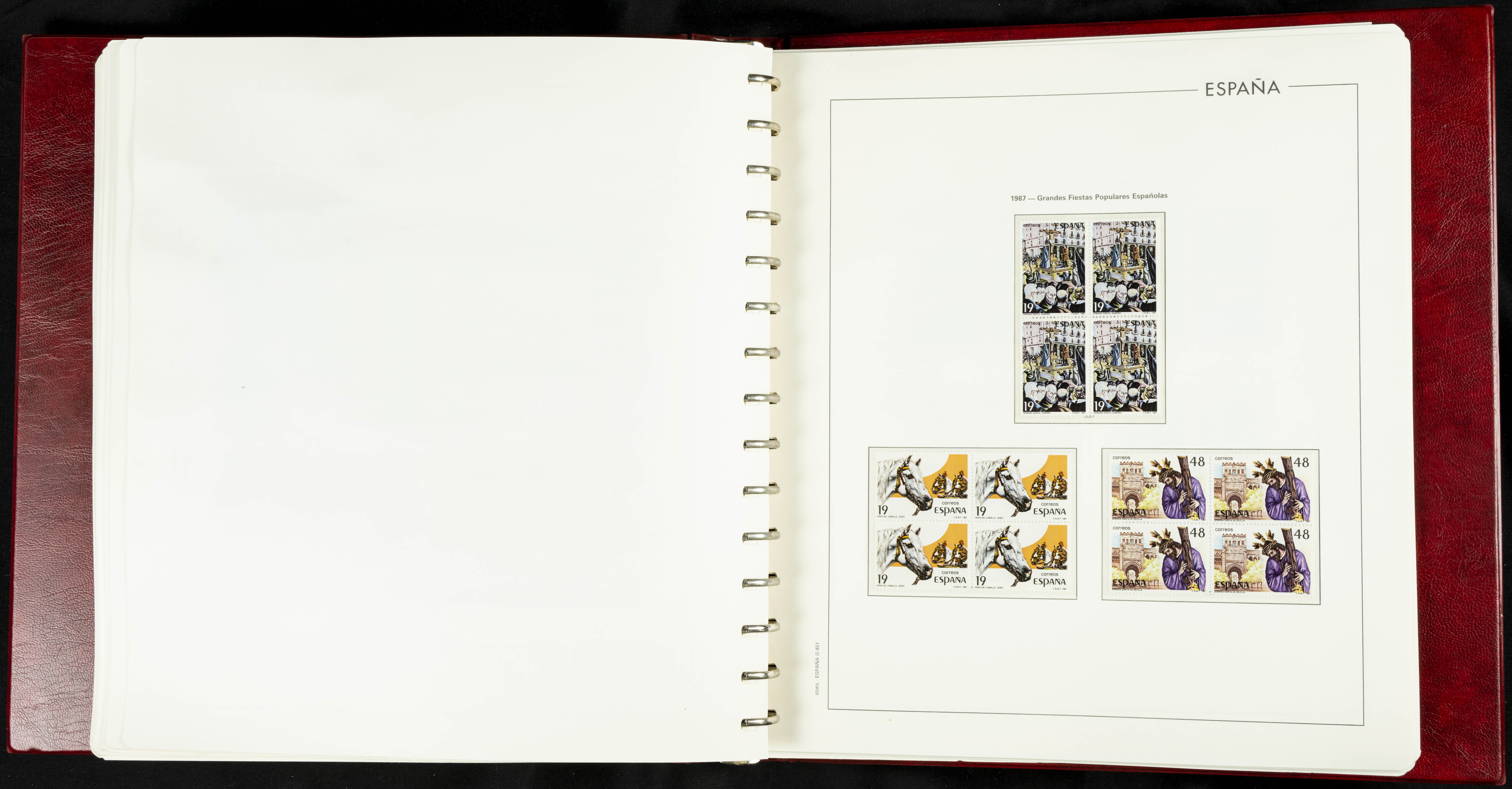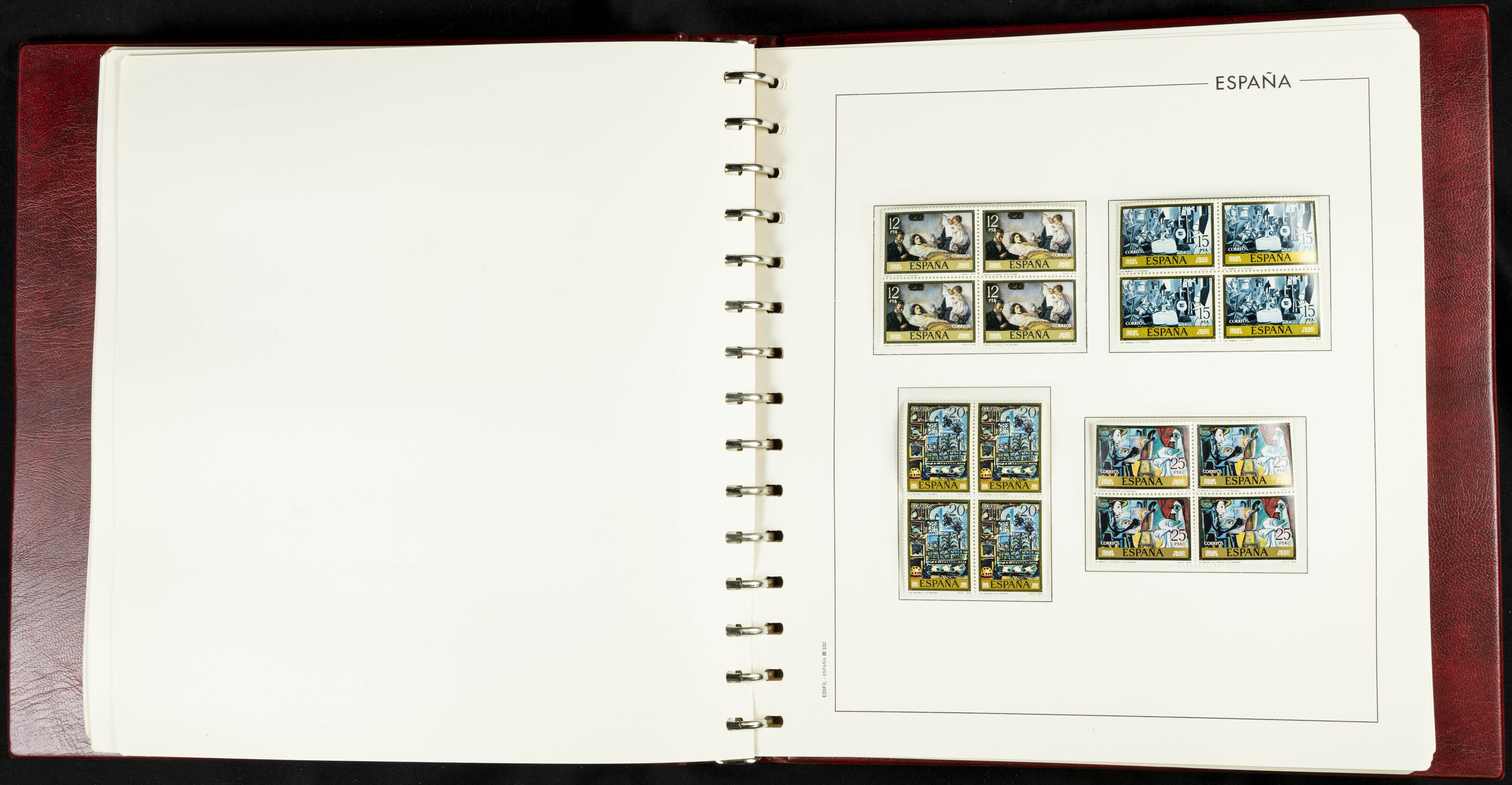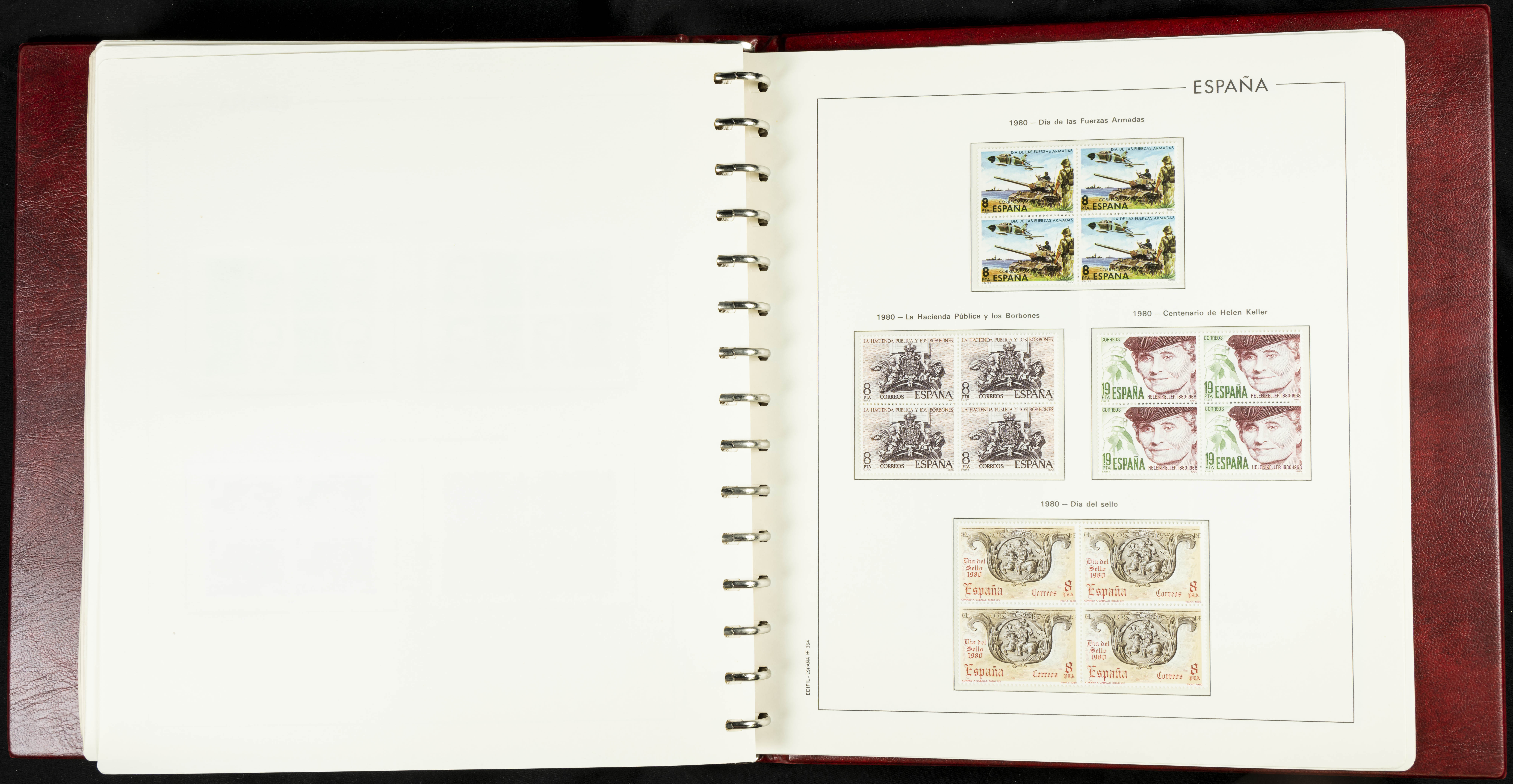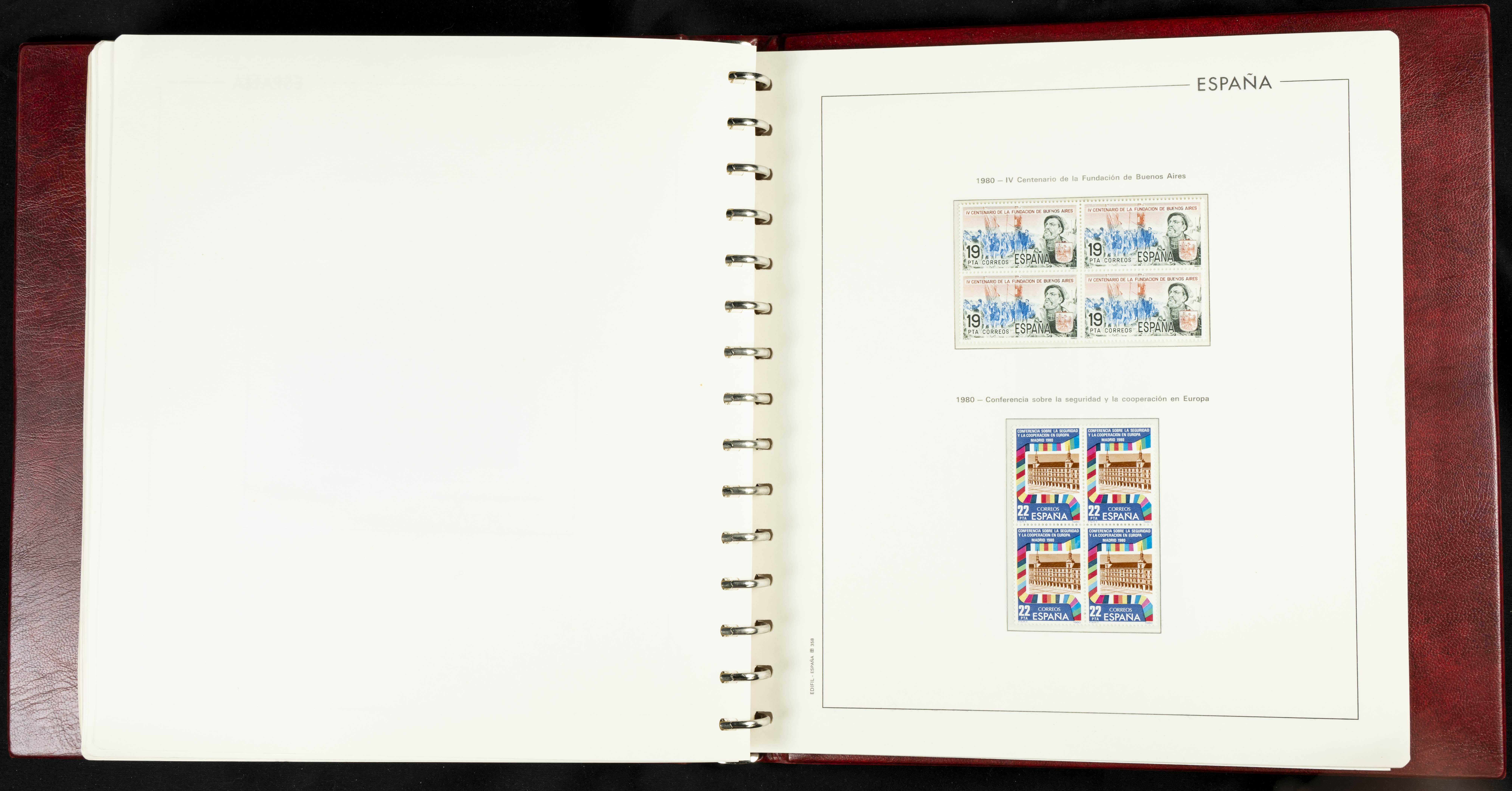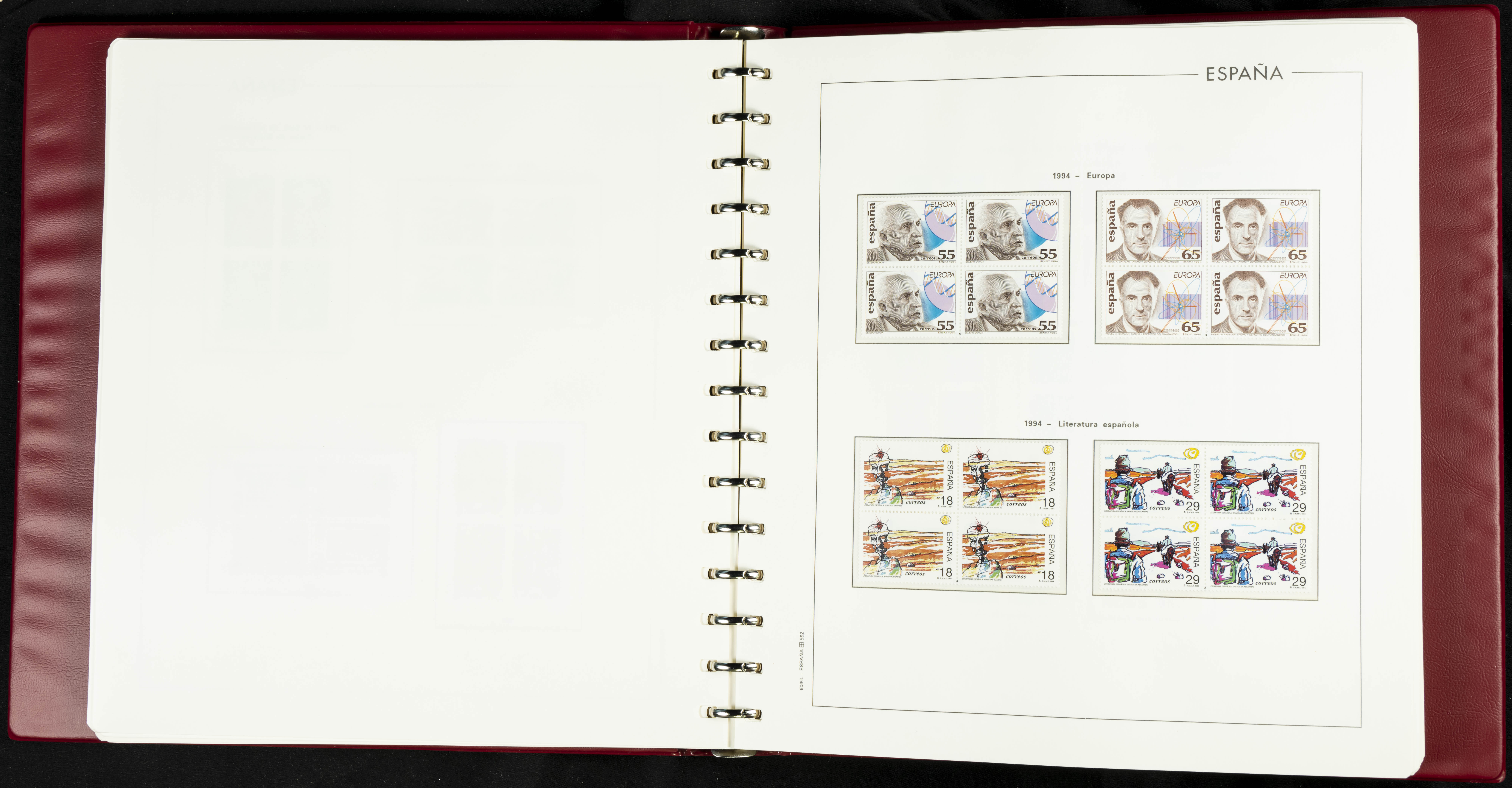 ★★(1976ca). Complete collection between 1976 and 1999, including the 2000 portion denominated exclusively in pesetas, in blocks of four (with a souvenir sheet), in mint condition (mounted in albums). HIGH CATALOGUE VALUE. TO BE EXAMINED.