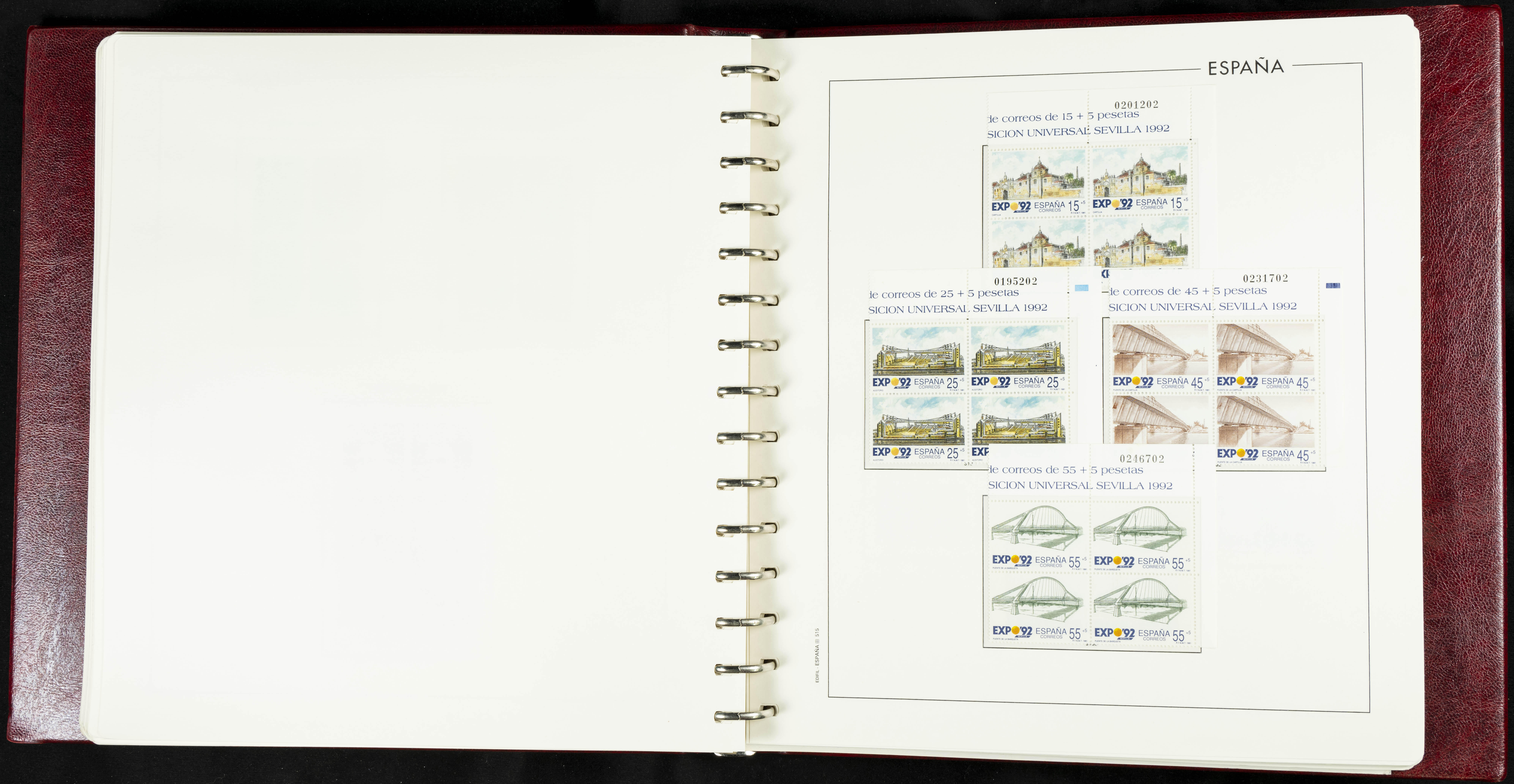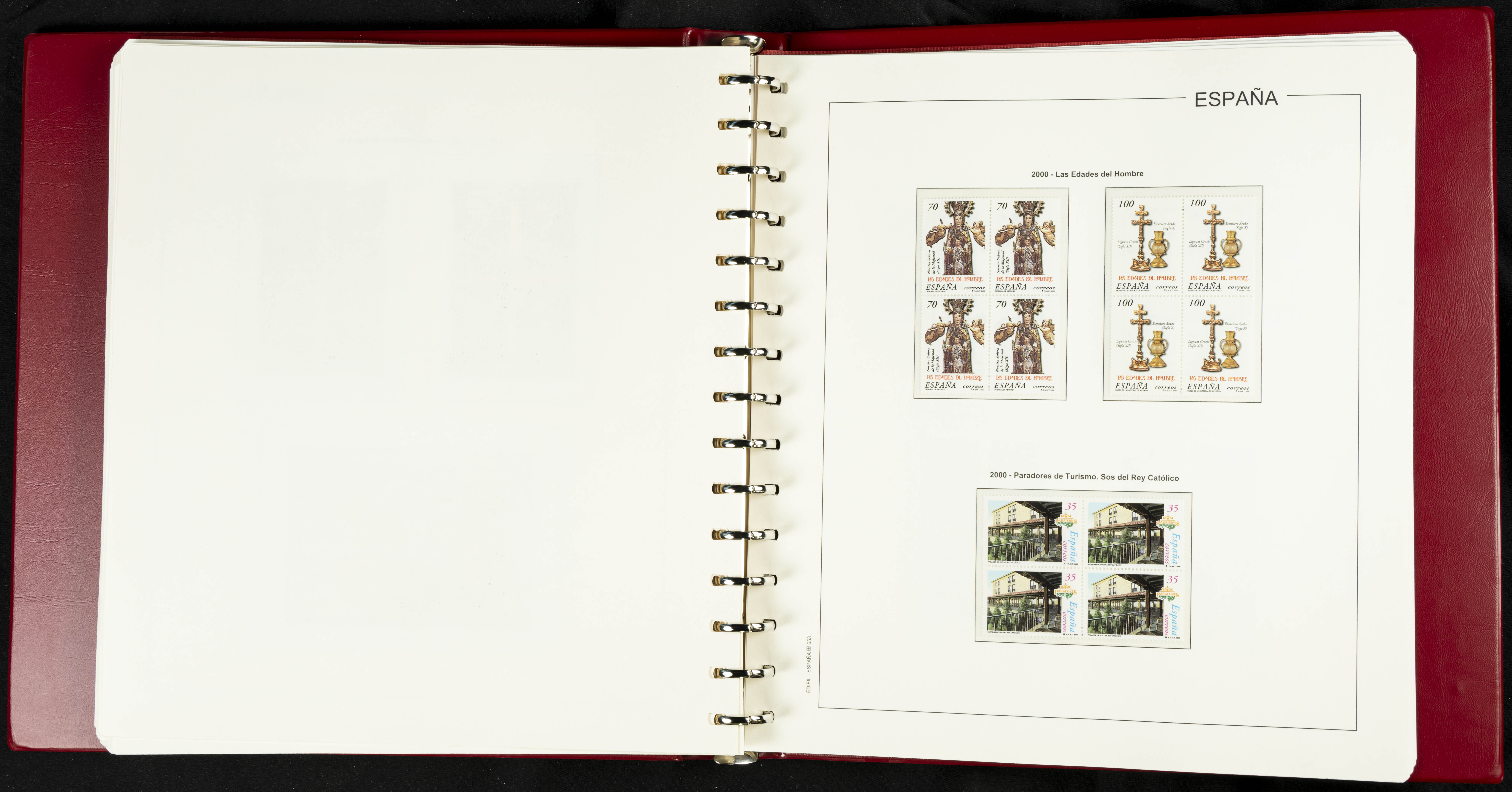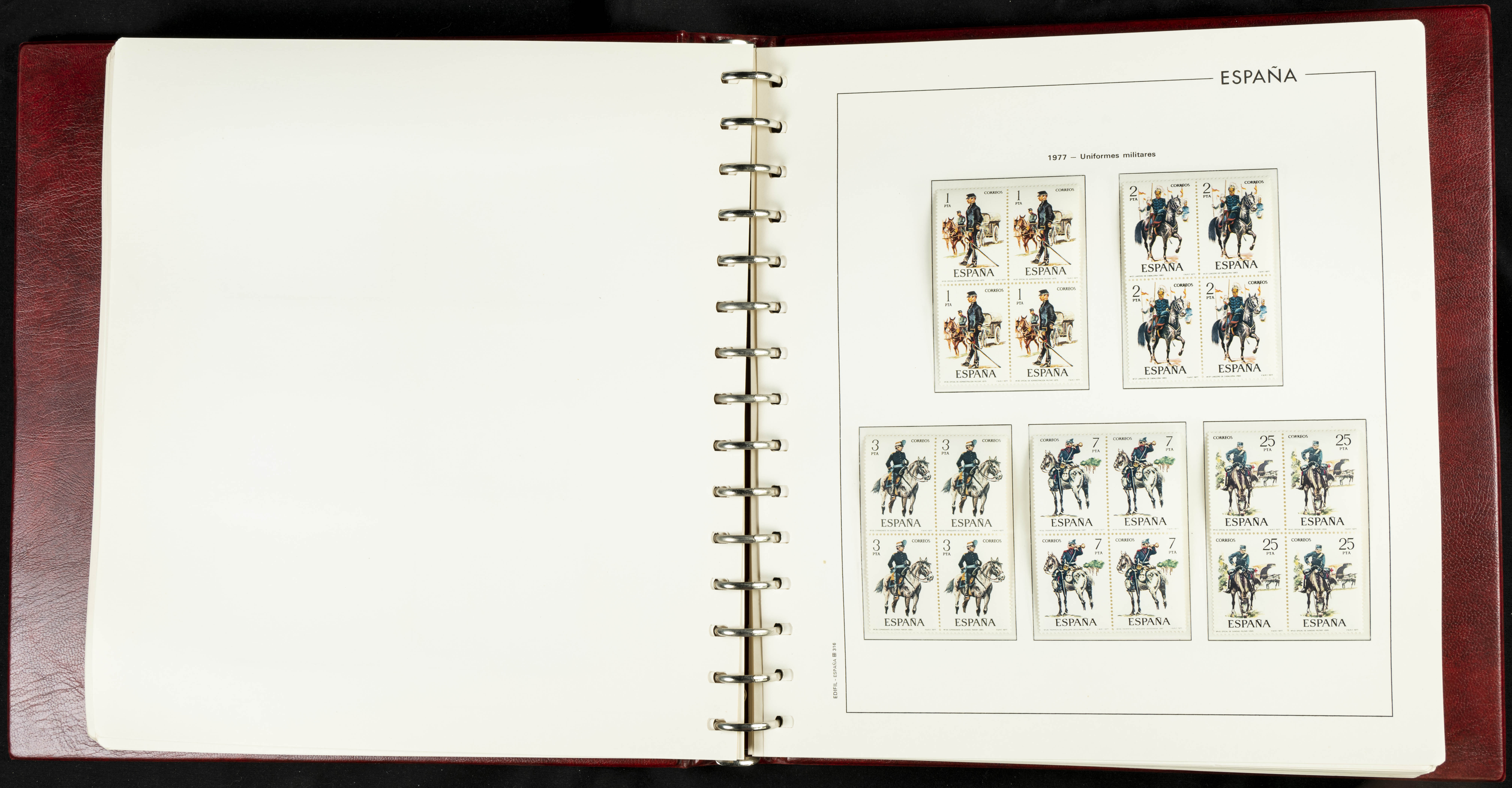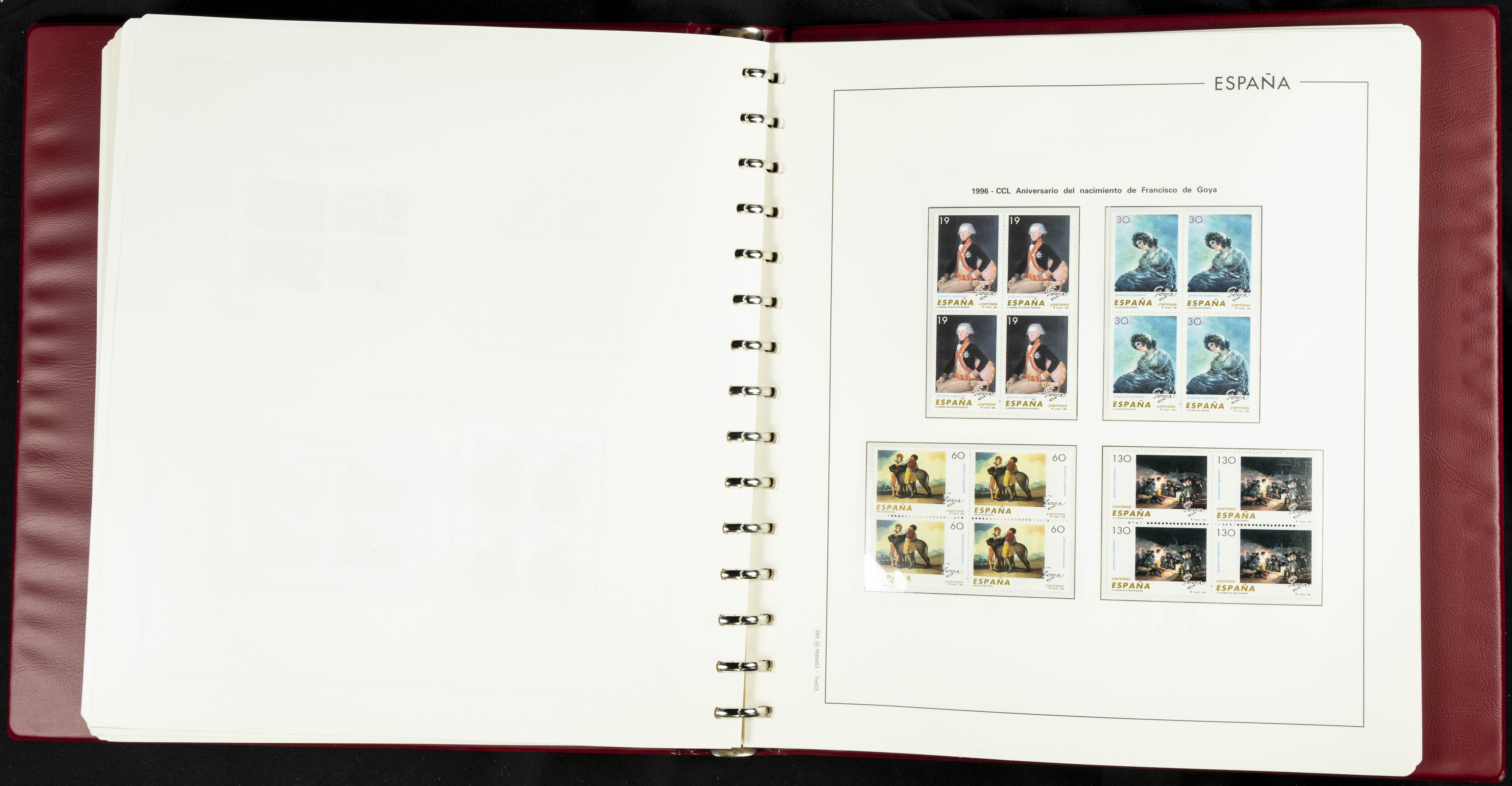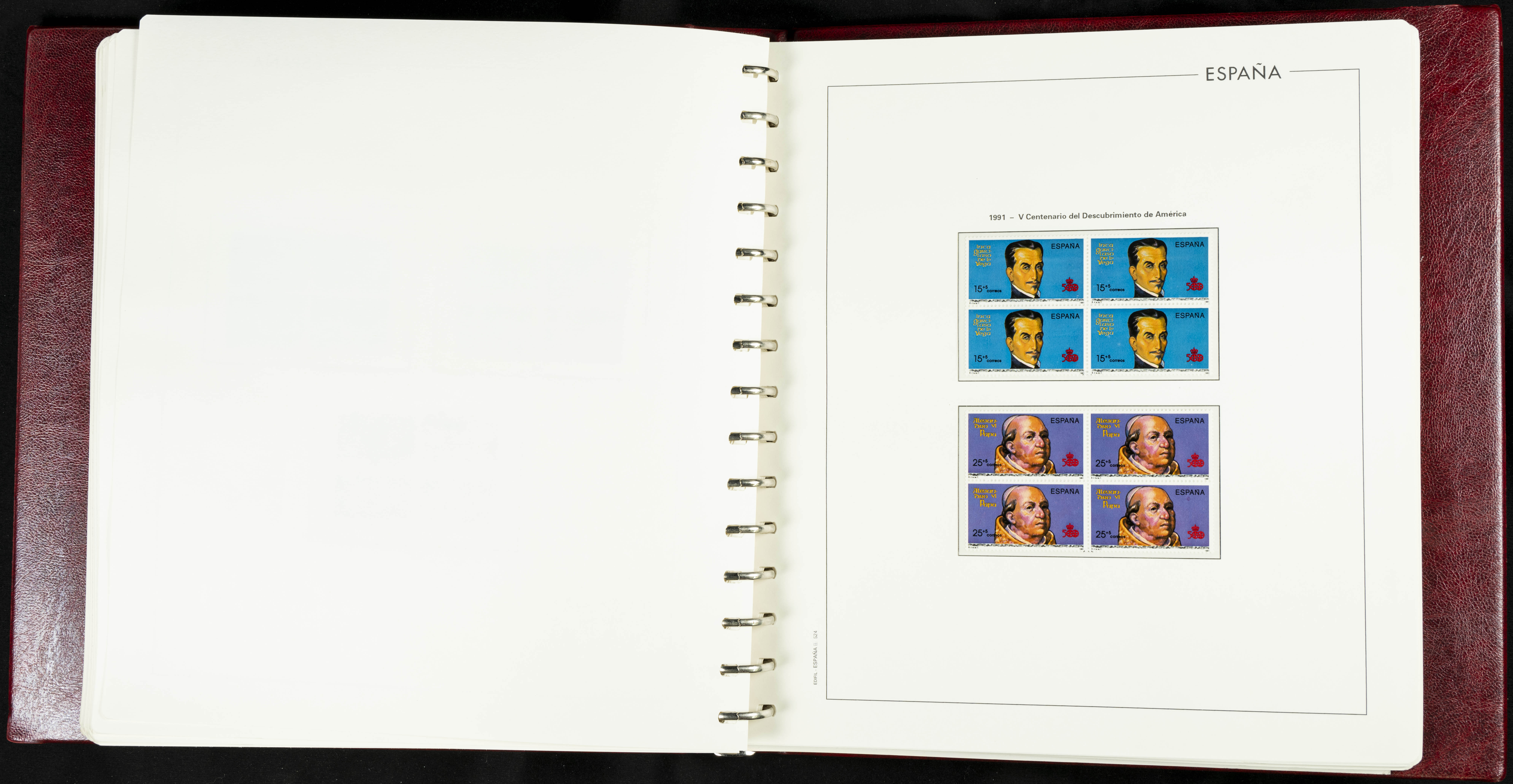★★(1976ca). Complete collection between 1976 and 1999, including the 2000 portion denominated exclusively in pesetas, in blocks of four (with a souvenir sheet), in mint condition (mounted in albums). HIGH CATALOGUE VALUE. TO BE EXAMINED.