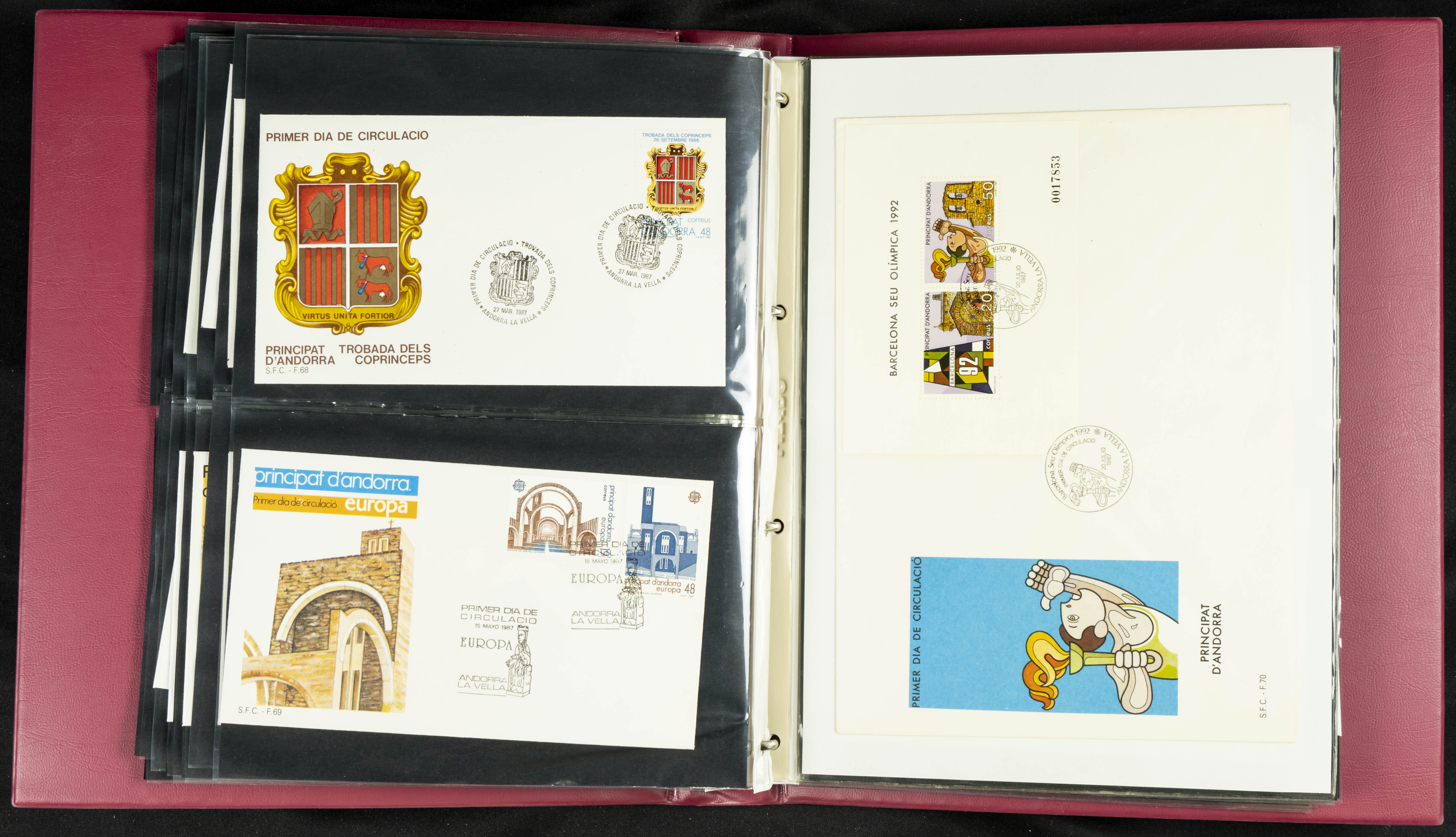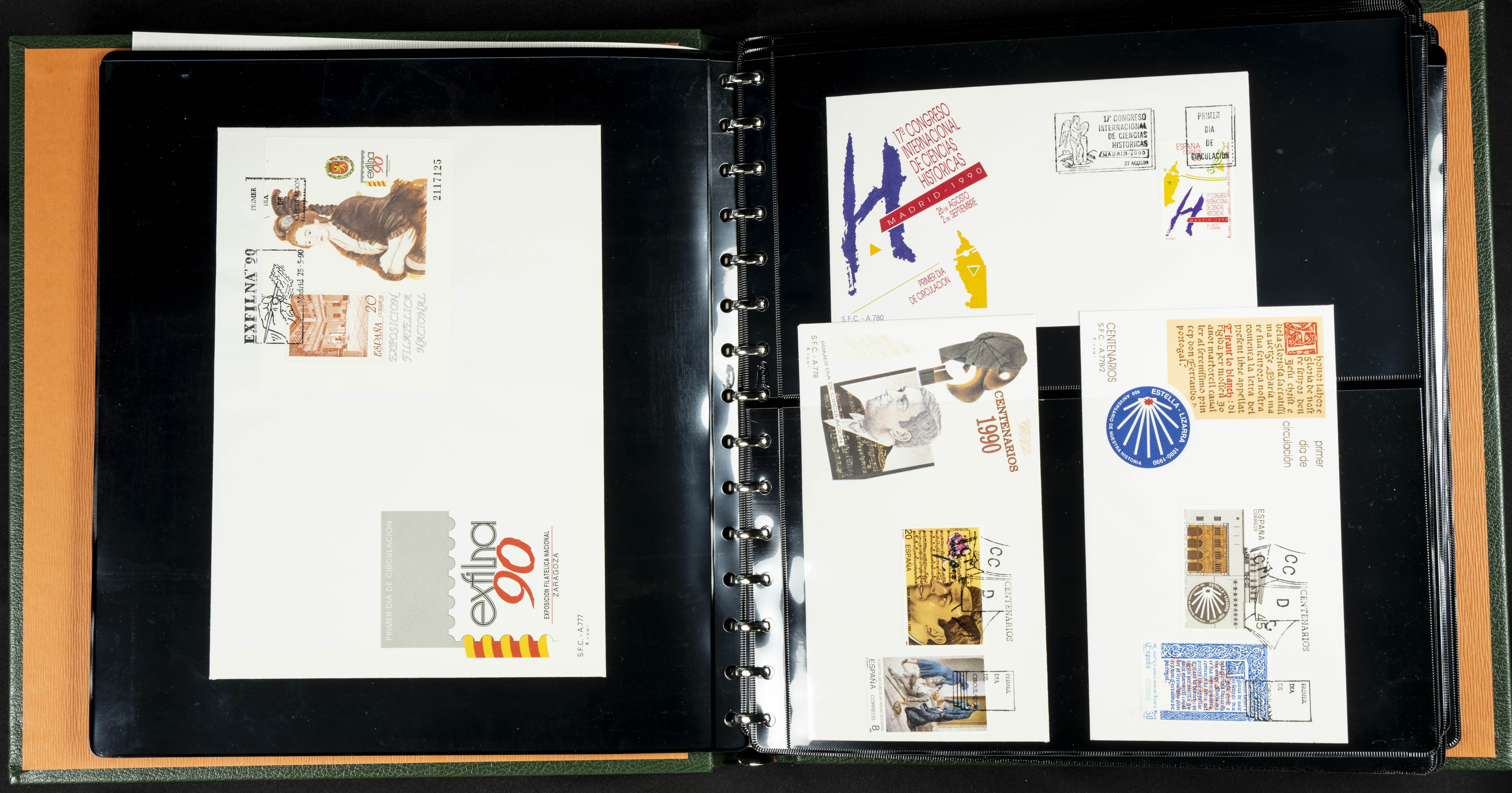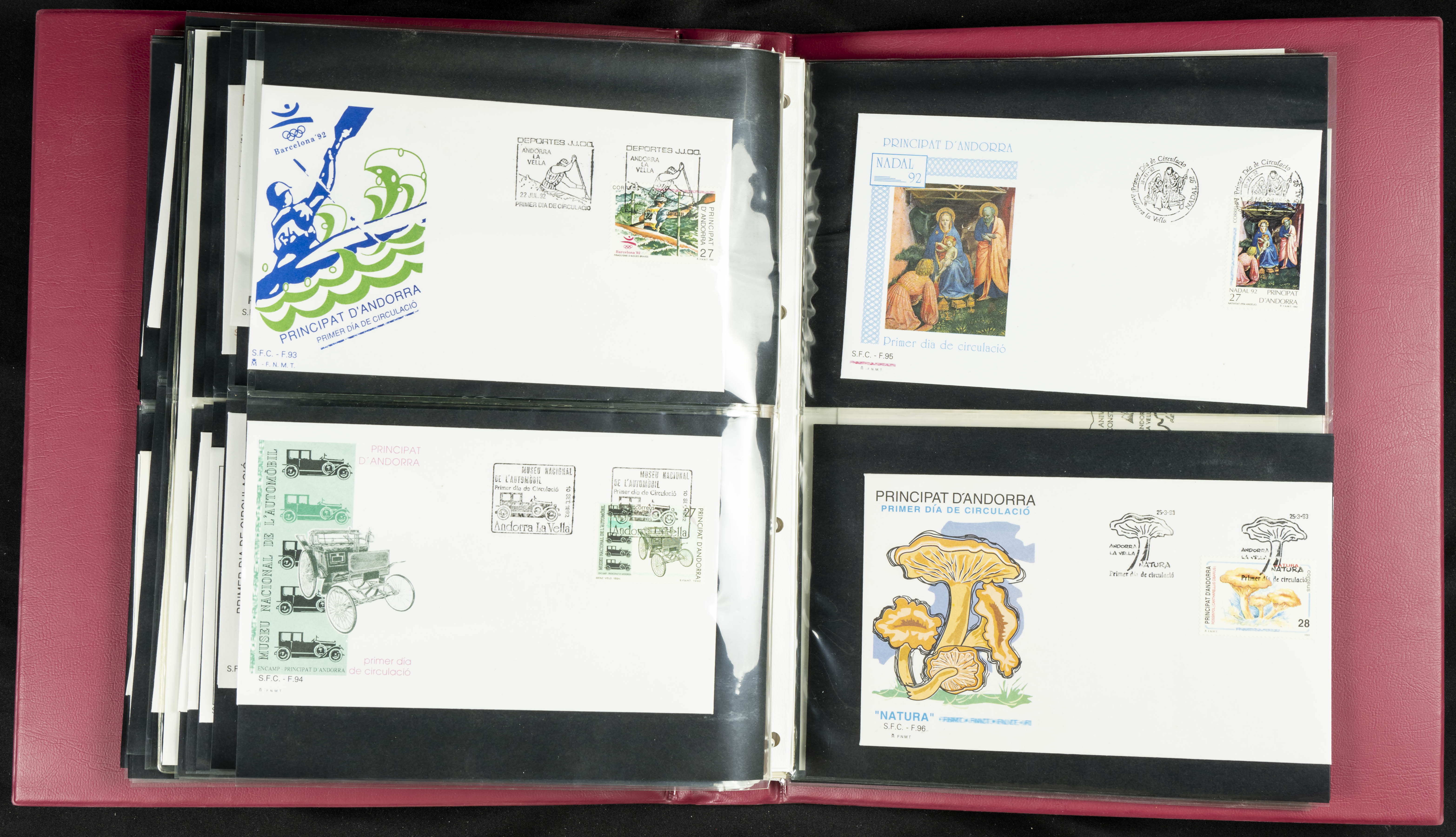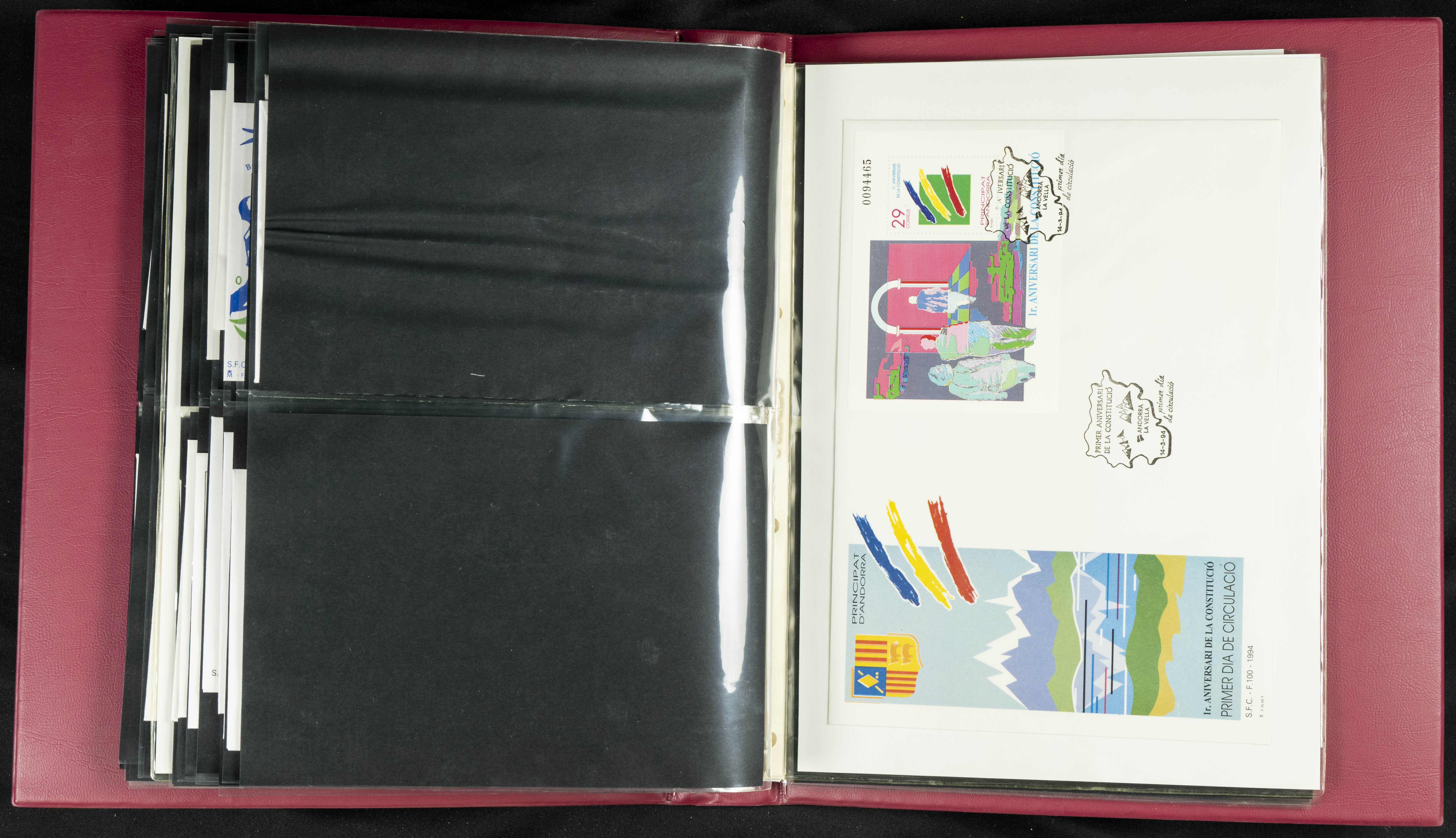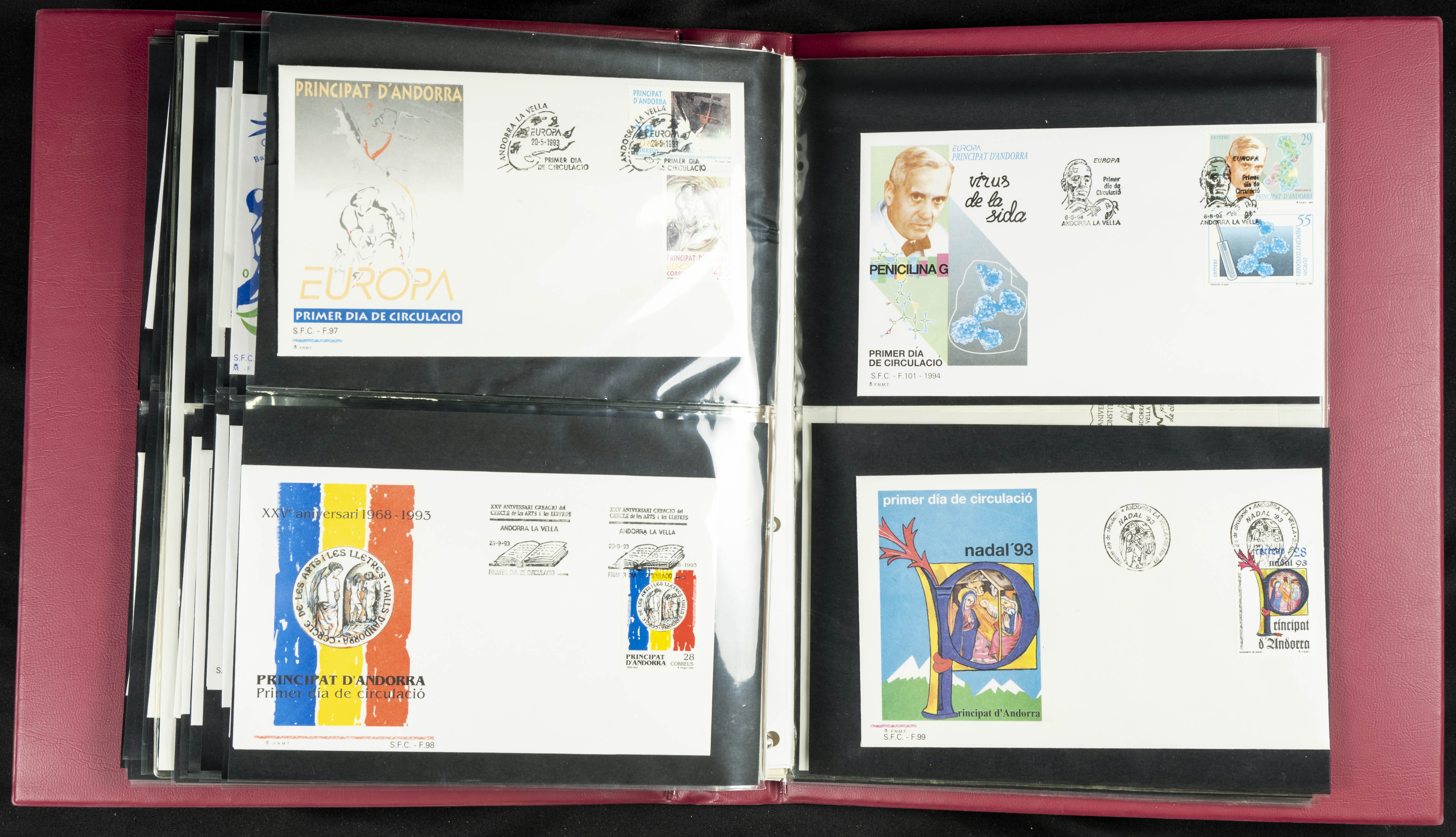 English (1990ca). Collection of First Day Covers between 1990 and 2001, includes large formats, some covers from previous years (Suits and World Cup 82) and Spanish Andorra between 1980 and 1994. TO BE EXAMINED.