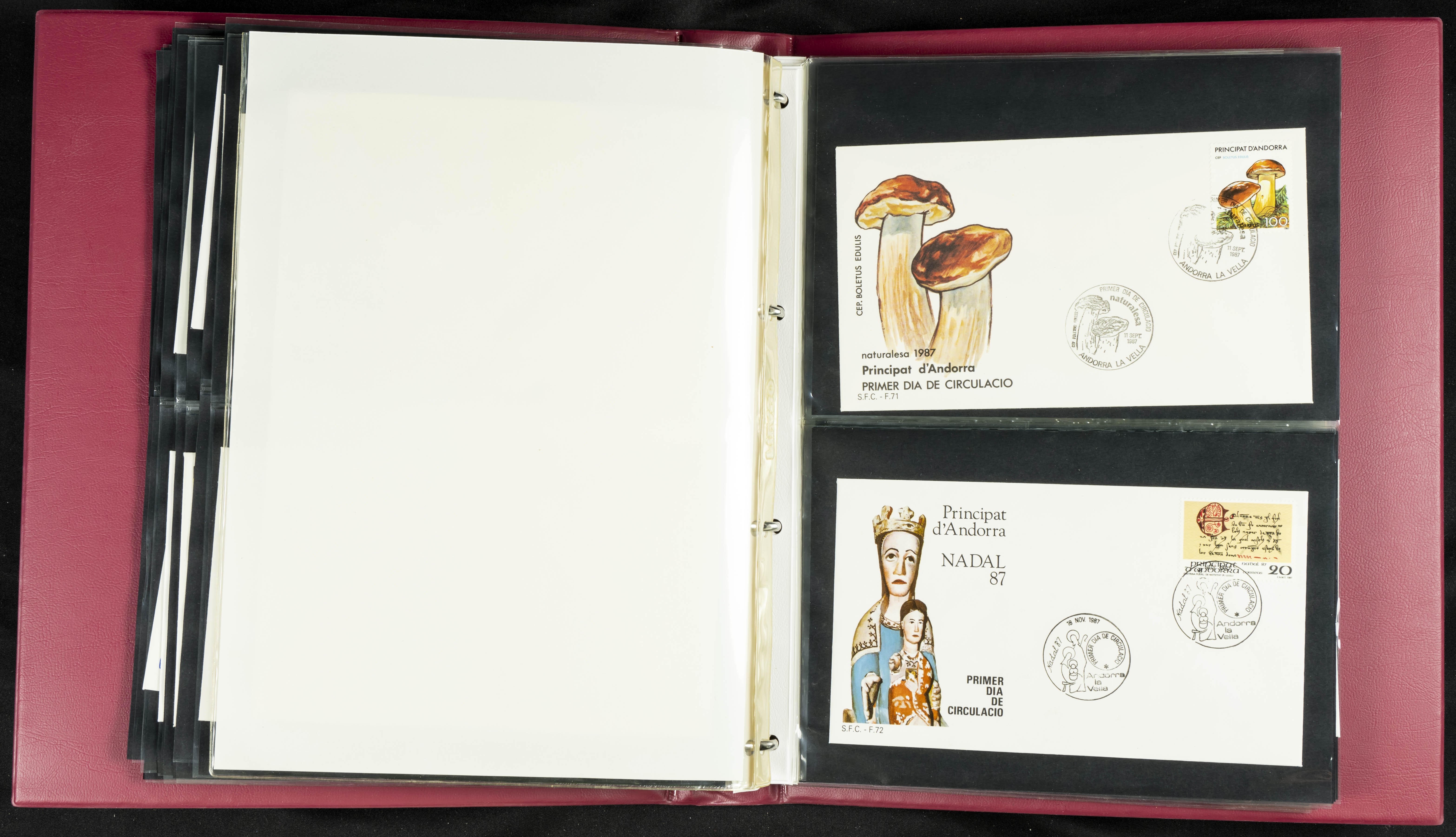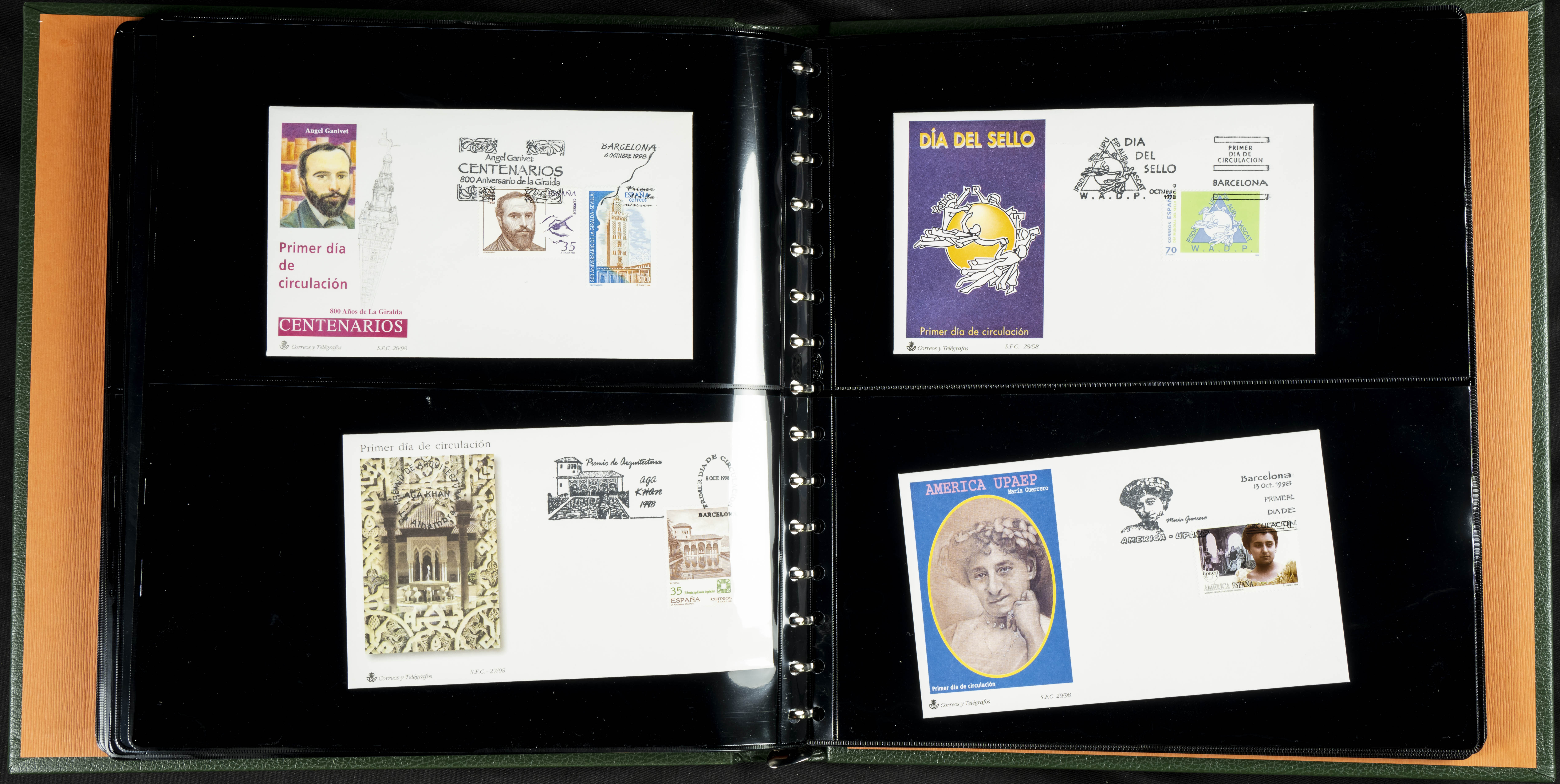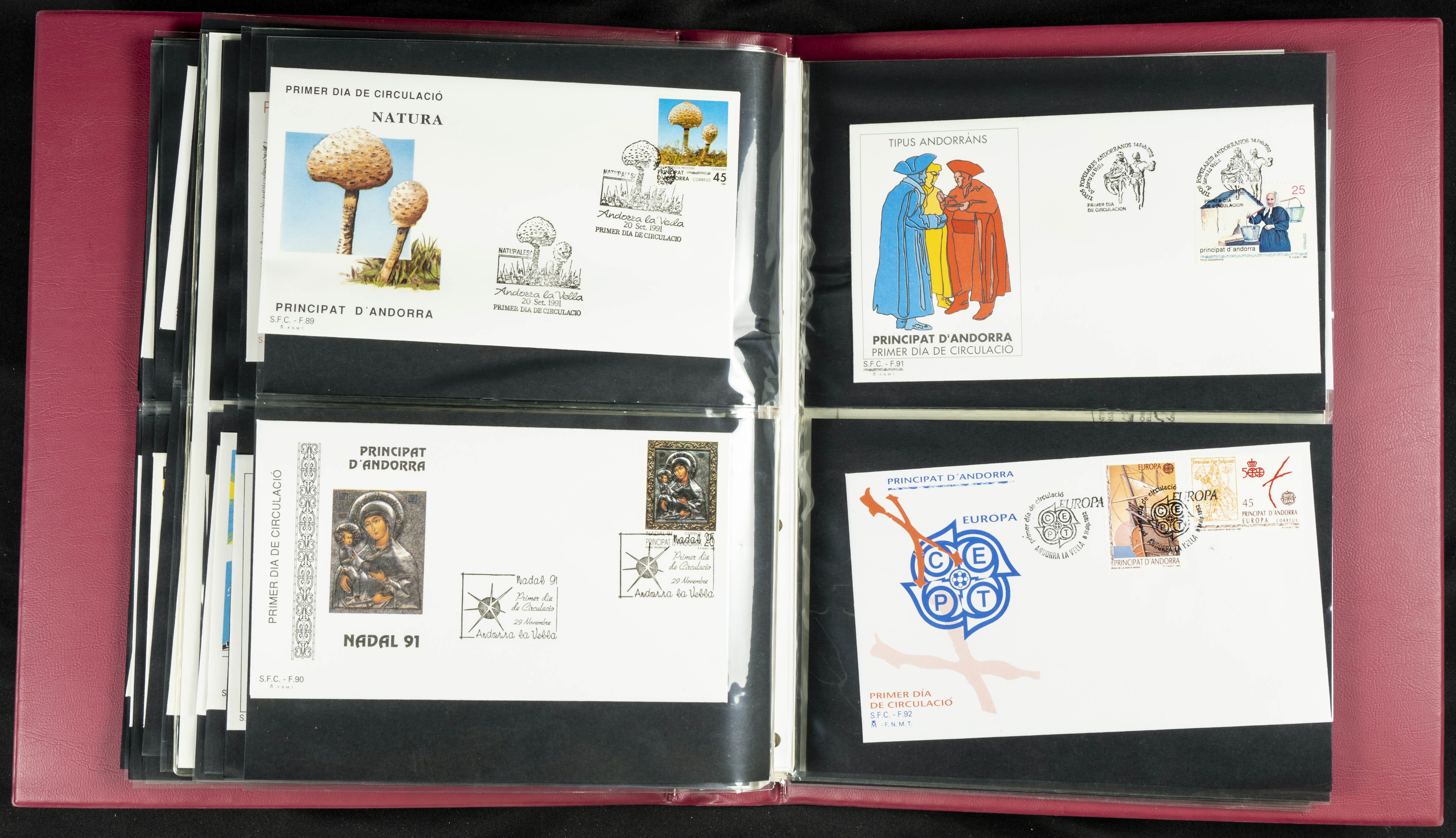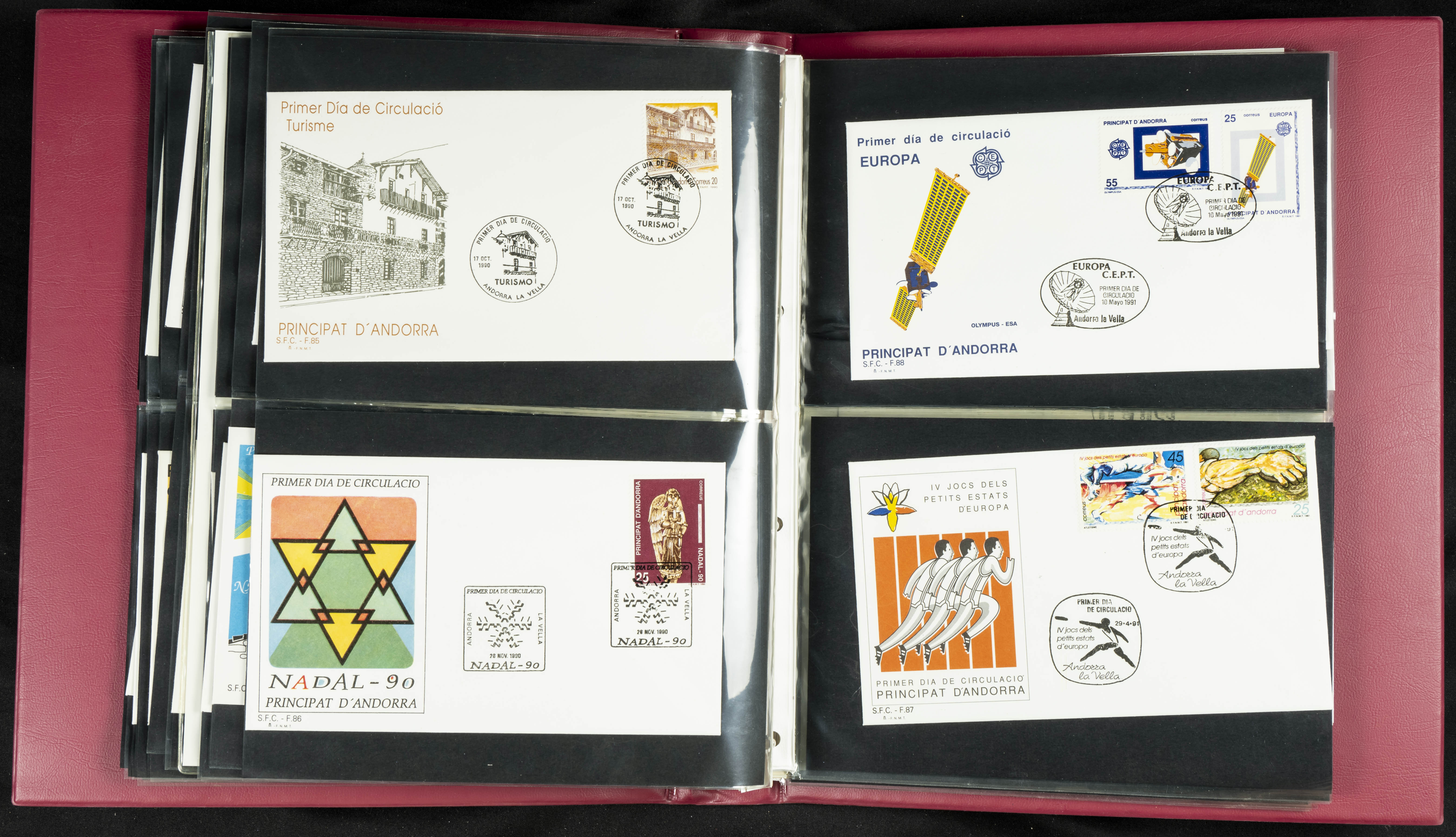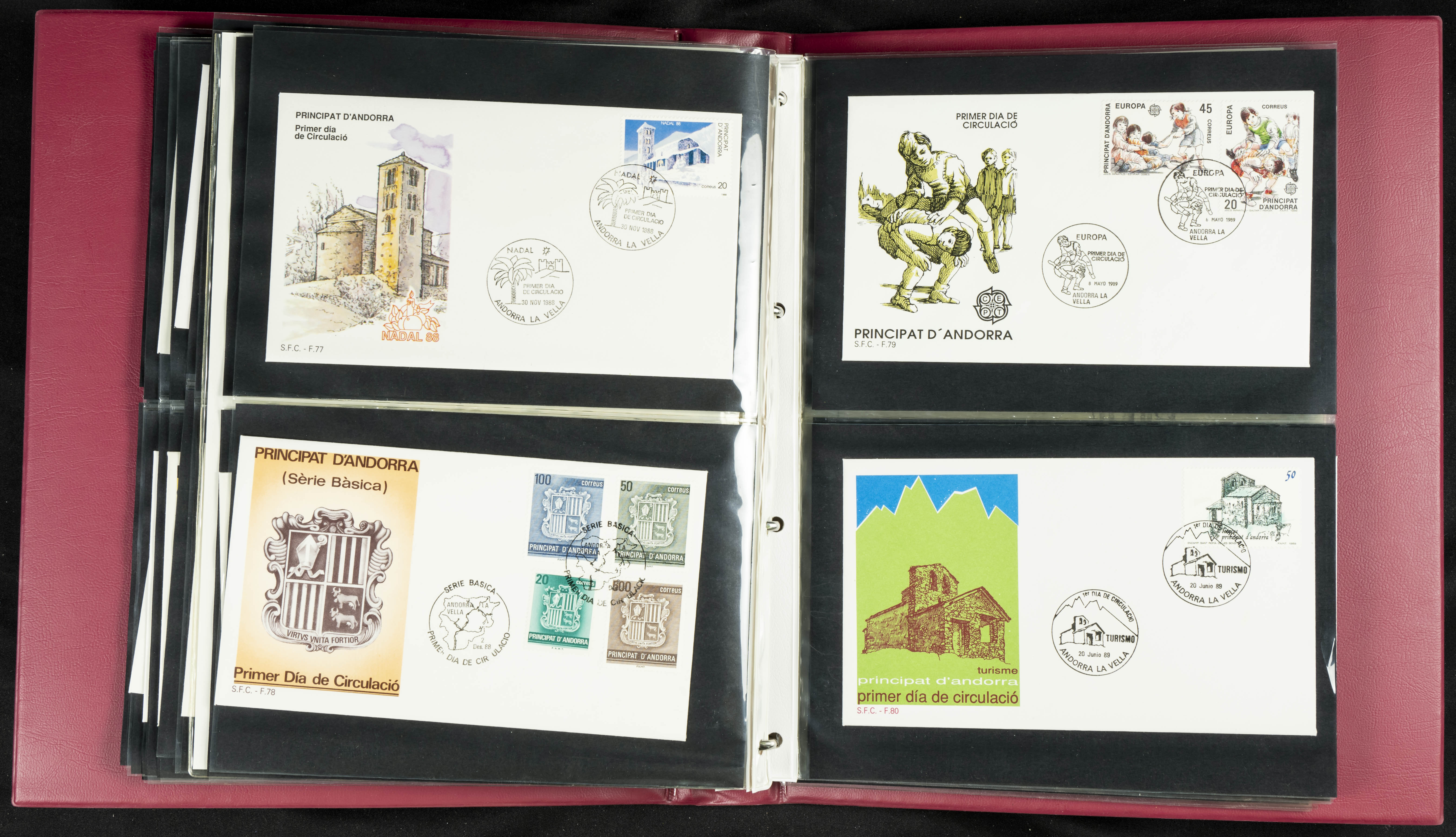 English (1990ca). Collection of First Day Covers between 1990 and 2001, includes large formats, some covers from previous years (Suits and World Cup 82) and Spanish Andorra between 1980 and 1994. TO BE EXAMINED.