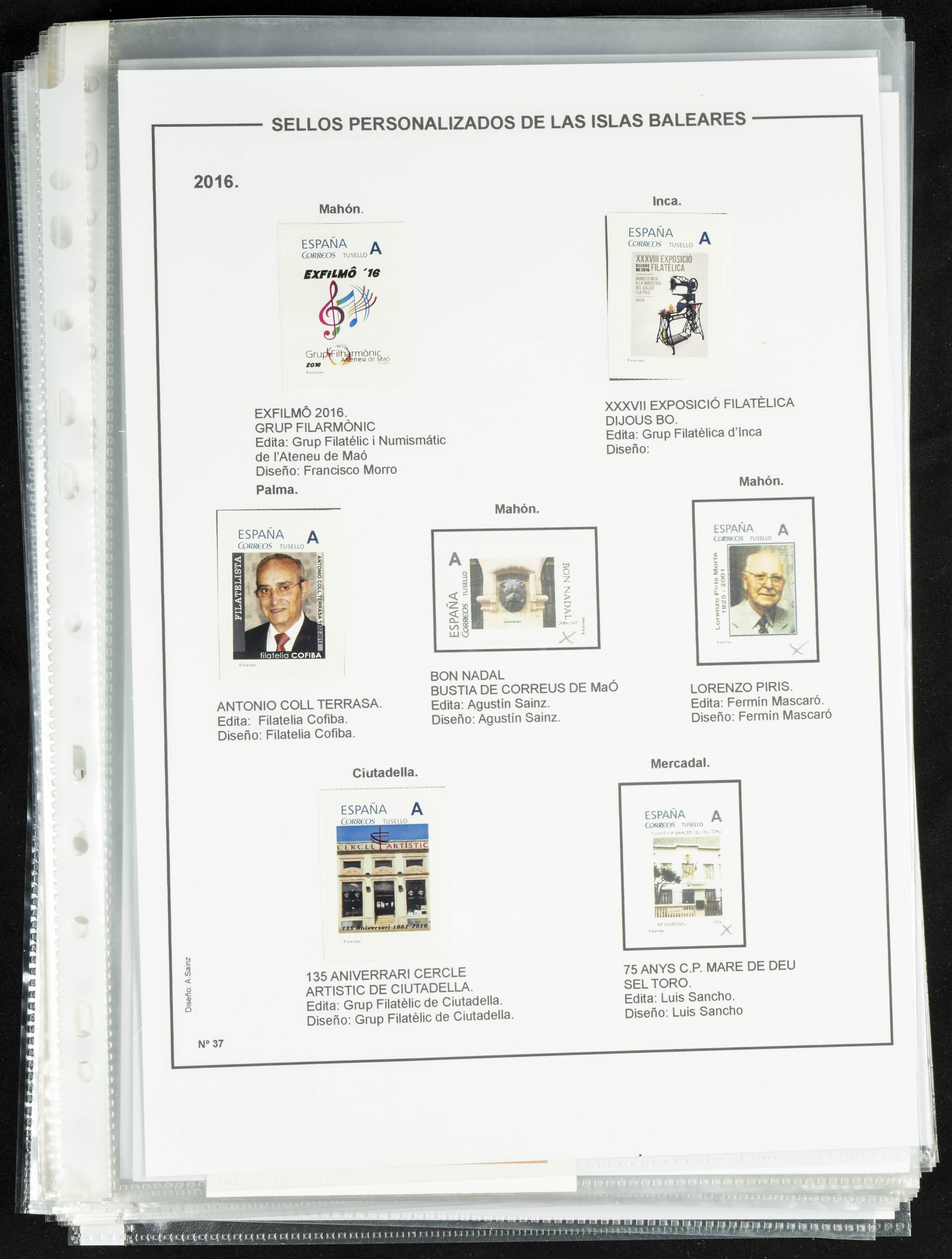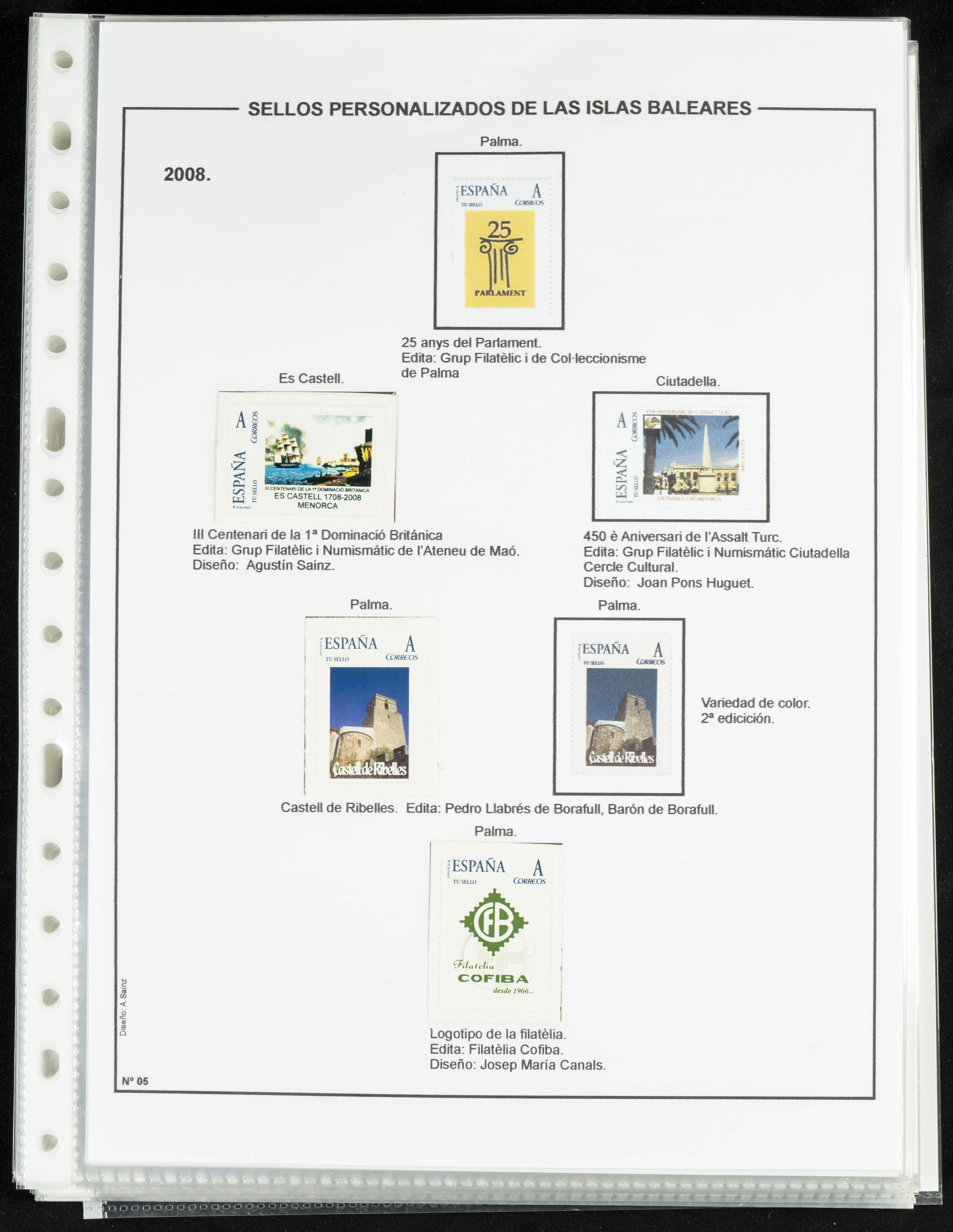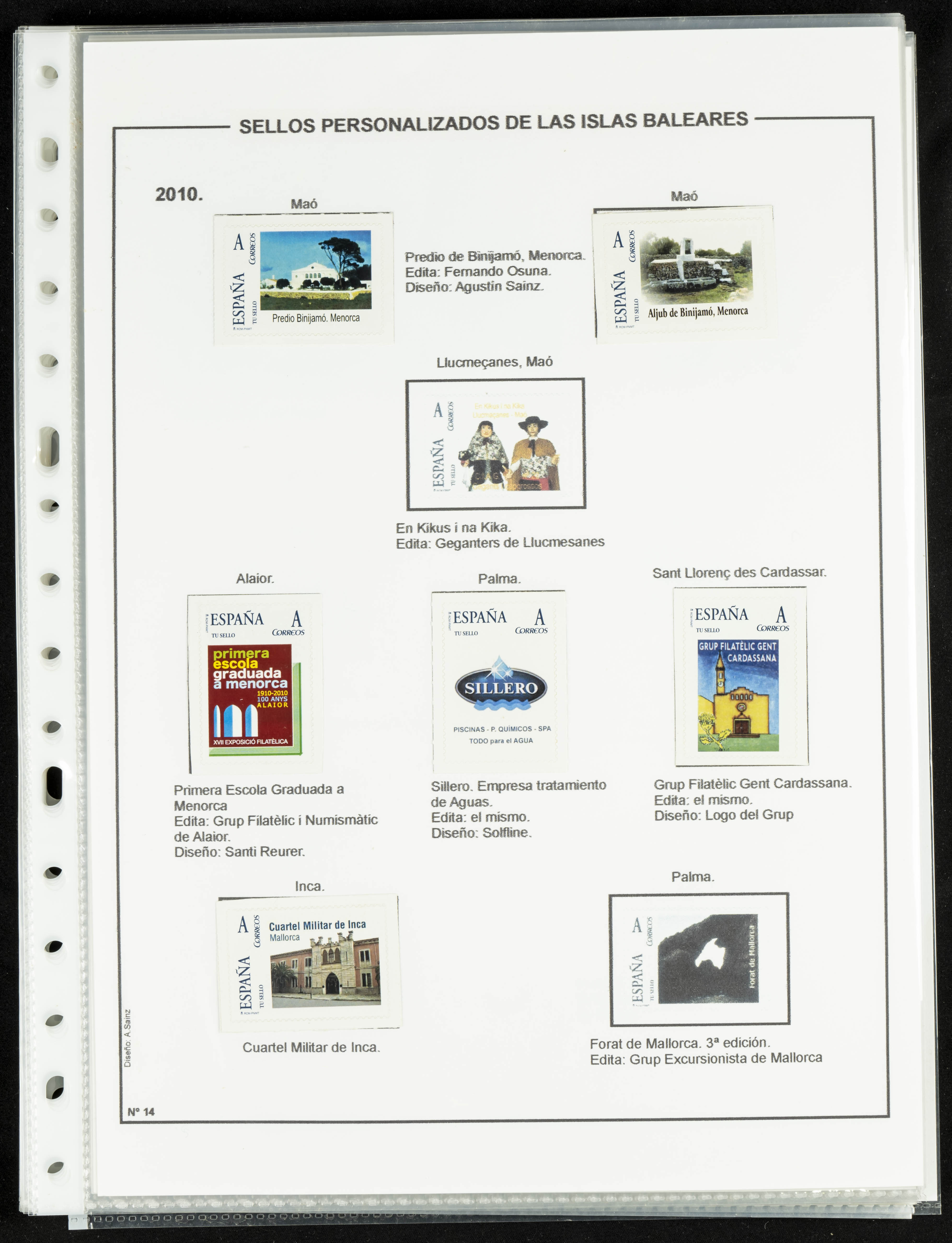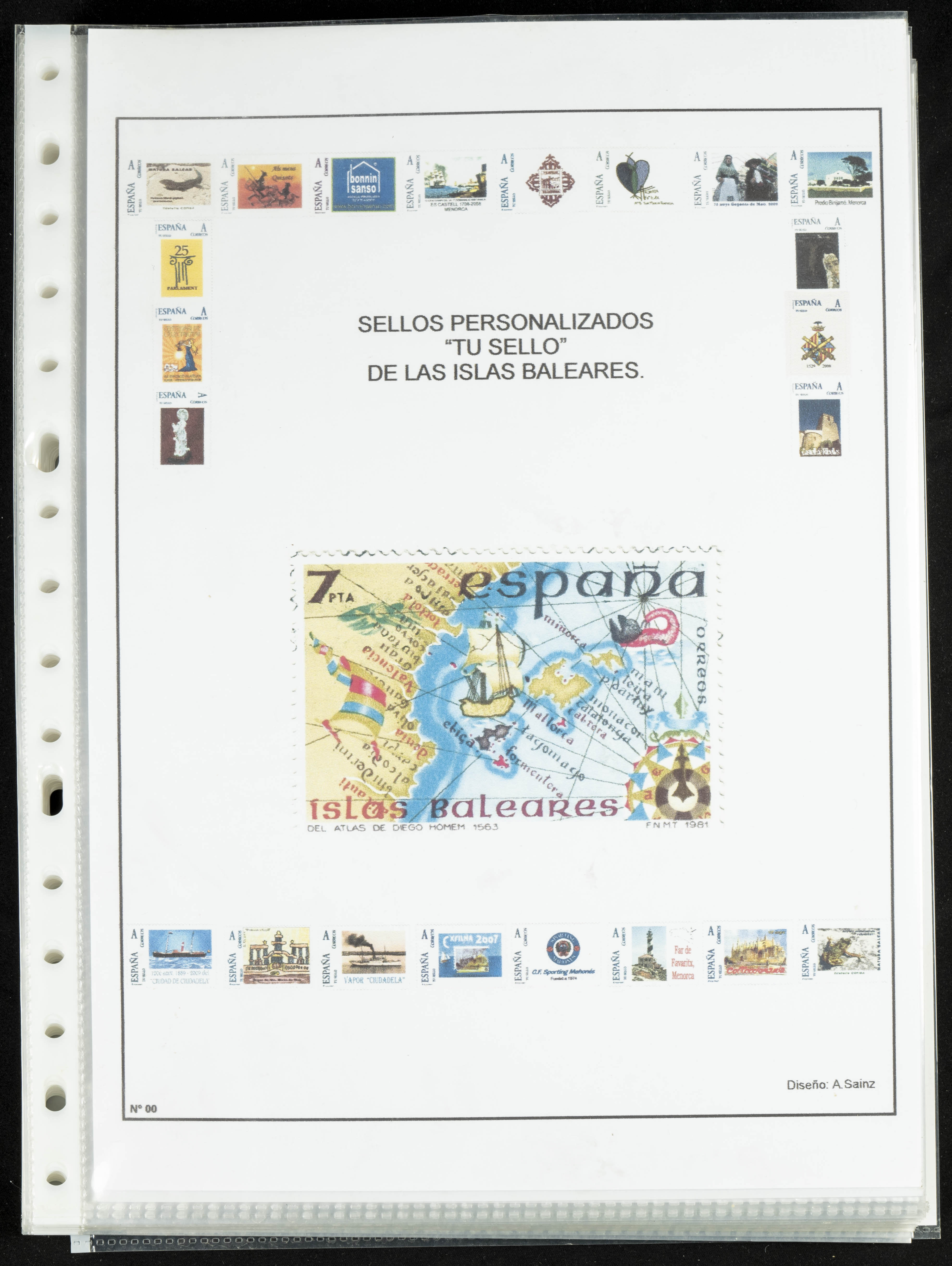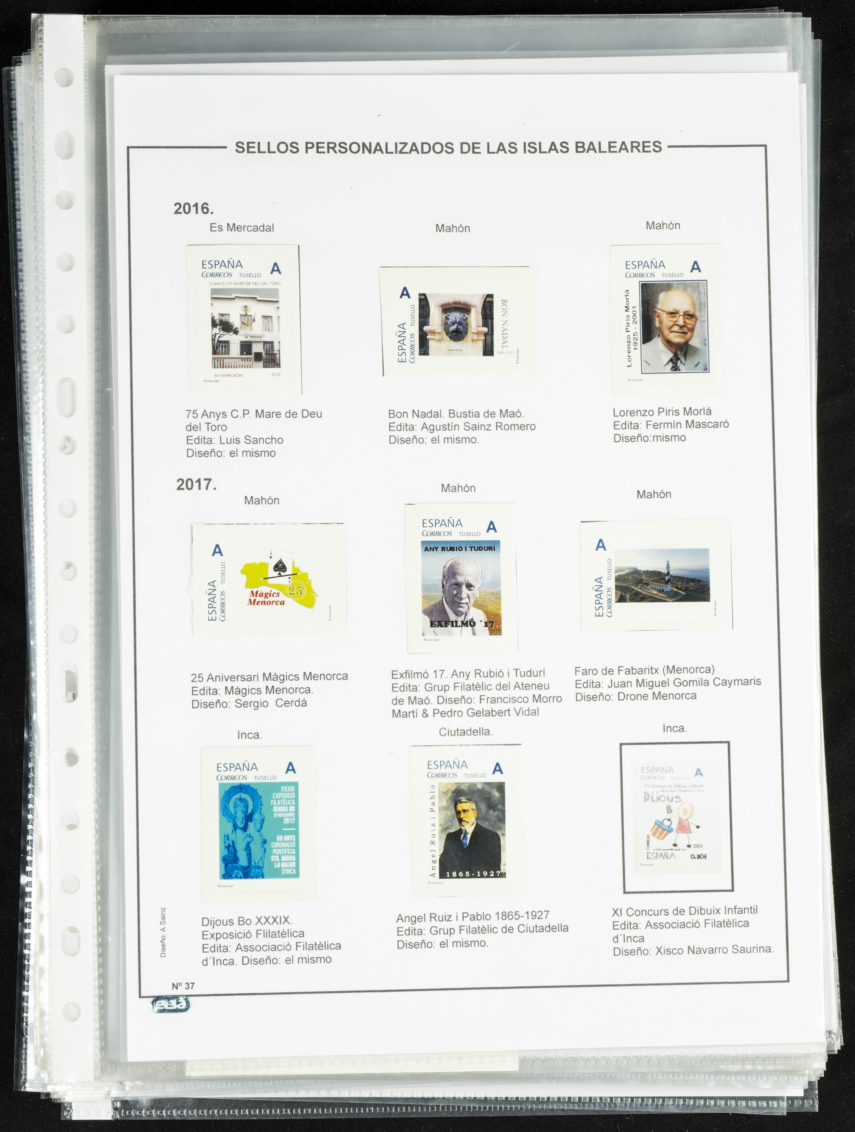 ★★(2007ca). Interesting collection of approximately 350 personalized self-adhesive stamps (Tariff A) featuring motifs and commemorations of the Balearic Islands, some with collectible photographs, issued between 2007 and 2018. (Face value: +300 Euros). TO BE EXAMINED.