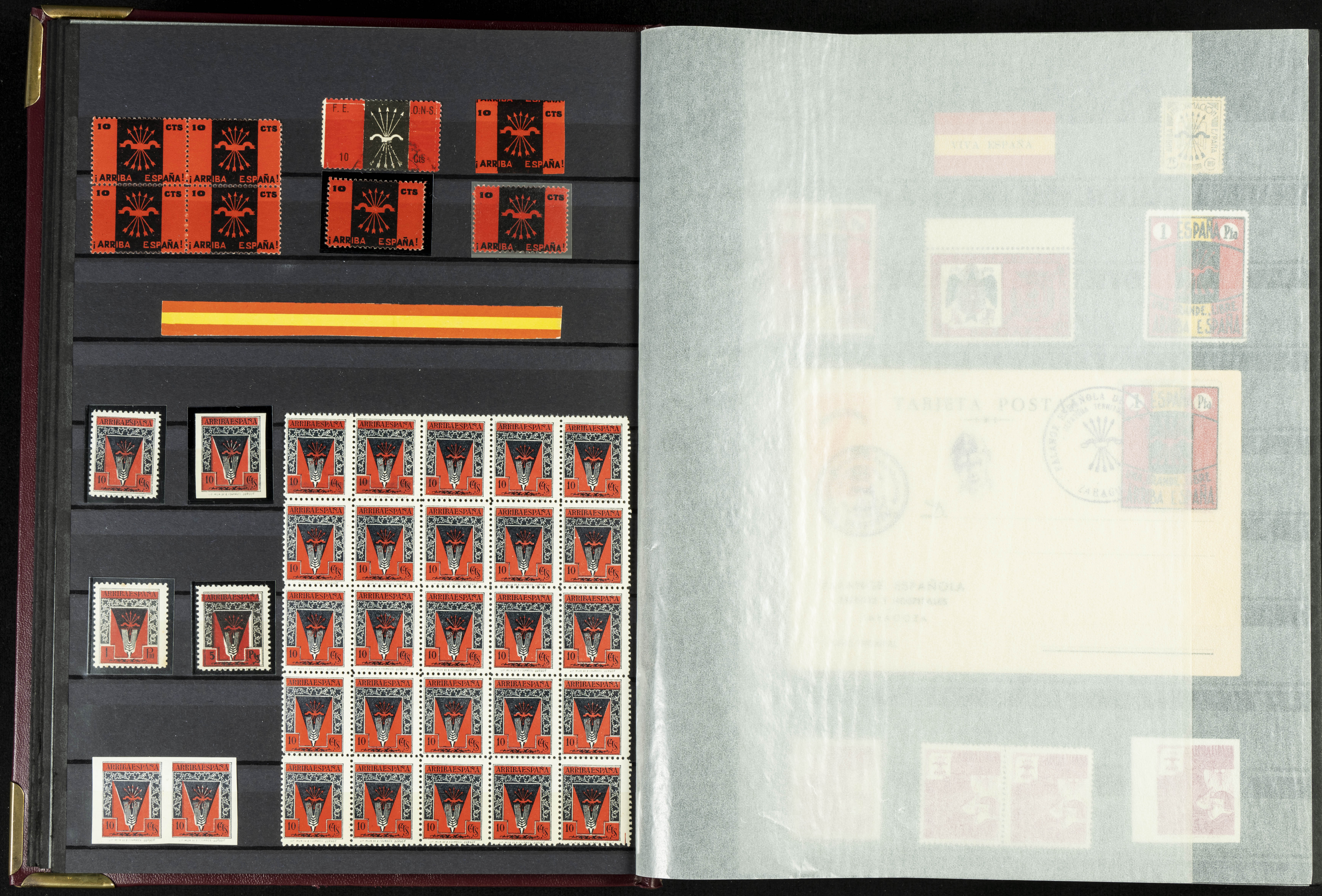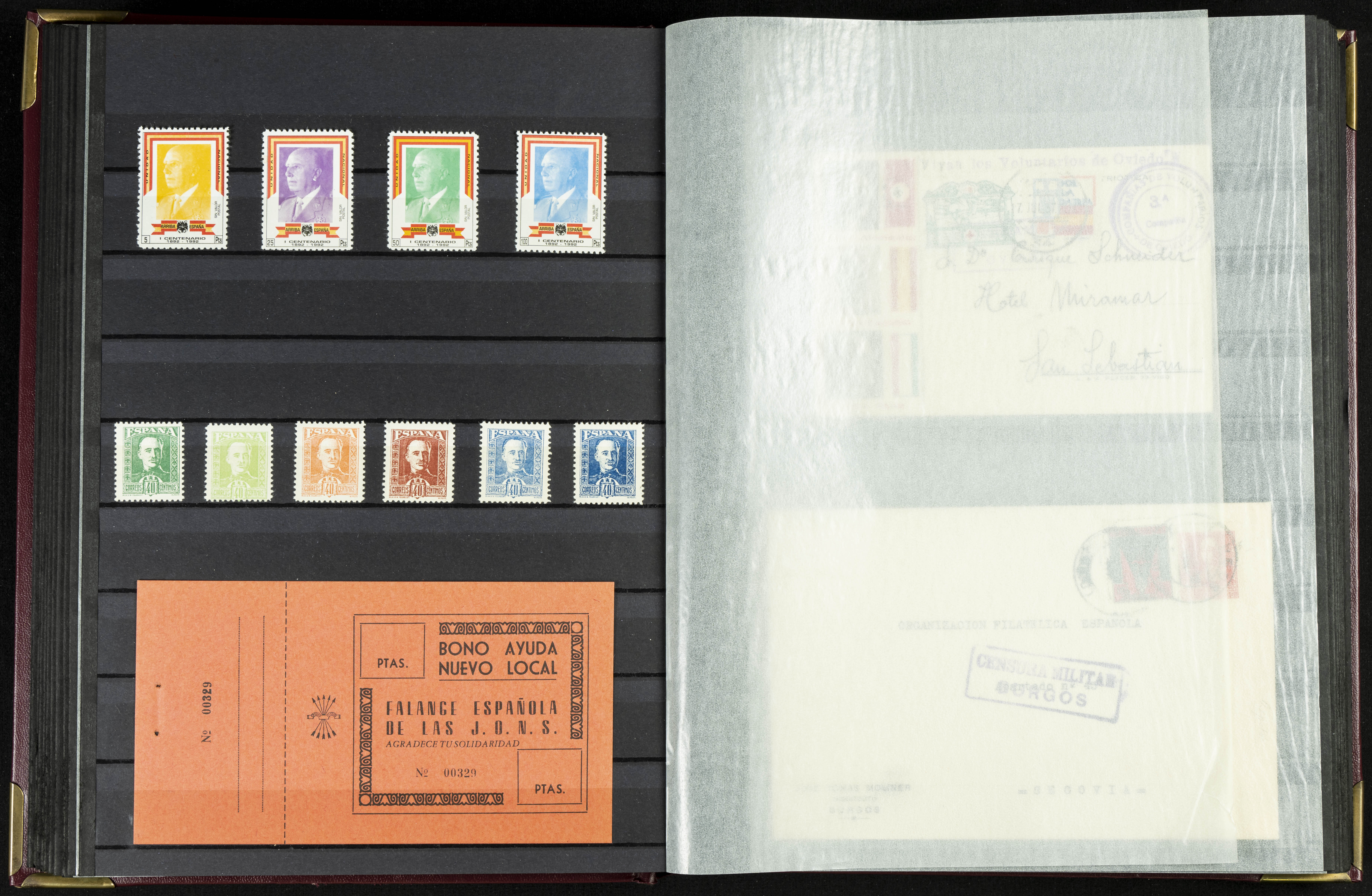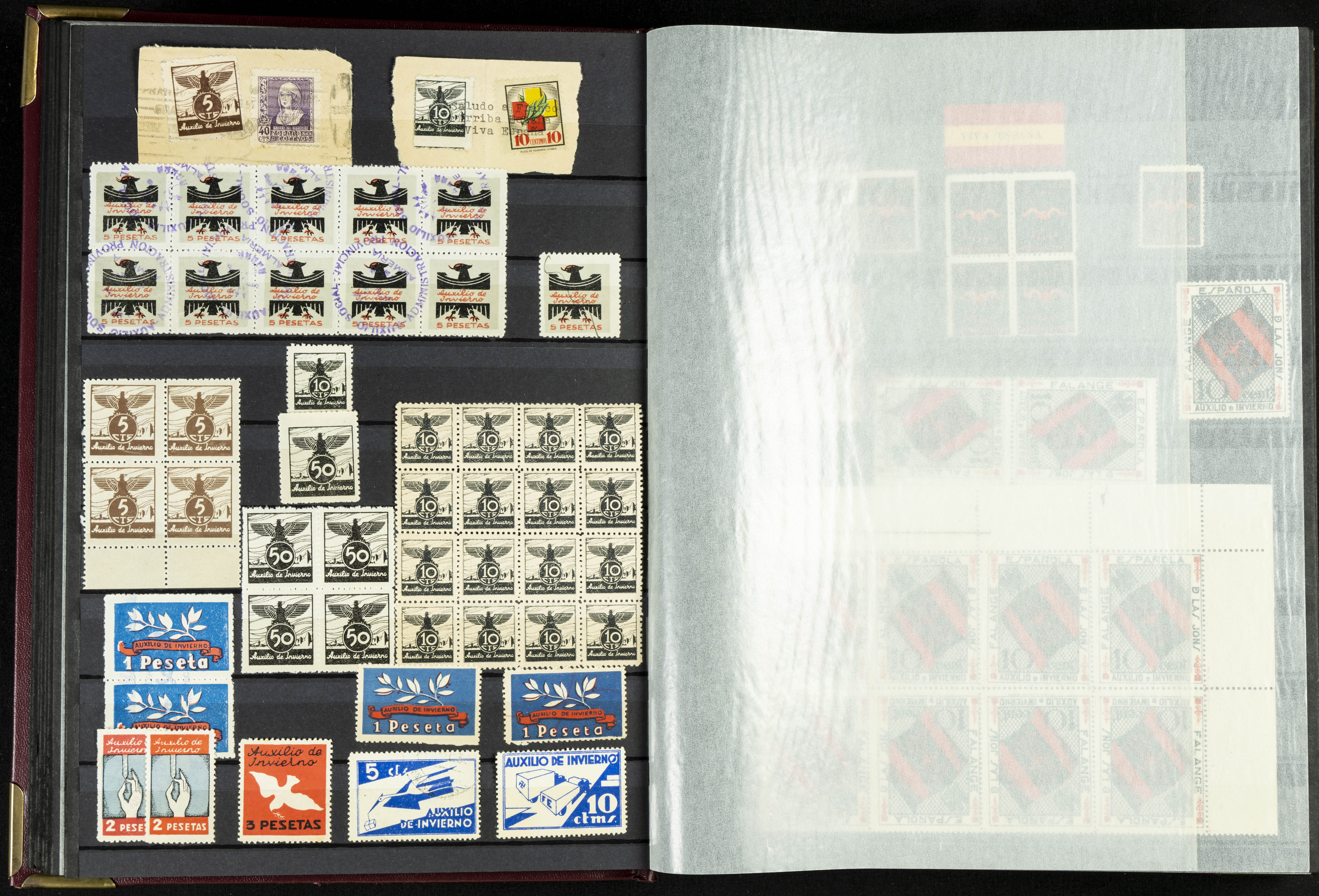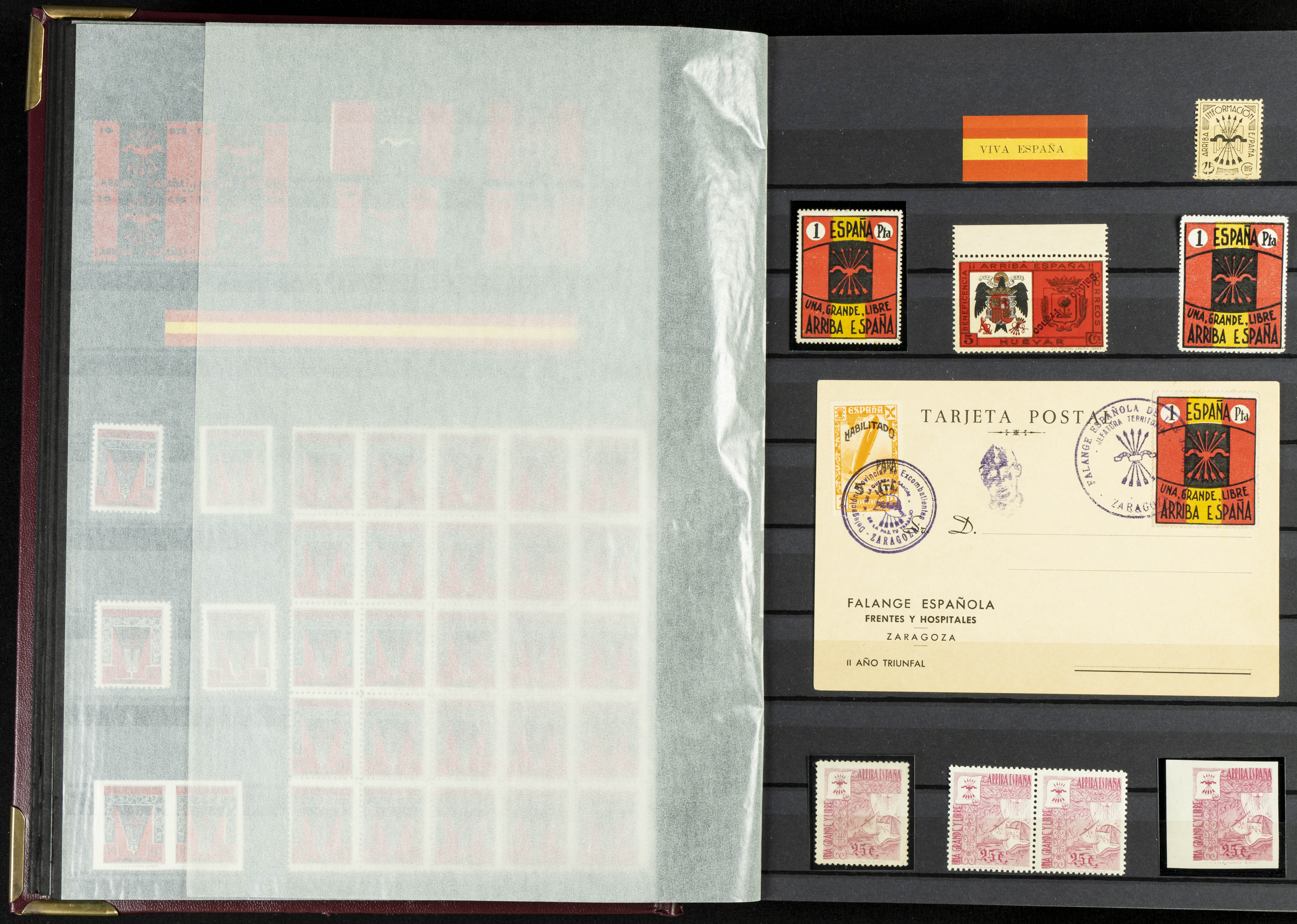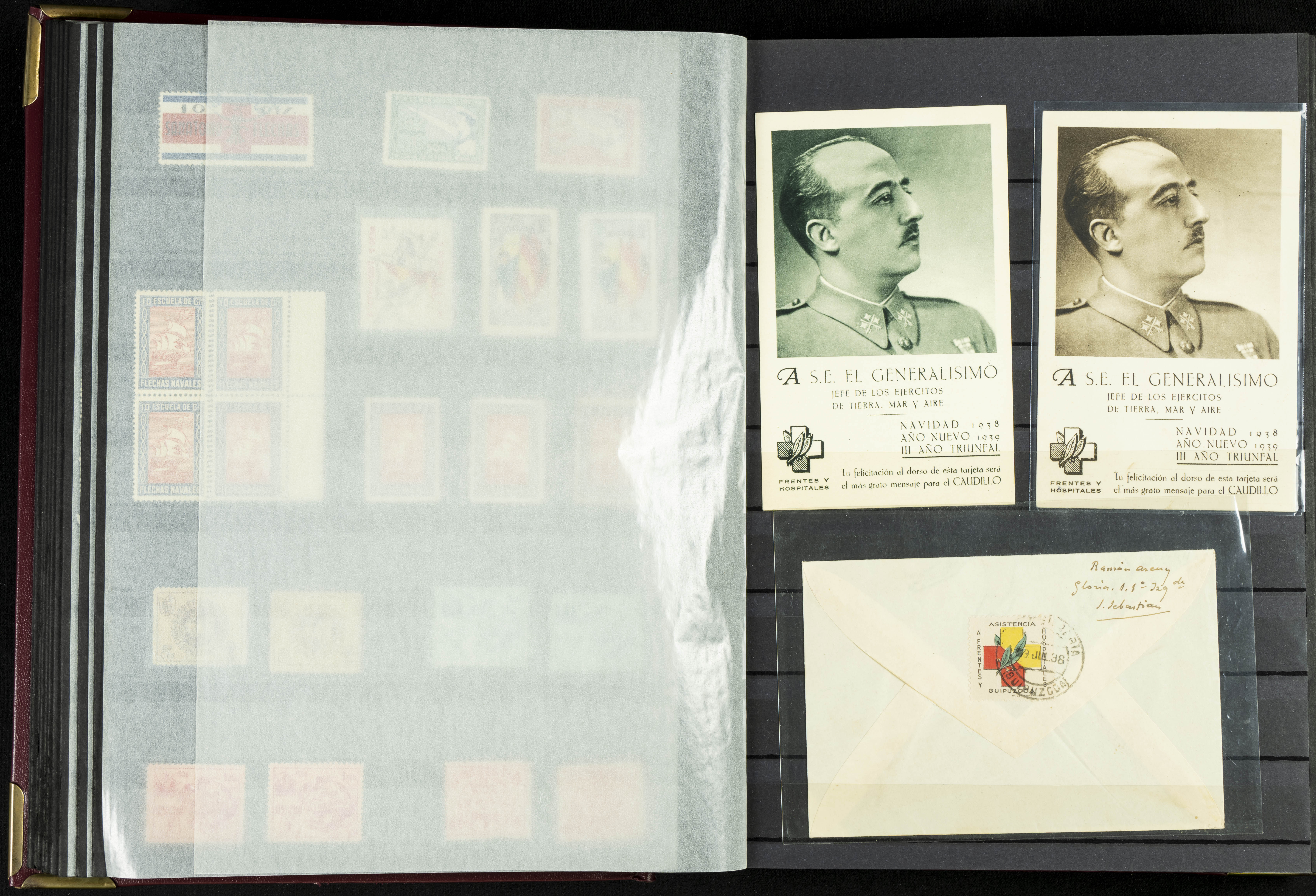 English (★)/(1936ca). A fascinating collection of stamps from charitable organizations, charitable establishments, and vignettes related to José Antonio and the Spanish Falange. The collection includes letters, documents, various types of stamps, postcards, a representation of fronts and hospitals (both mint and used), letterheads, other sections, and a copy of the book "Complete Works of José Antonio Primo de Rivera." A MUST-SEE.