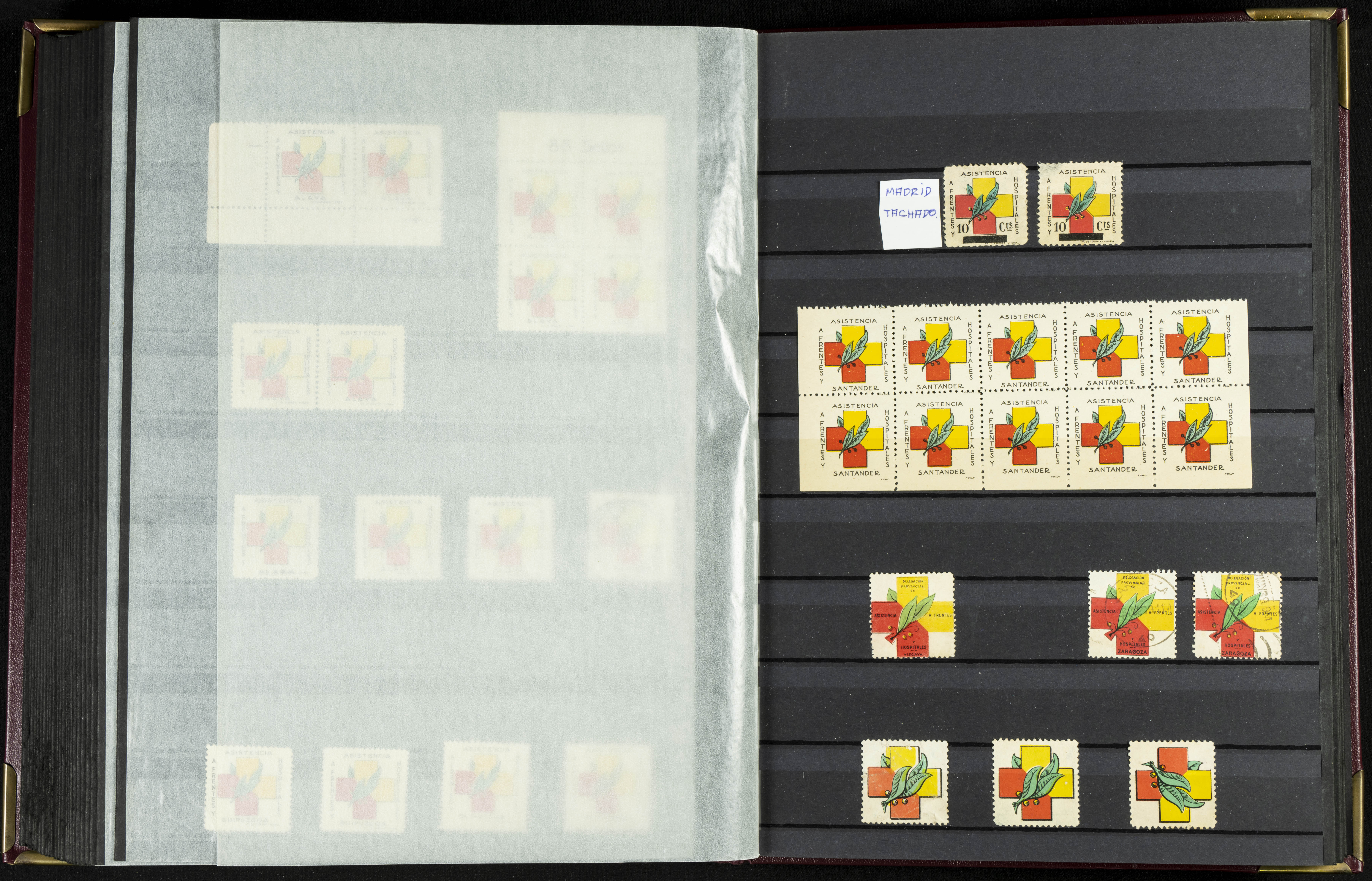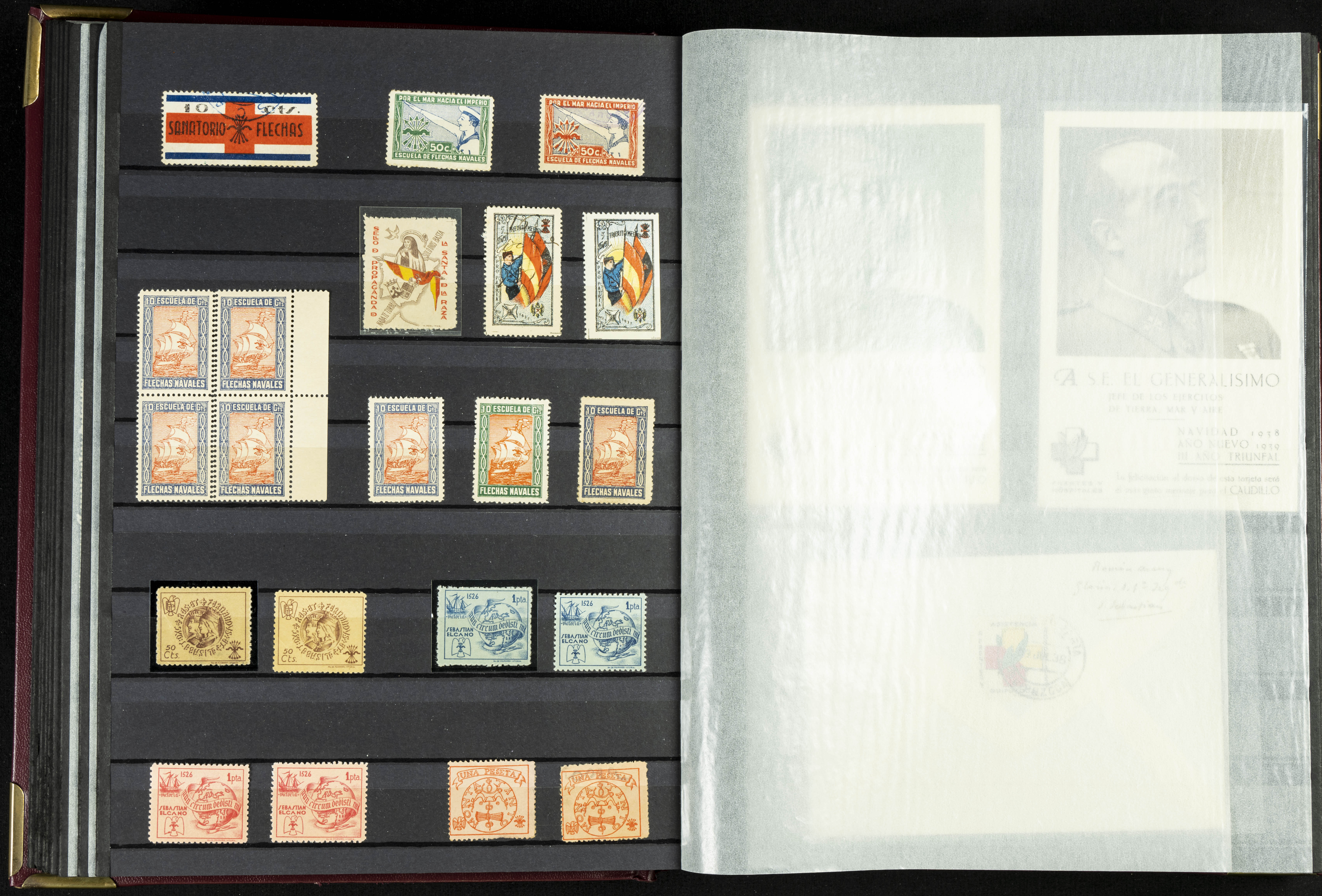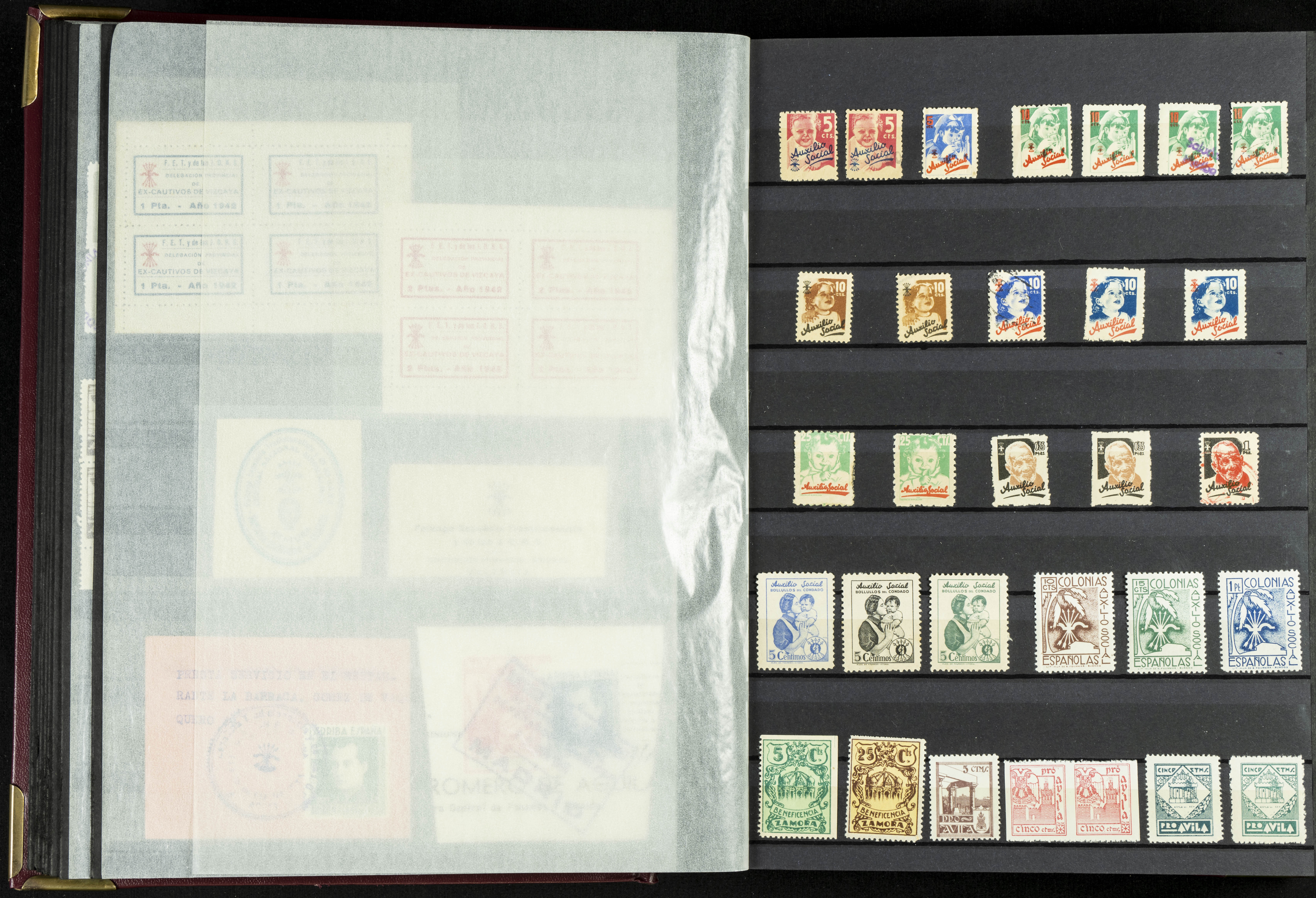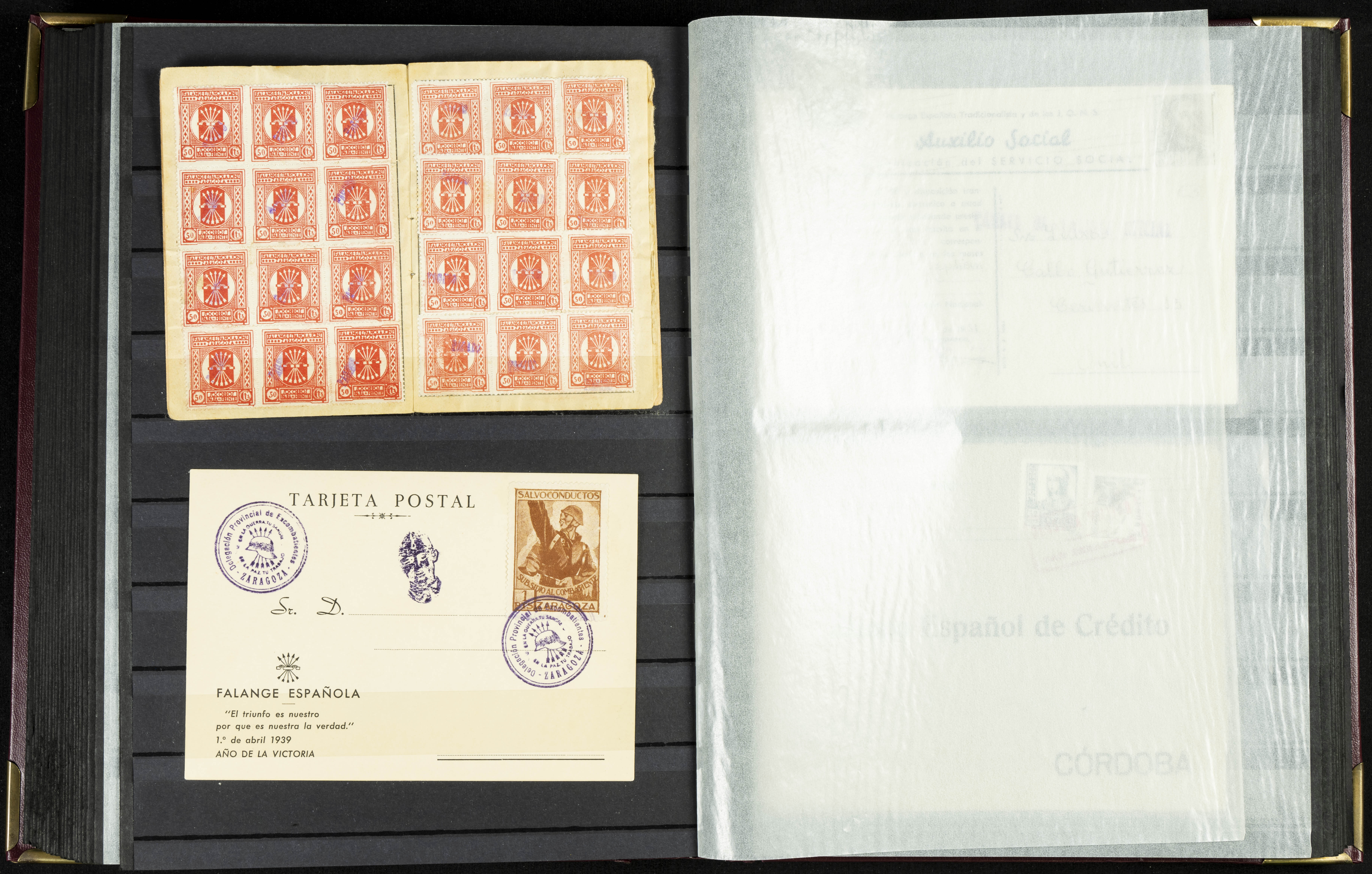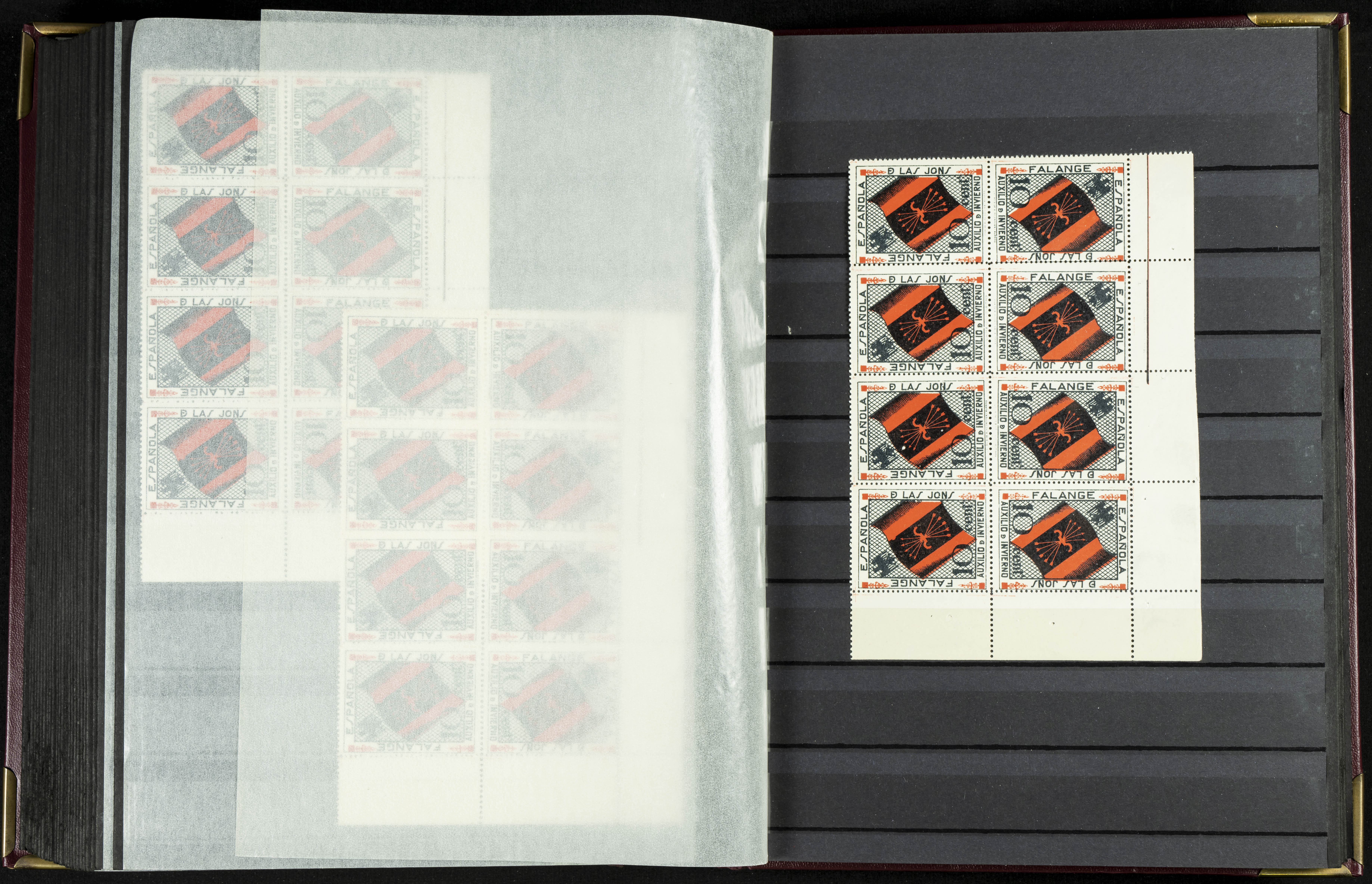 English (★)/(1936ca). A fascinating collection of stamps from charitable organizations, charitable establishments, and vignettes related to José Antonio and the Spanish Falange. The collection includes letters, documents, various types of stamps, postcards, a representation of fronts and hospitals (both mint and used), letterheads, other sections, and a copy of the book "Complete Works of José Antonio Primo de Rivera." A MUST-SEE.