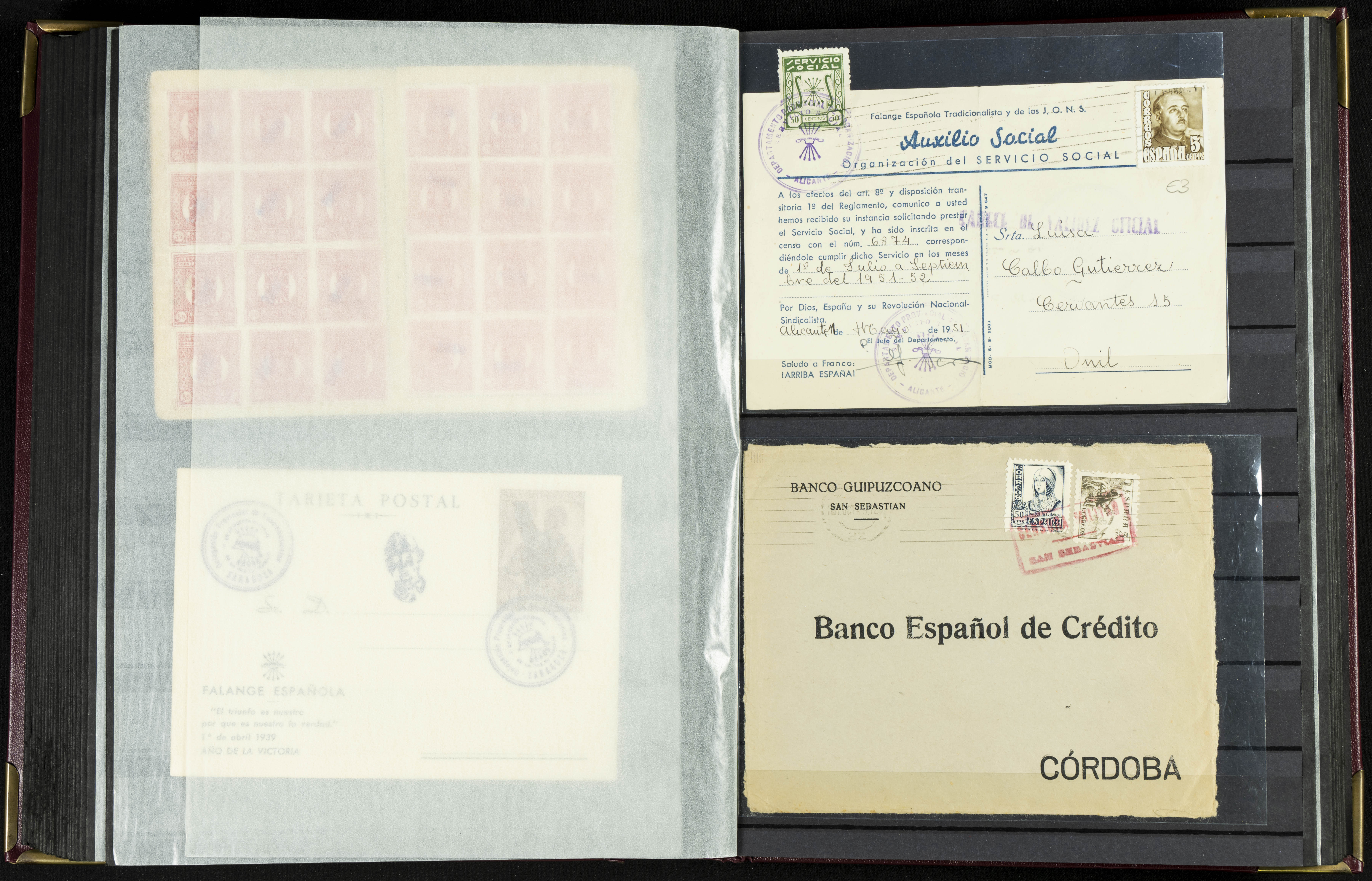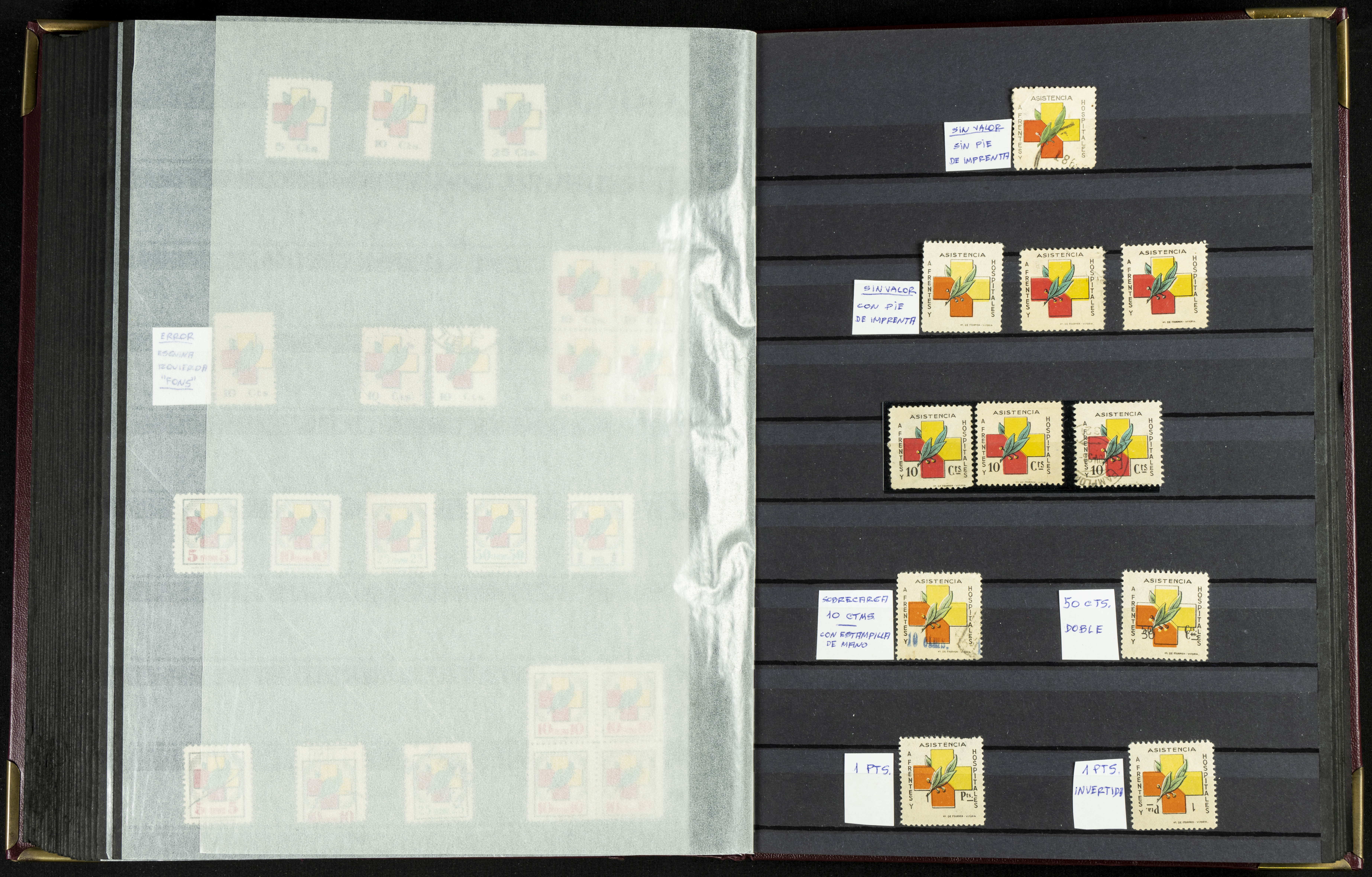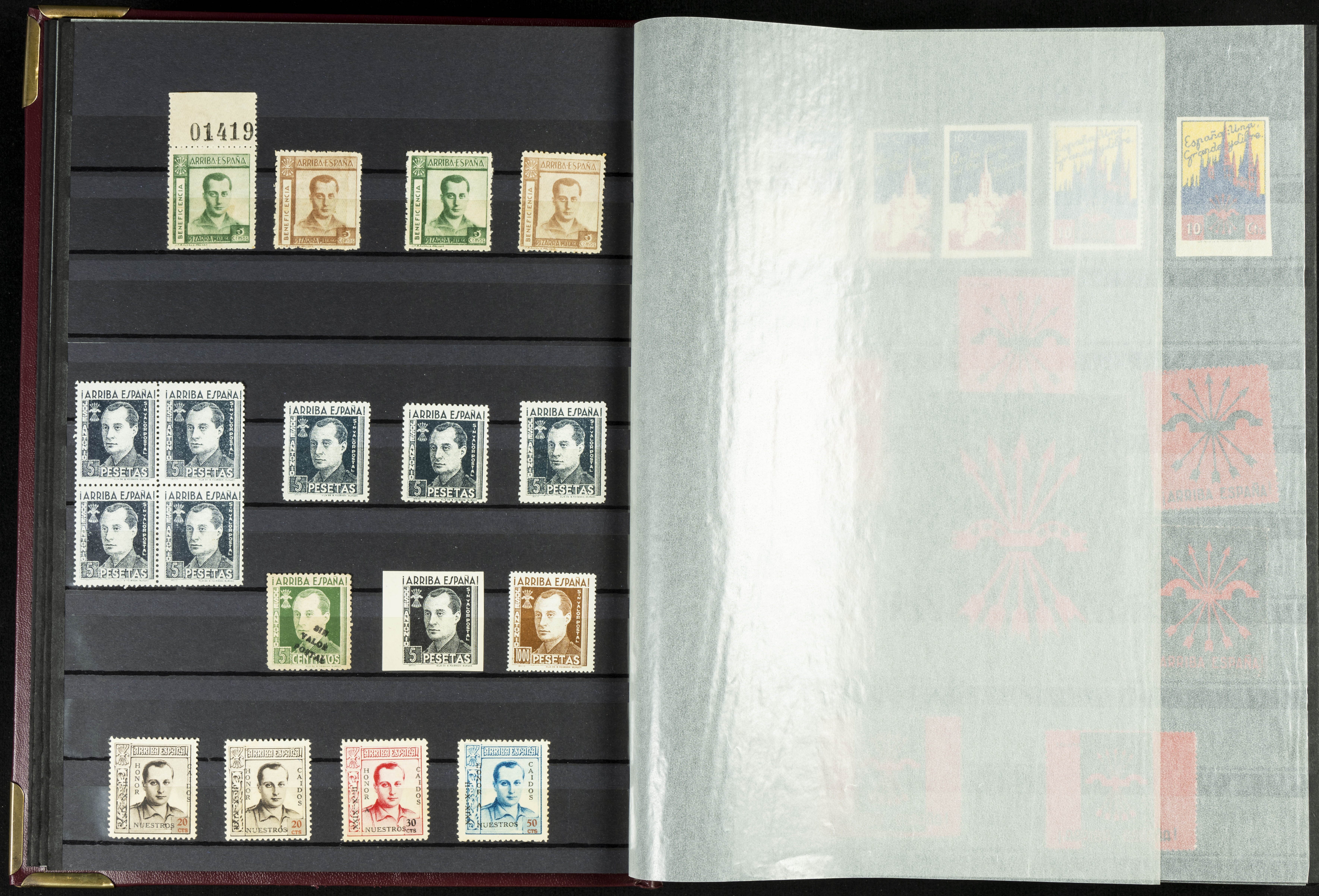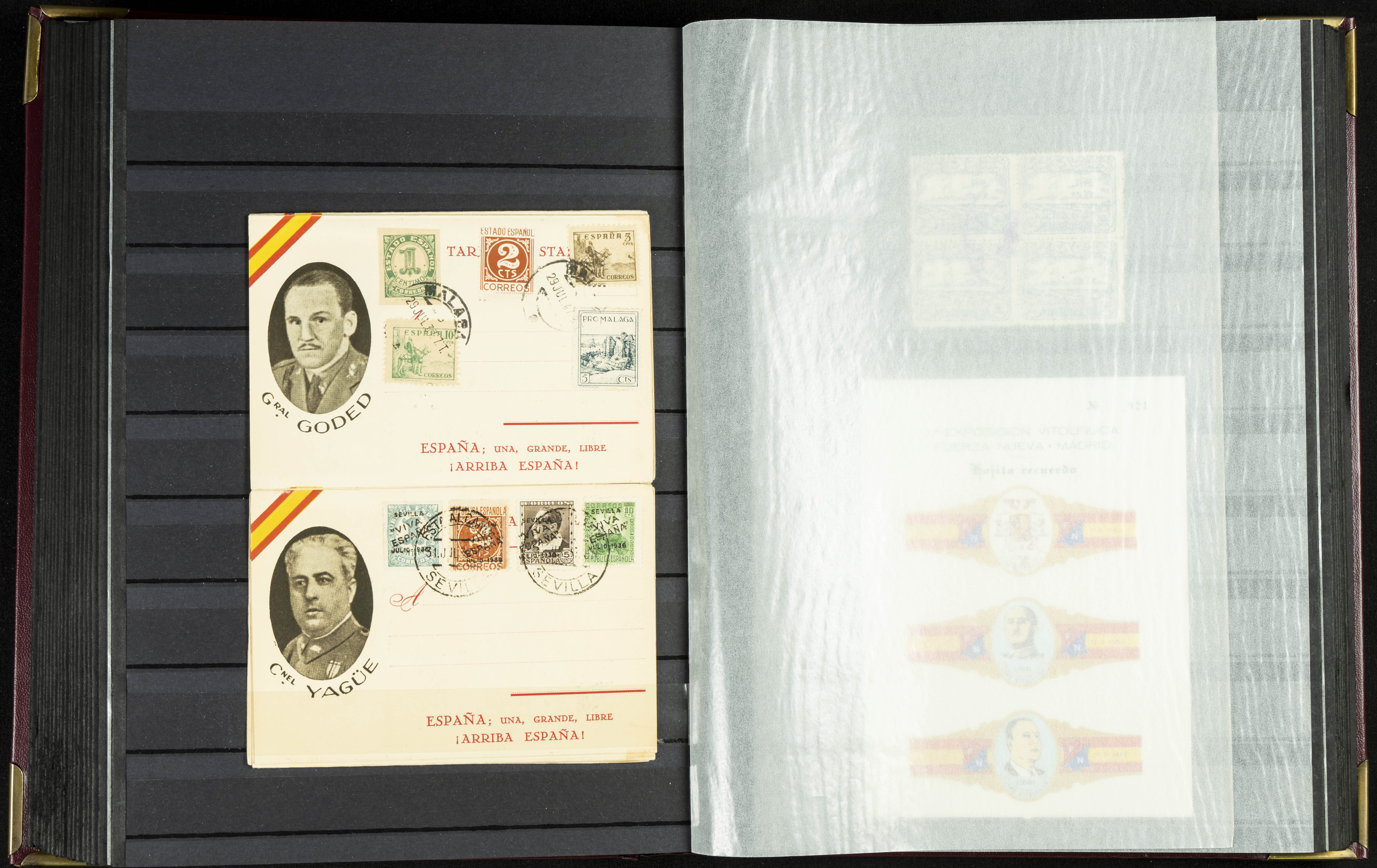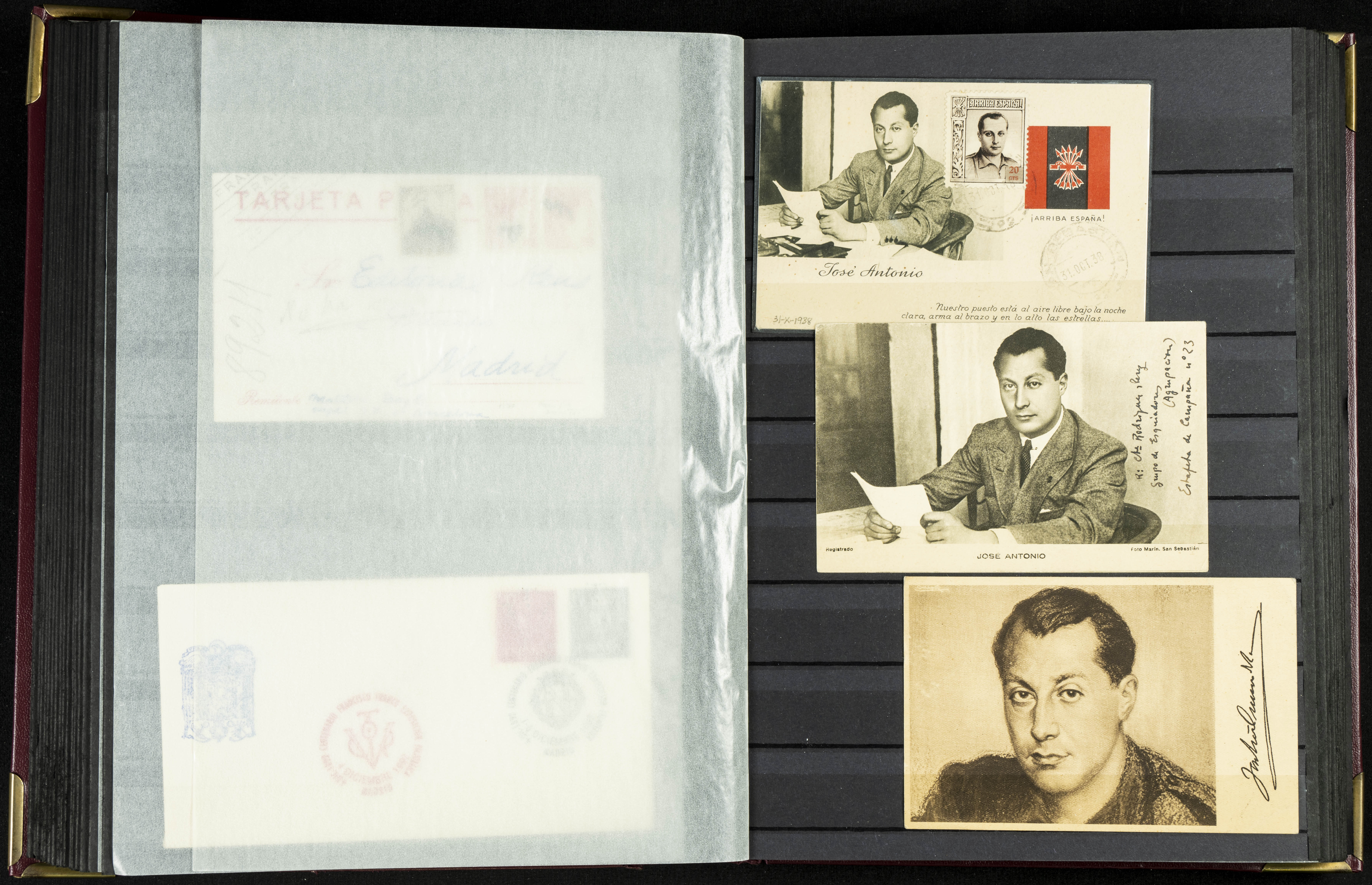 English (★)/(1936ca). A fascinating collection of stamps from charitable organizations, charitable establishments, and vignettes related to José Antonio and the Spanish Falange. The collection includes letters, documents, various types of stamps, postcards, a representation of fronts and hospitals (both mint and used), letterheads, other sections, and a copy of the book "Complete Works of José Antonio Primo de Rivera." A MUST-SEE.