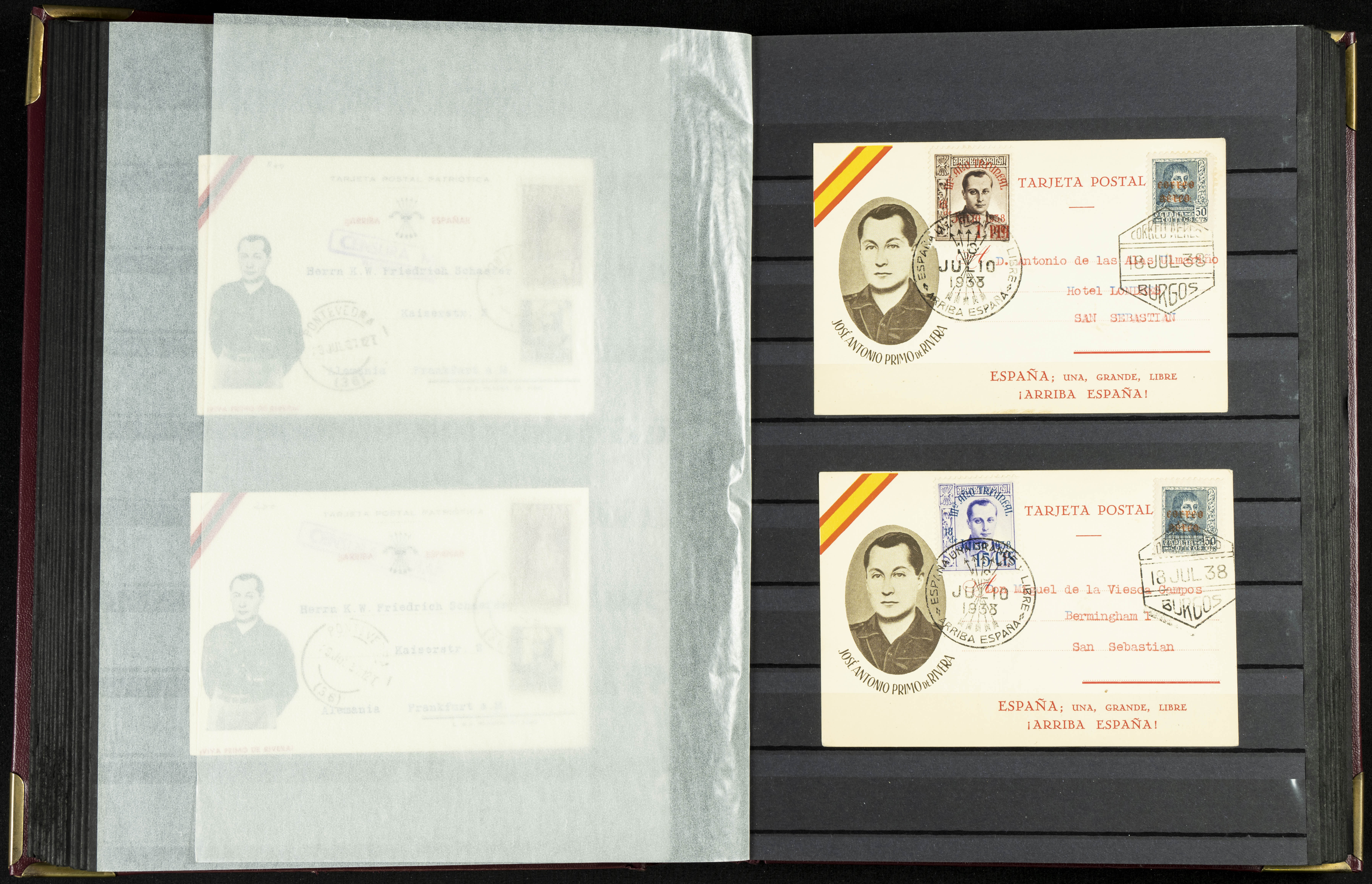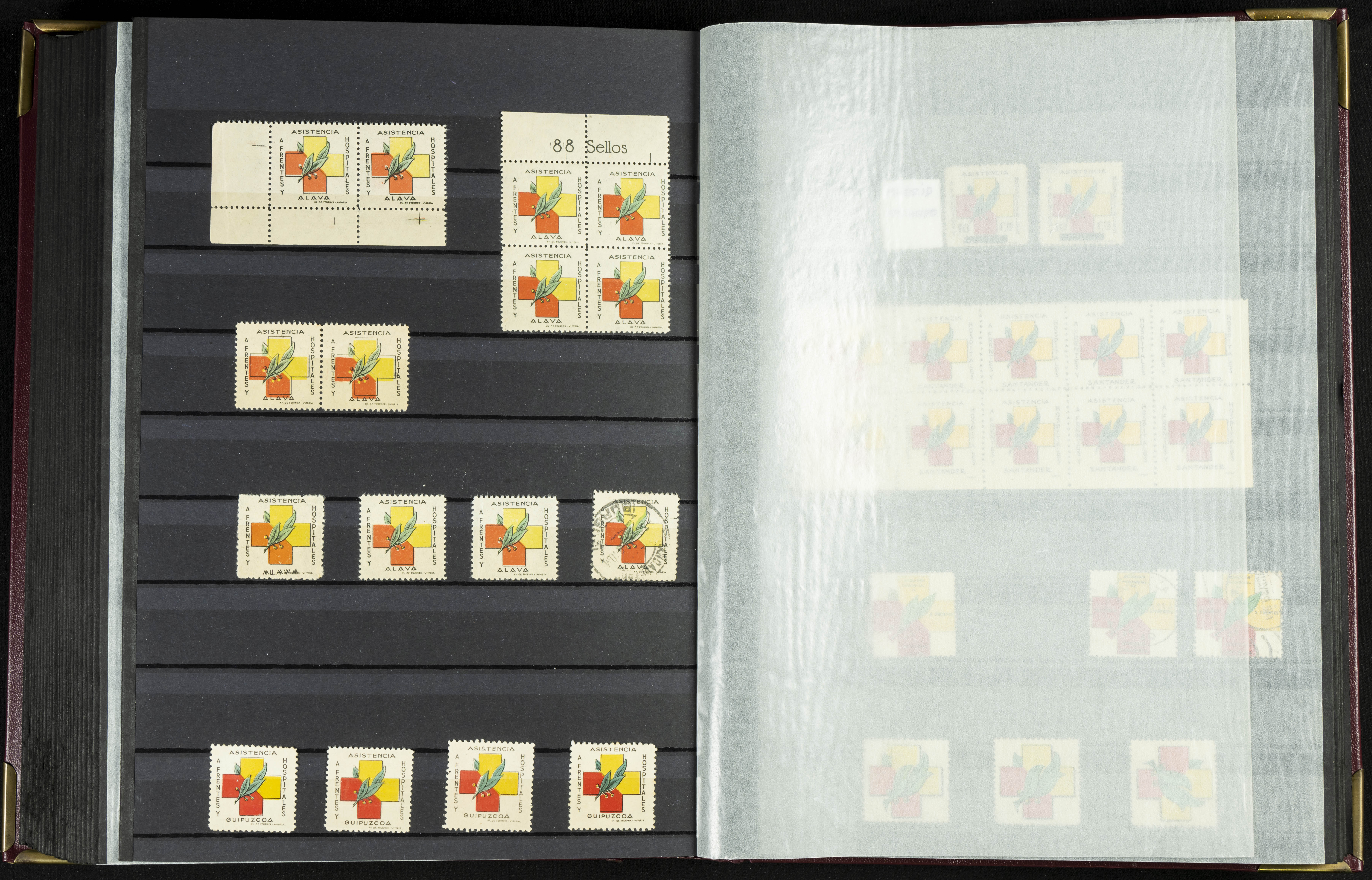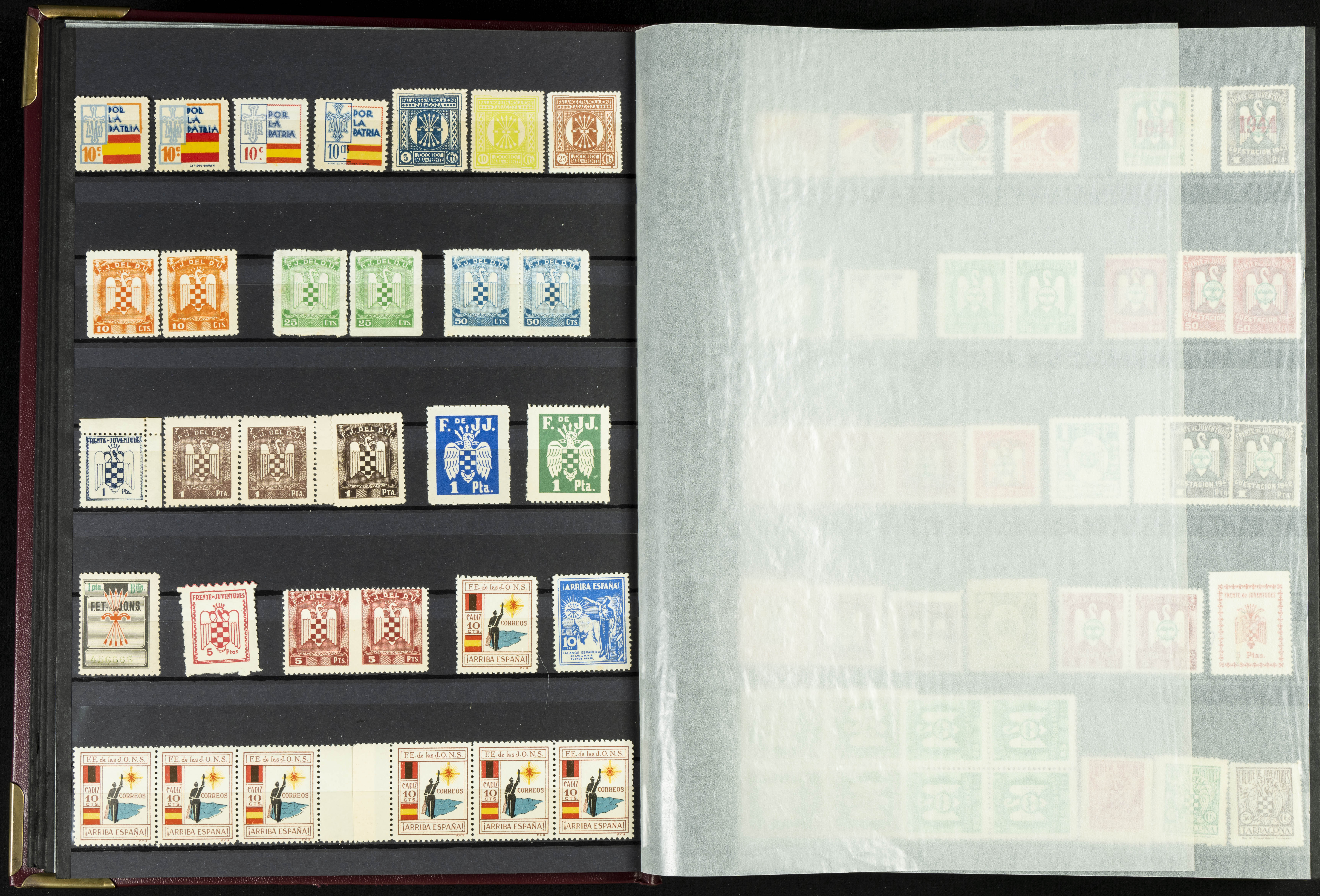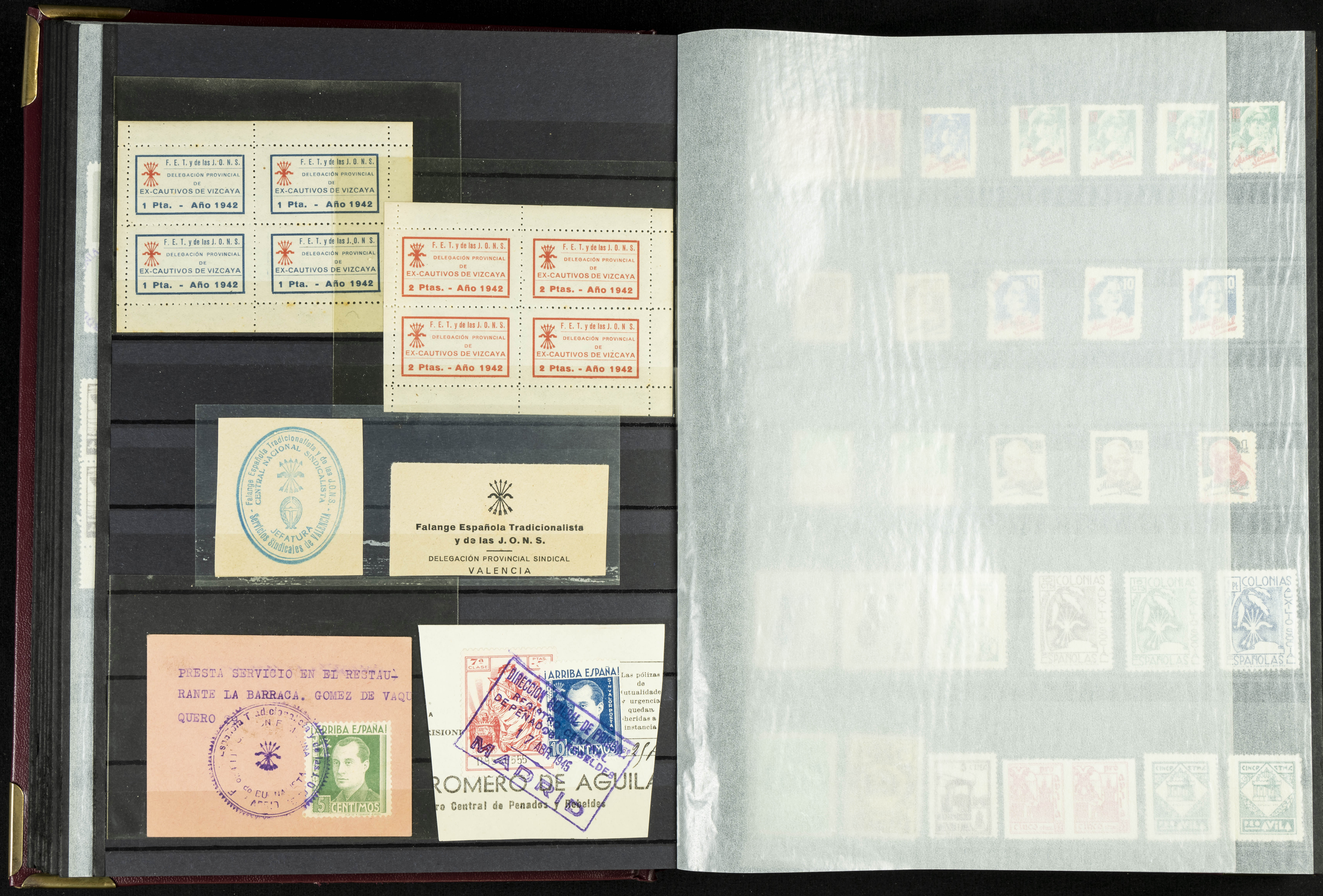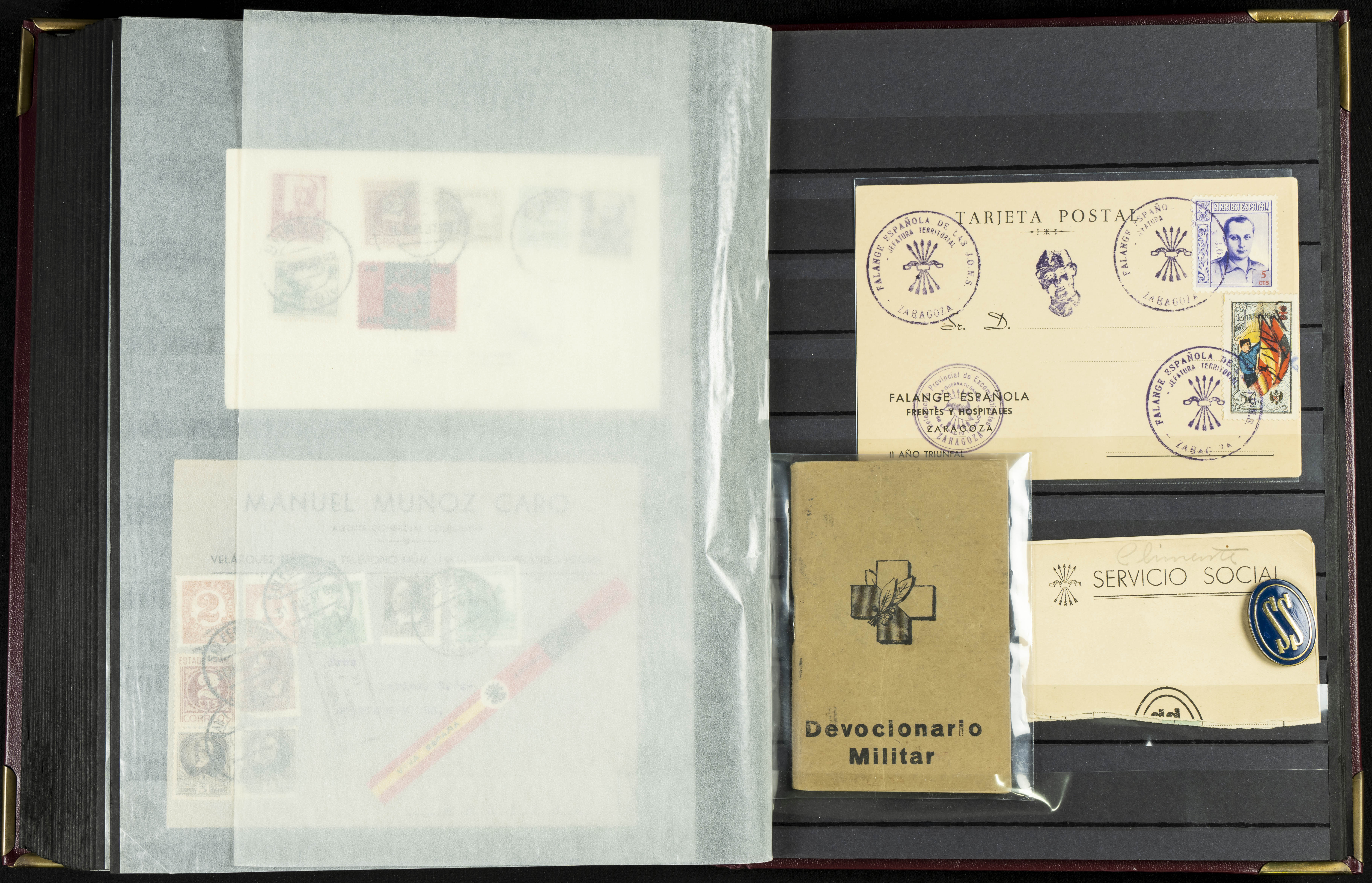 English (★)/(1936ca). A fascinating collection of stamps from charitable organizations, charitable establishments, and vignettes related to José Antonio and the Spanish Falange. The collection includes letters, documents, various types of stamps, postcards, a representation of fronts and hospitals (both mint and used), letterheads, other sections, and a copy of the book "Complete Works of José Antonio Primo de Rivera." A MUST-SEE.
