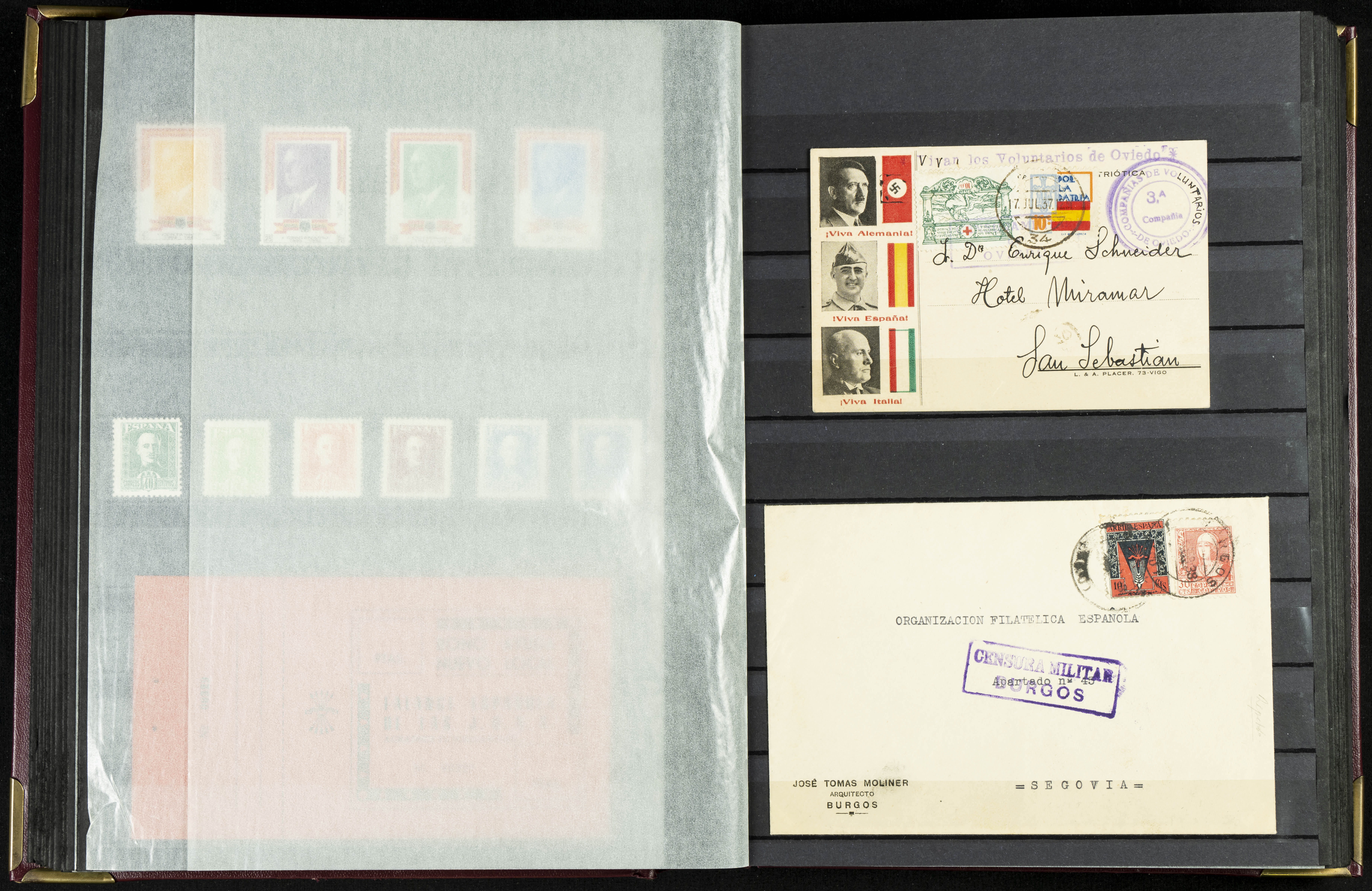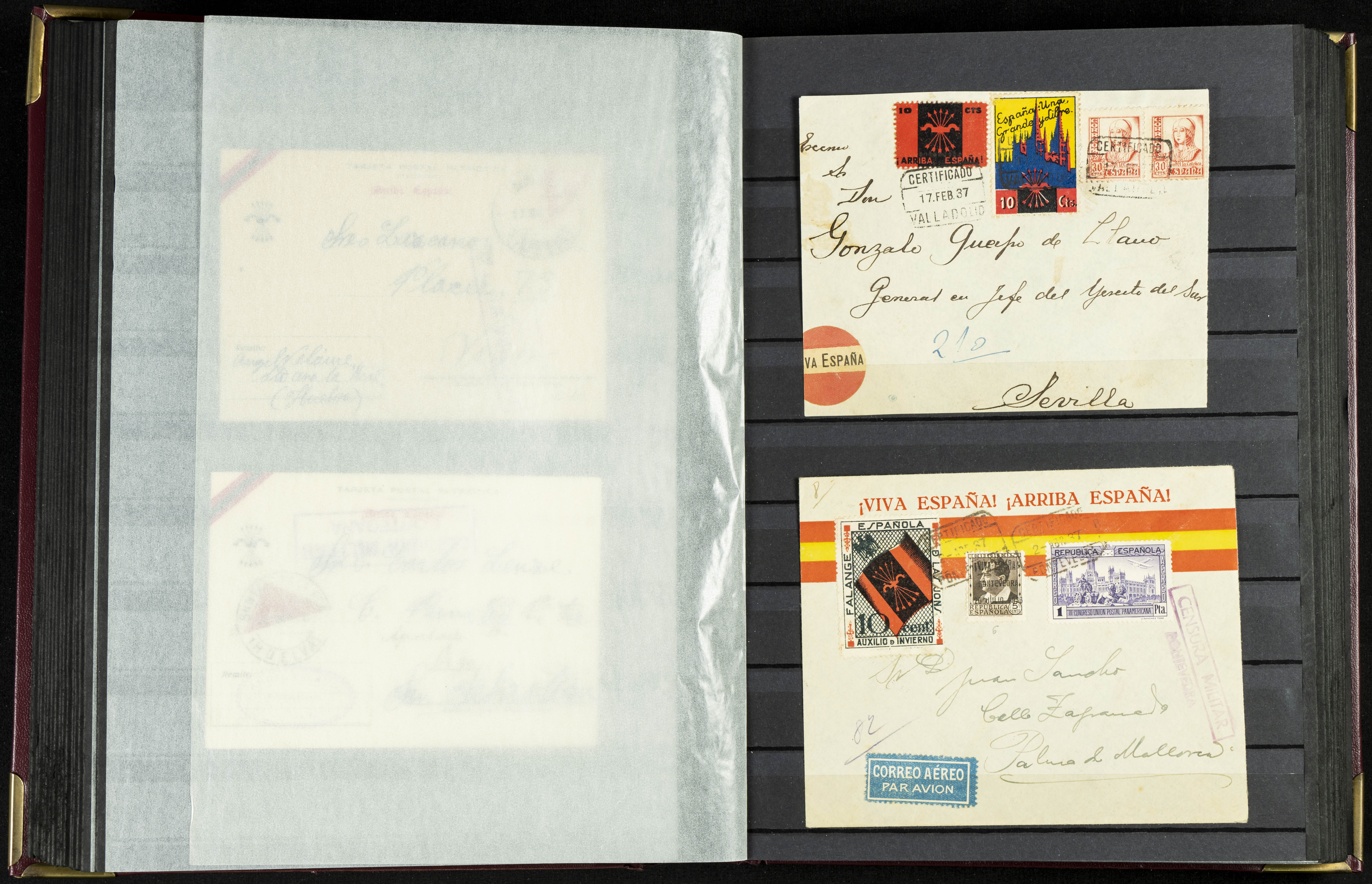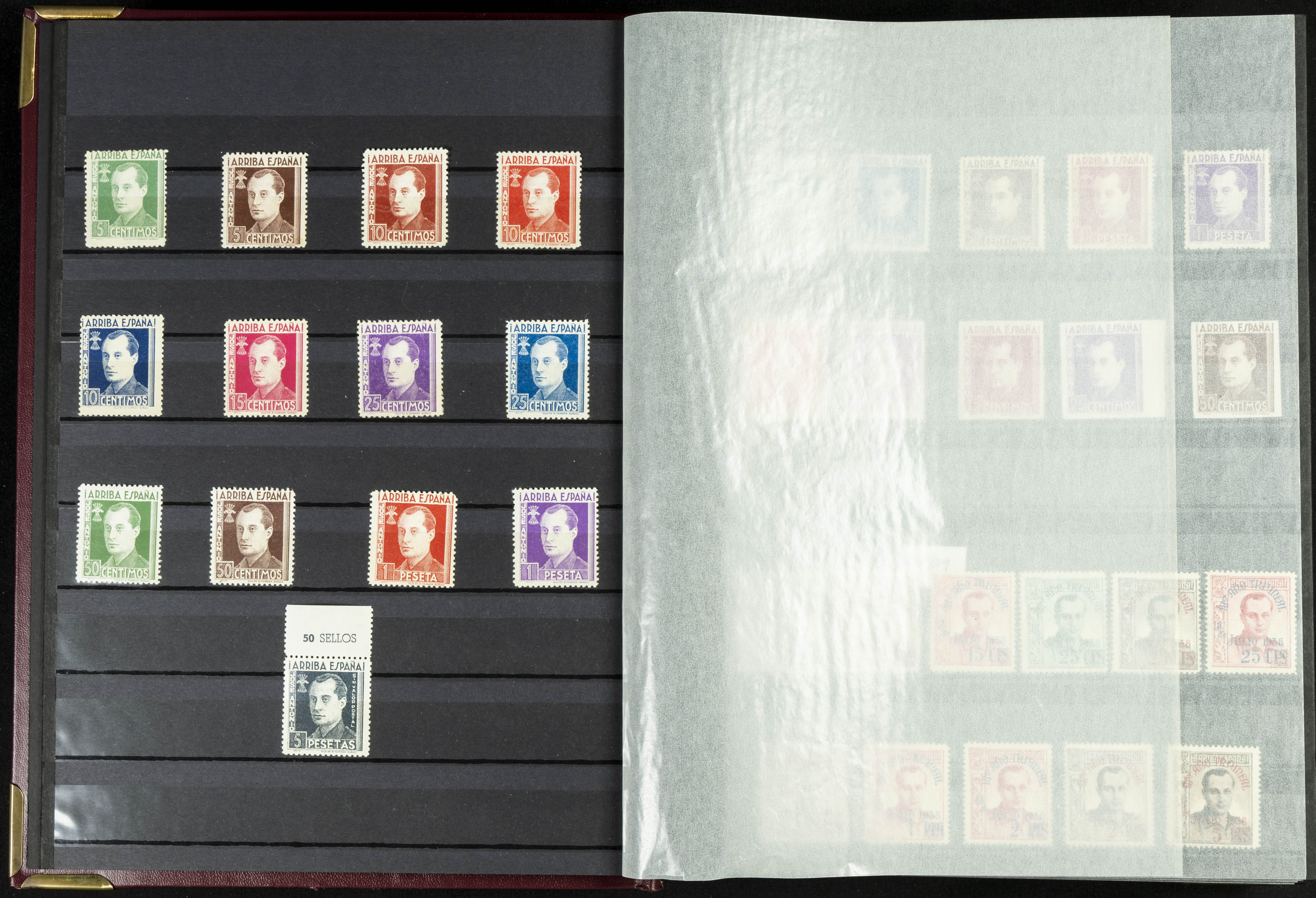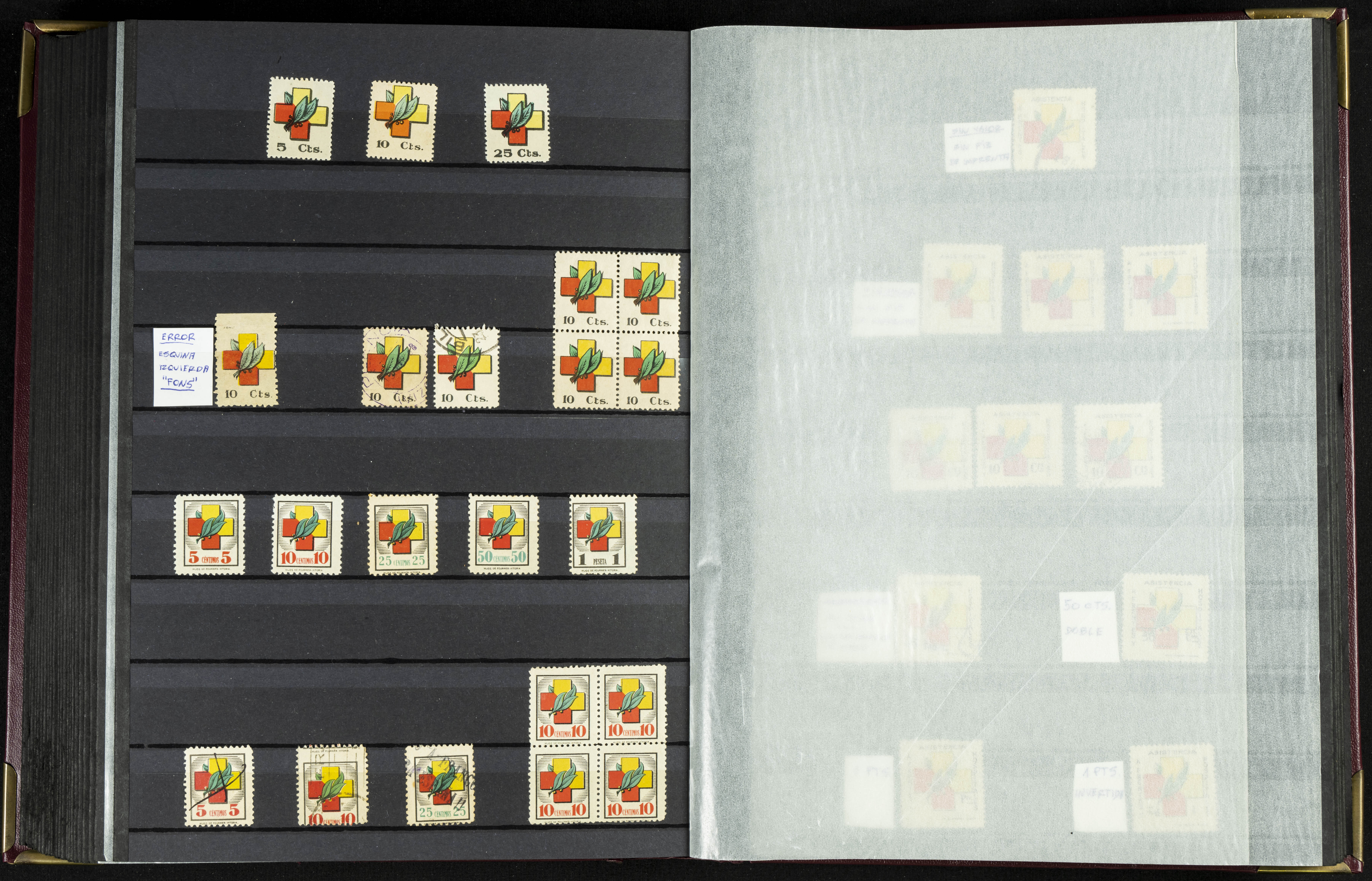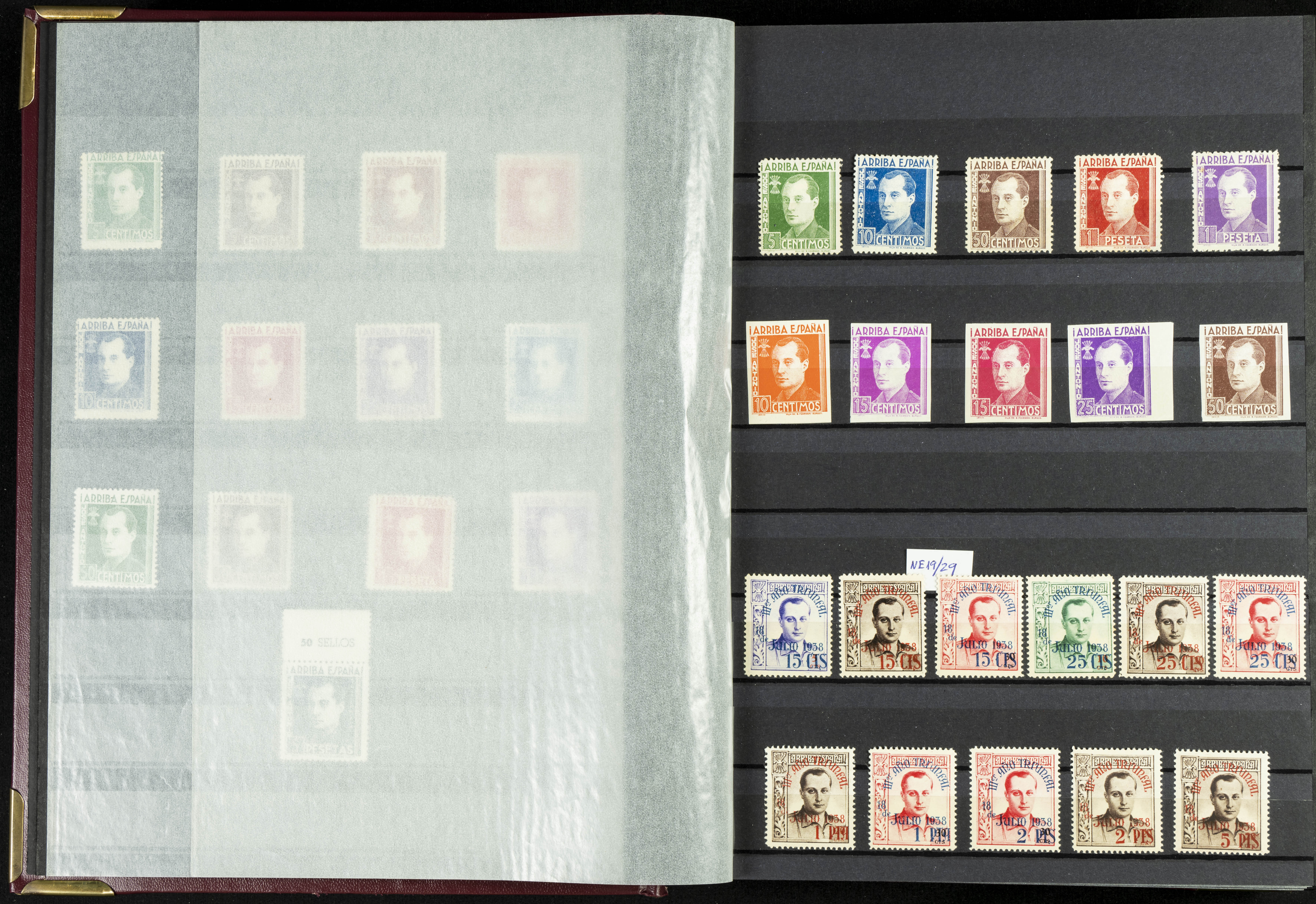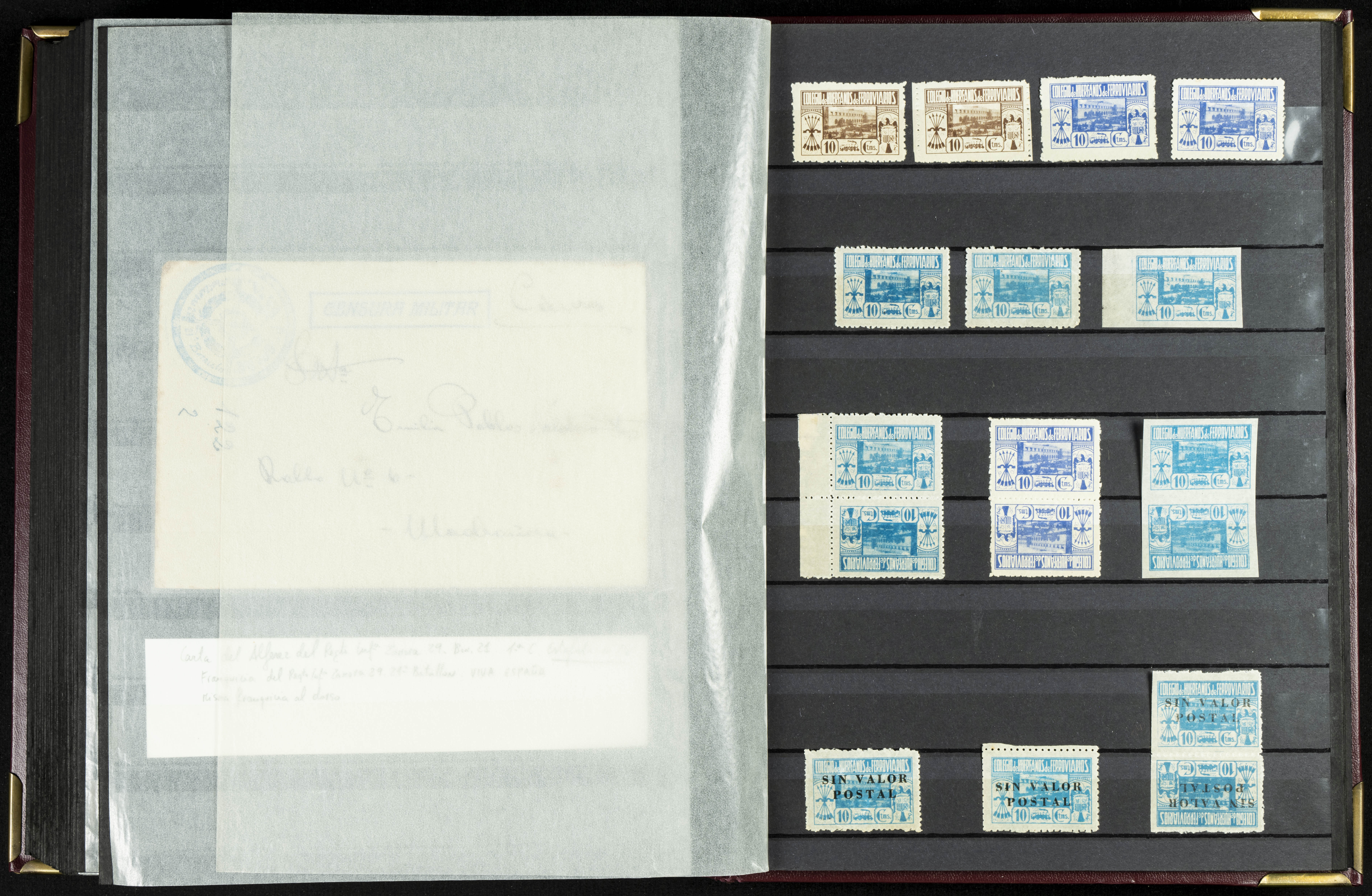 English (★)/(1936ca). A fascinating collection of stamps from charitable organizations, charitable establishments, and vignettes related to José Antonio and the Spanish Falange. The collection includes letters, documents, various types of stamps, postcards, a representation of fronts and hospitals (both mint and used), letterheads, other sections, and a copy of the book "Complete Works of José Antonio Primo de Rivera." A MUST-SEE.