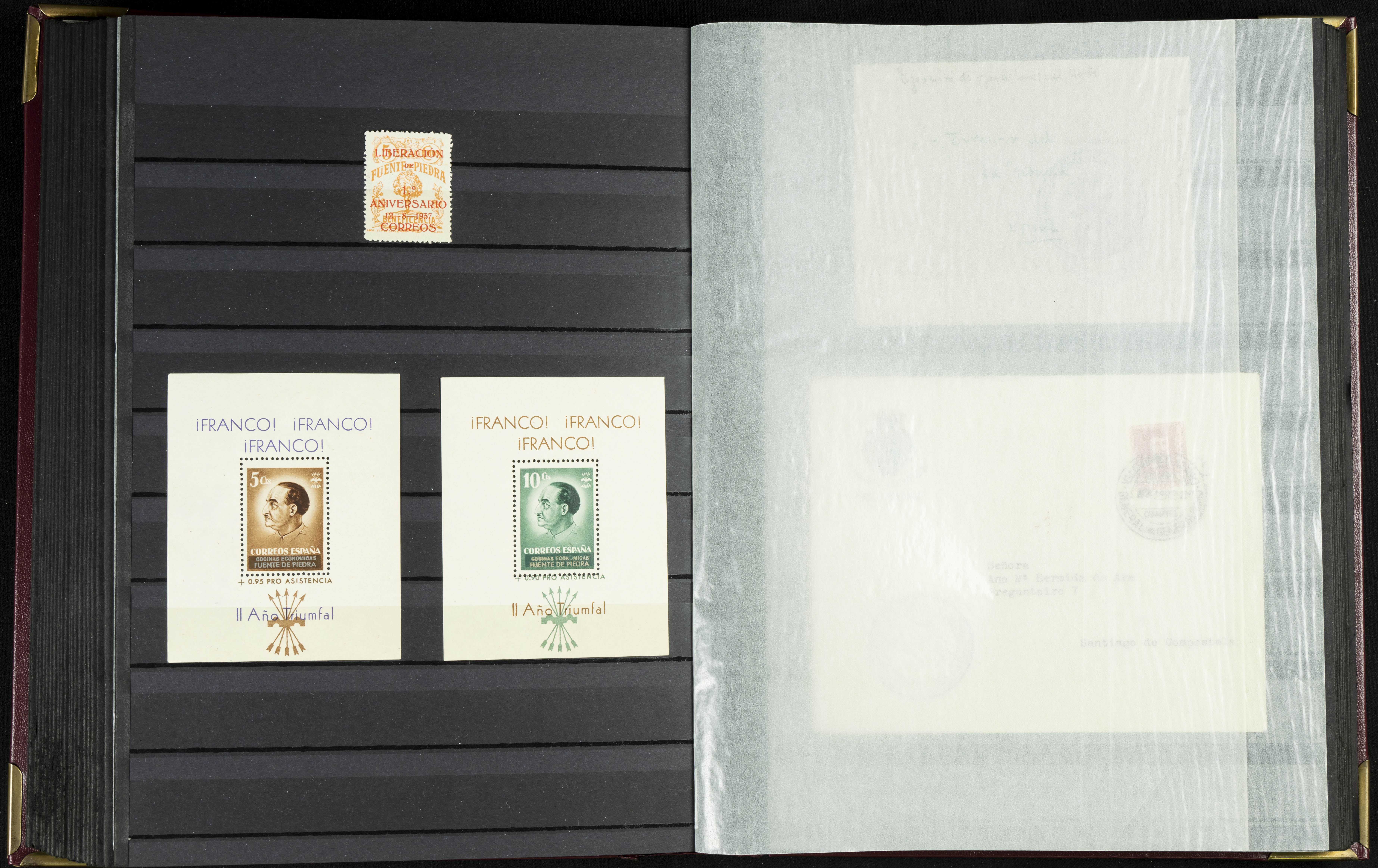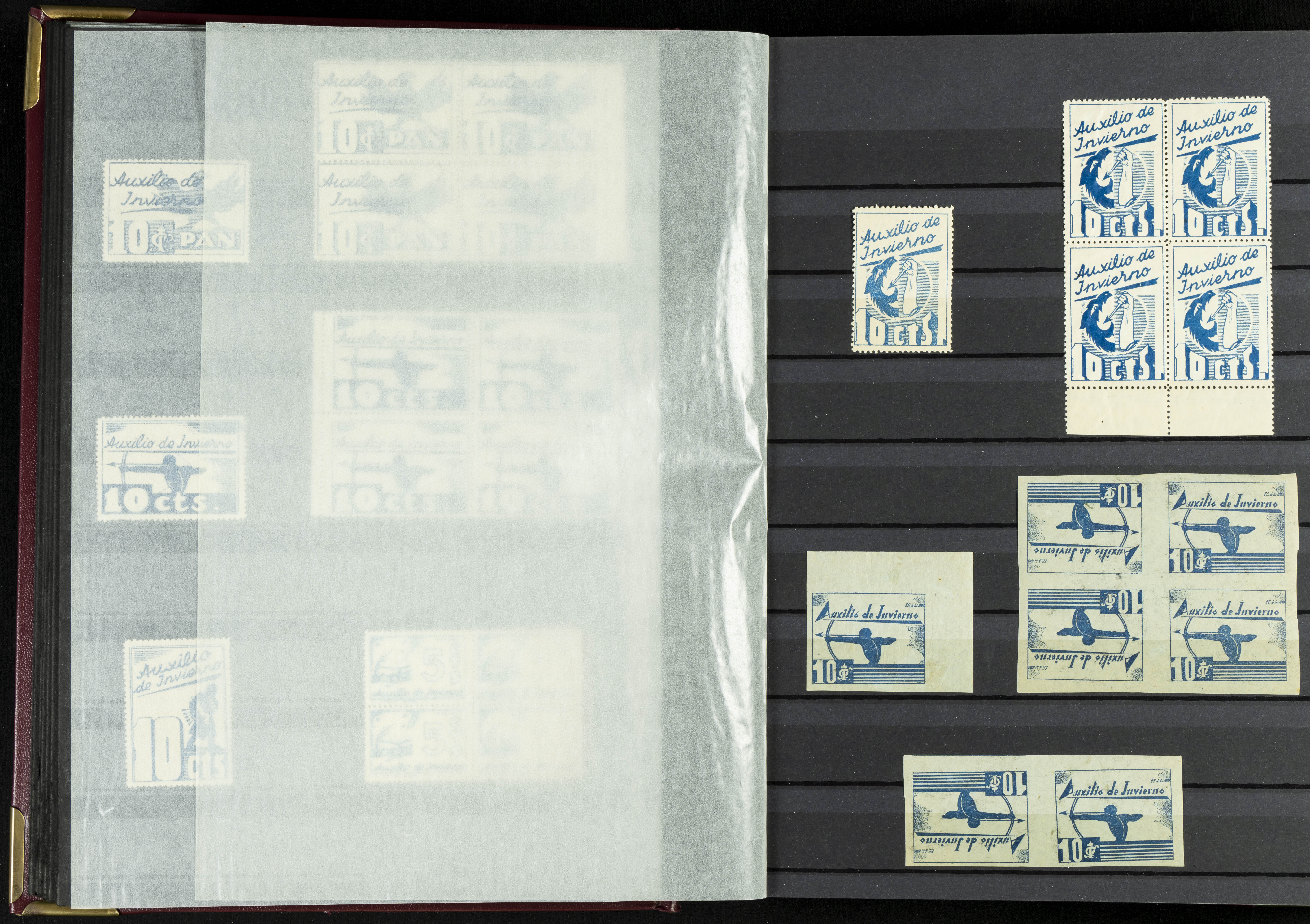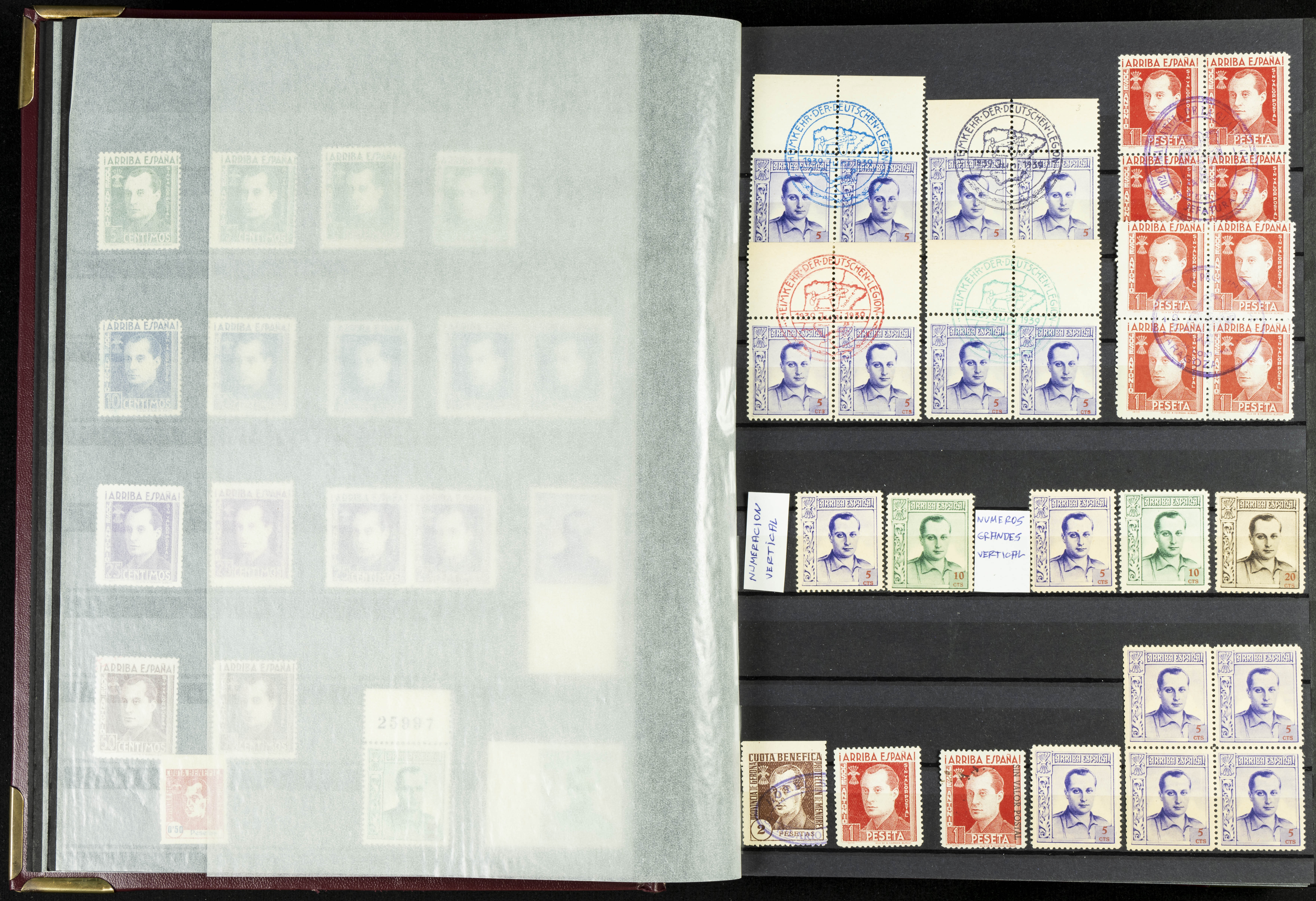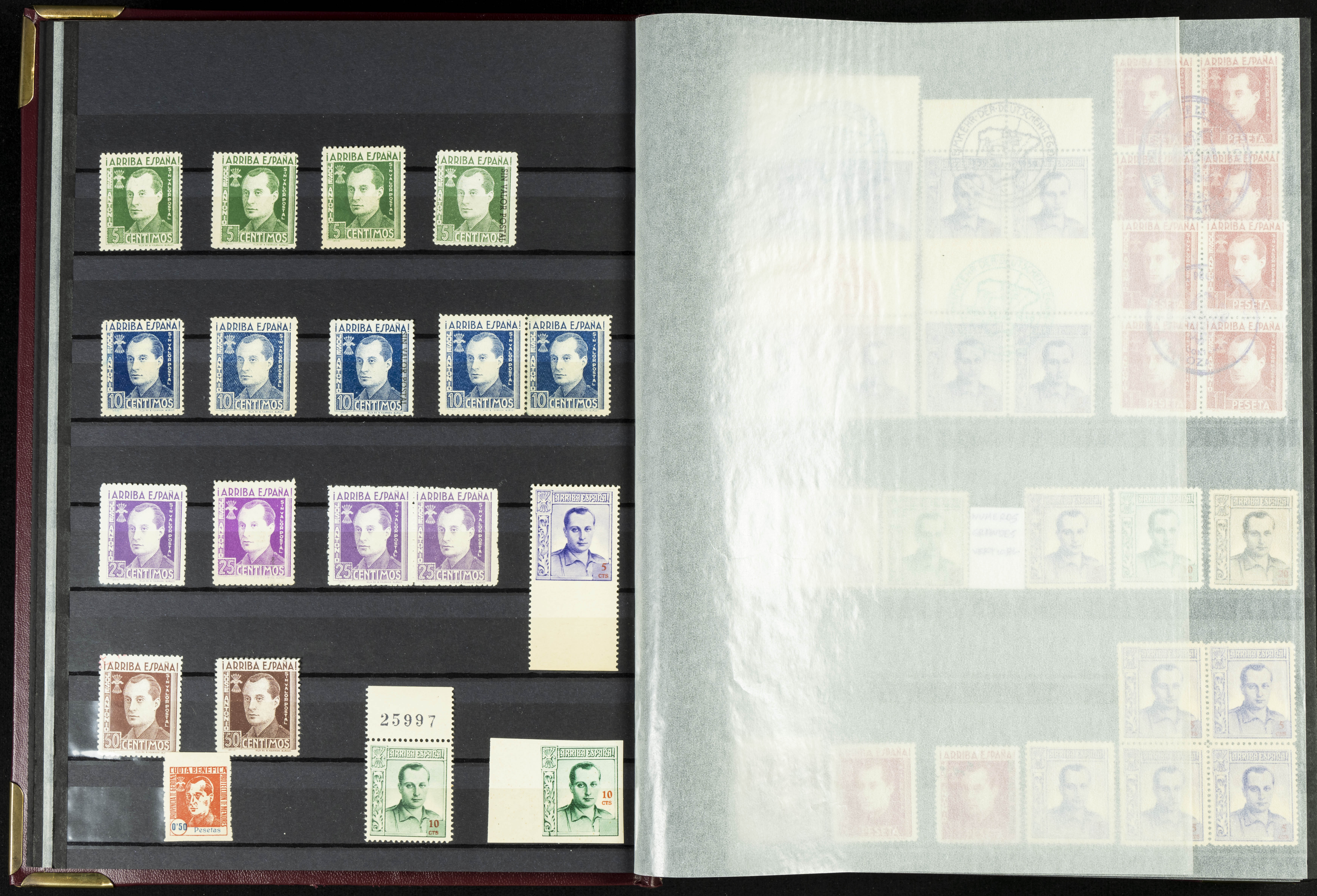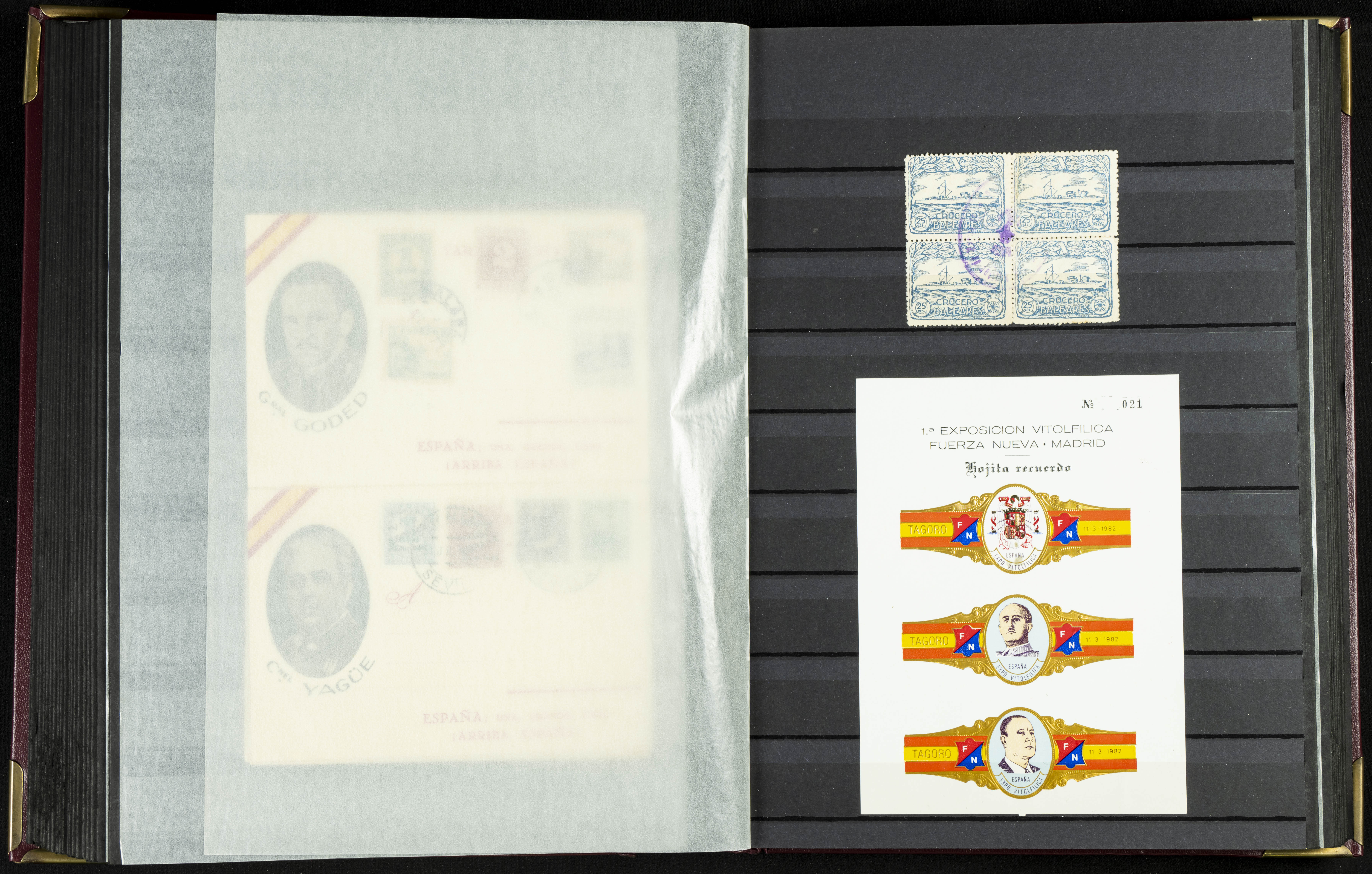 English (★)/(1936ca). A fascinating collection of stamps from charitable organizations, charitable establishments, and vignettes related to José Antonio and the Spanish Falange. The collection includes letters, documents, various types of stamps, postcards, a representation of fronts and hospitals (both mint and used), letterheads, other sections, and a copy of the book "Complete Works of José Antonio Primo de Rivera." A MUST-SEE.
