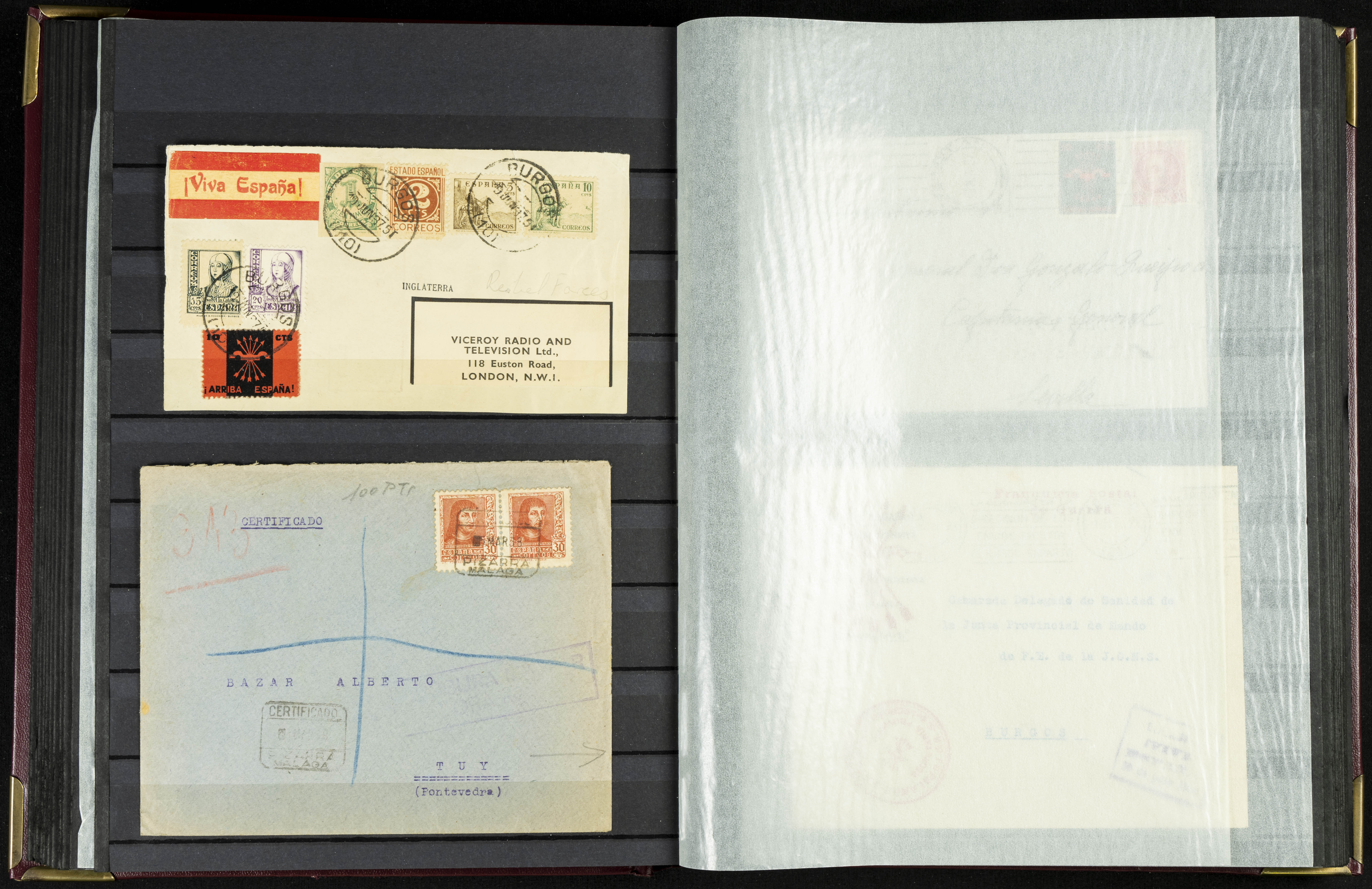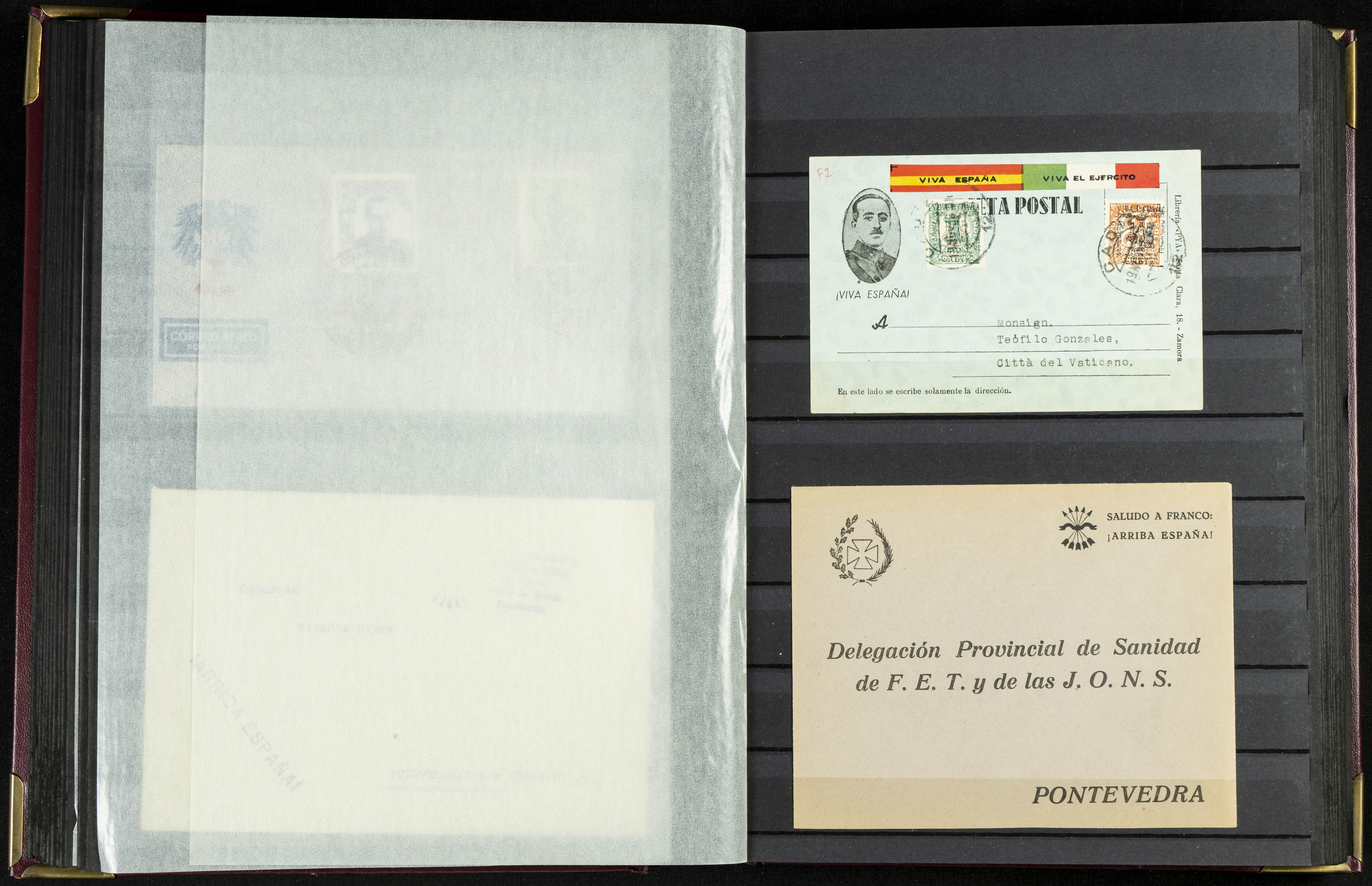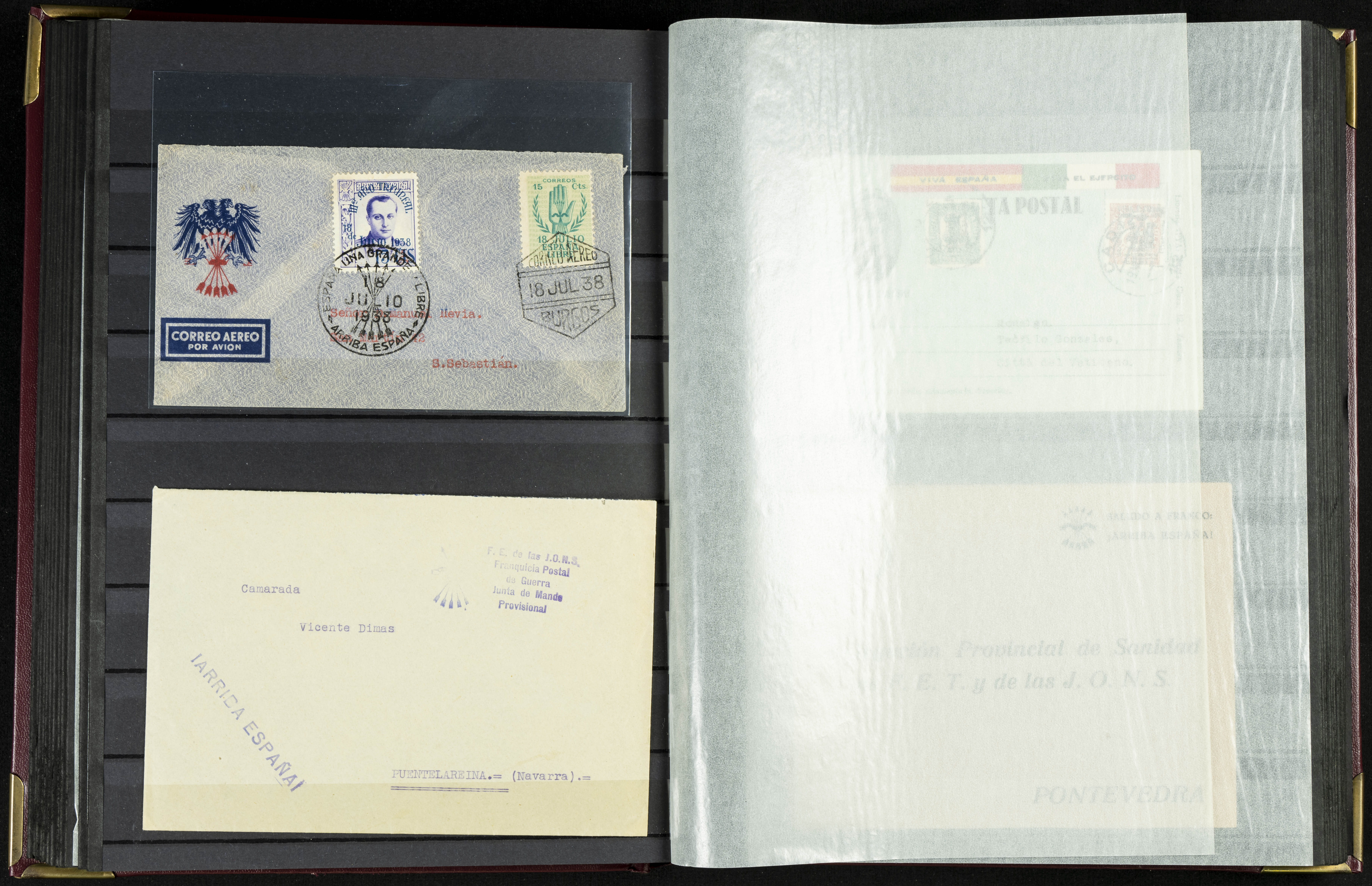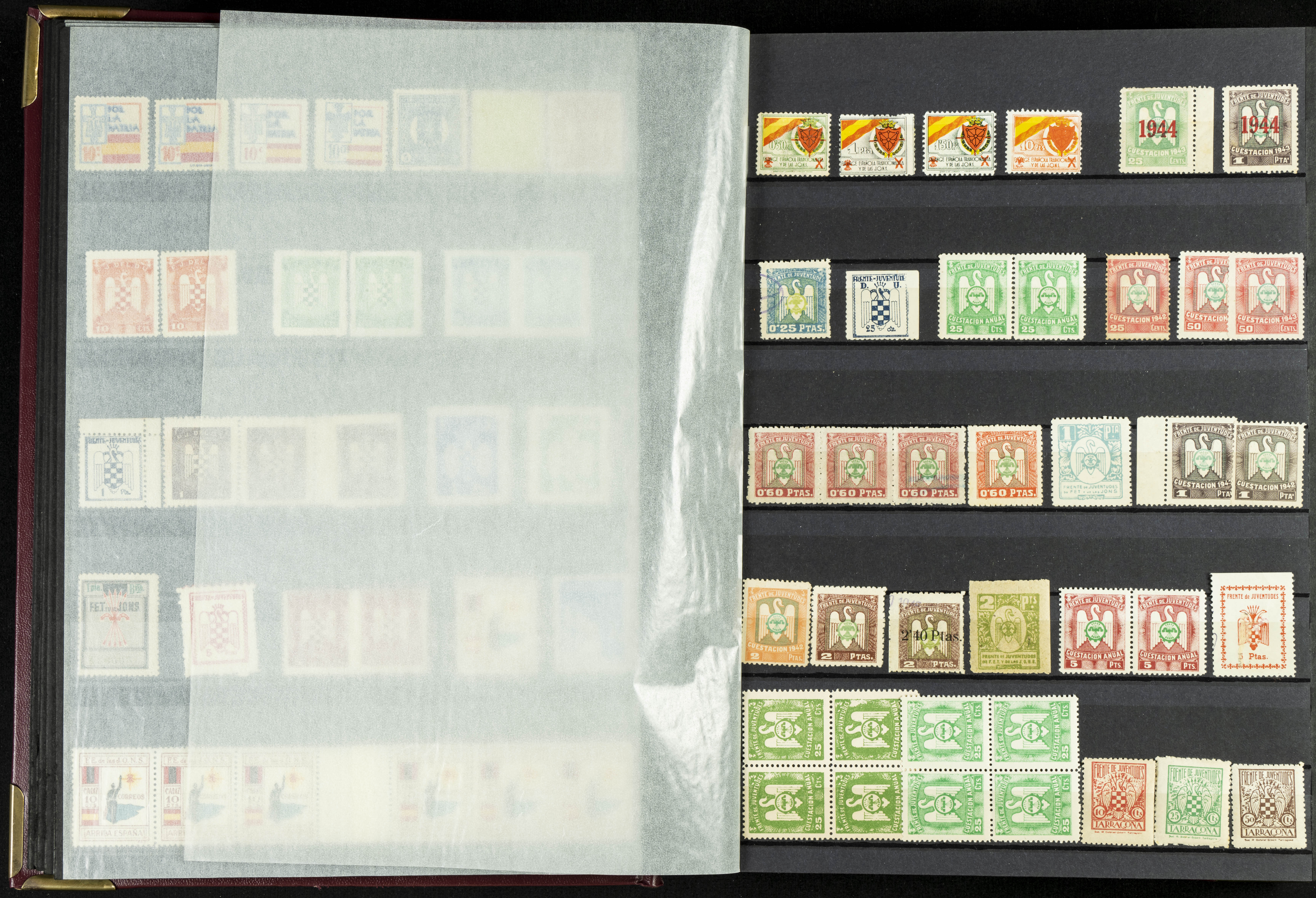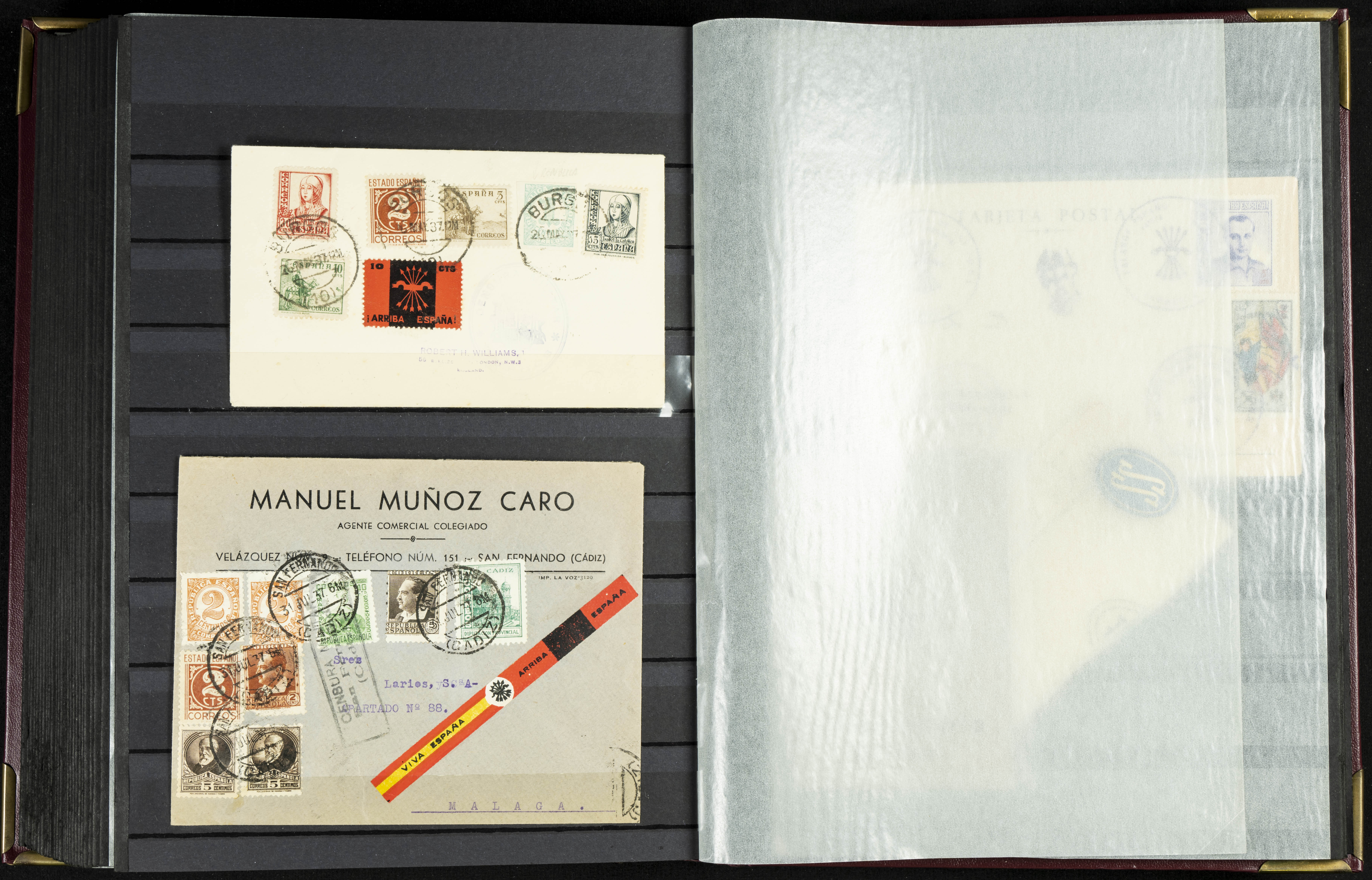 English (★)/(1936ca). A fascinating collection of stamps from charitable organizations, charitable establishments, and vignettes related to José Antonio and the Spanish Falange. The collection includes letters, documents, various types of stamps, postcards, a representation of fronts and hospitals (both mint and used), letterheads, other sections, and a copy of the book "Complete Works of José Antonio Primo de Rivera." A MUST-SEE.