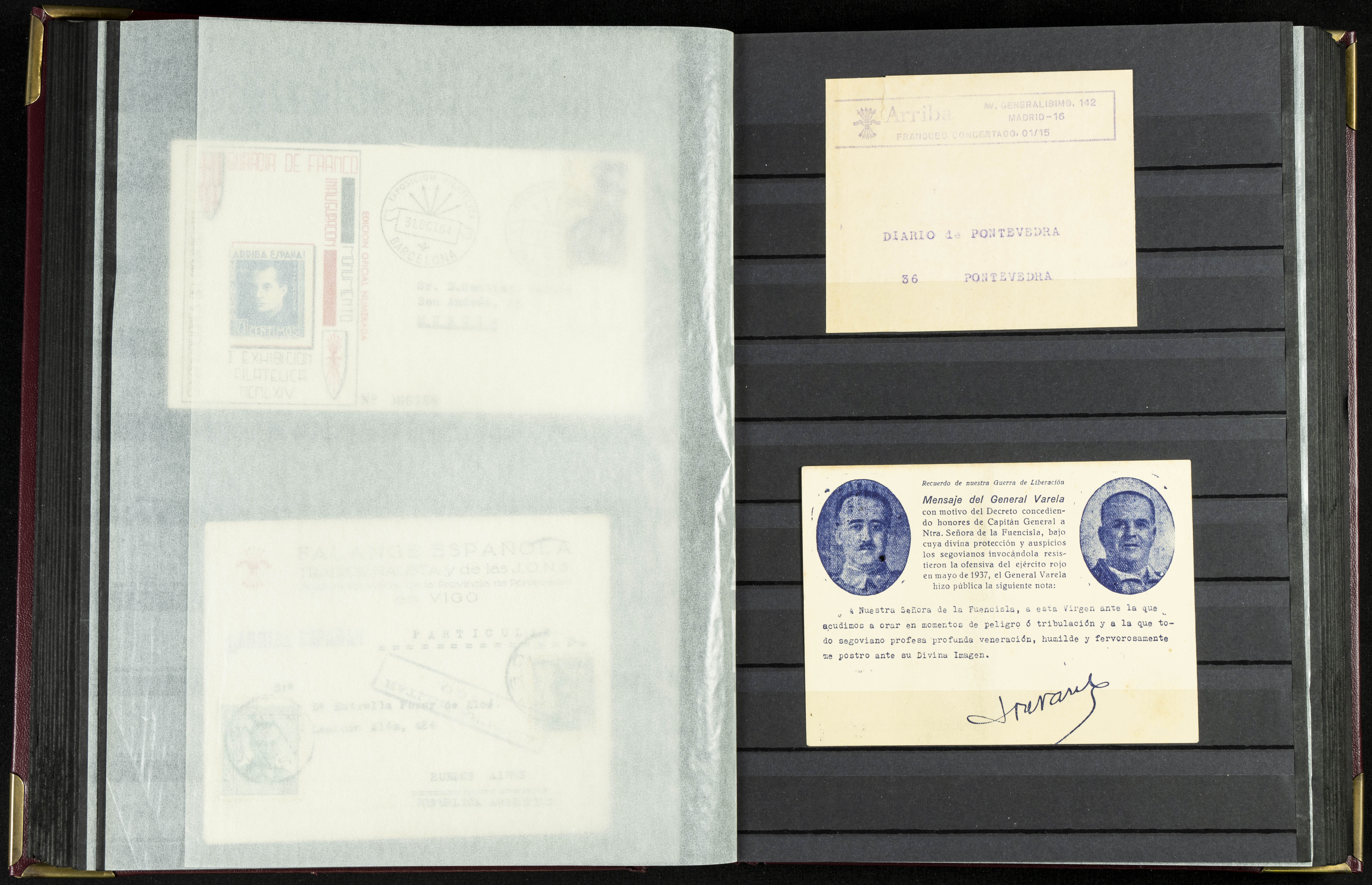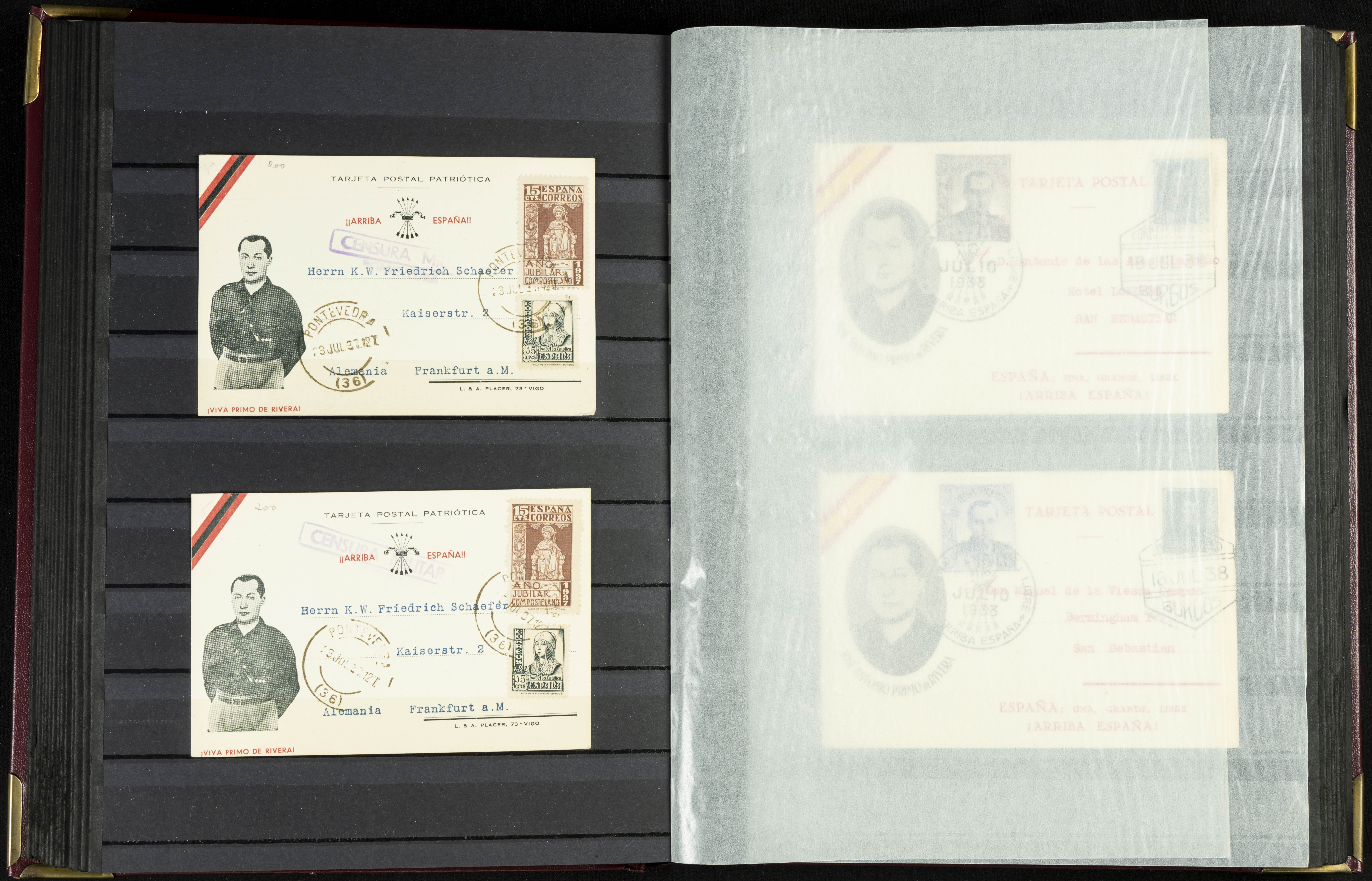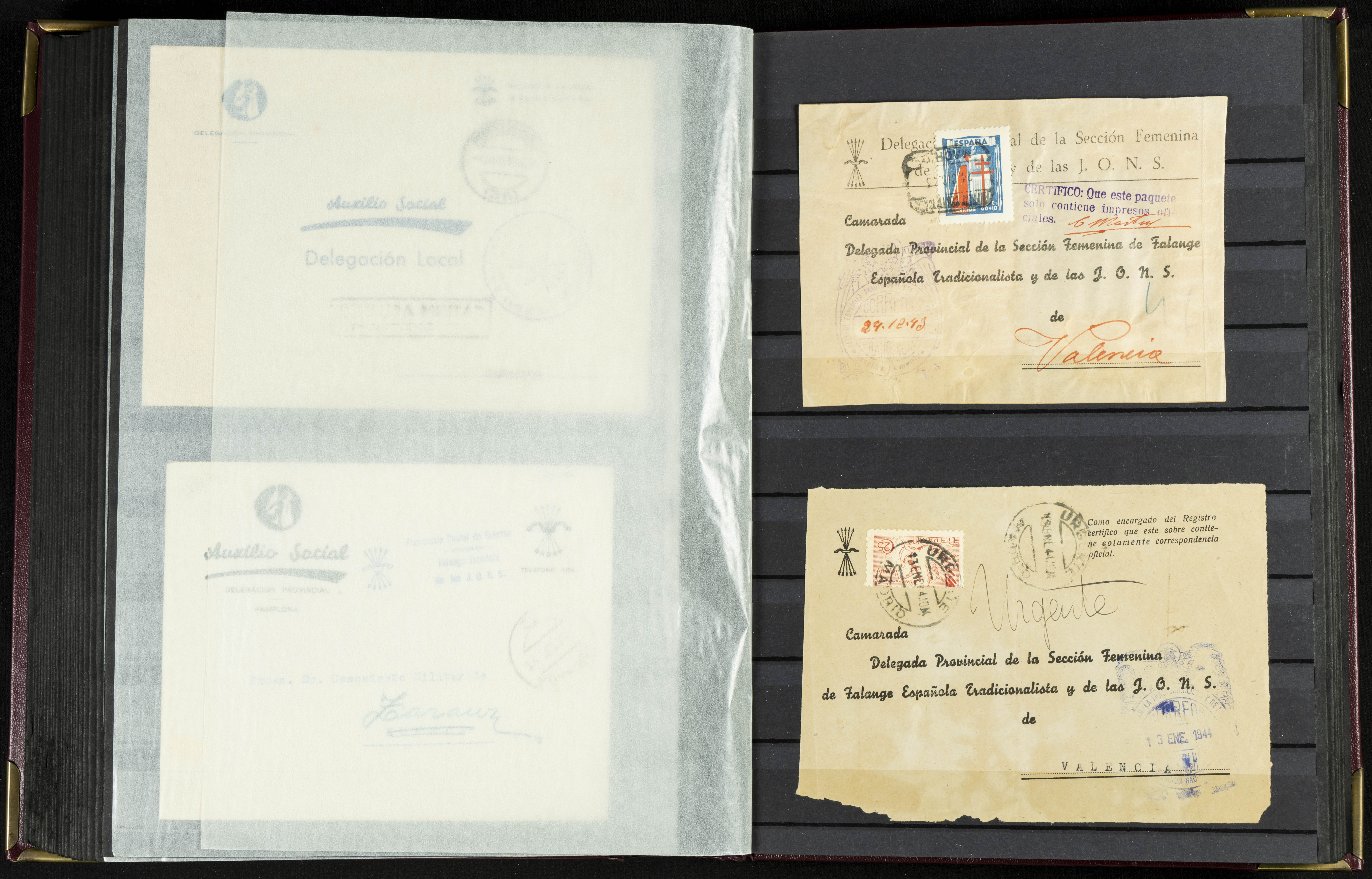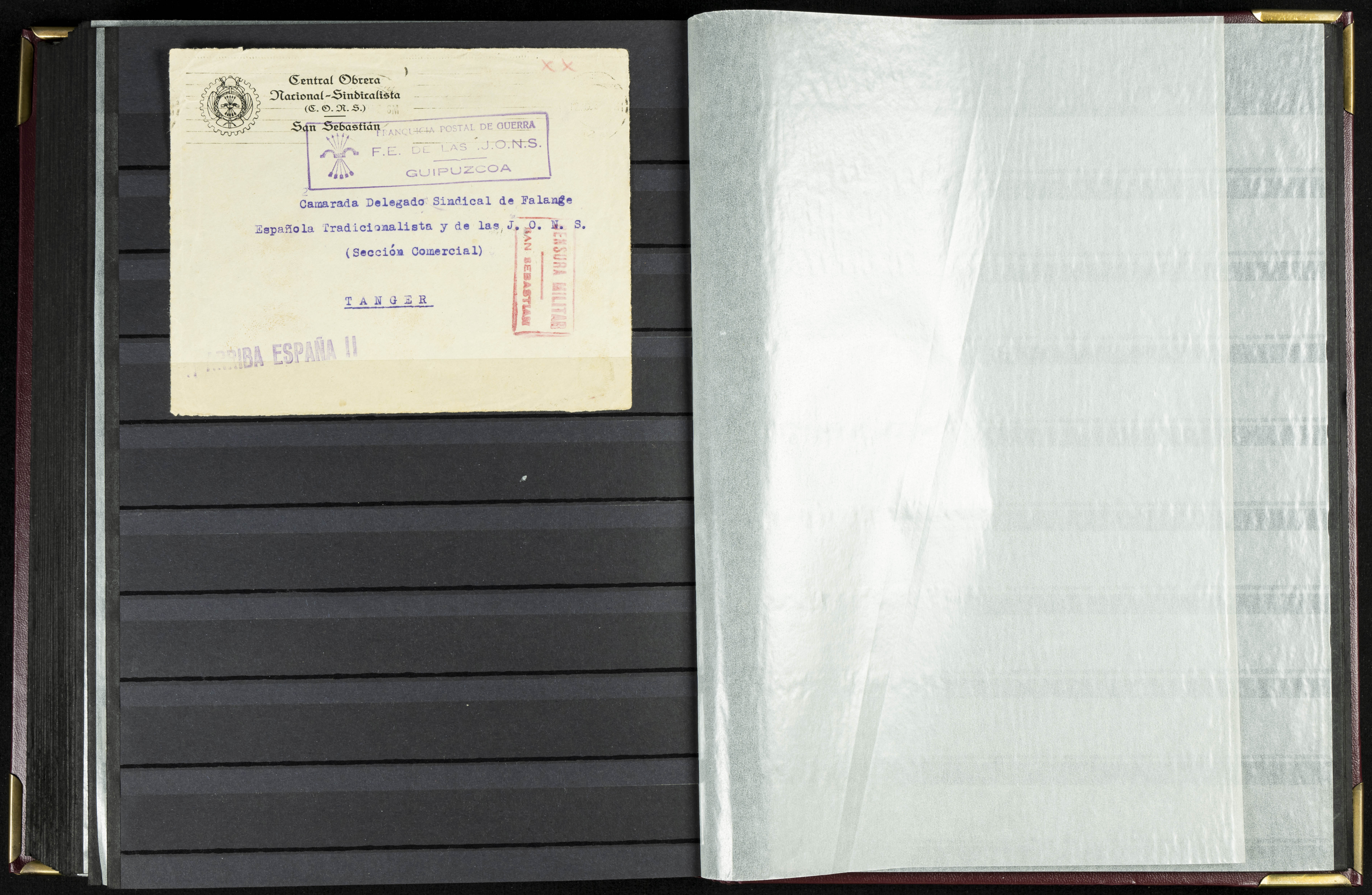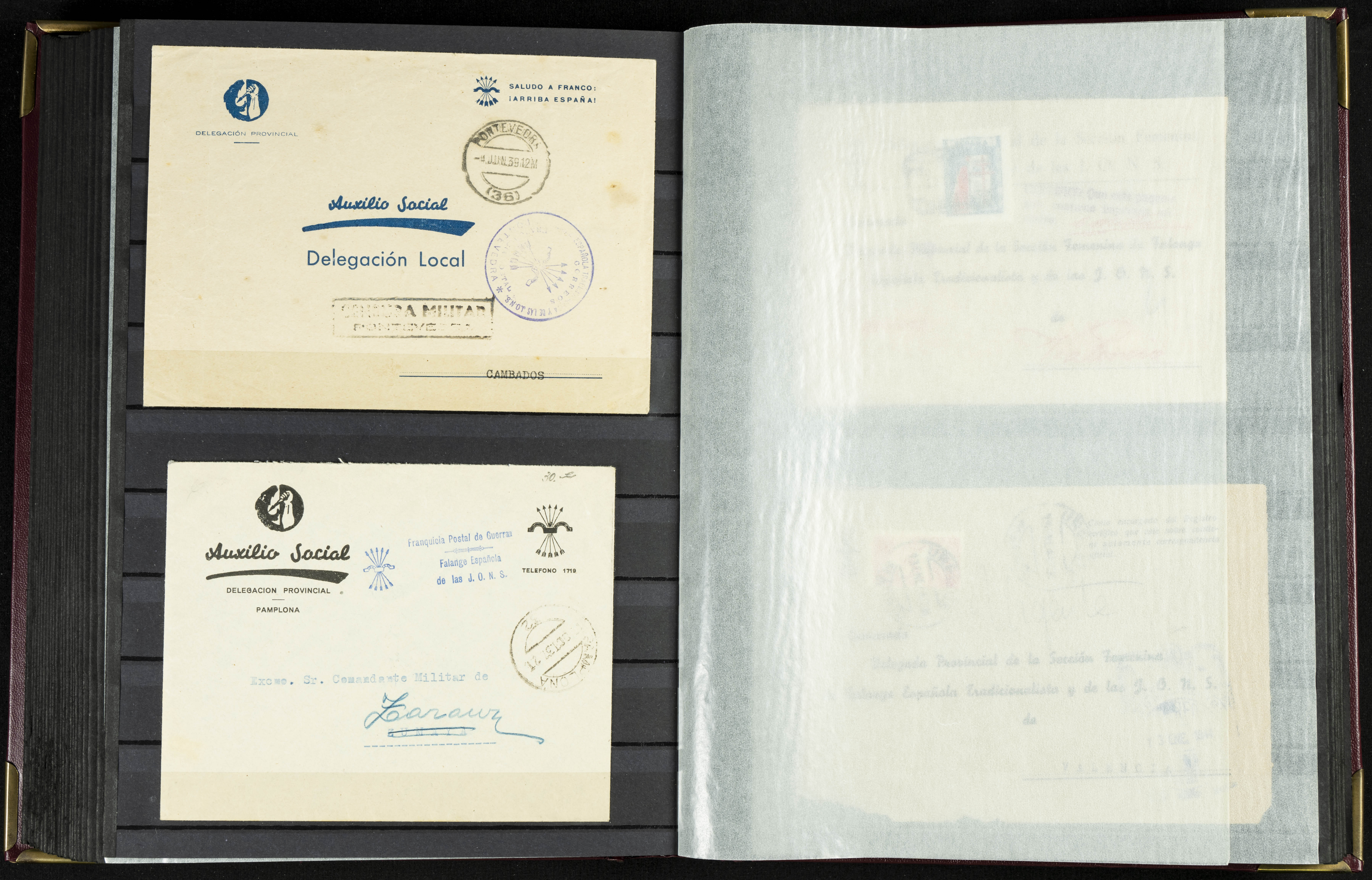 English (★)/(1936ca). A fascinating collection of stamps from charitable organizations, charitable establishments, and vignettes related to José Antonio and the Spanish Falange. The collection includes letters, documents, various types of stamps, postcards, a representation of fronts and hospitals (both mint and used), letterheads, other sections, and a copy of the book "Complete Works of José Antonio Primo de Rivera." A MUST-SEE.