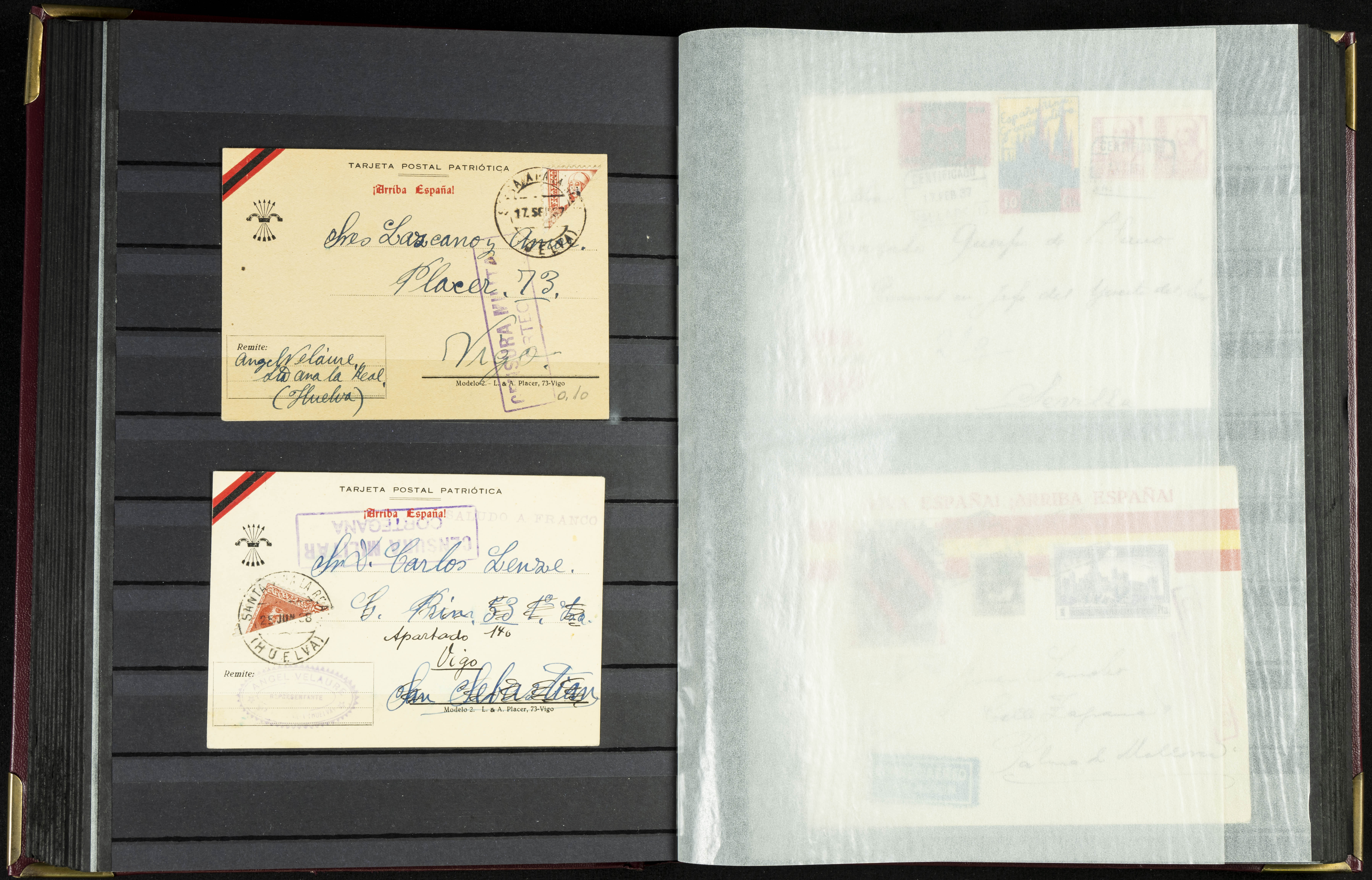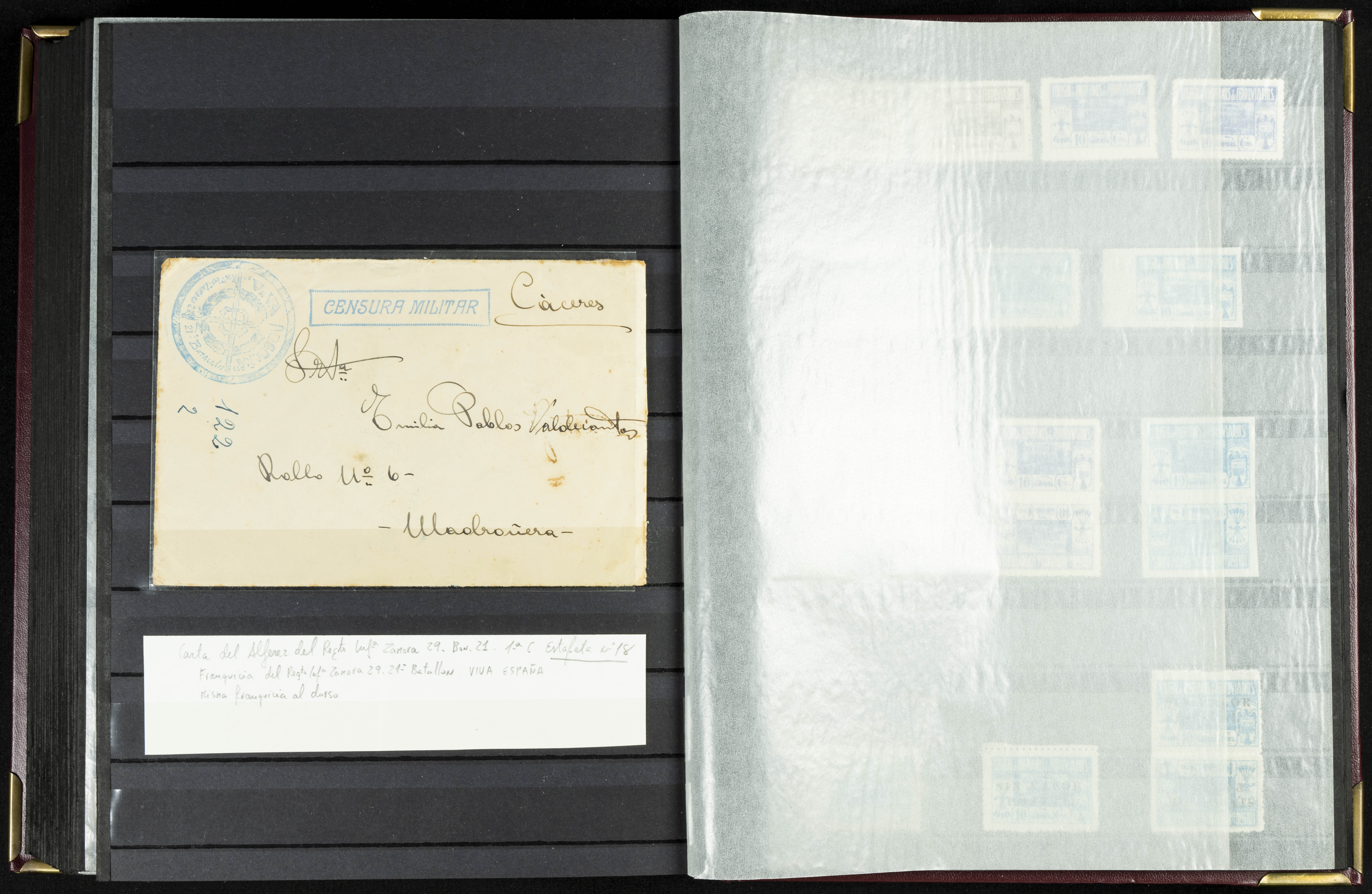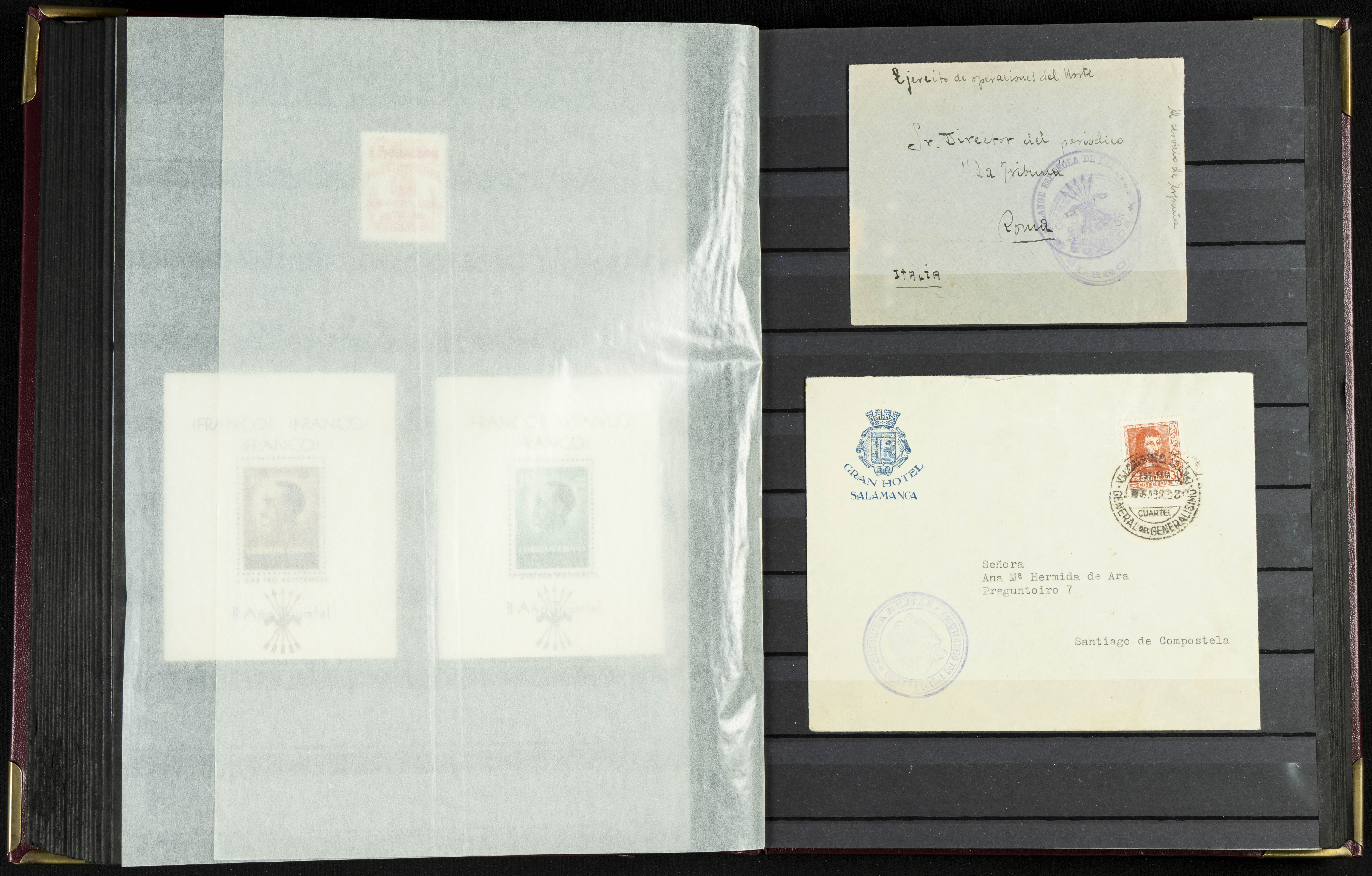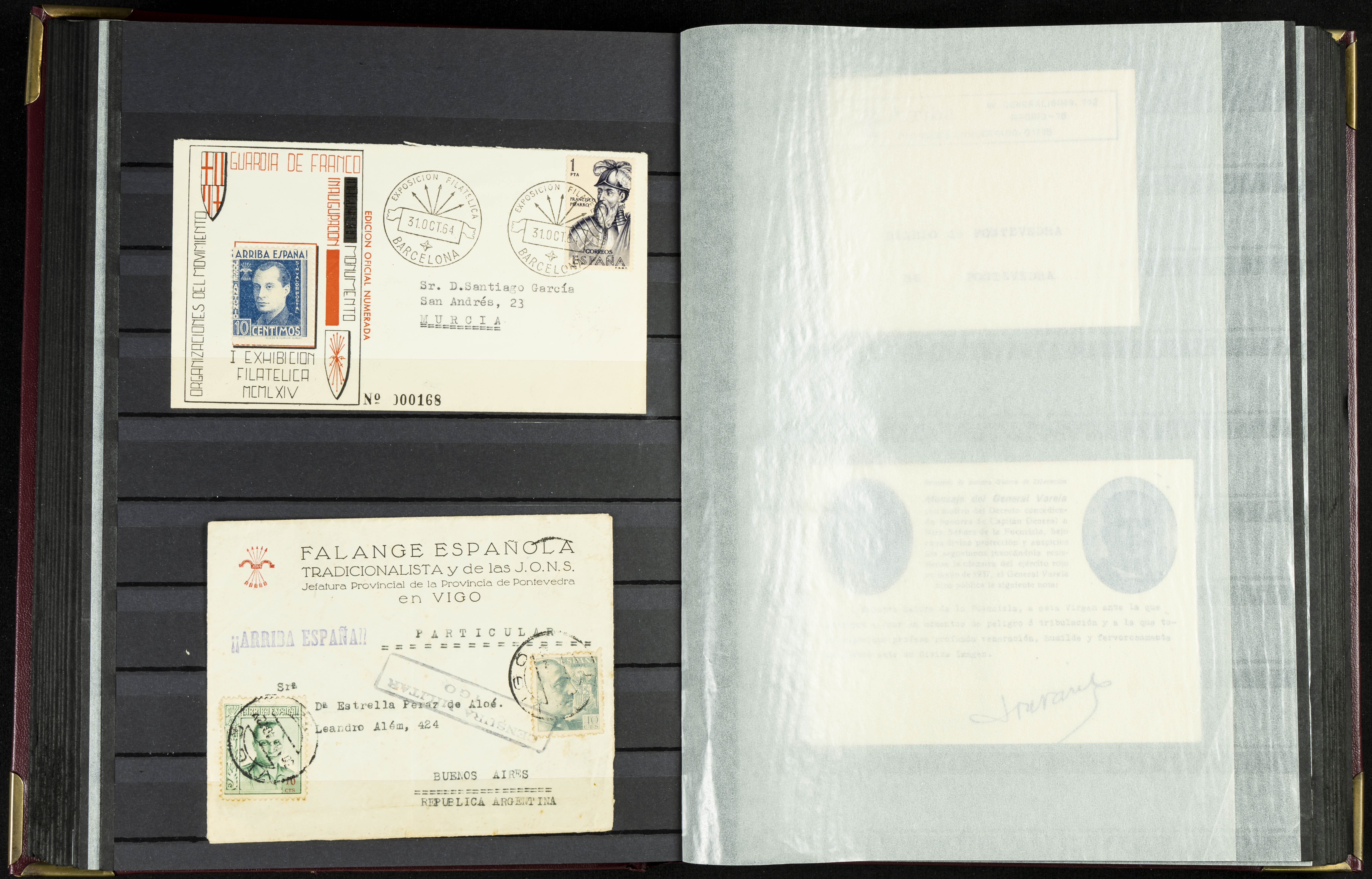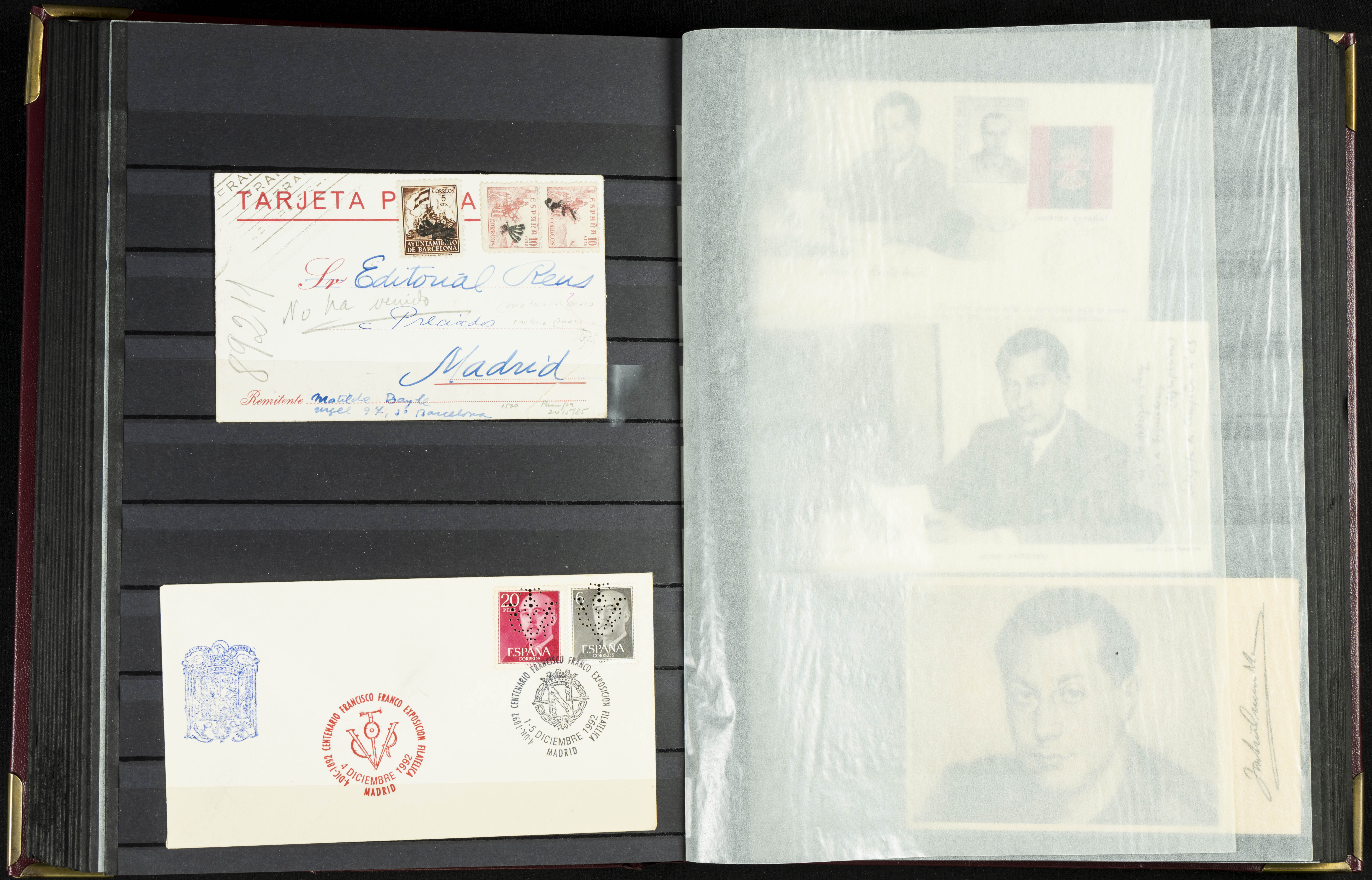 English (★)/(1936ca). A fascinating collection of stamps from charitable organizations, charitable establishments, and vignettes related to José Antonio and the Spanish Falange. The collection includes letters, documents, various types of stamps, postcards, a representation of fronts and hospitals (both mint and used), letterheads, other sections, and a copy of the book "Complete Works of José Antonio Primo de Rivera." A MUST-SEE.