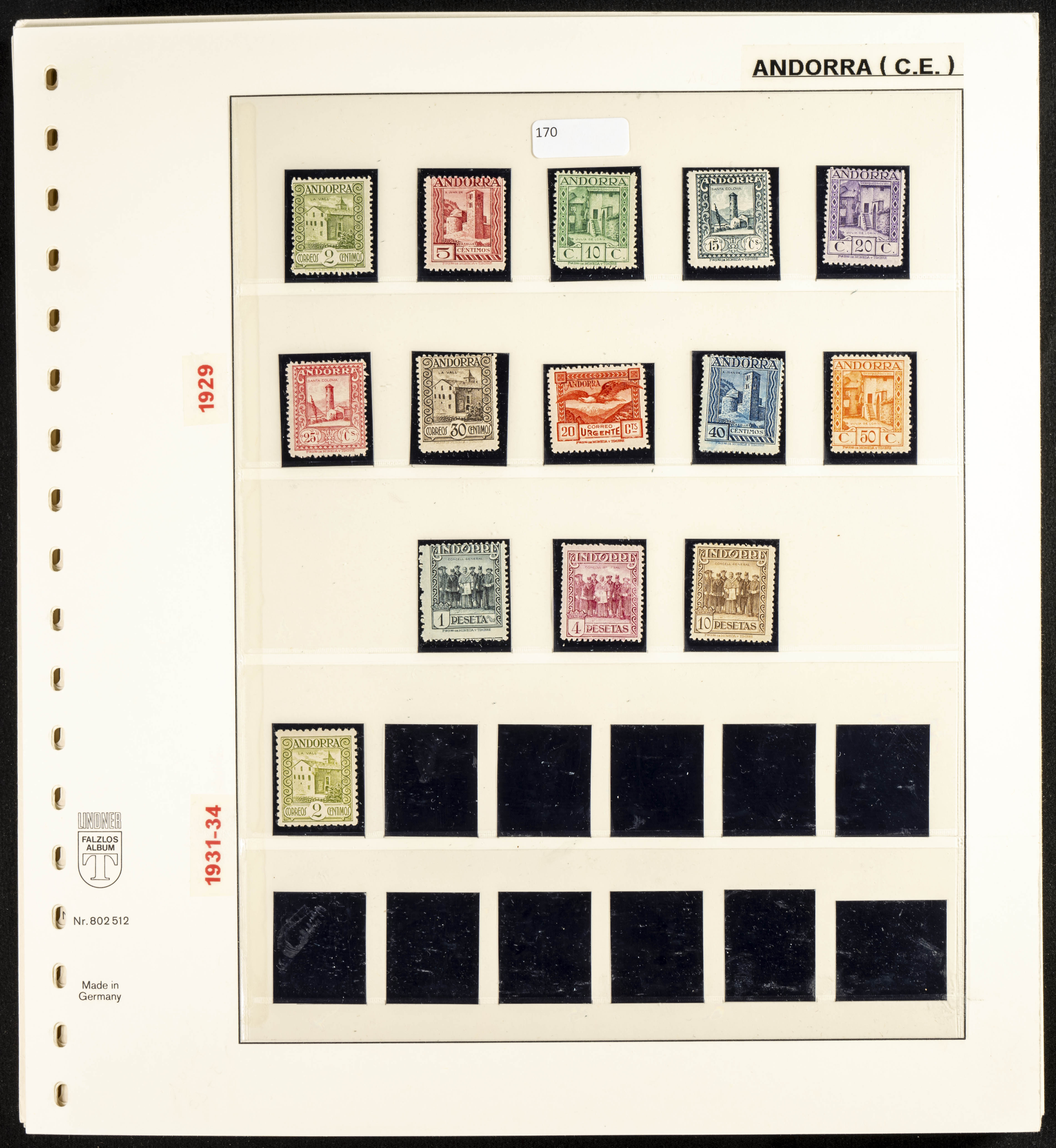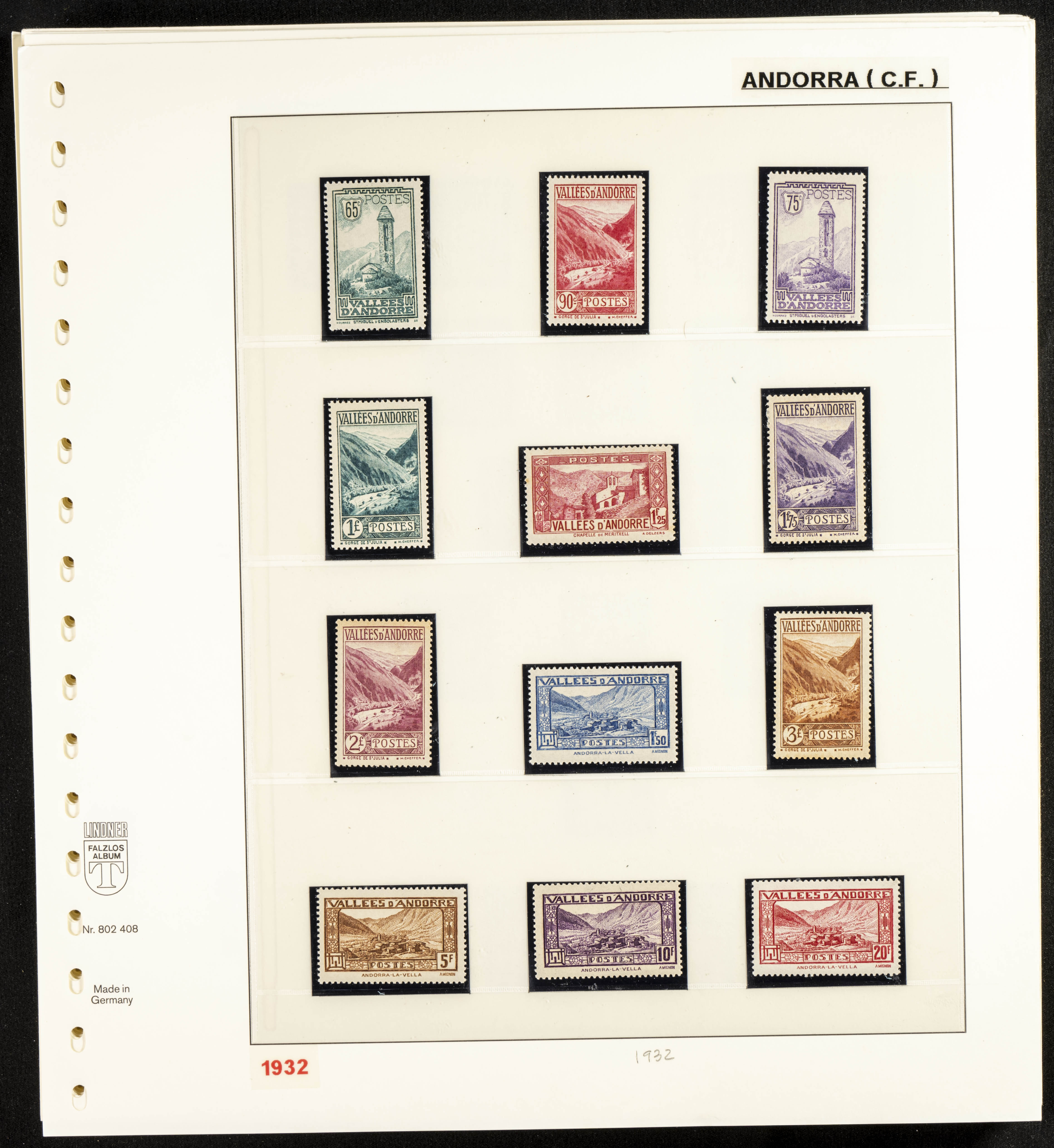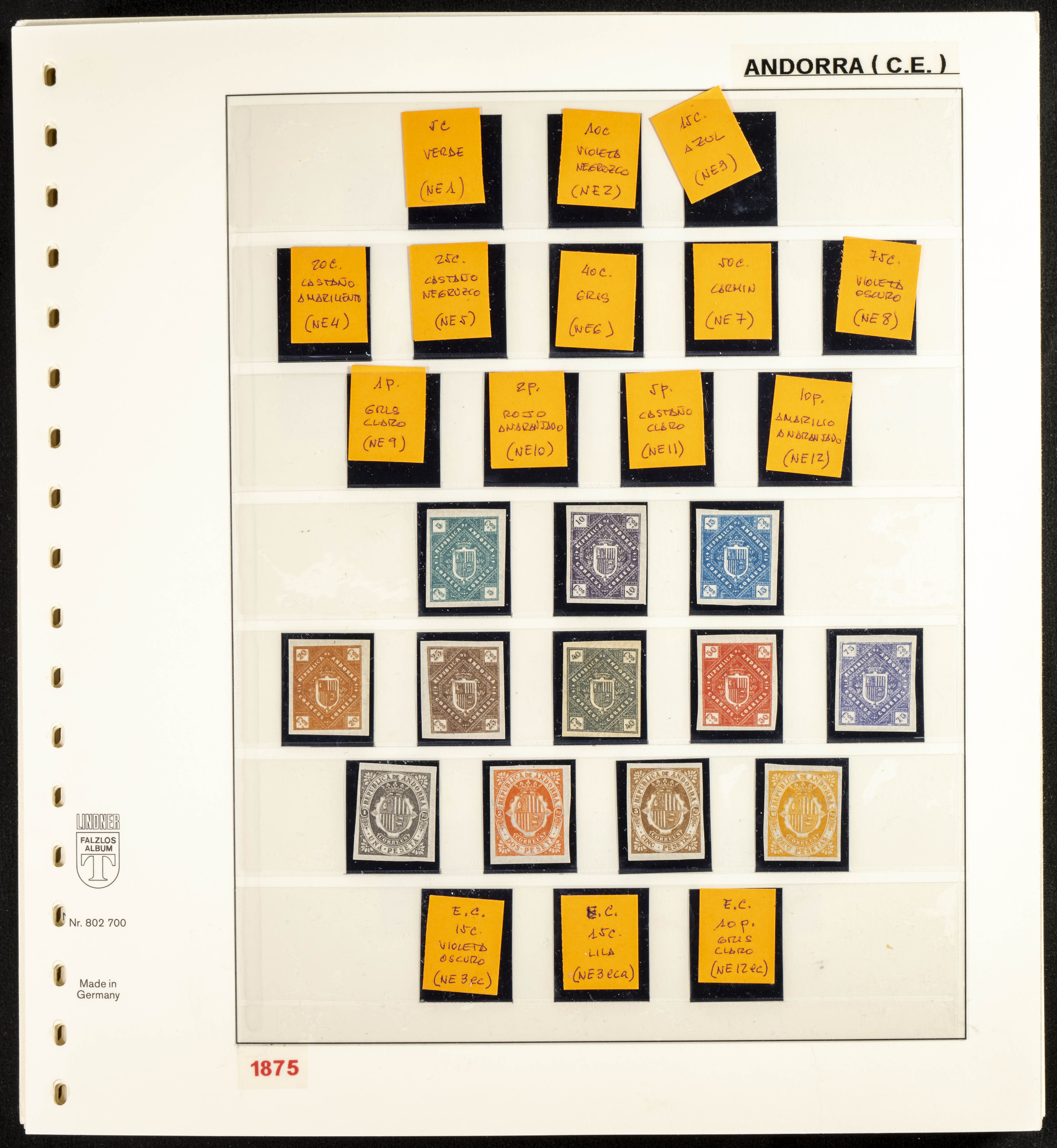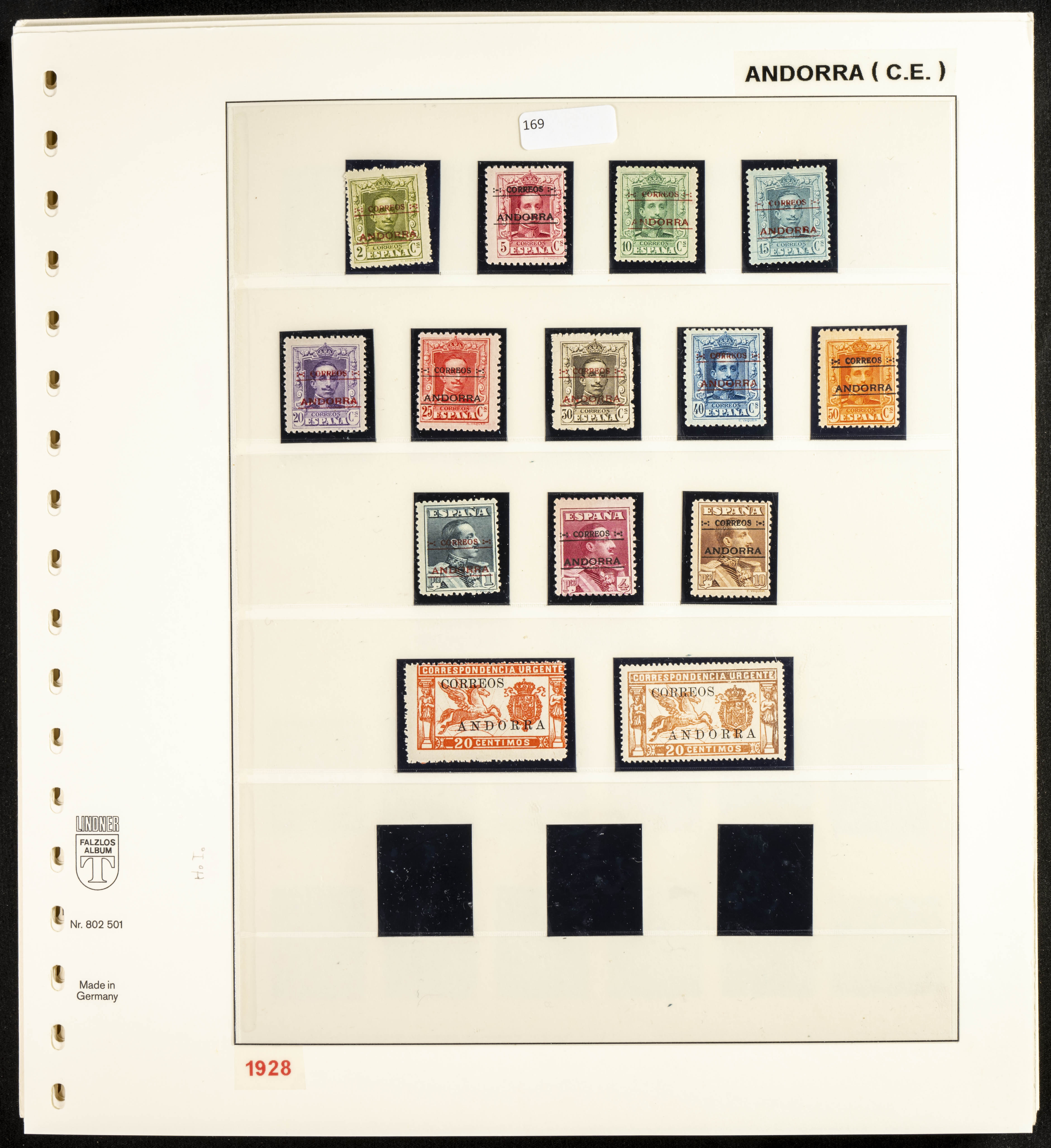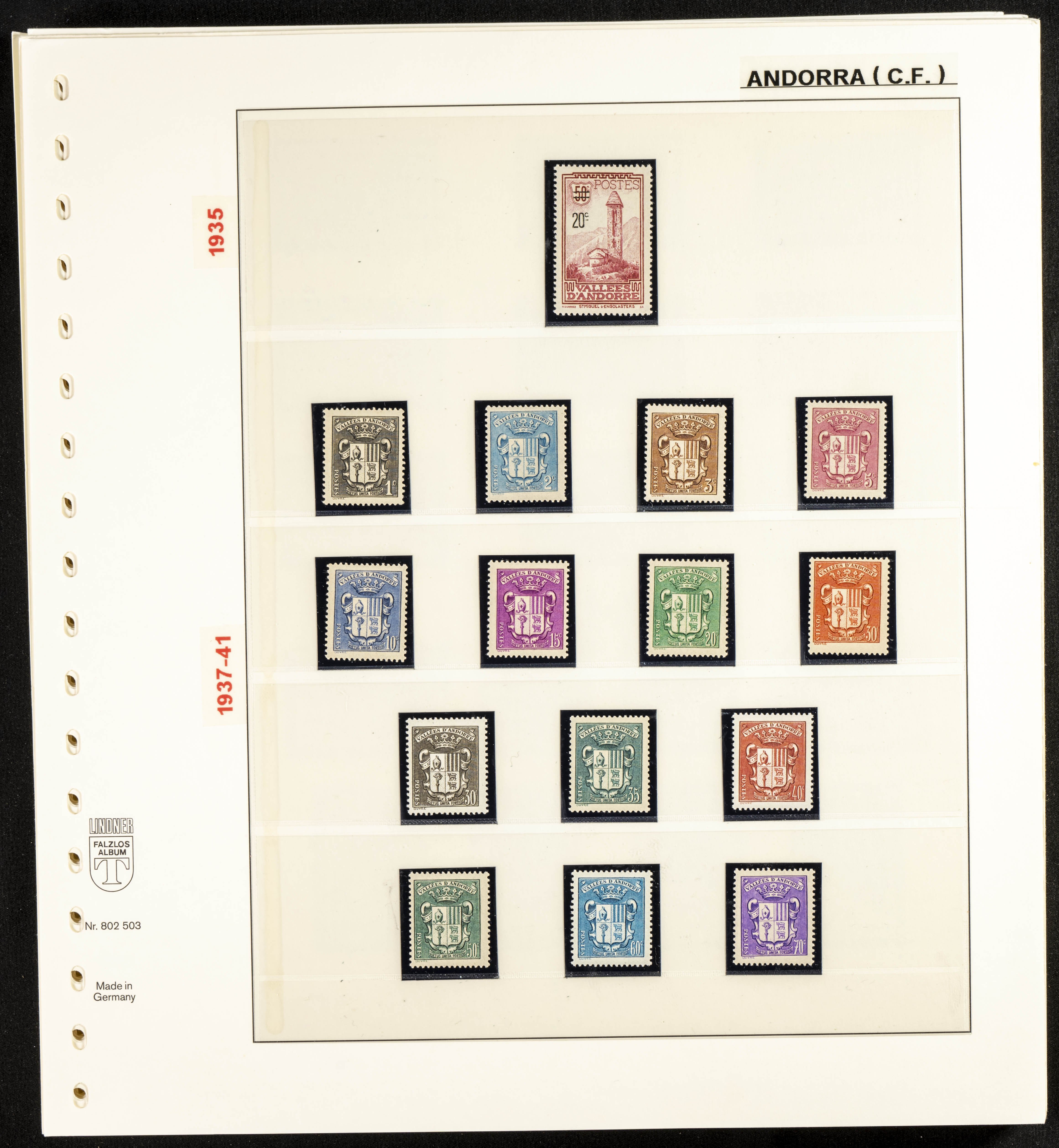 ★★/★(1875ca). Interesting collections of Spanish Andorra stamps between 1875 and 1989, in mint condition and practically complete except for the 1931 series (coarse perforation) and the 1935 series (unnumbered), and French Andorra stamps between 1931 and 1987, practically complete and mint except for the 1948 series and some other stamps of little value (includes fees). TO BE EXAMINED. Edifil 2026: +6,800 Euros
