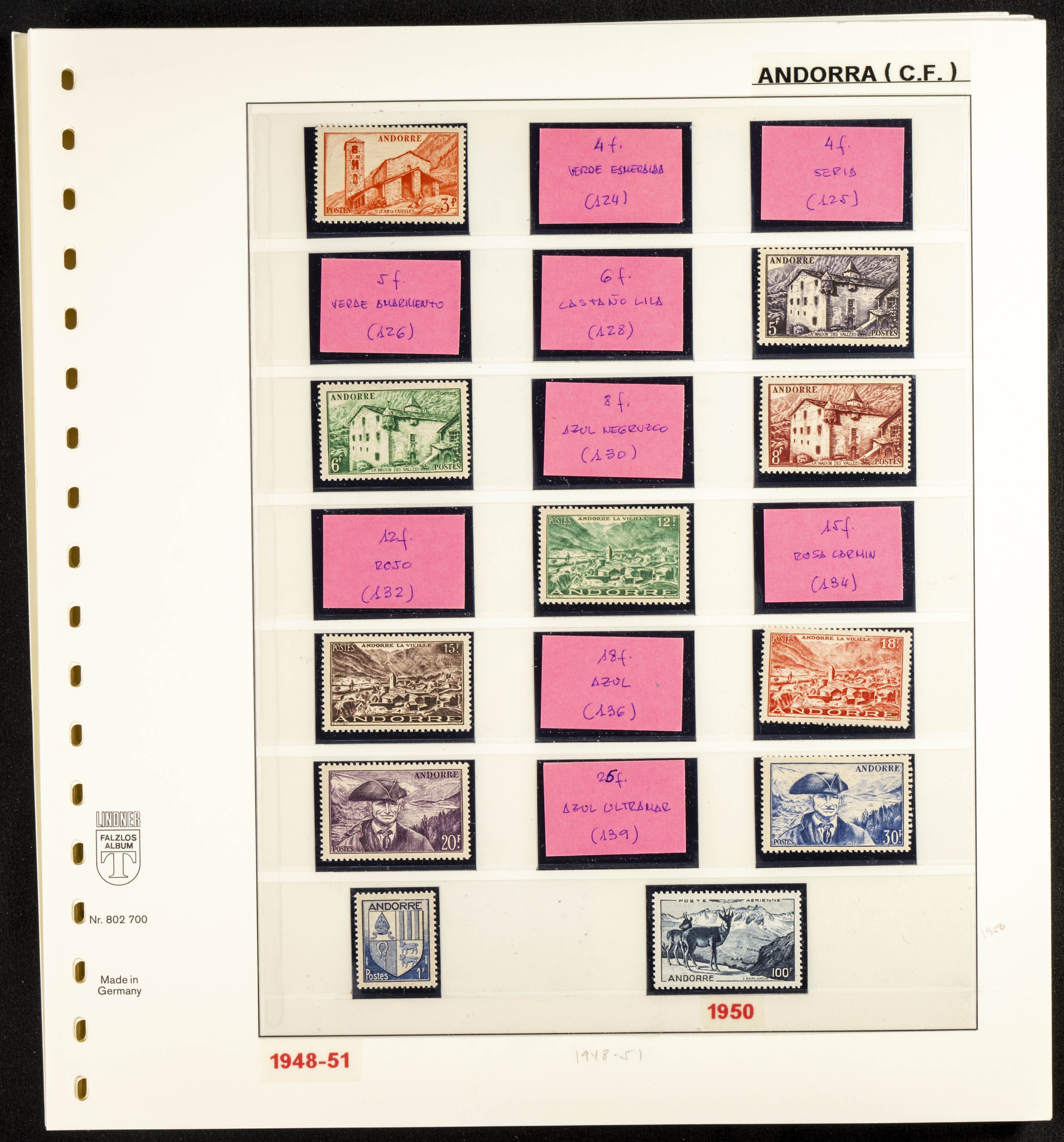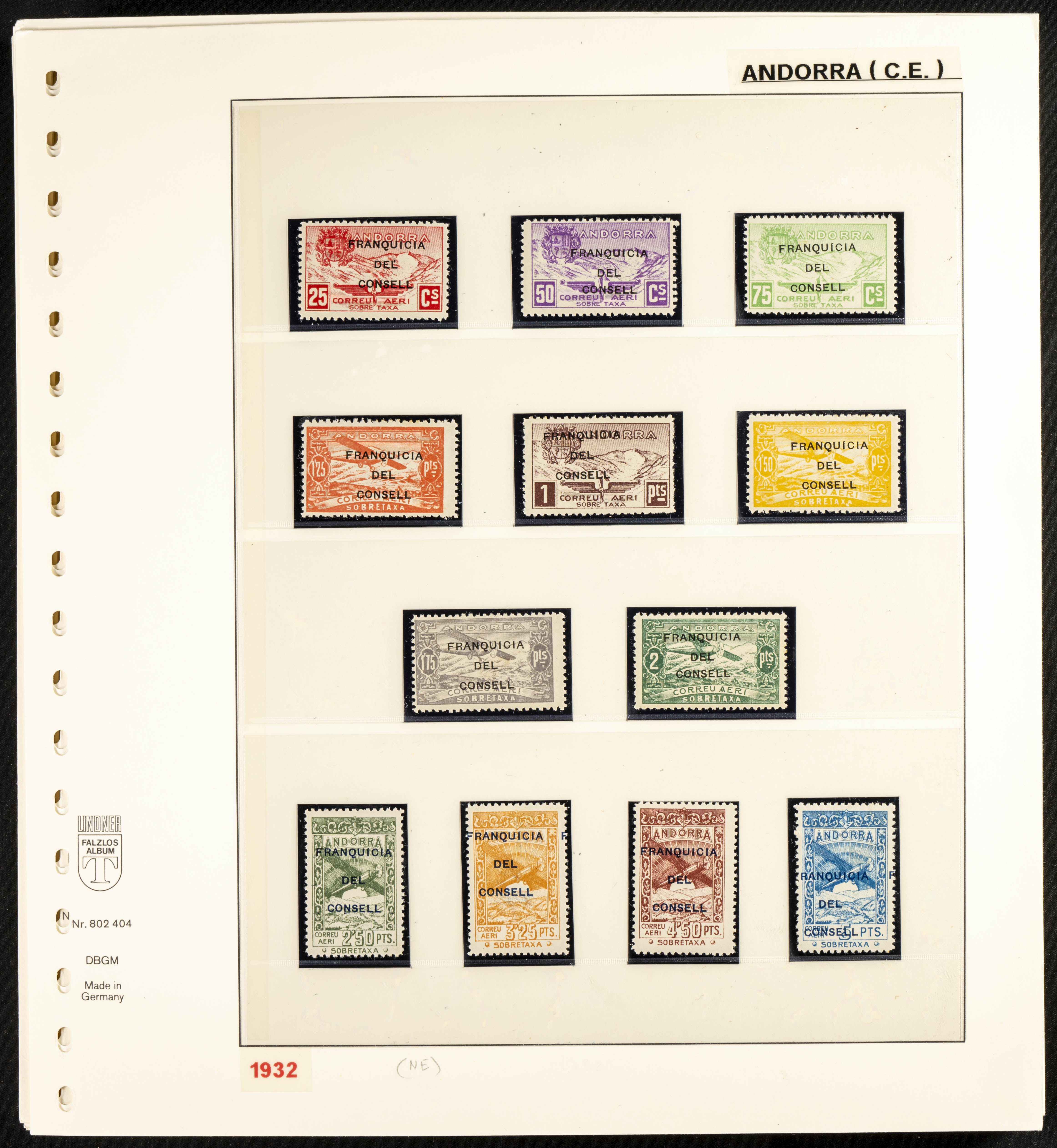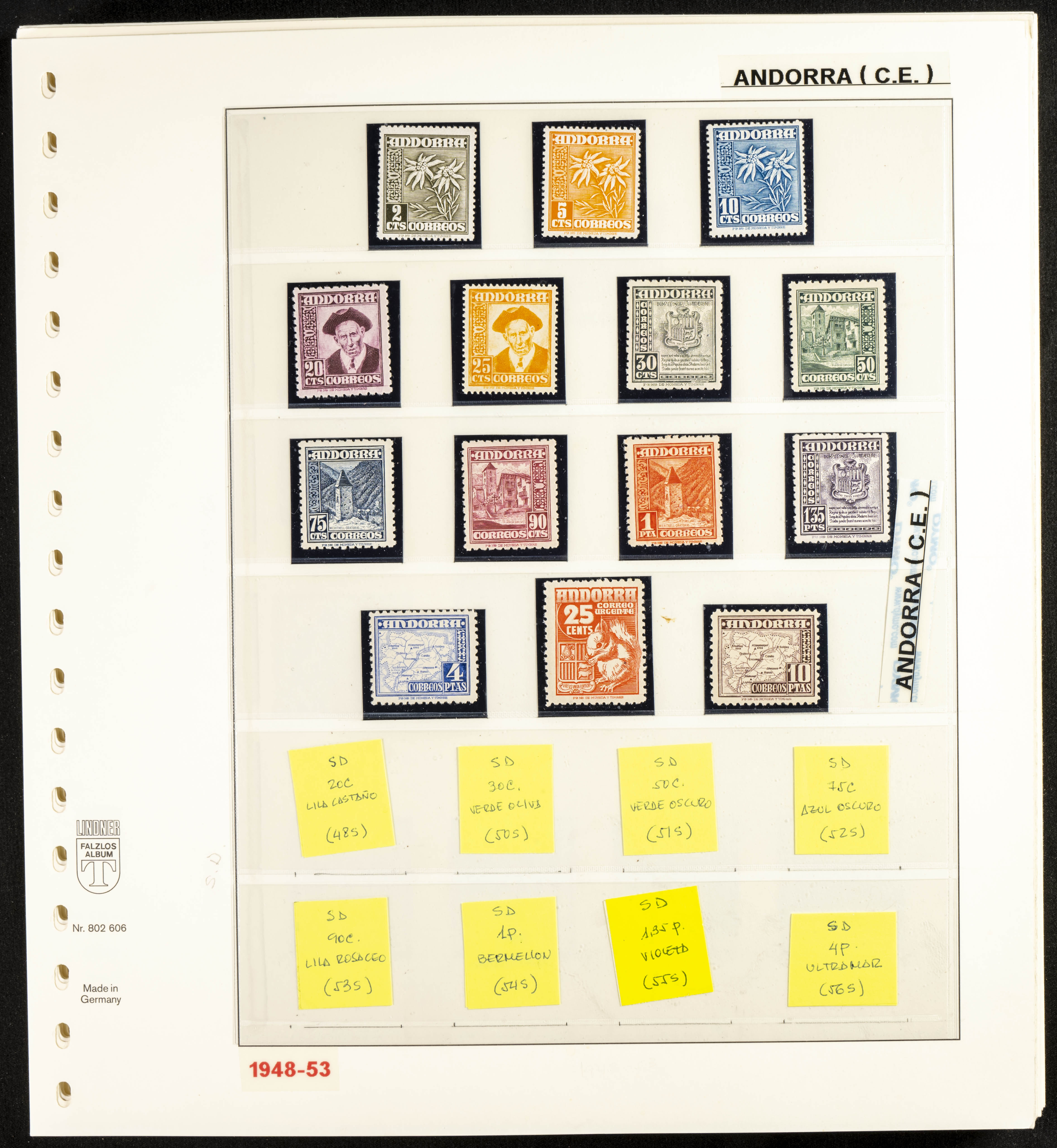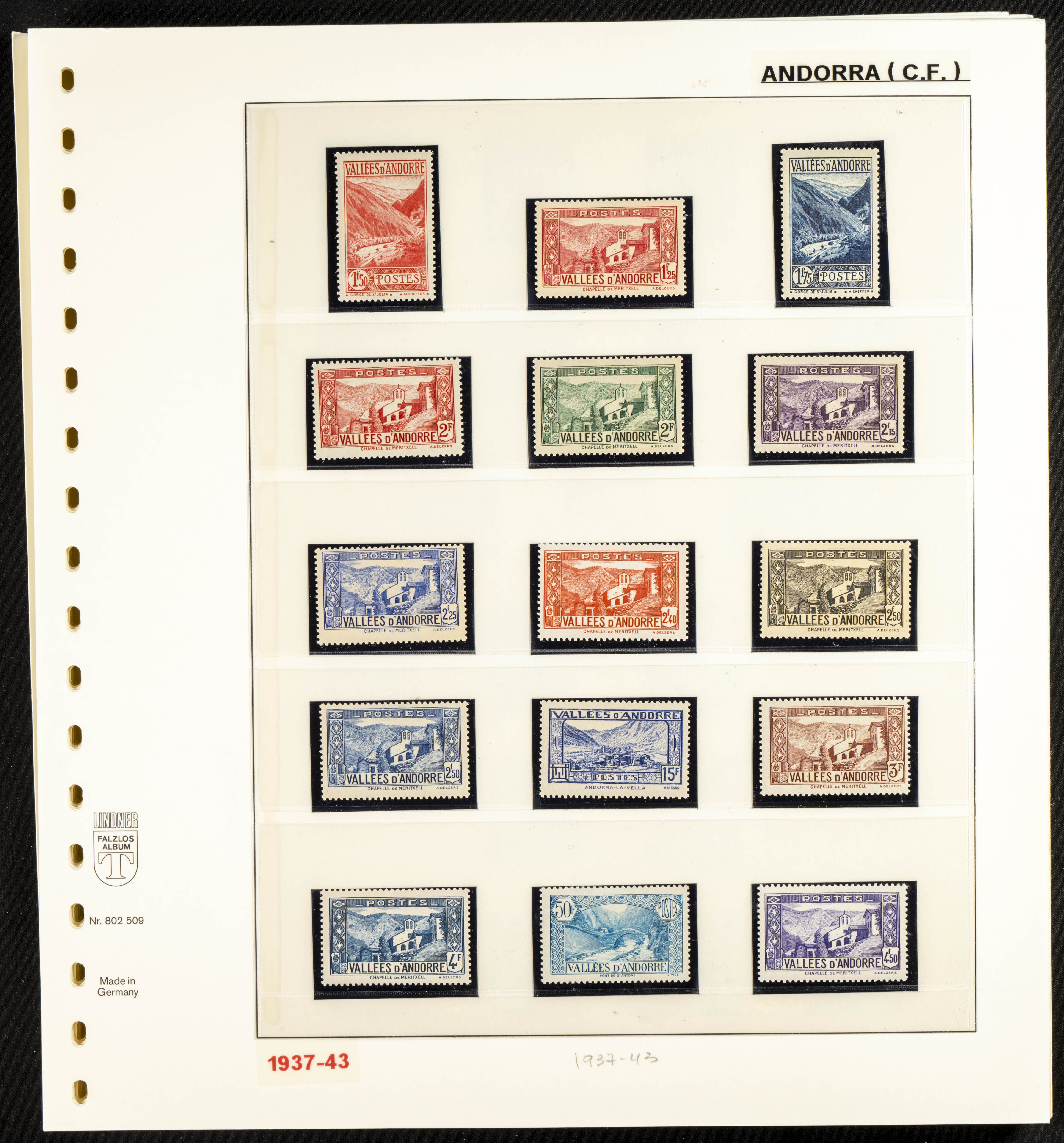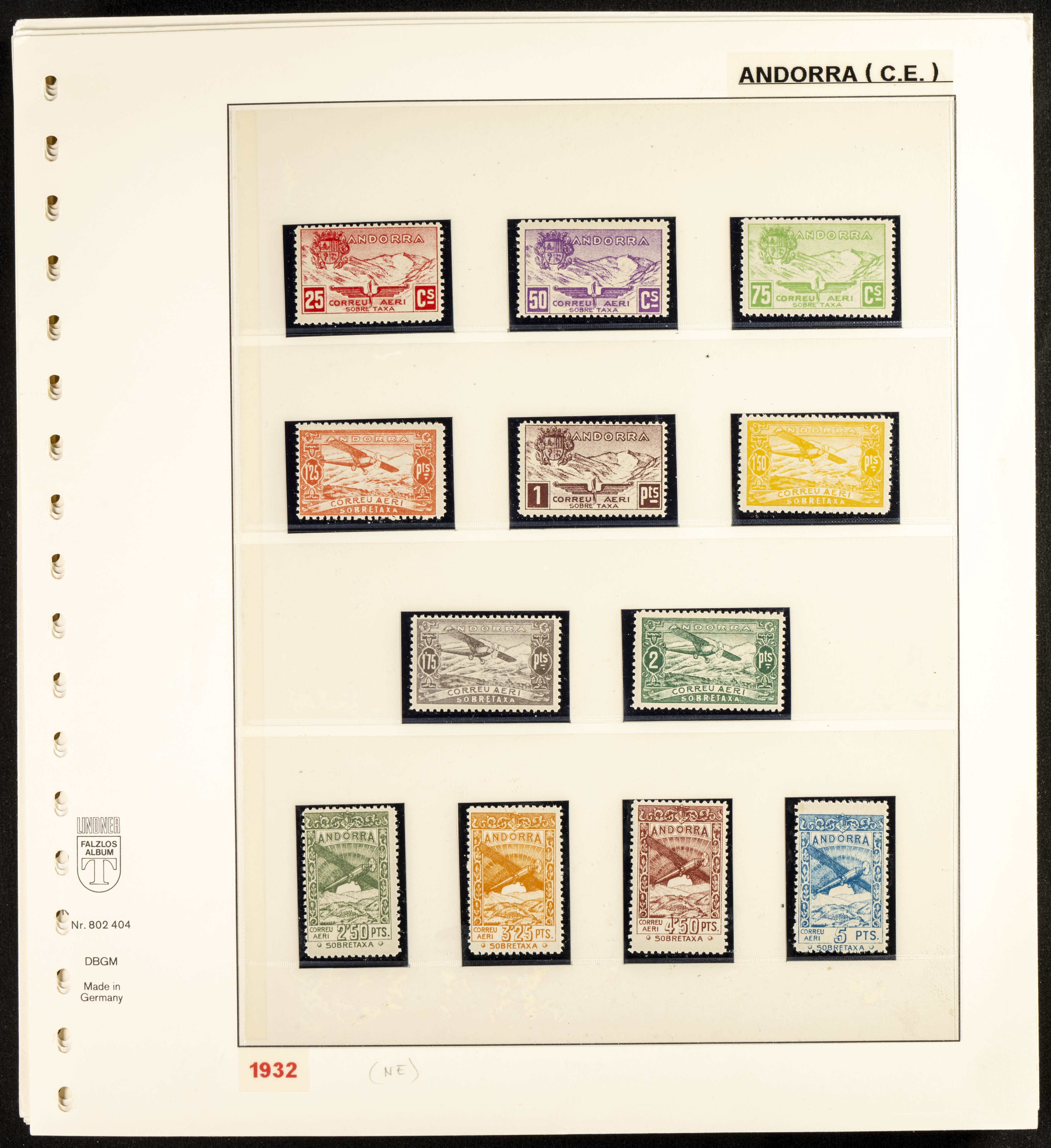 ★★/★(1875ca). Interesting collections of Spanish Andorra stamps between 1875 and 1989, in mint condition and practically complete except for the 1931 series (coarse perforation) and the 1935 series (unnumbered), and French Andorra stamps between 1931 and 1987, practically complete and mint except for the 1948 series and some other stamps of little value (includes fees). TO BE EXAMINED. Edifil 2026: +6,800 Euros