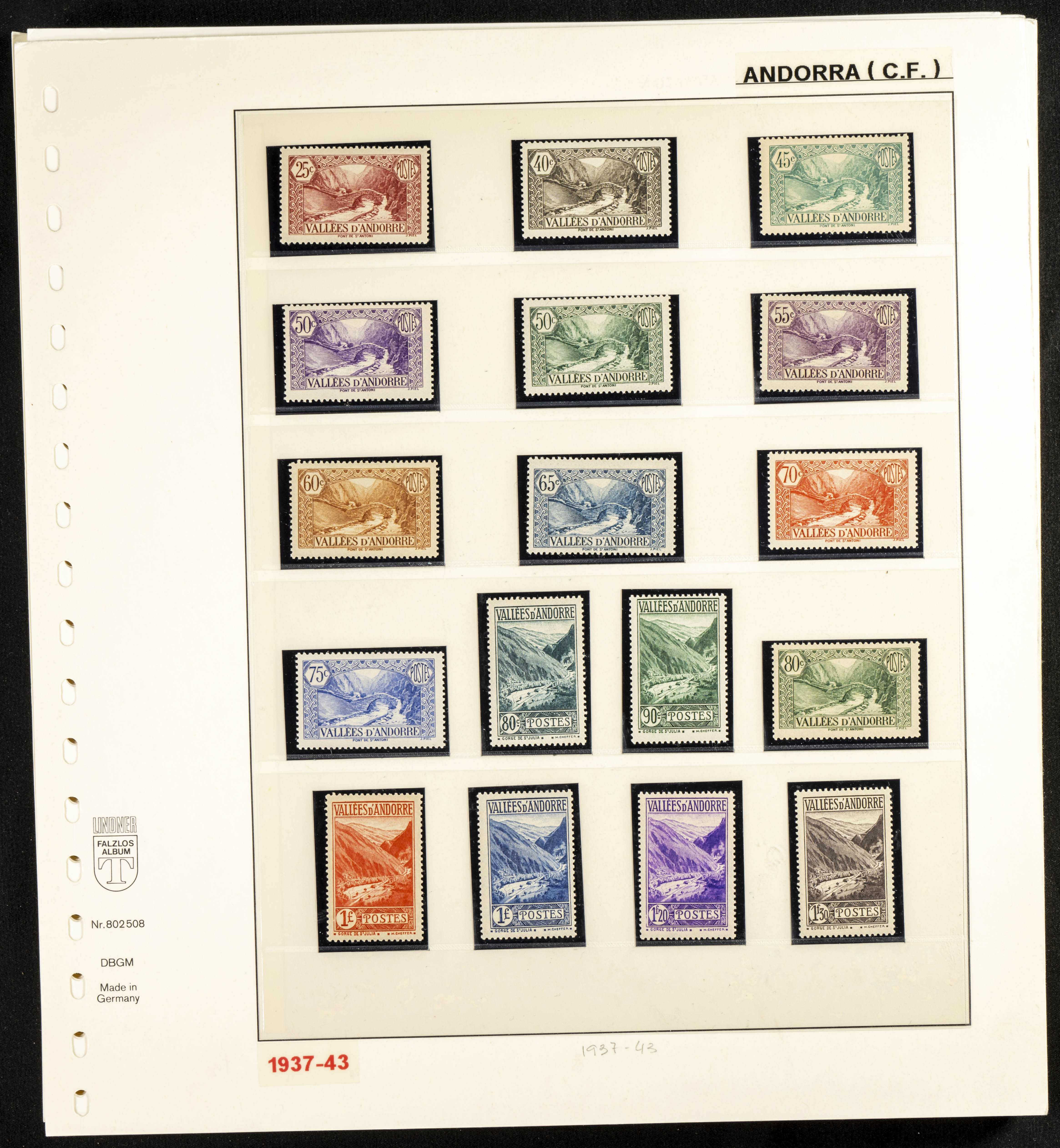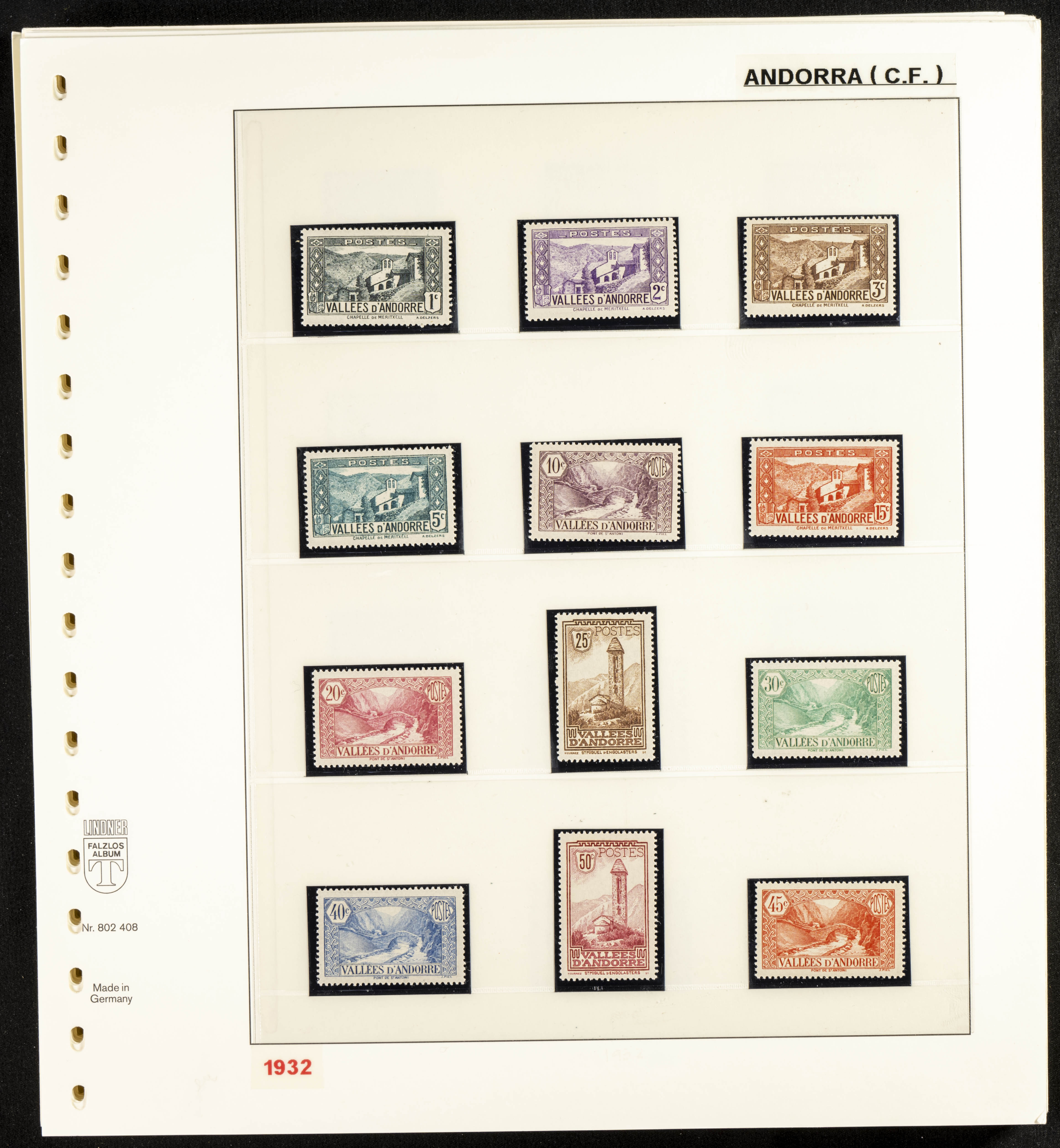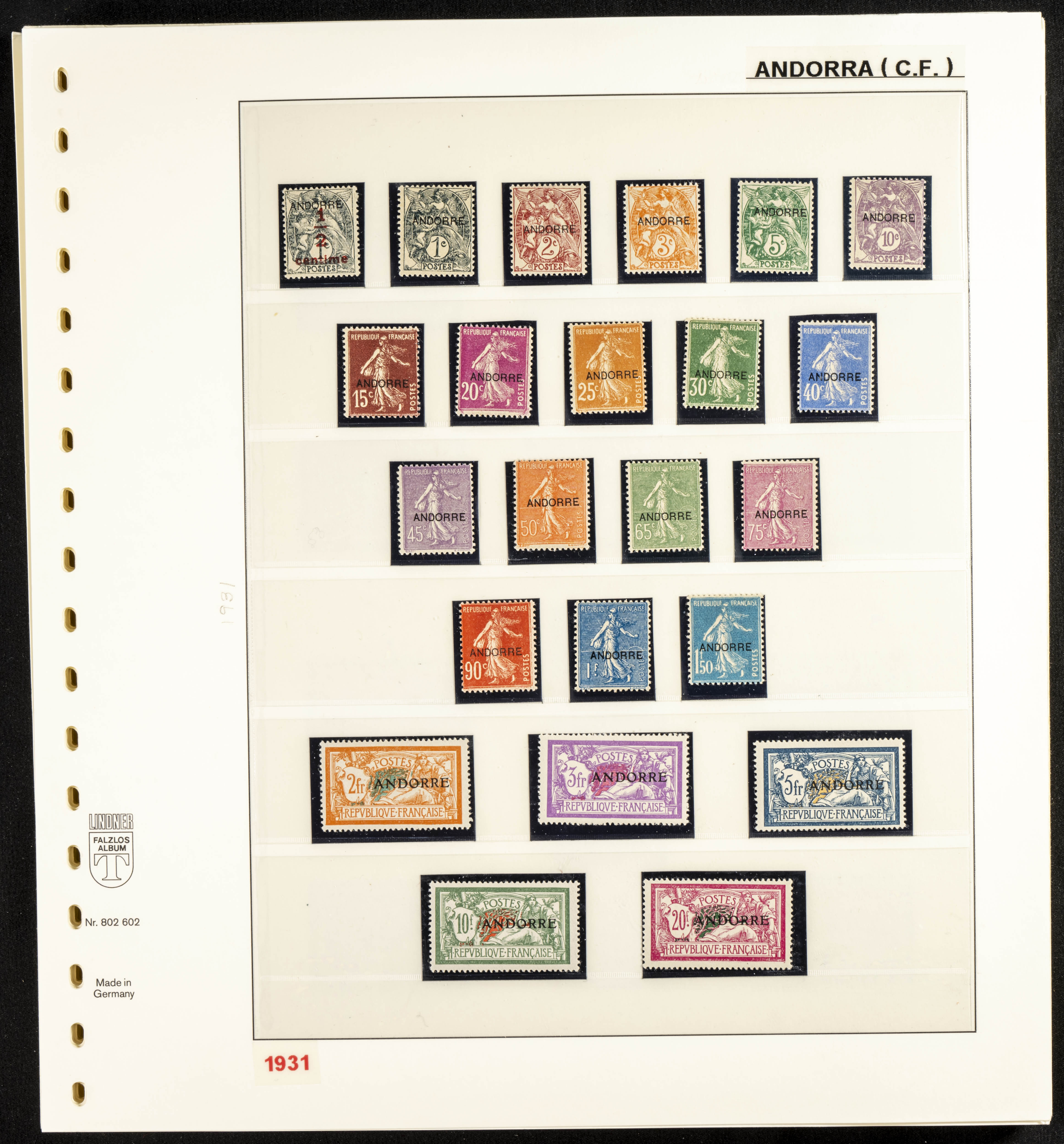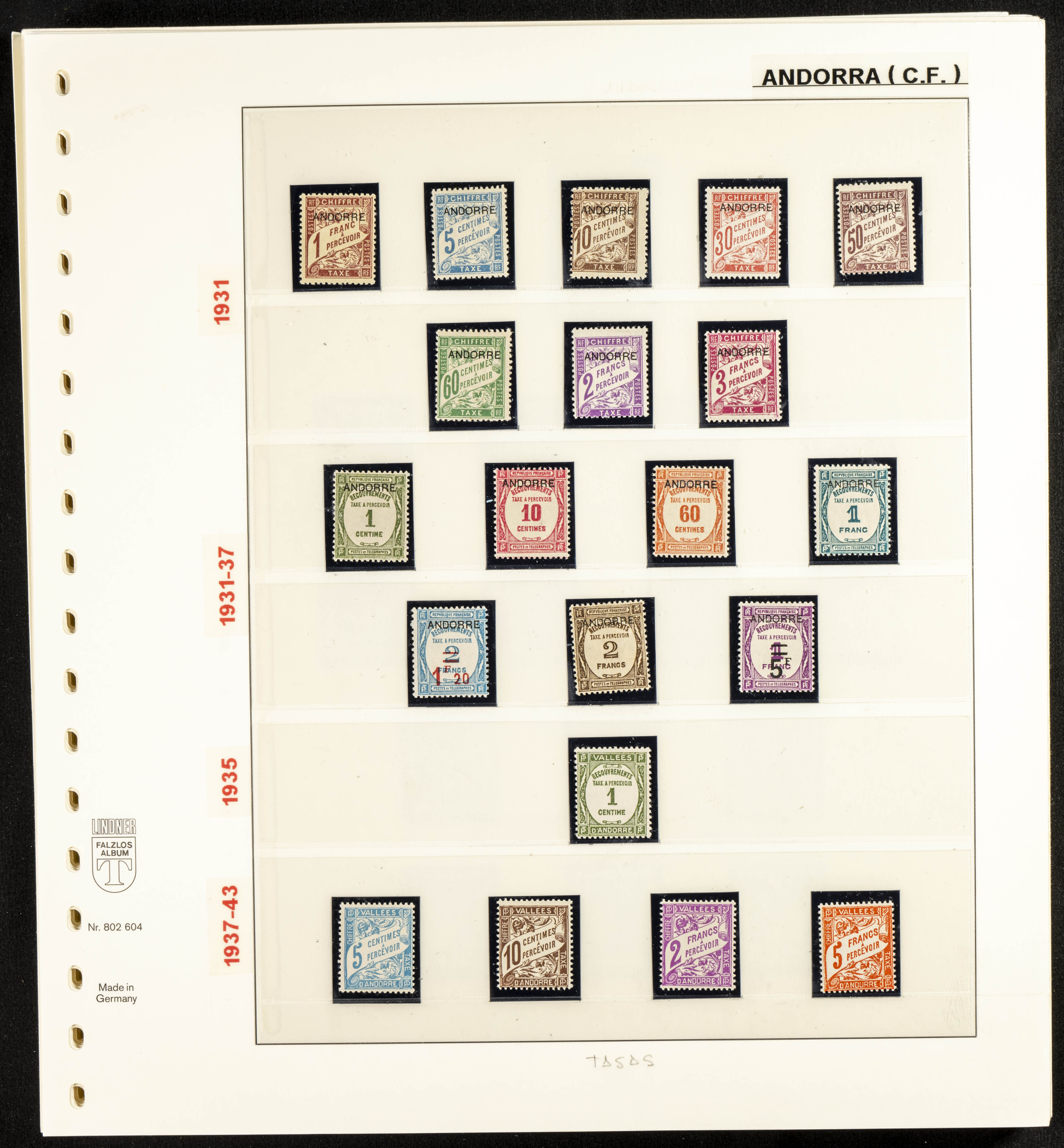 ★★/★(1875ca). Interesting collections of Spanish Andorra stamps between 1875 and 1989, in mint condition and practically complete except for the 1931 series (coarse perforation) and the 1935 series (unnumbered), and French Andorra stamps between 1931 and 1987, practically complete and mint except for the 1948 series and some other stamps of little value (includes fees). TO BE EXAMINED. Edifil 2026: +6,800 Euros
