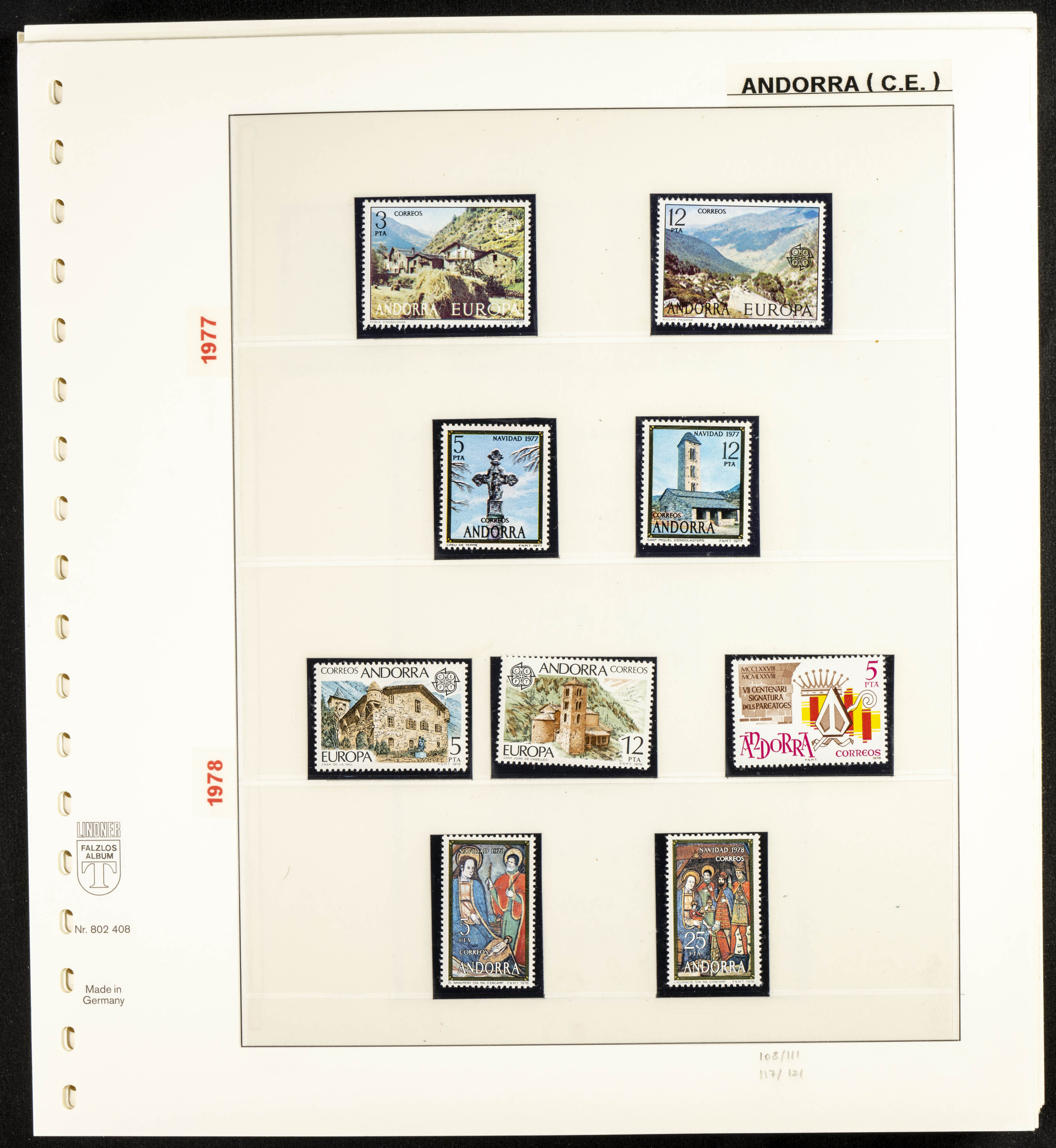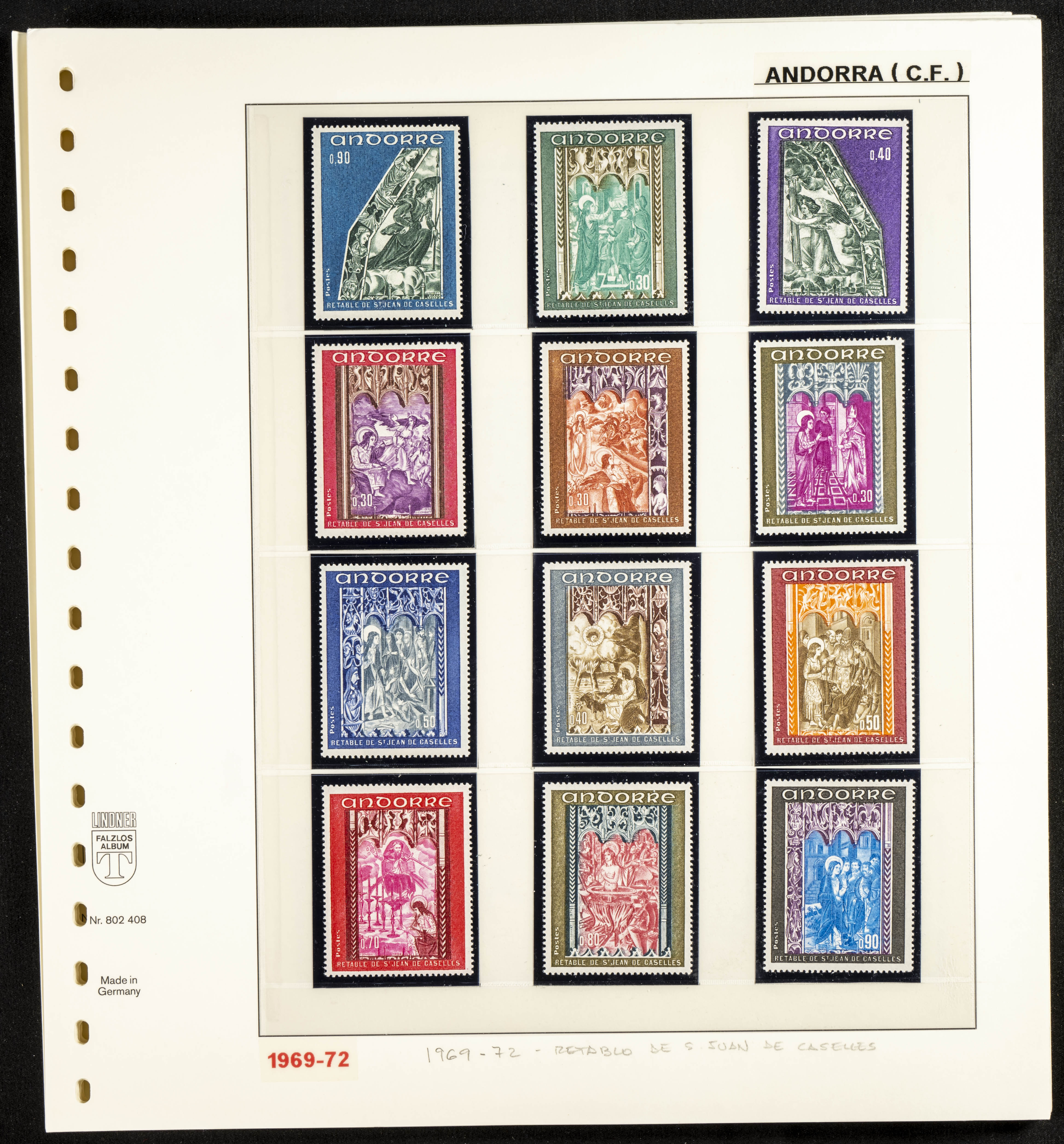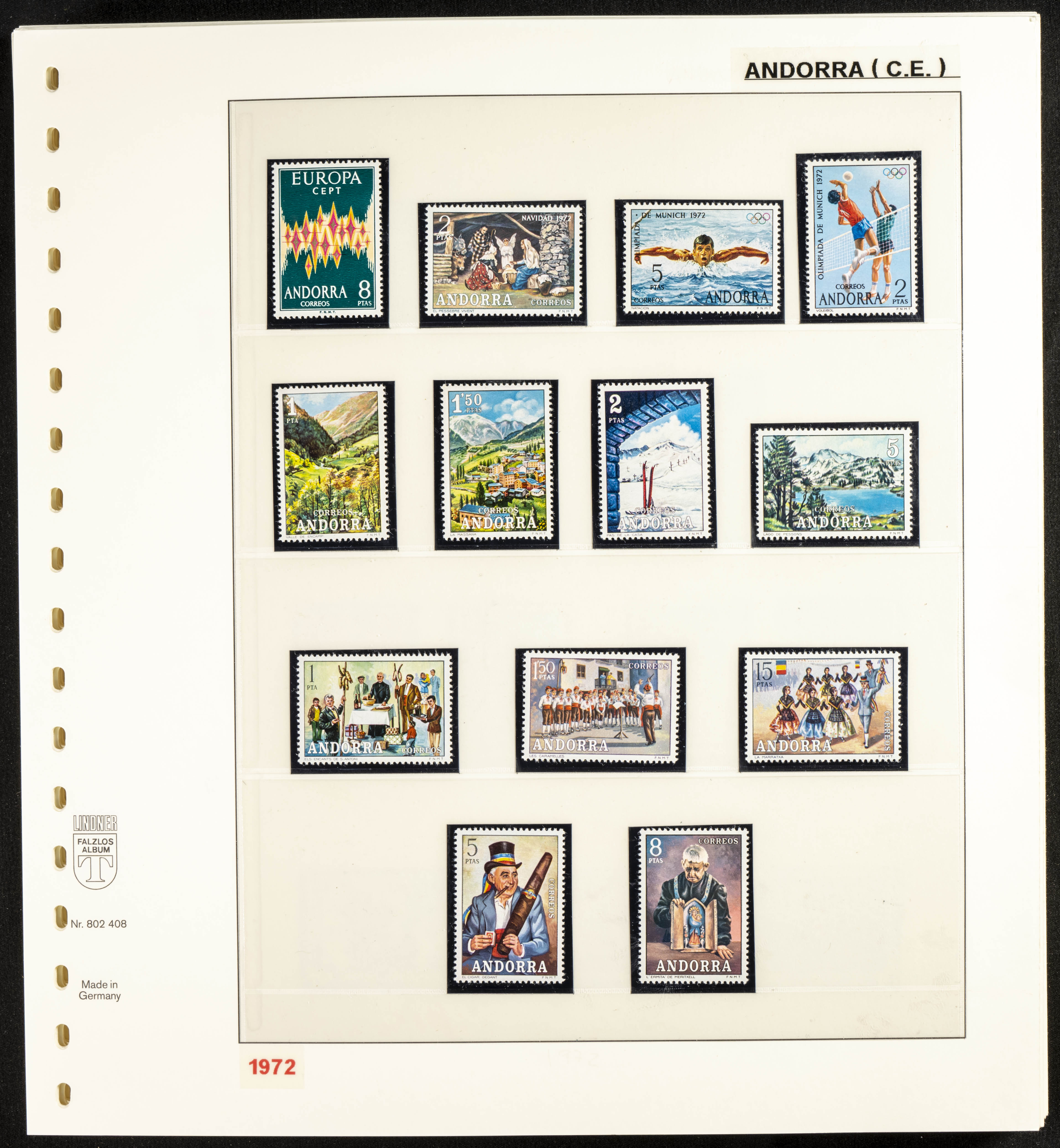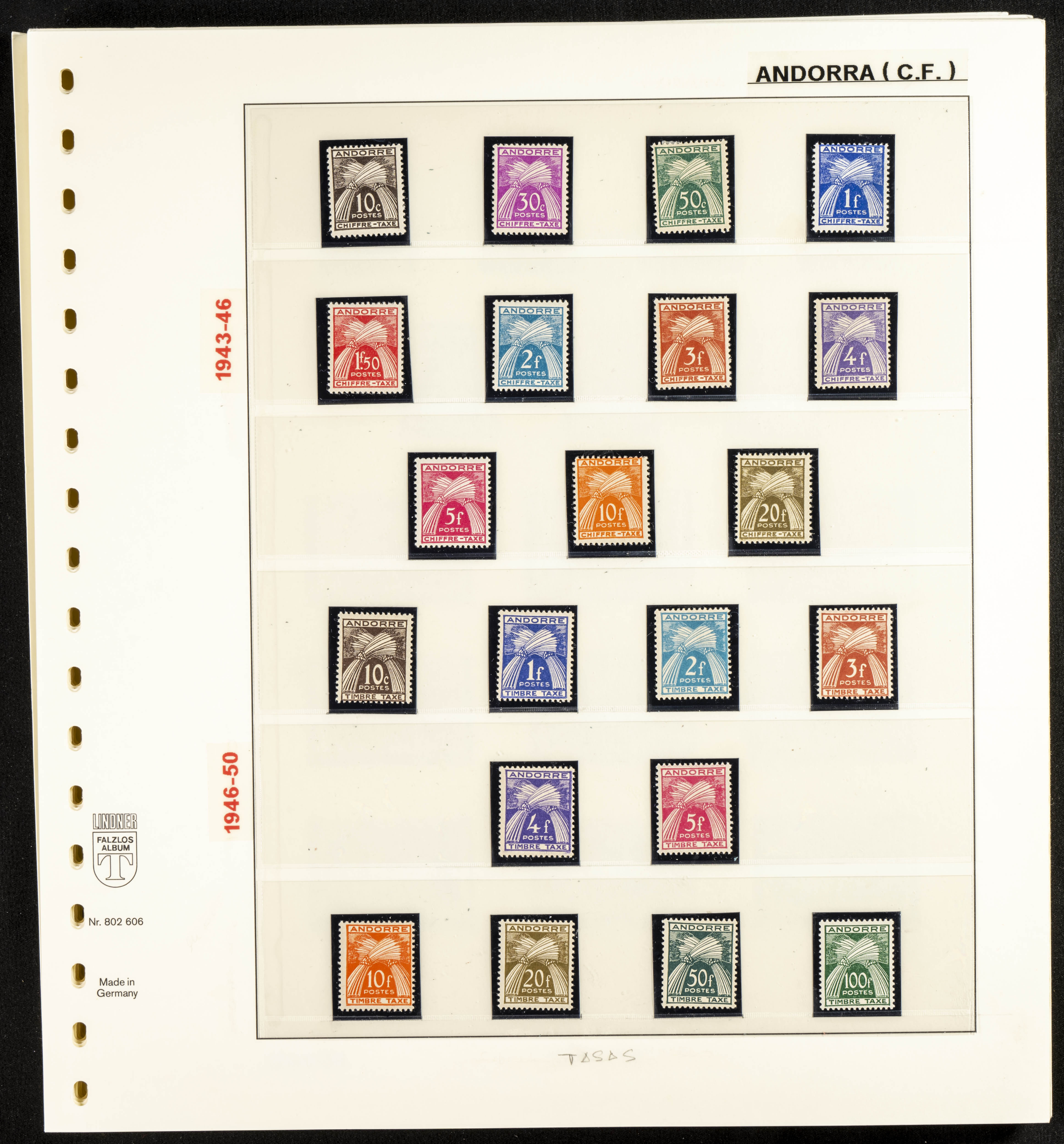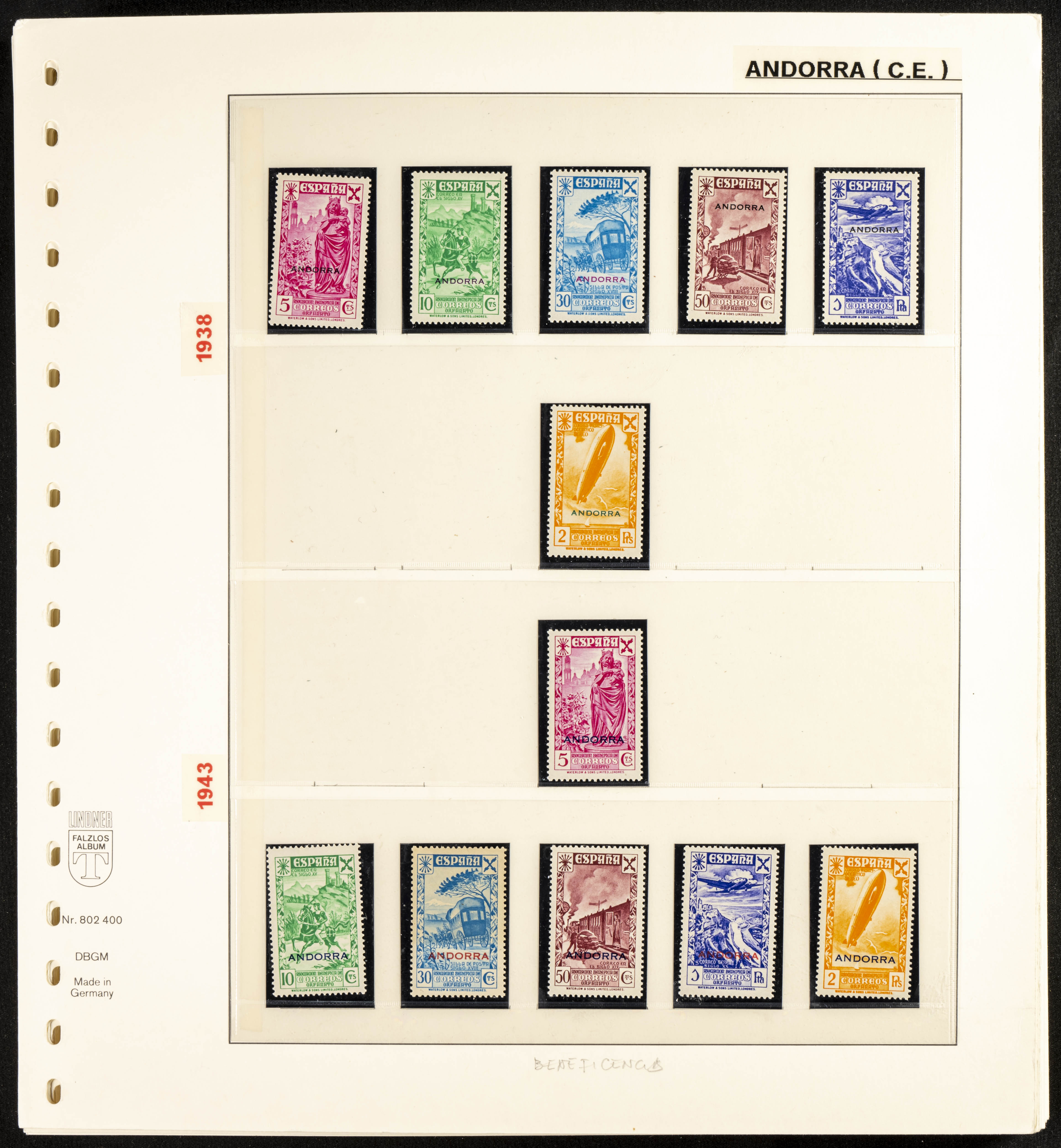 ★★/★(1875ca). Interesting collections of Spanish Andorra stamps between 1875 and 1989, in mint condition and practically complete except for the 1931 series (coarse perforation) and the 1935 series (unnumbered), and French Andorra stamps between 1931 and 1987, practically complete and mint except for the 1948 series and some other stamps of little value (includes fees). TO BE EXAMINED. Edifil 2026: +6,800 Euros