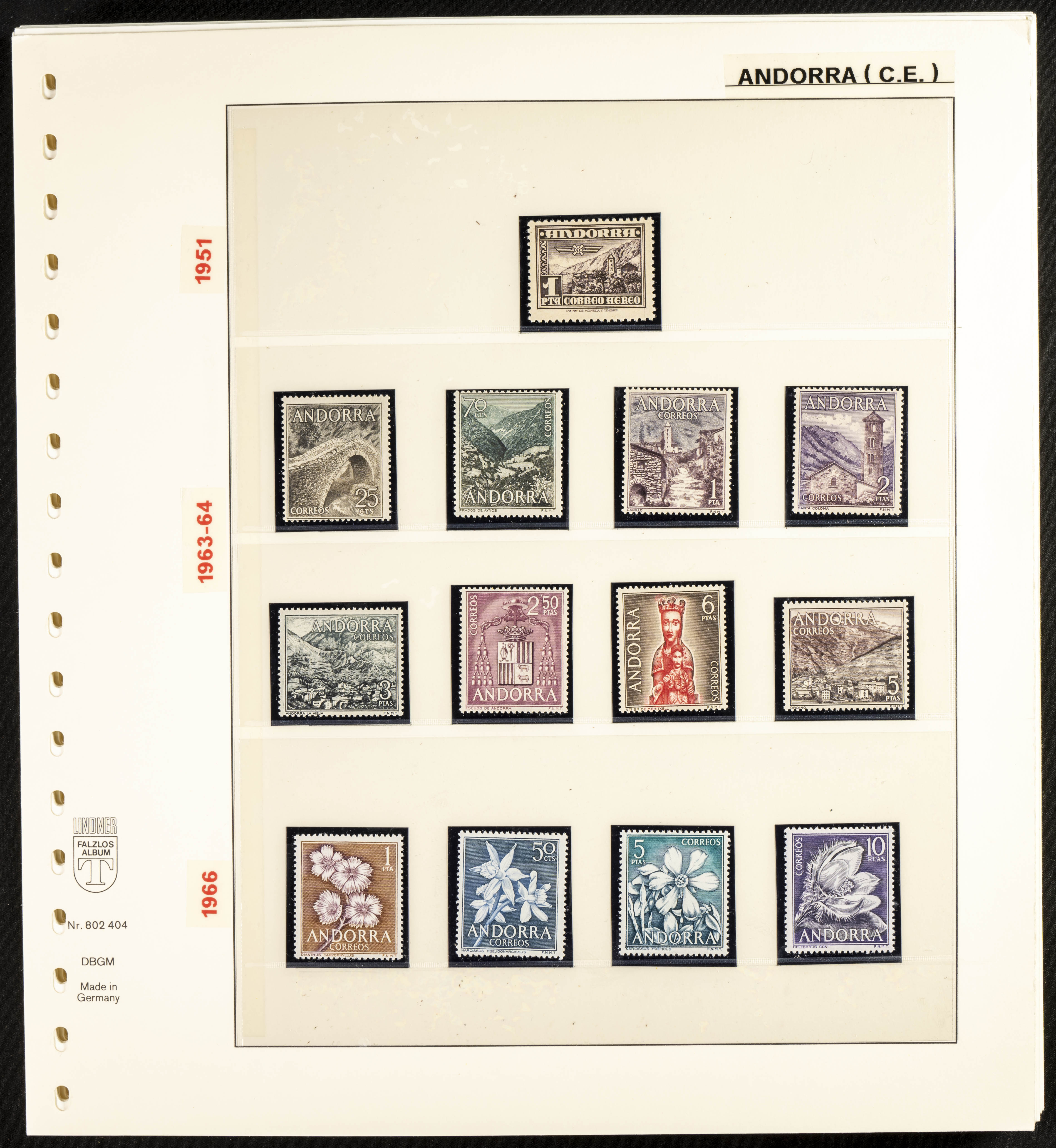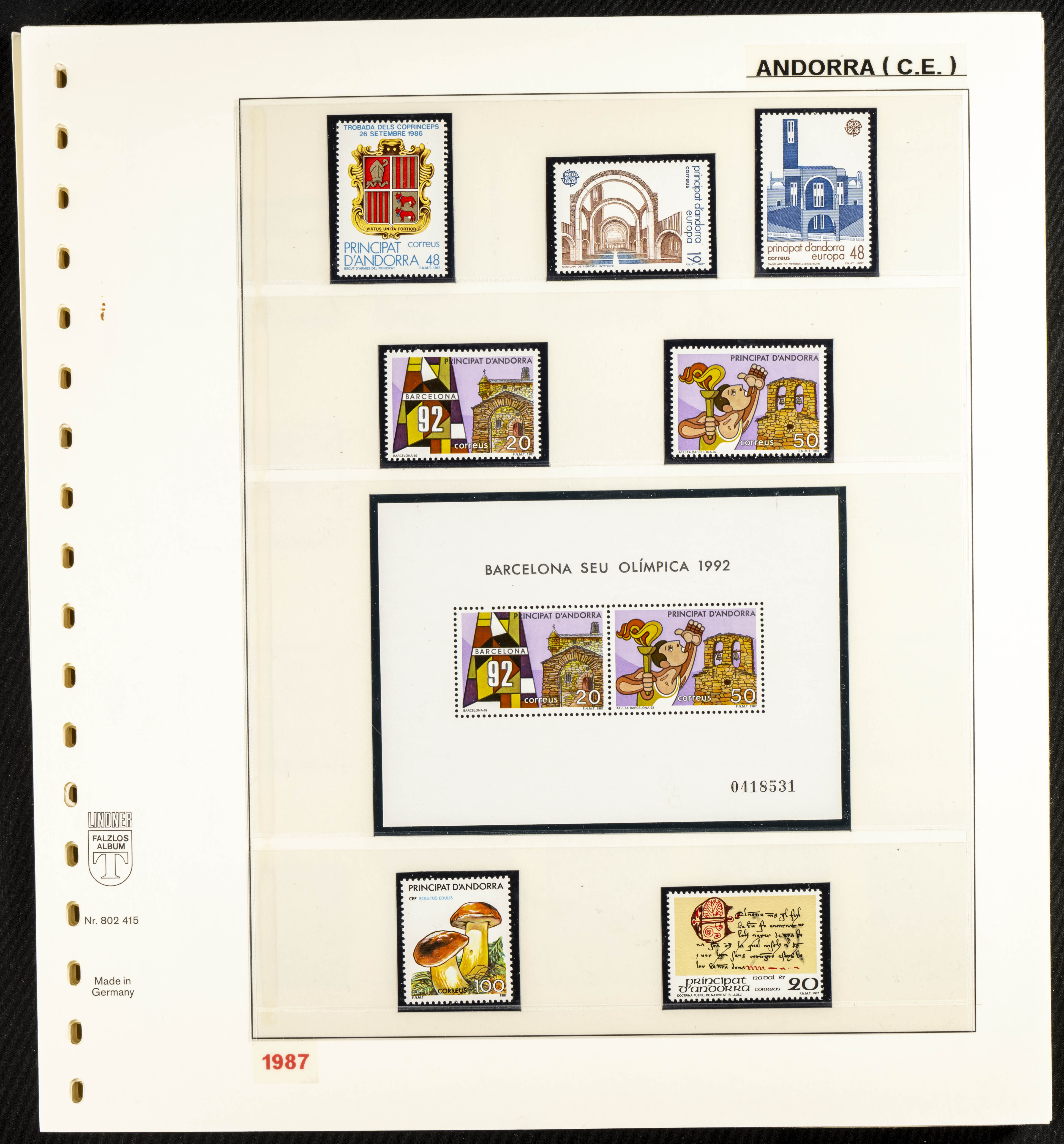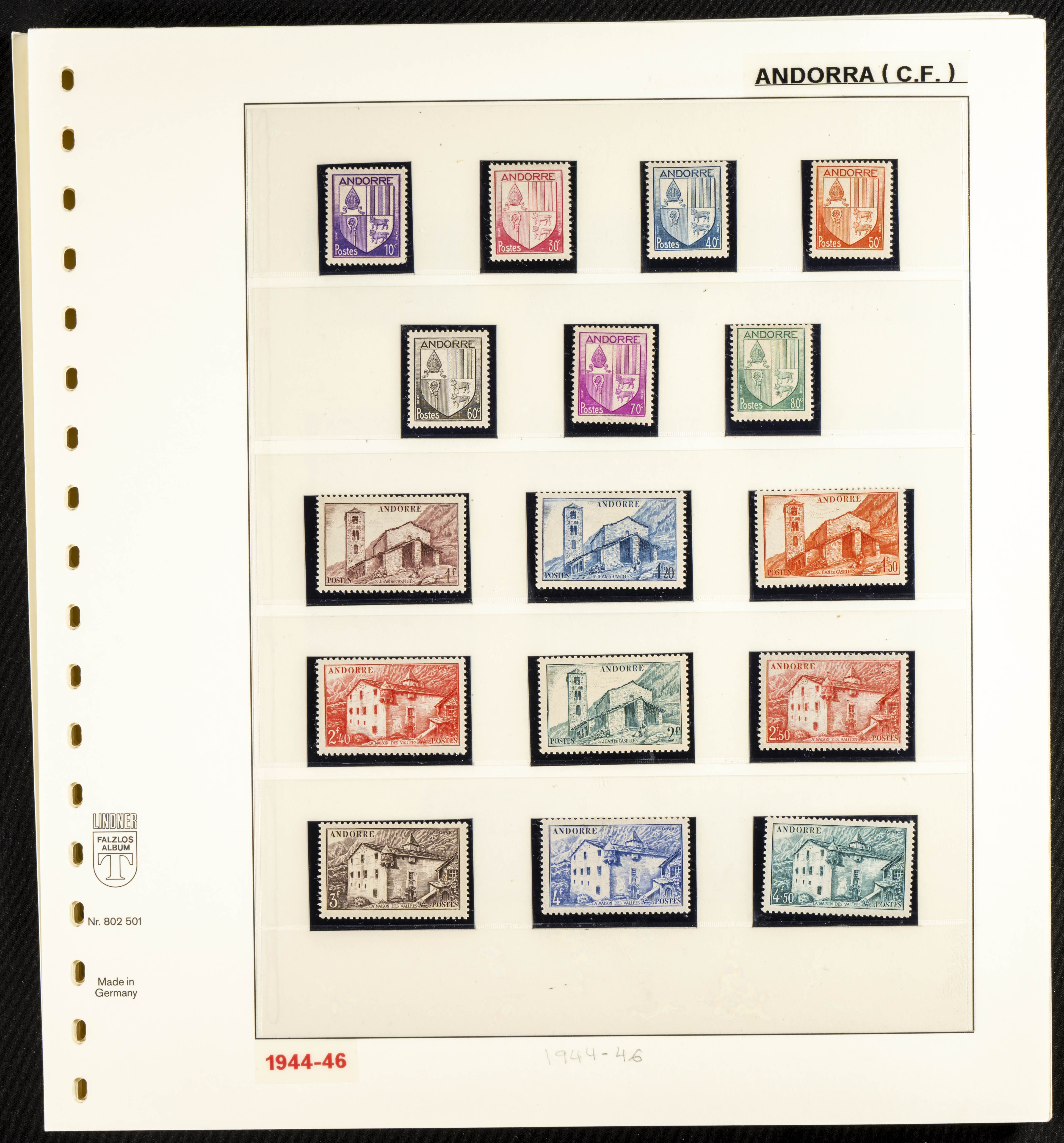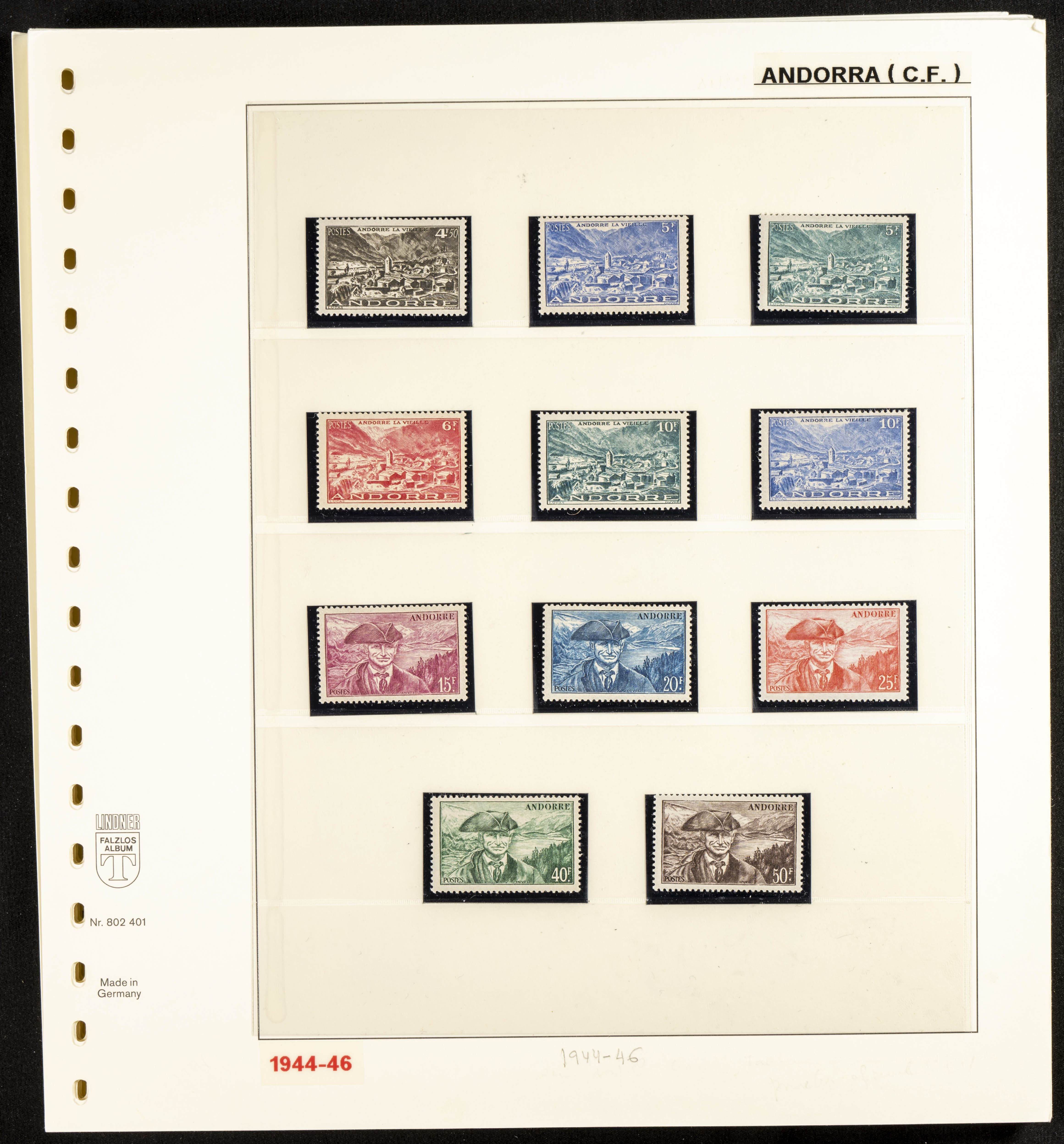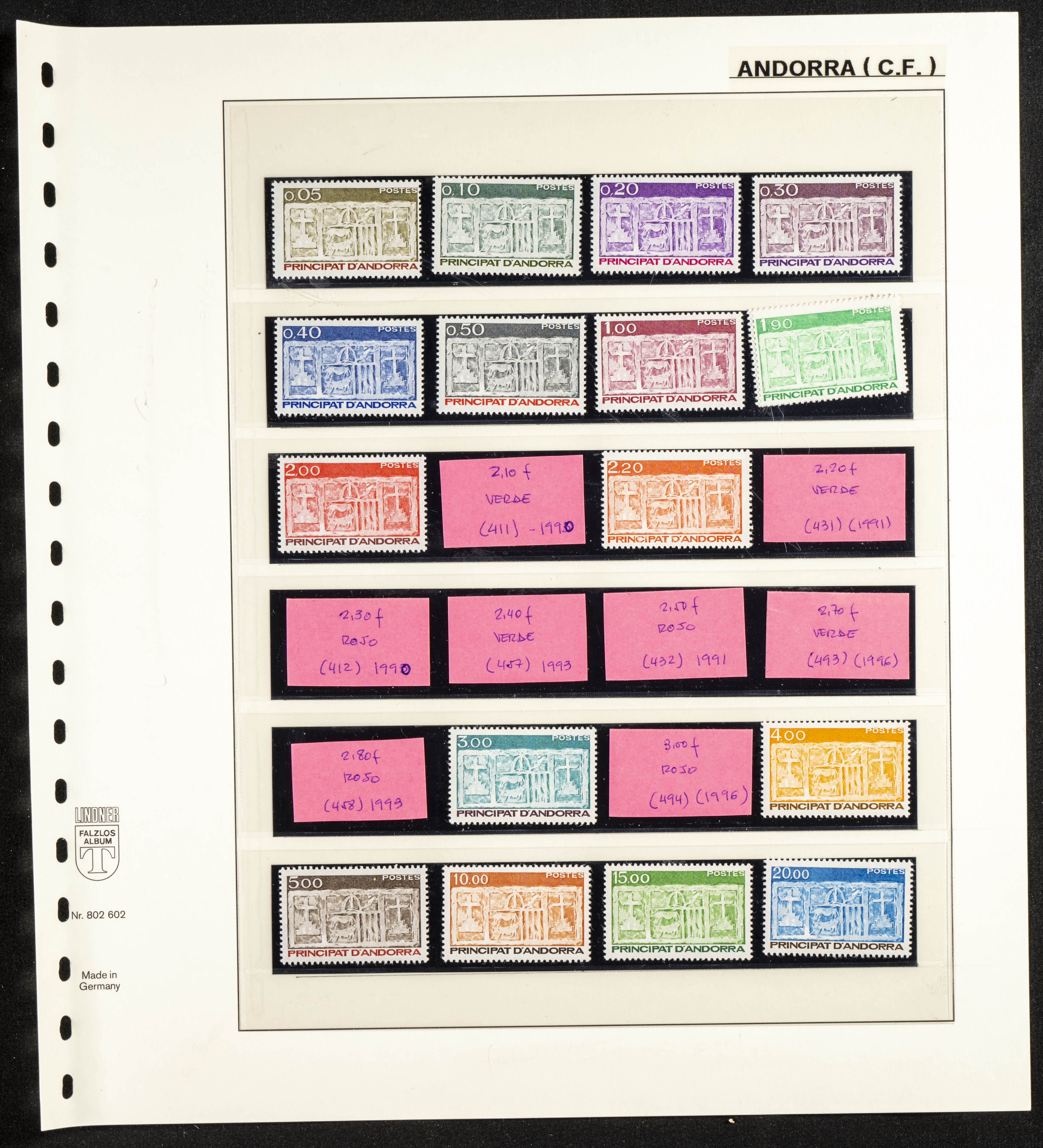 ★★/★(1875ca). Interesting collections of Spanish Andorra stamps between 1875 and 1989, in mint condition and practically complete except for the 1931 series (coarse perforation) and the 1935 series (unnumbered), and French Andorra stamps between 1931 and 1987, practically complete and mint except for the 1948 series and some other stamps of little value (includes fees). TO BE EXAMINED. Edifil 2026: +6,800 Euros