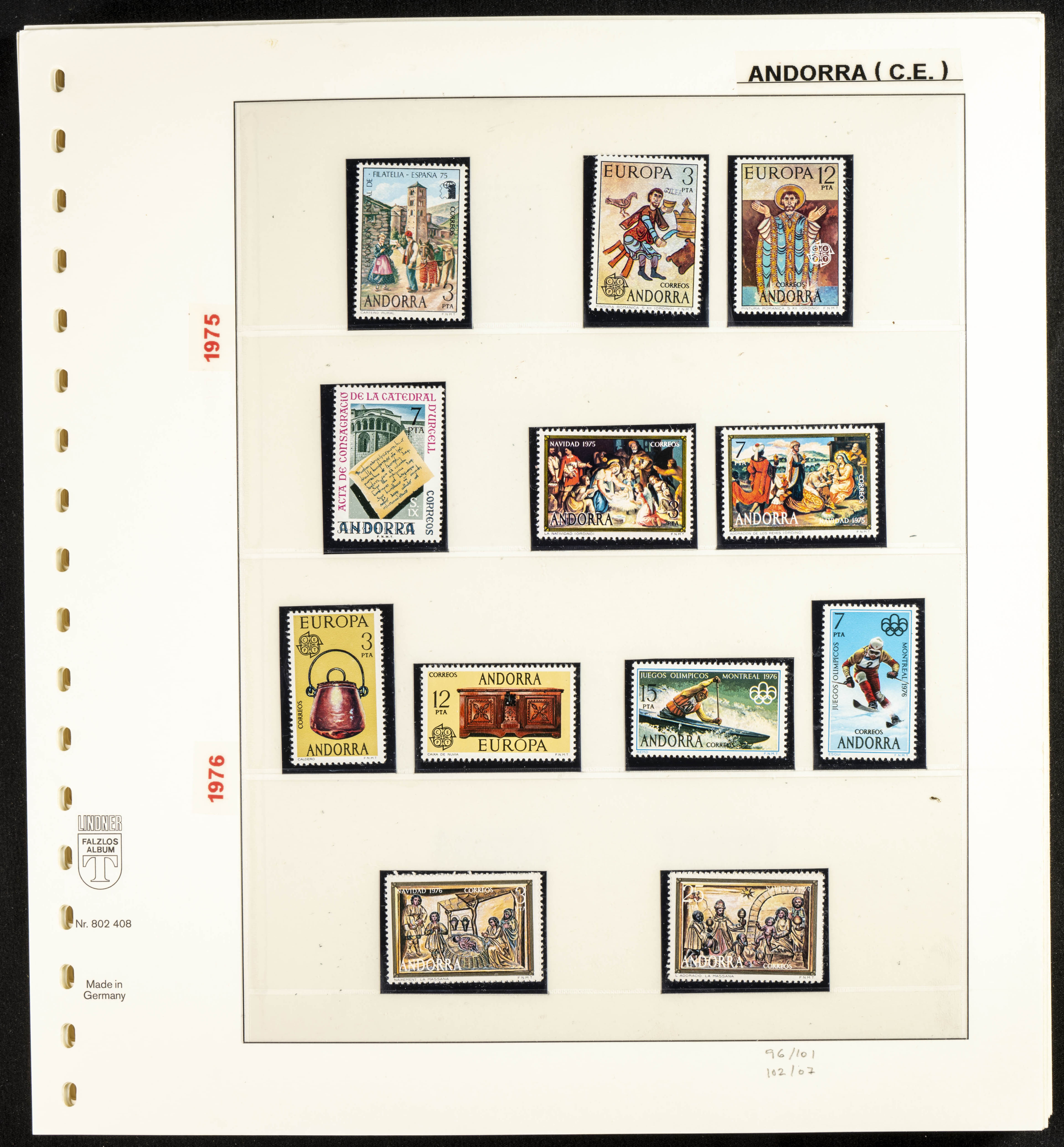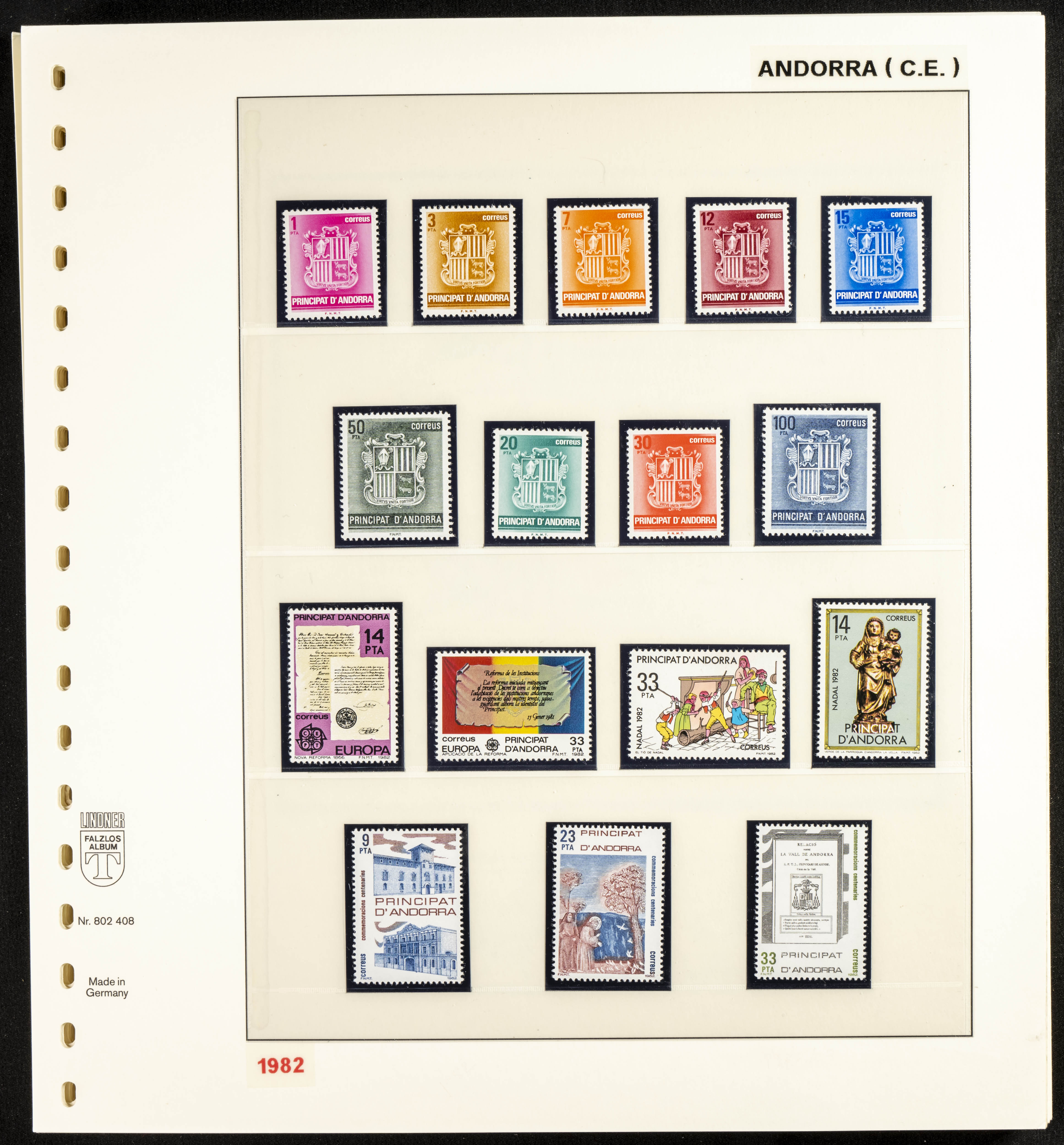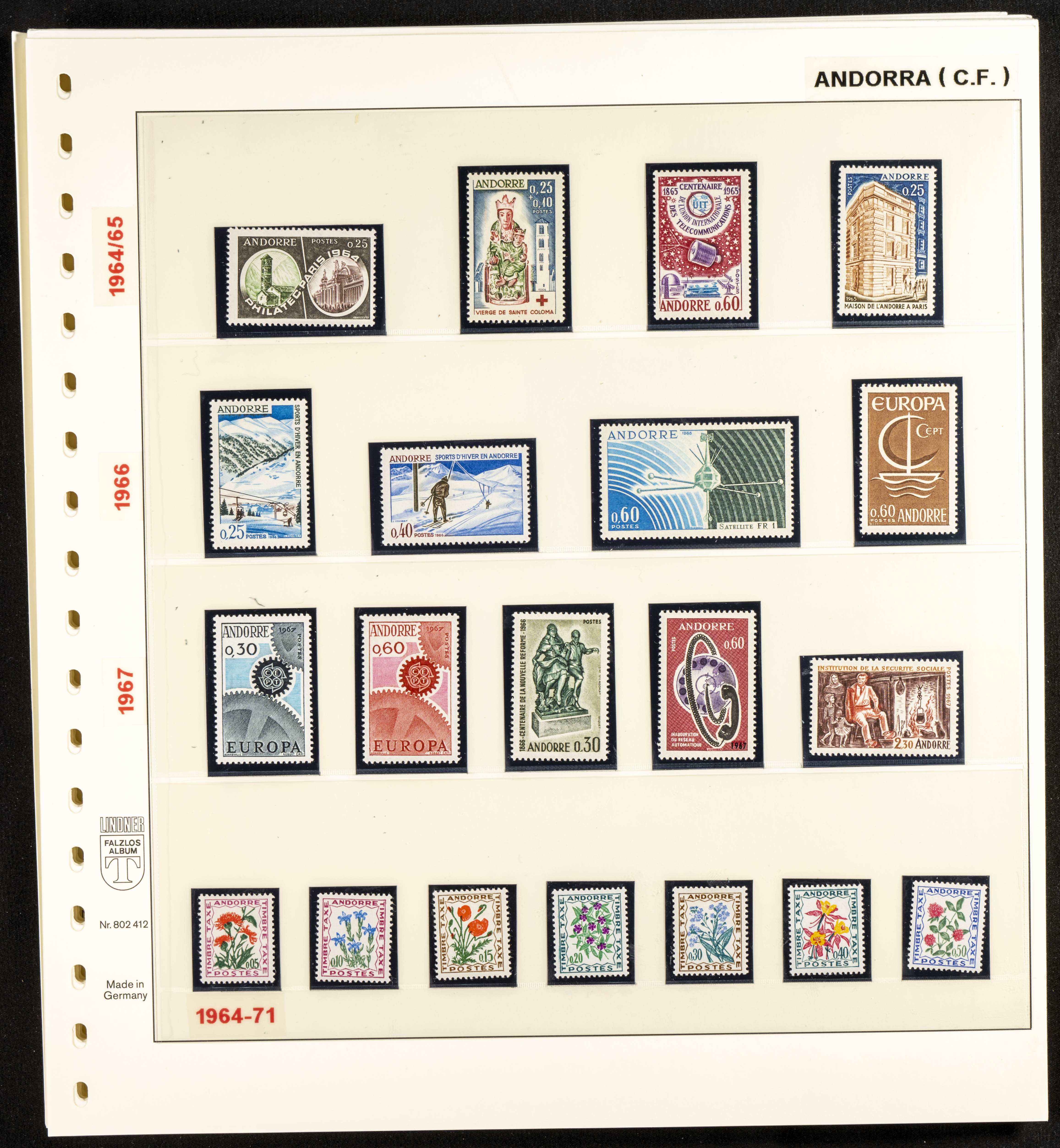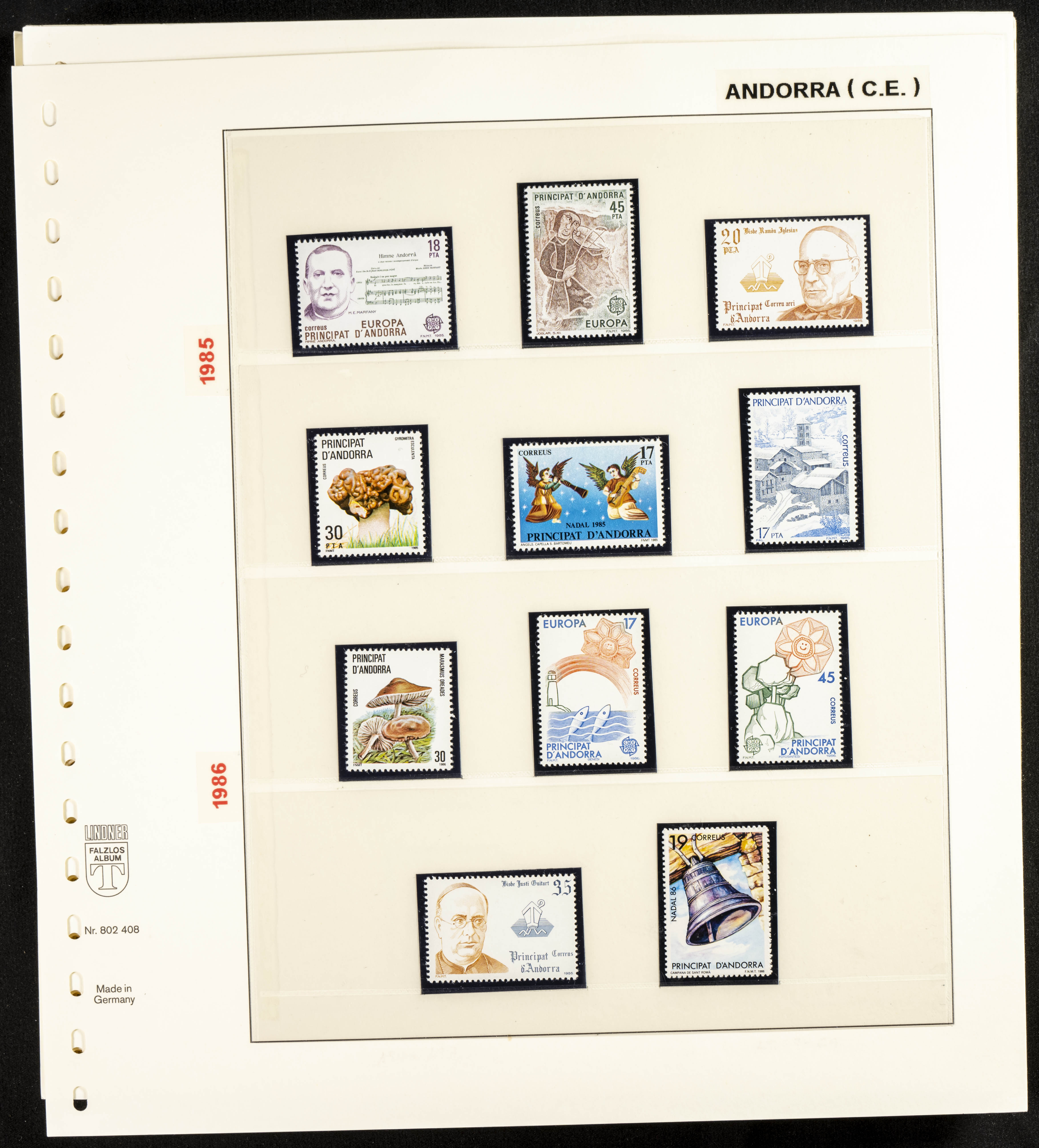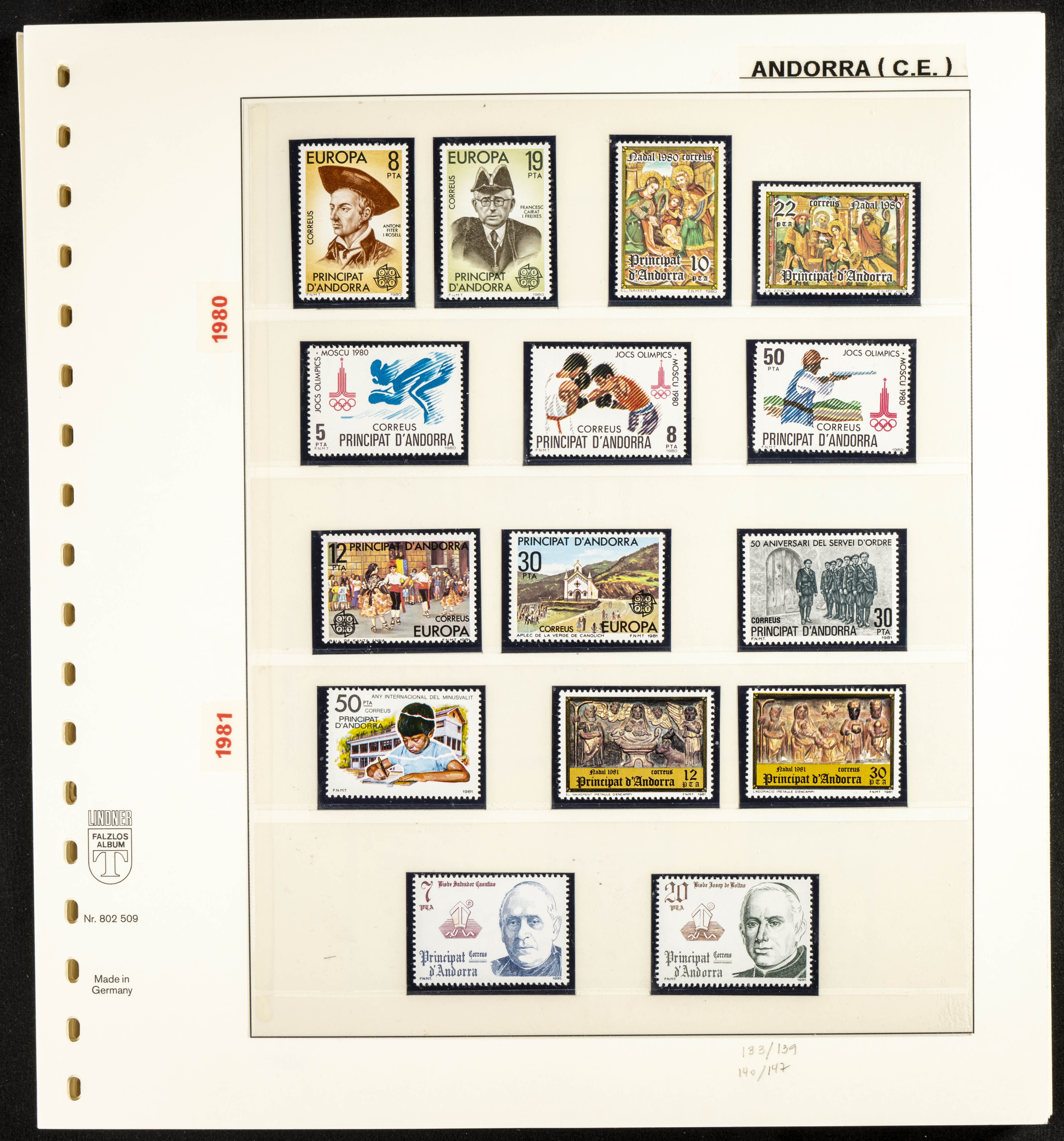 ★★/★(1875ca). Interesting collections of Spanish Andorra stamps between 1875 and 1989, in mint condition and practically complete except for the 1931 series (coarse perforation) and the 1935 series (unnumbered), and French Andorra stamps between 1931 and 1987, practically complete and mint except for the 1948 series and some other stamps of little value (includes fees). TO BE EXAMINED. Edifil 2026: +6,800 Euros