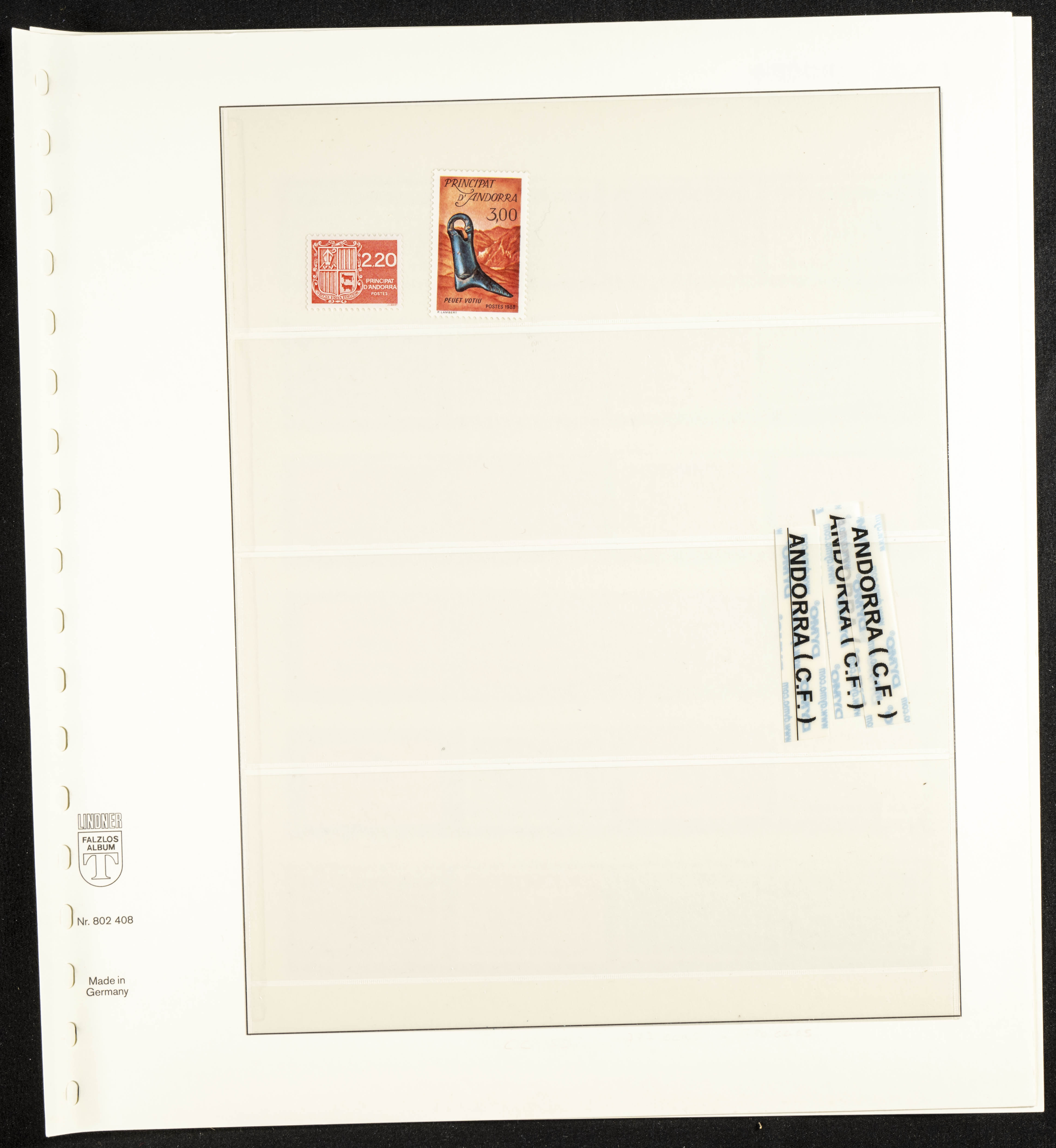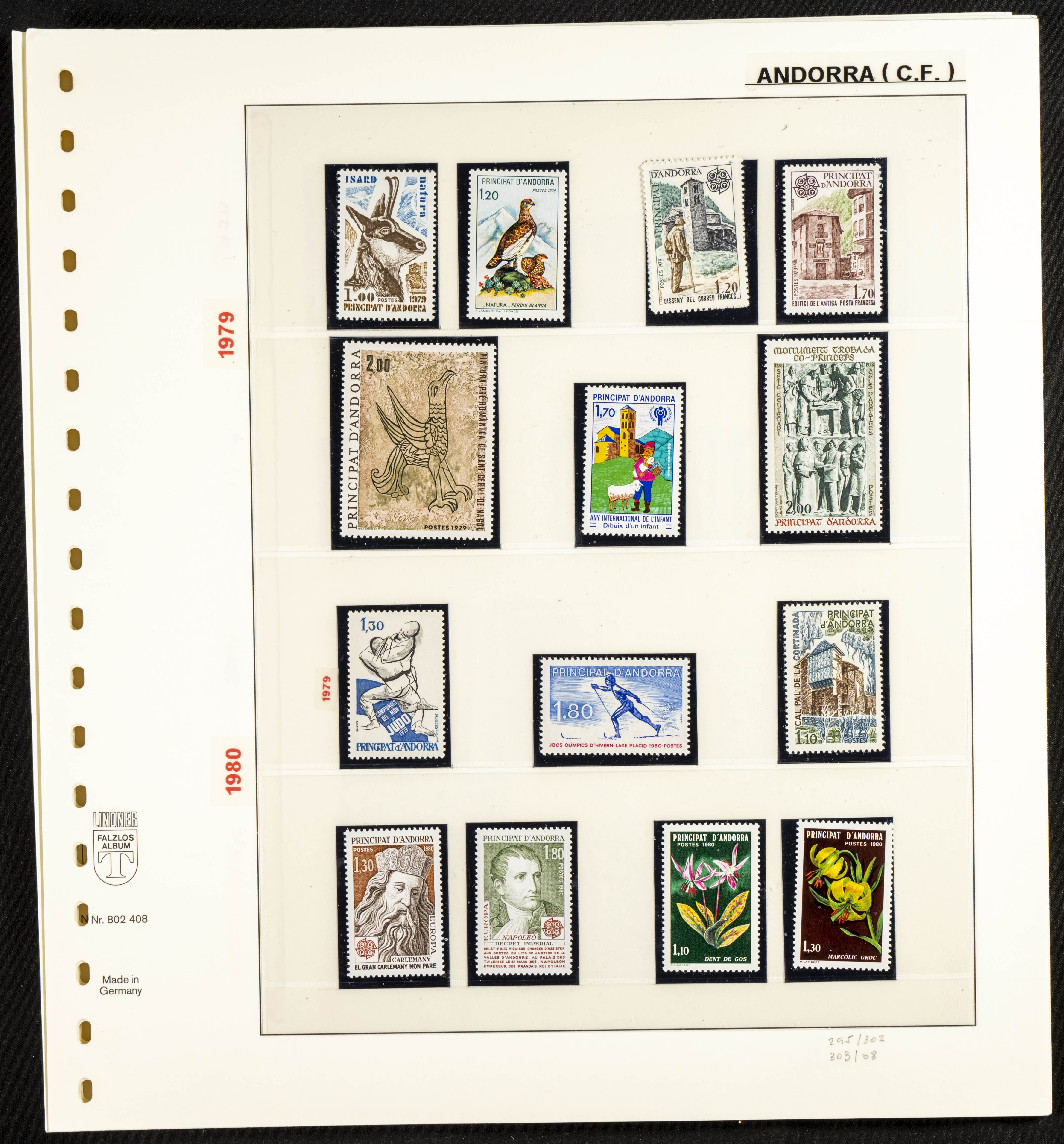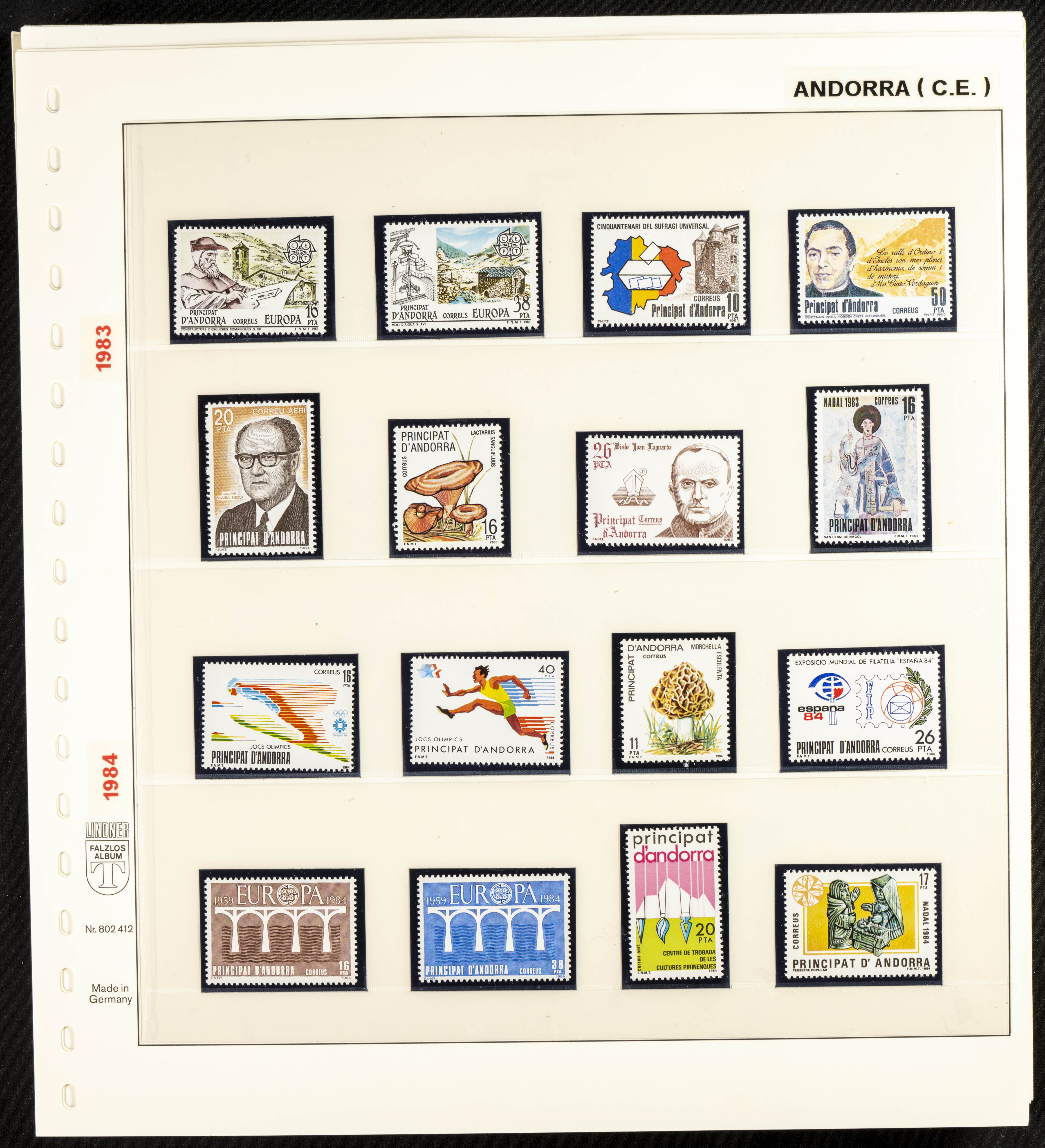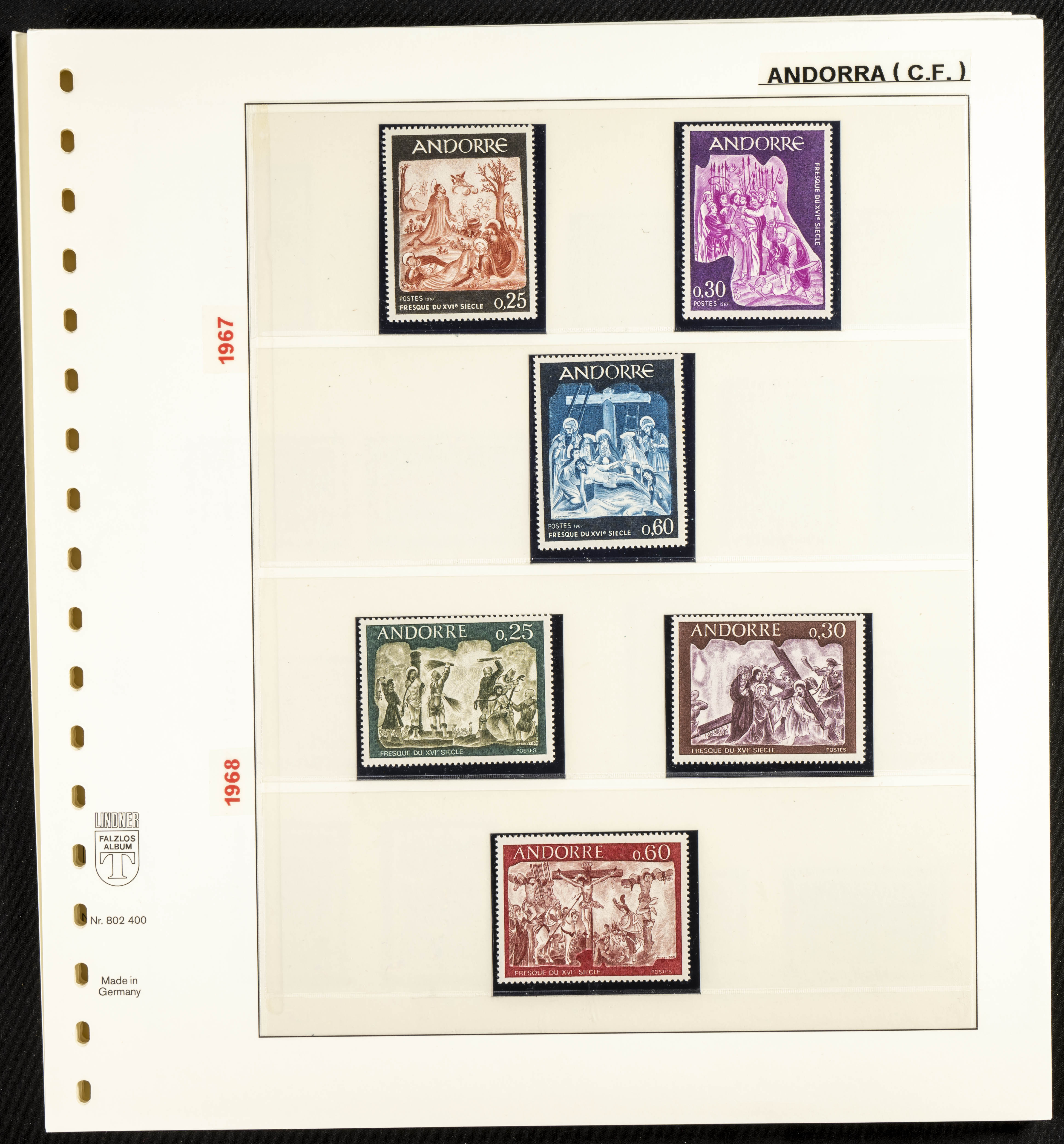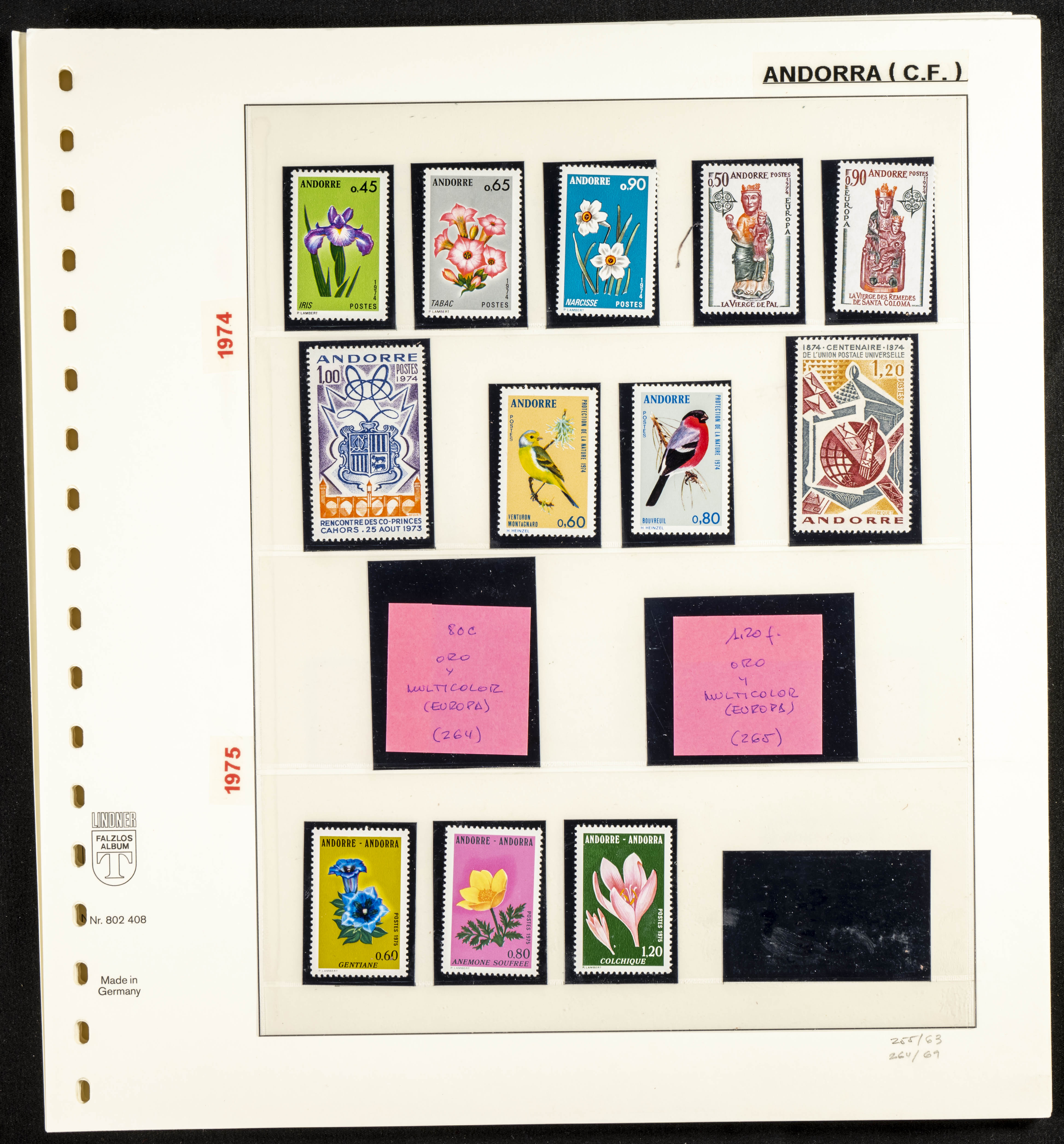 ★★/★(1875ca). Interesting collections of Spanish Andorra stamps between 1875 and 1989, in mint condition and practically complete except for the 1931 series (coarse perforation) and the 1935 series (unnumbered), and French Andorra stamps between 1931 and 1987, practically complete and mint except for the 1948 series and some other stamps of little value (includes fees). TO BE EXAMINED. Edifil 2026: +6,800 Euros