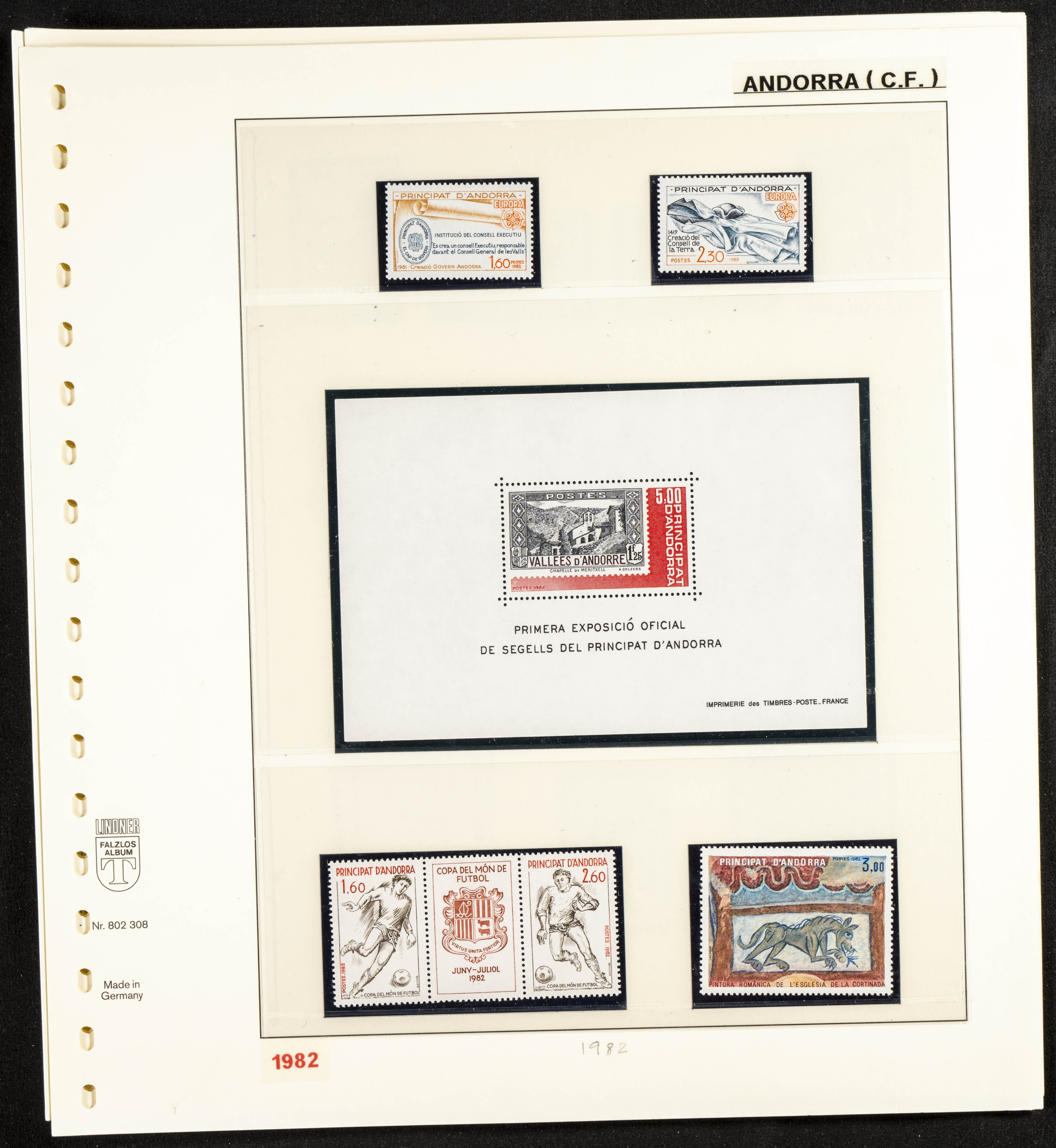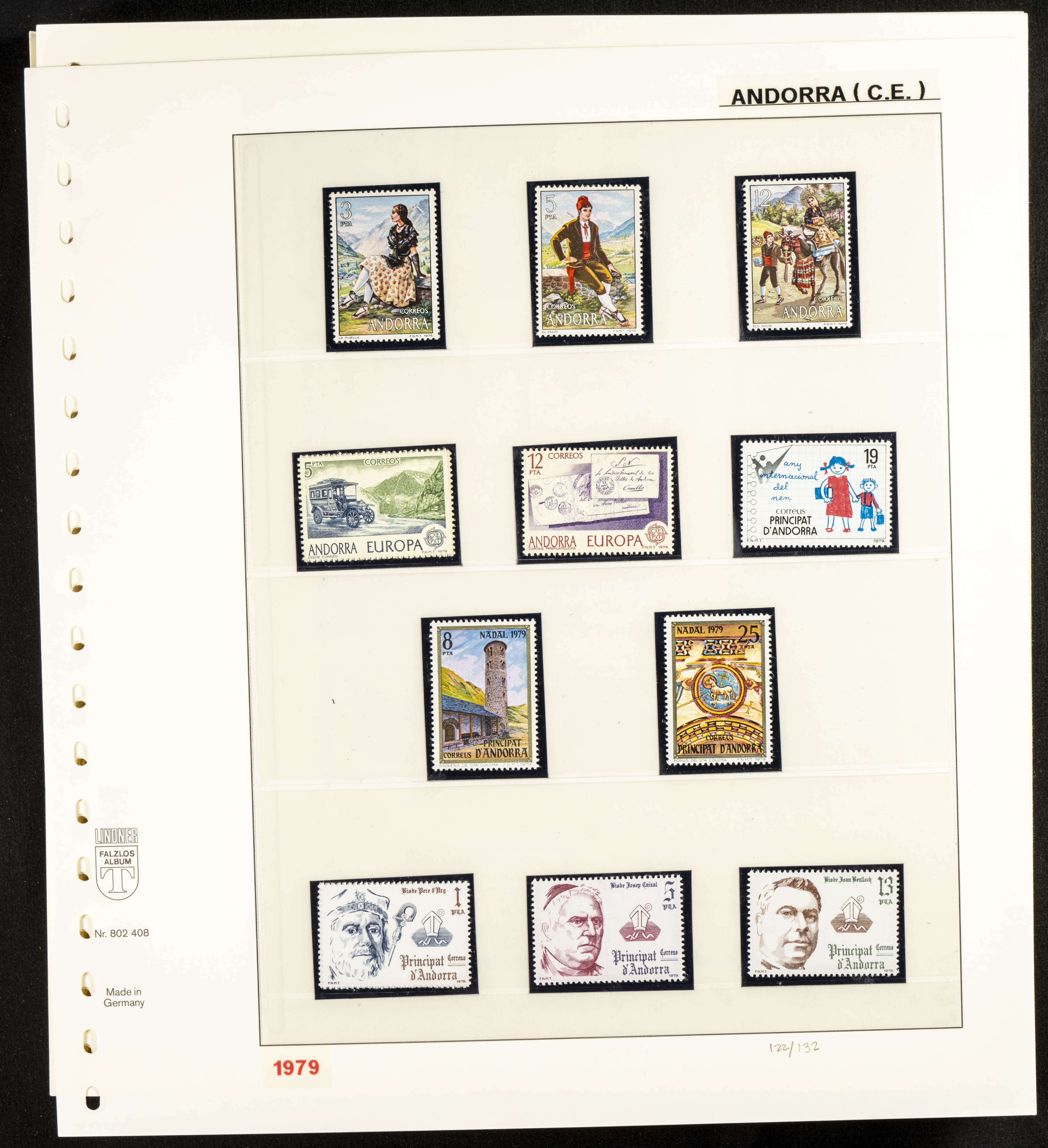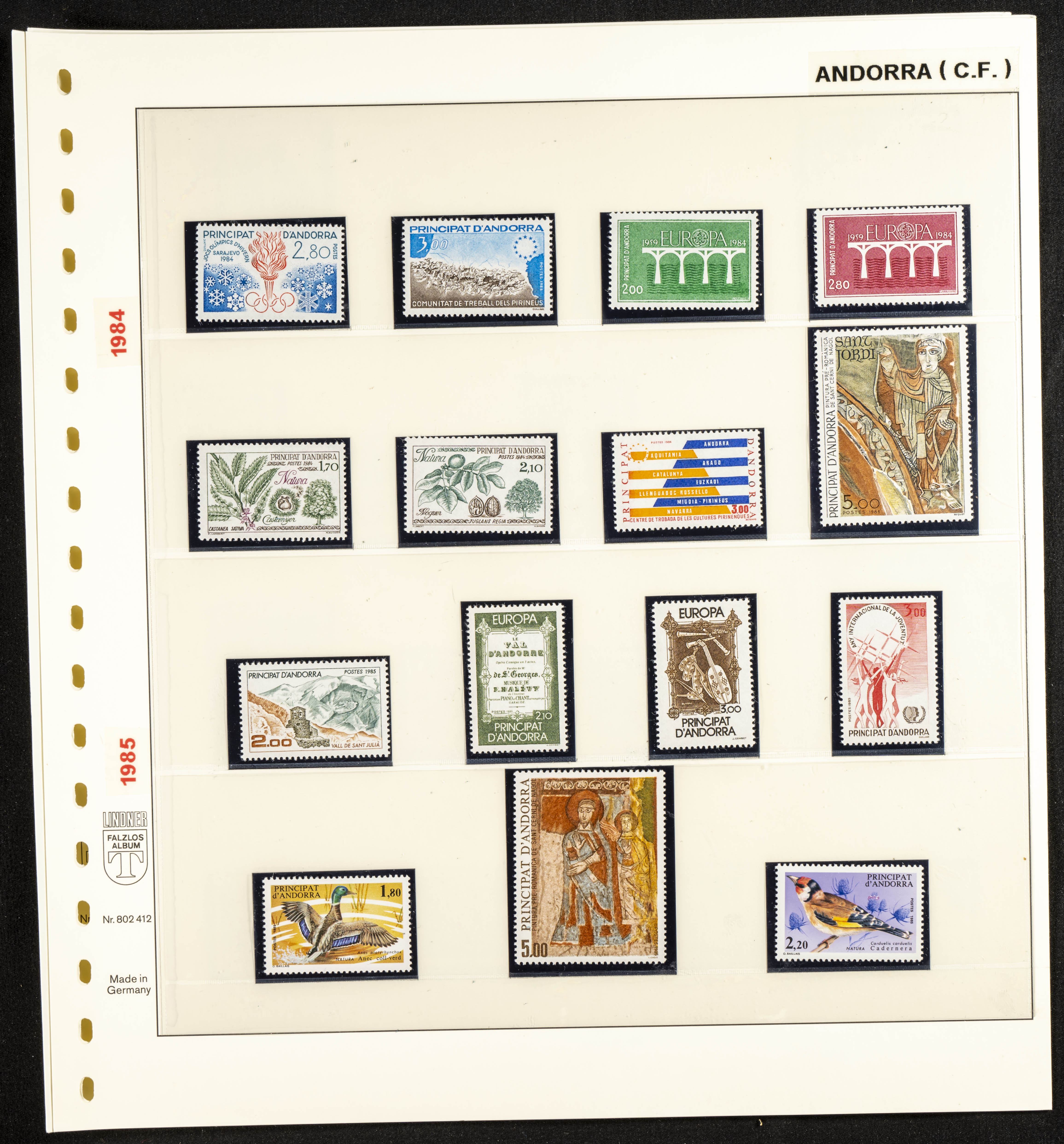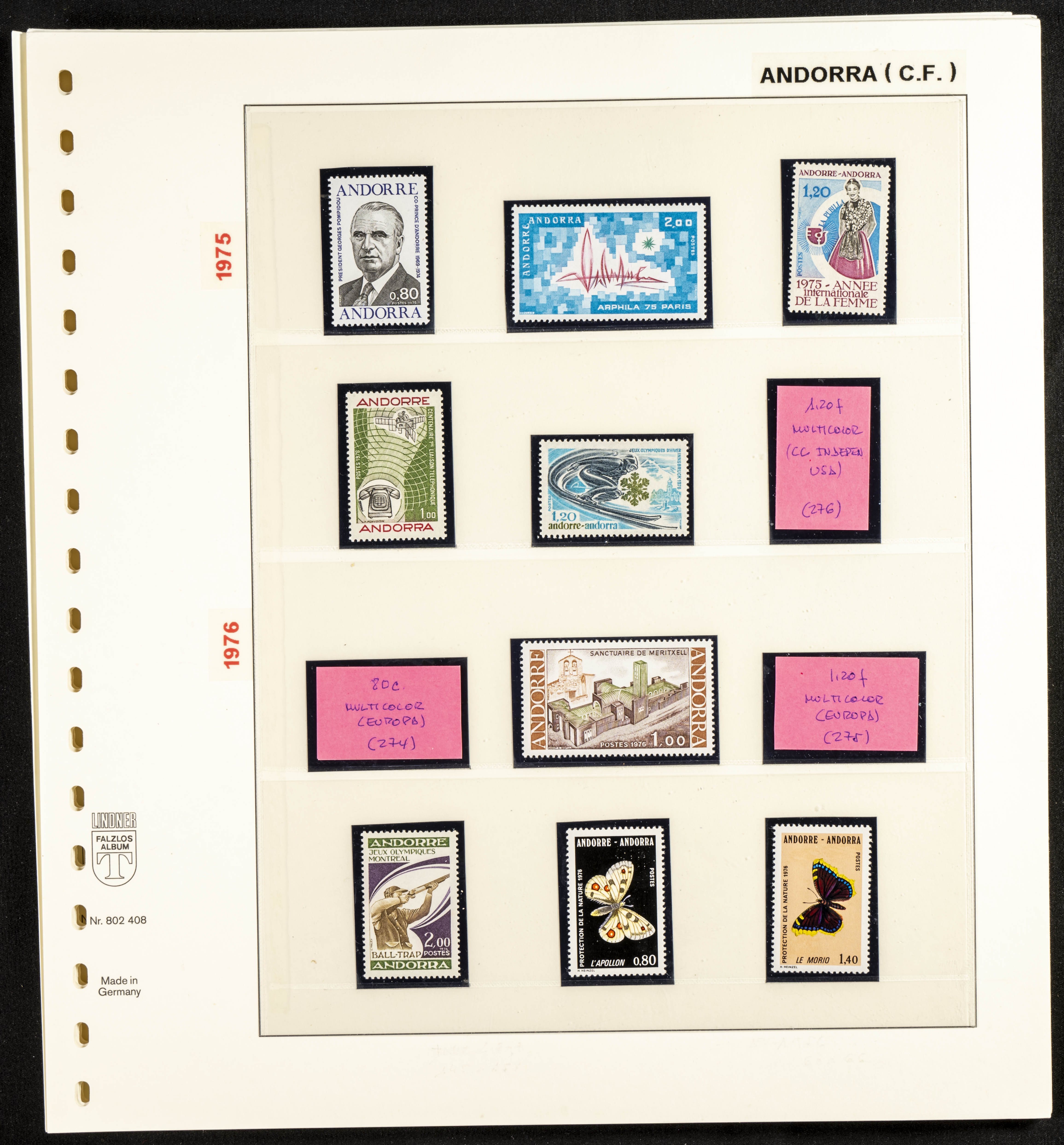 ★★/★(1875ca). Interesting collections of Spanish Andorra stamps between 1875 and 1989, in mint condition and practically complete except for the 1931 series (coarse perforation) and the 1935 series (unnumbered), and French Andorra stamps between 1931 and 1987, practically complete and mint except for the 1948 series and some other stamps of little value (includes fees). TO BE EXAMINED. Edifil 2026: +6,800 Euros