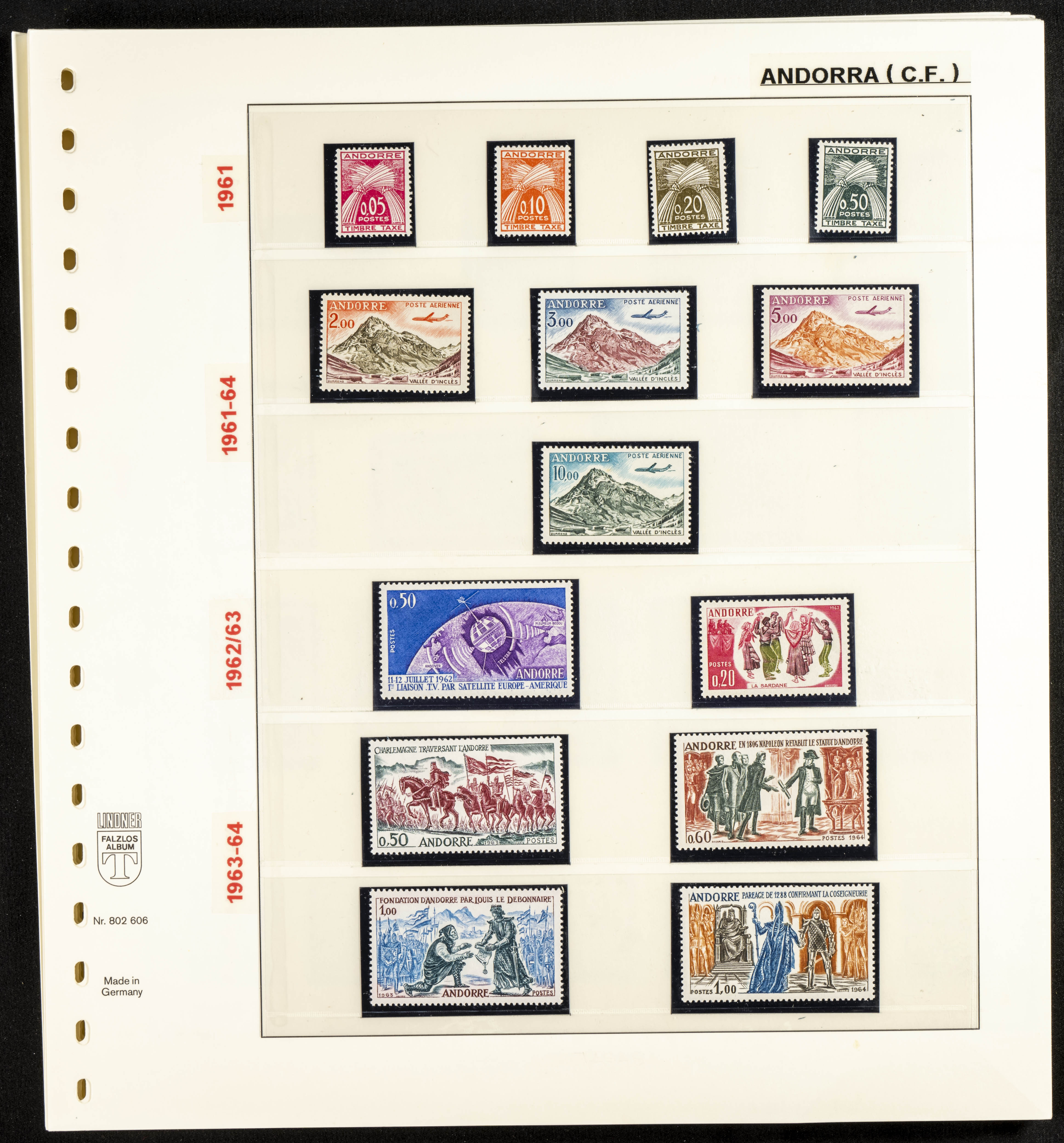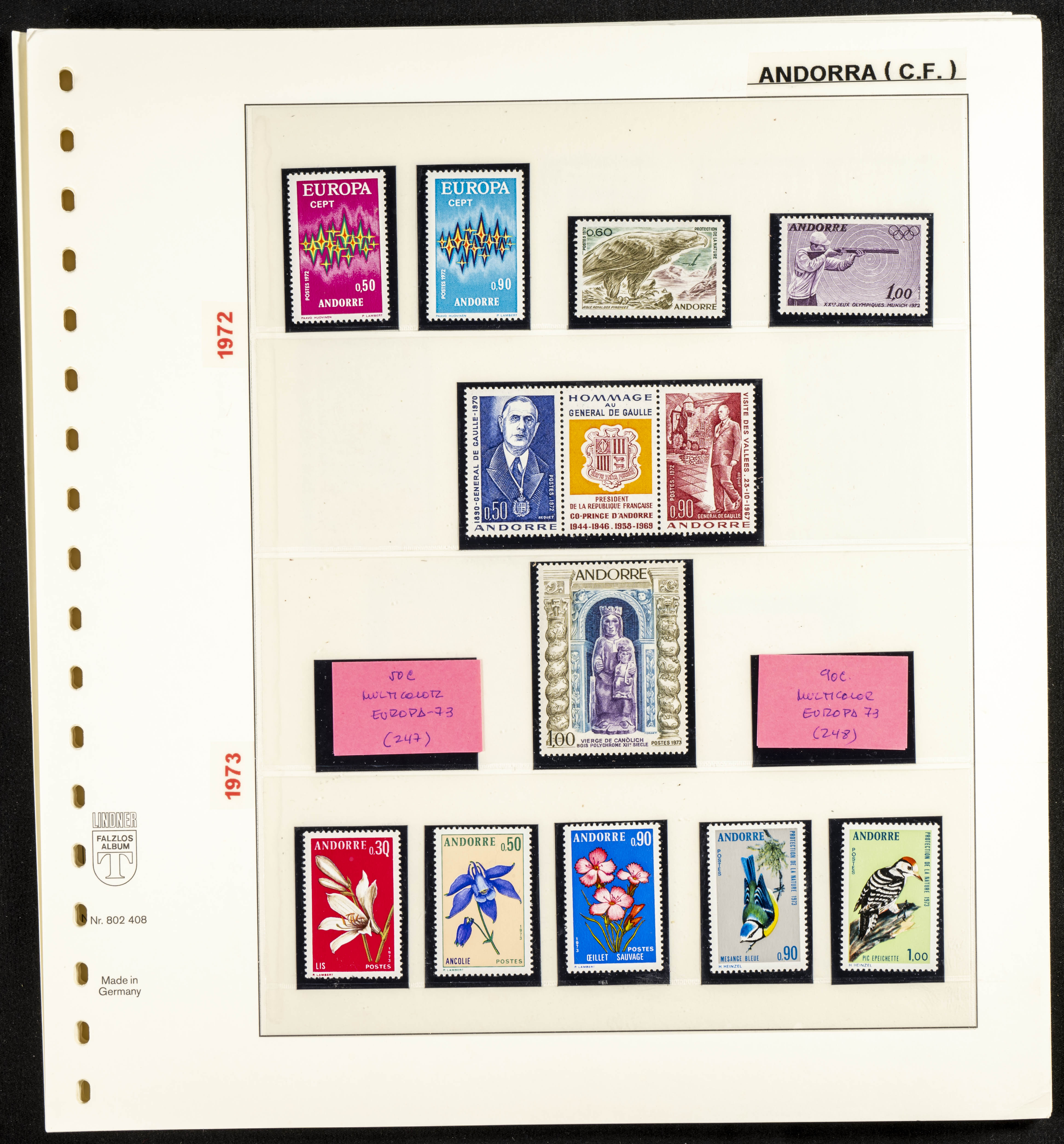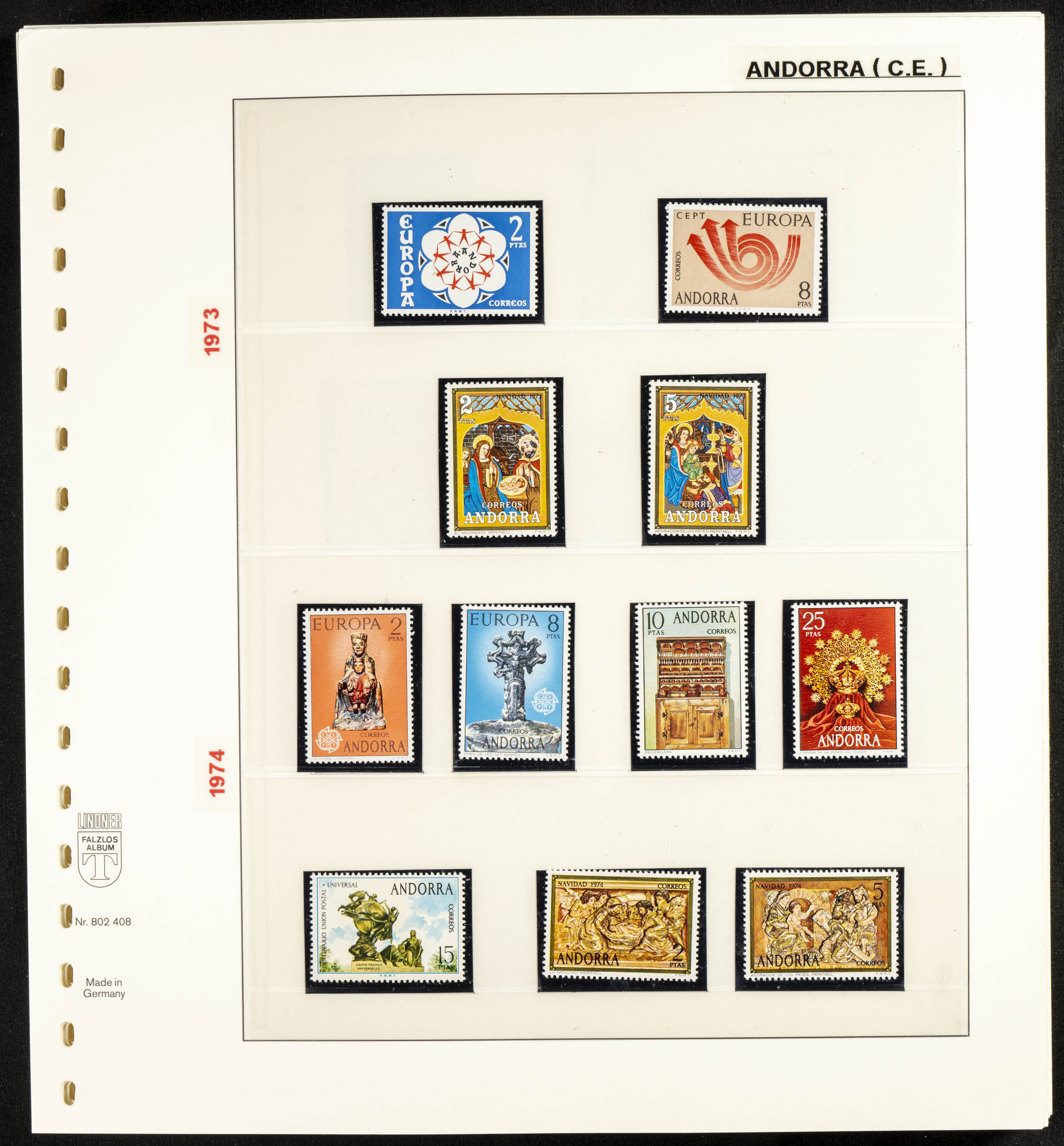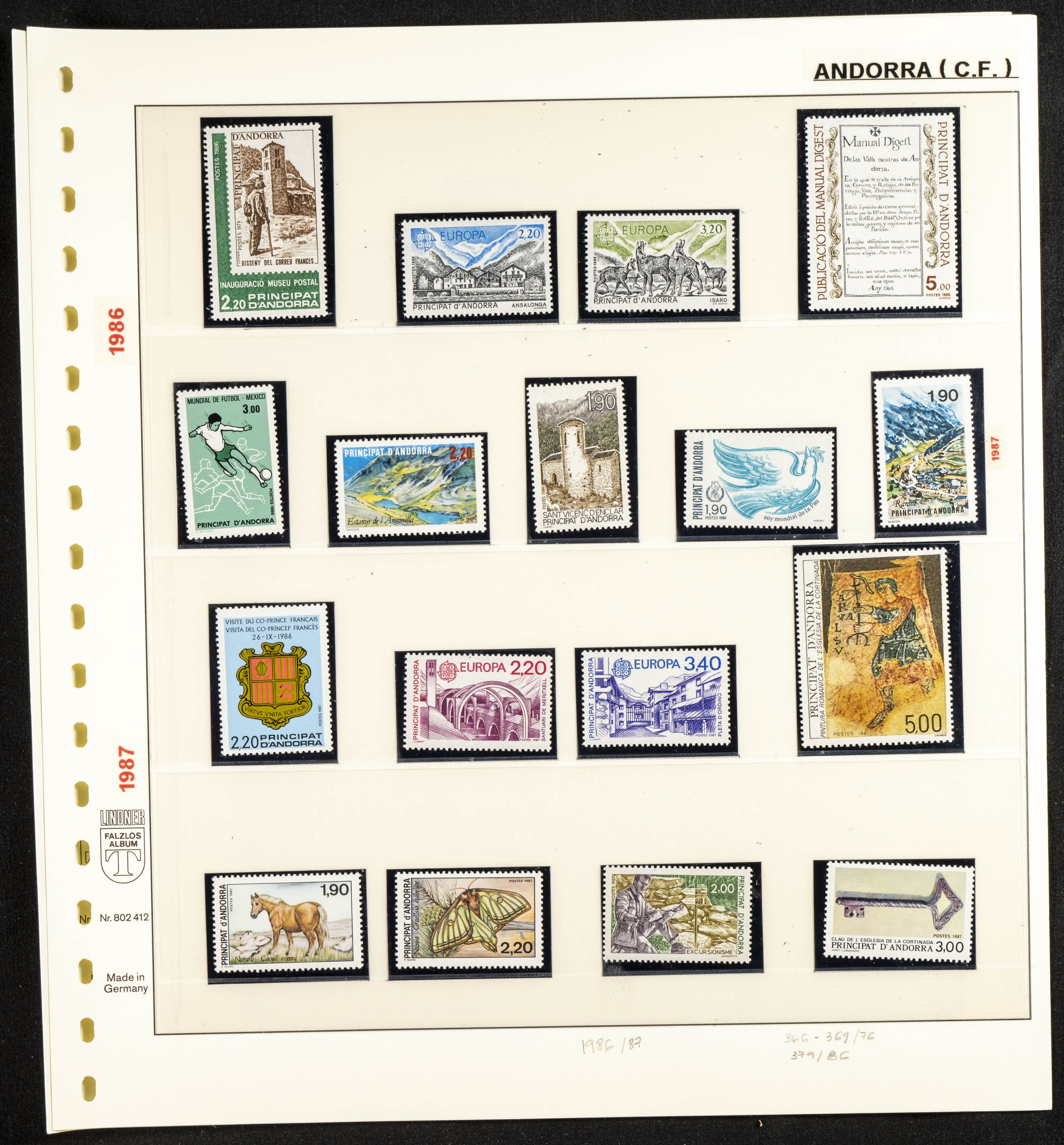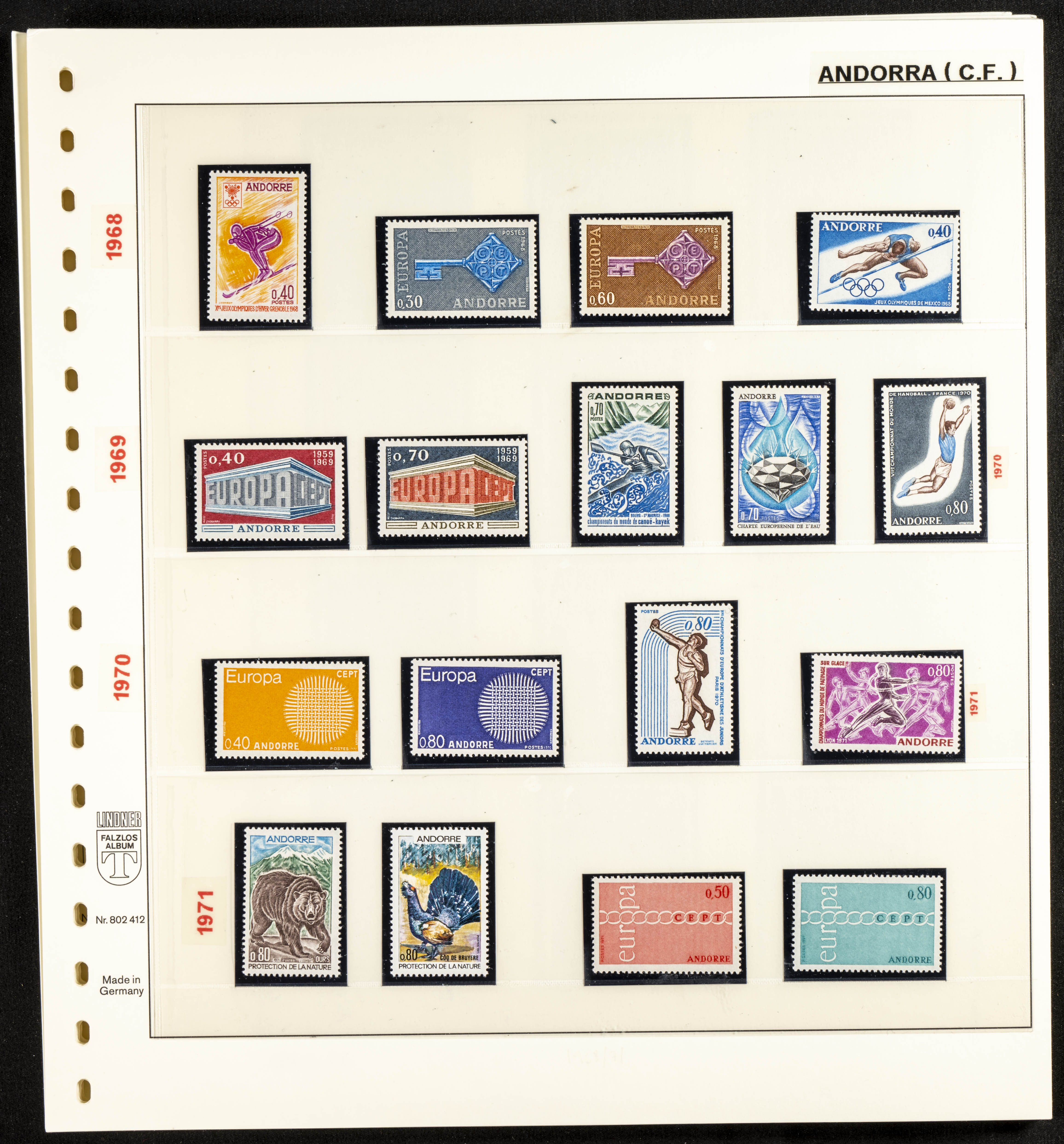 ★★/★(1875ca). Interesting collections of Spanish Andorra stamps between 1875 and 1989, in mint condition and practically complete except for the 1931 series (coarse perforation) and the 1935 series (unnumbered), and French Andorra stamps between 1931 and 1987, practically complete and mint except for the 1948 series and some other stamps of little value (includes fees). TO BE EXAMINED. Edifil 2026: +6,800 Euros