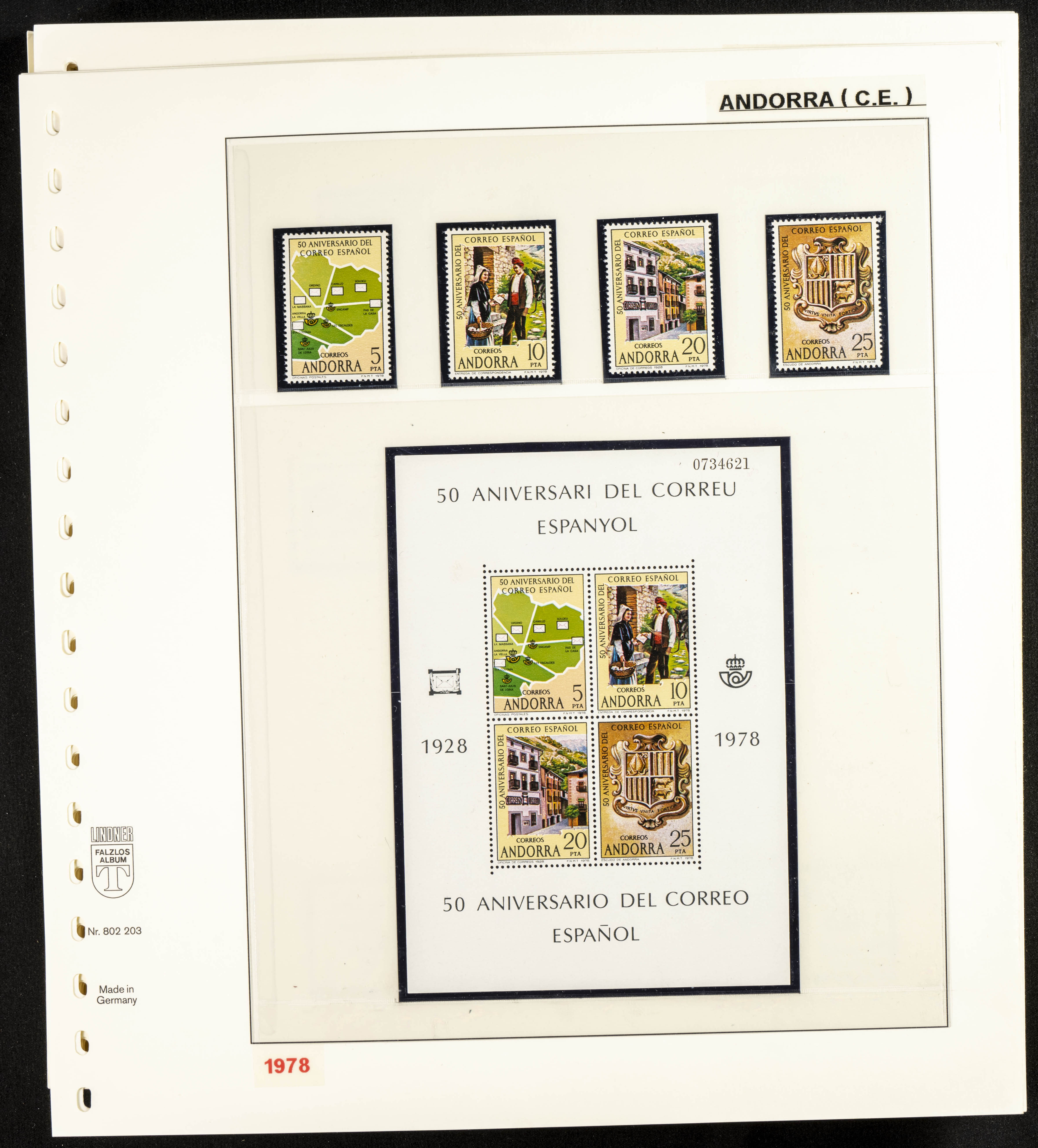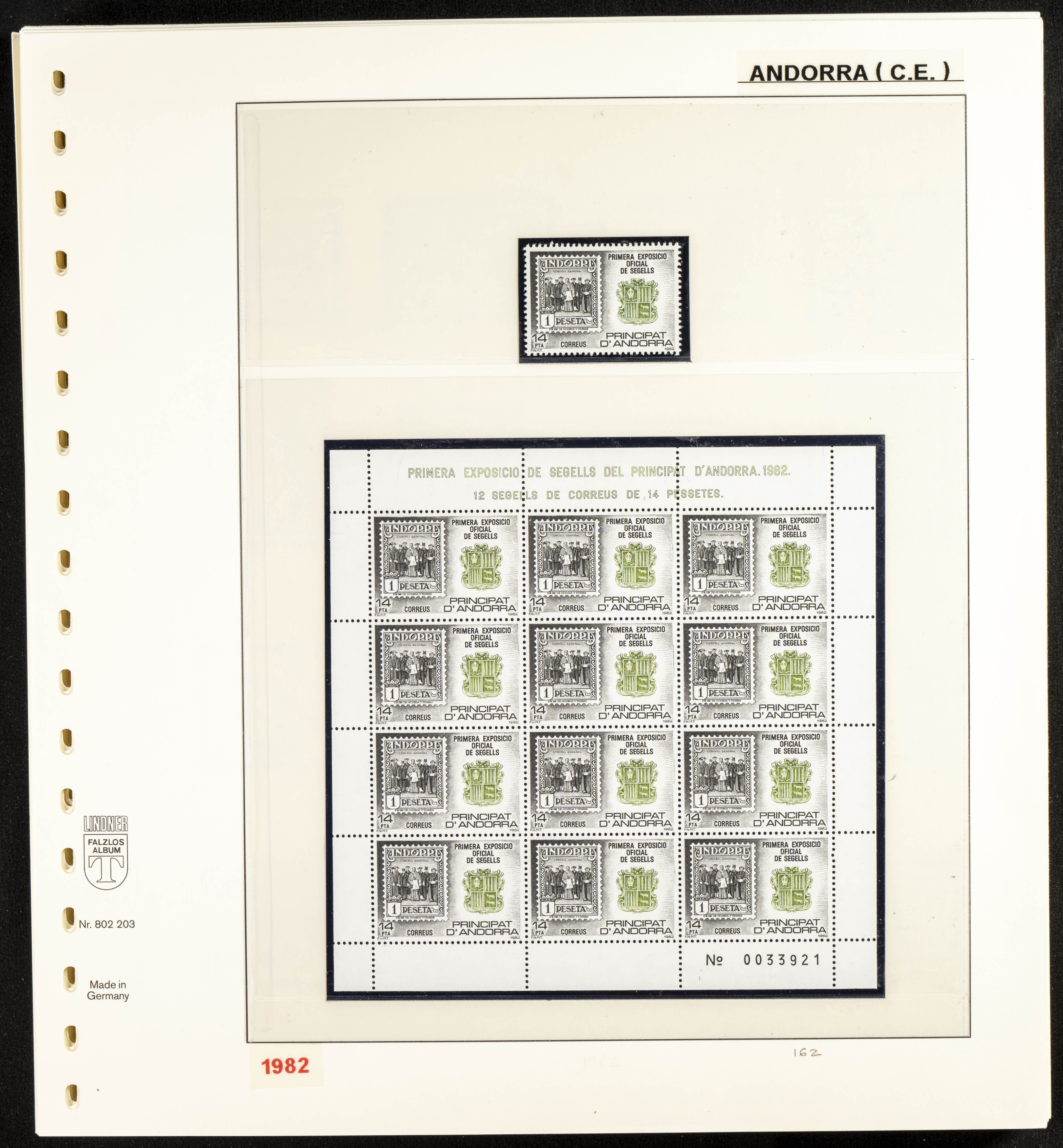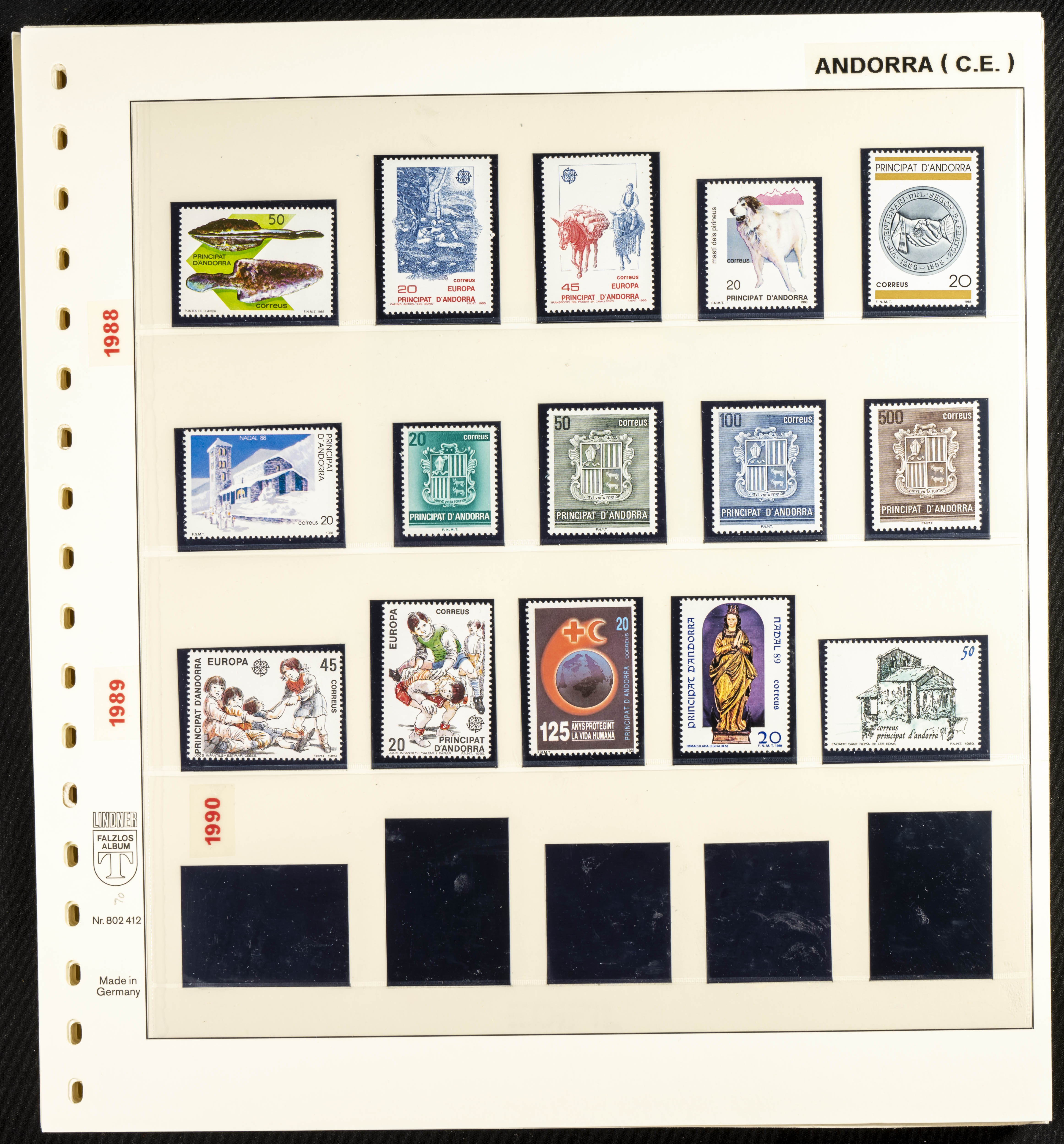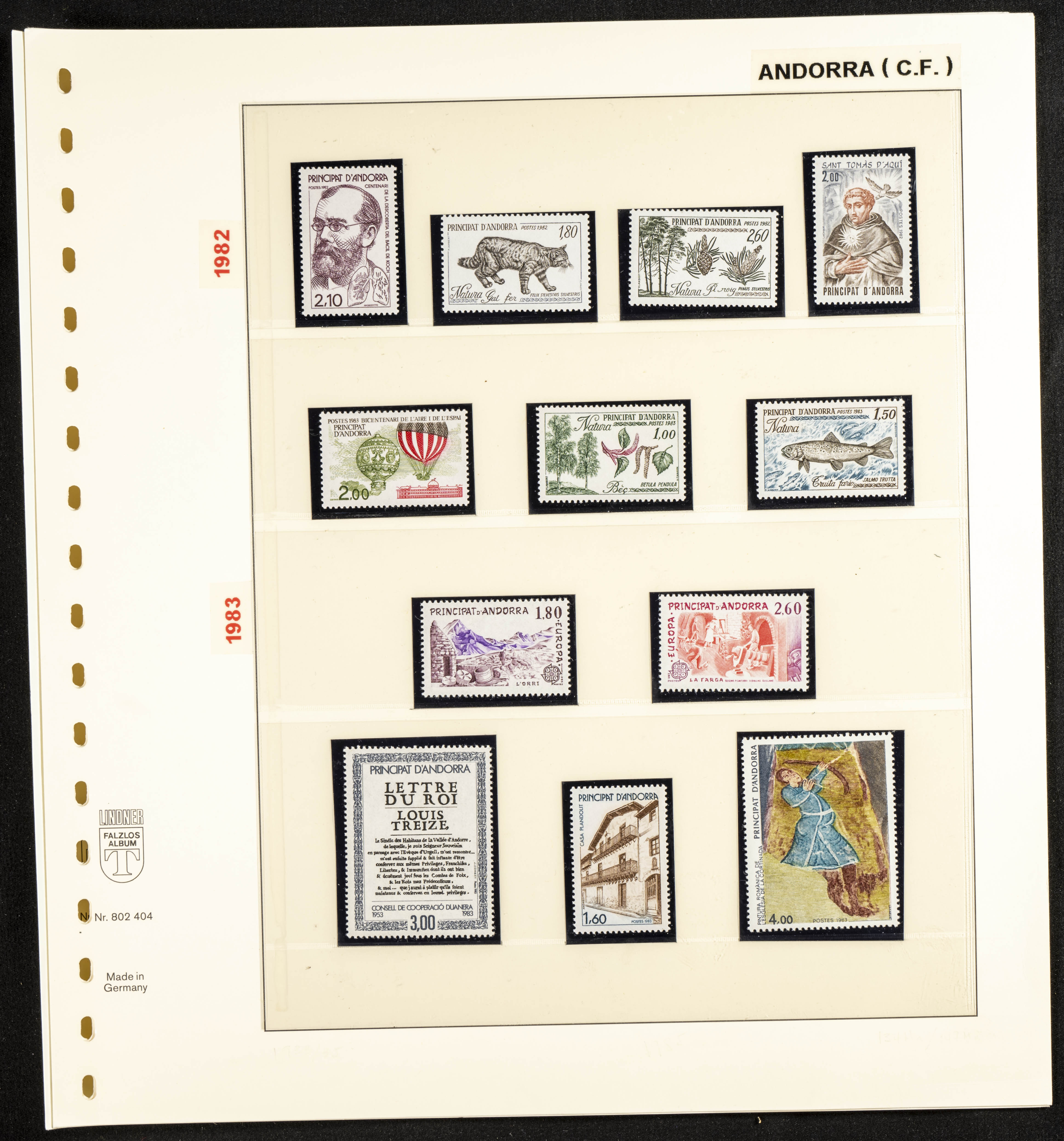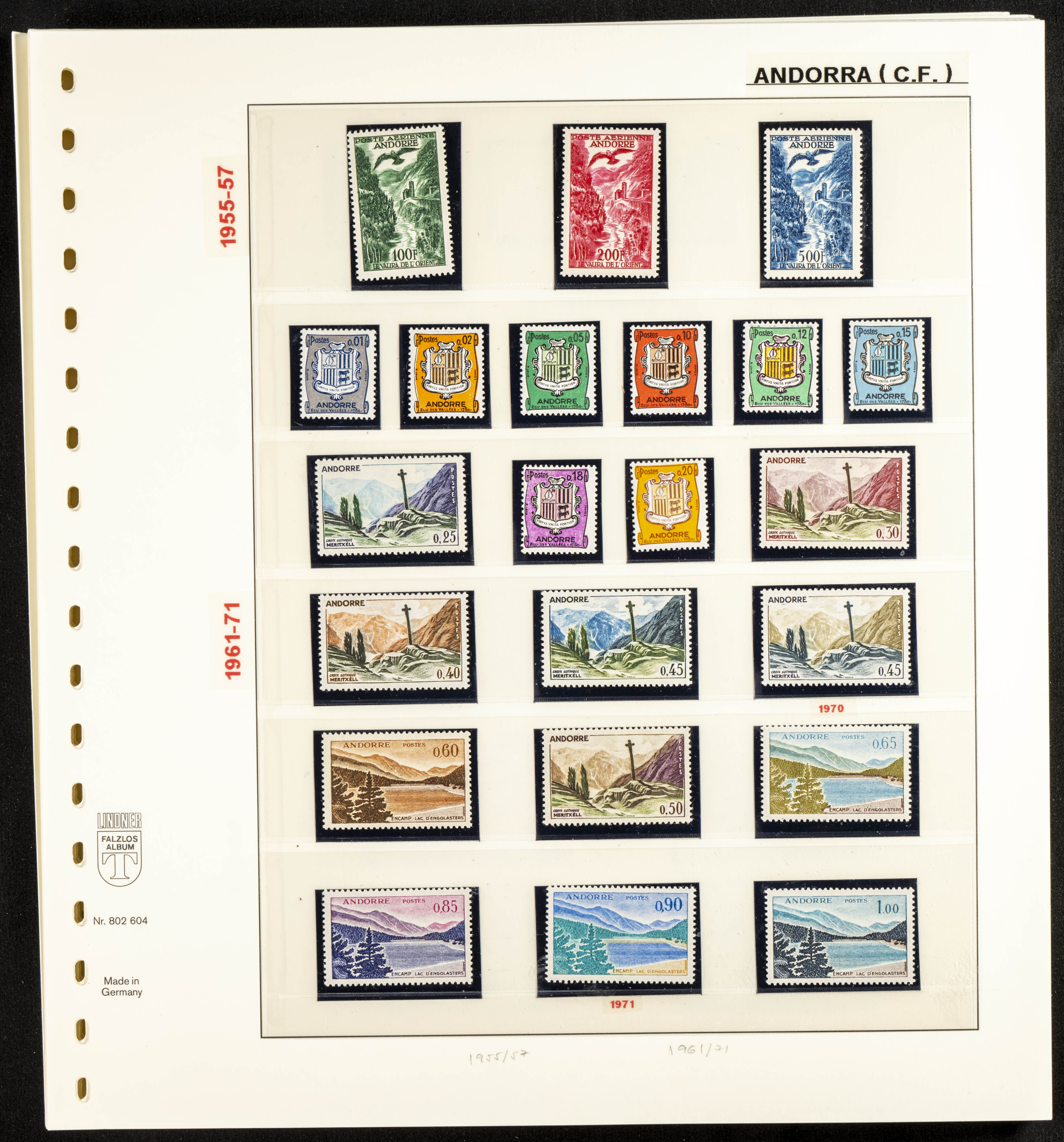 ★★/★(1875ca). Interesting collections of Spanish Andorra stamps between 1875 and 1989, in mint condition and practically complete except for the 1931 series (coarse perforation) and the 1935 series (unnumbered), and French Andorra stamps between 1931 and 1987, practically complete and mint except for the 1948 series and some other stamps of little value (includes fees). TO BE EXAMINED. Edifil 2026: +6,800 Euros