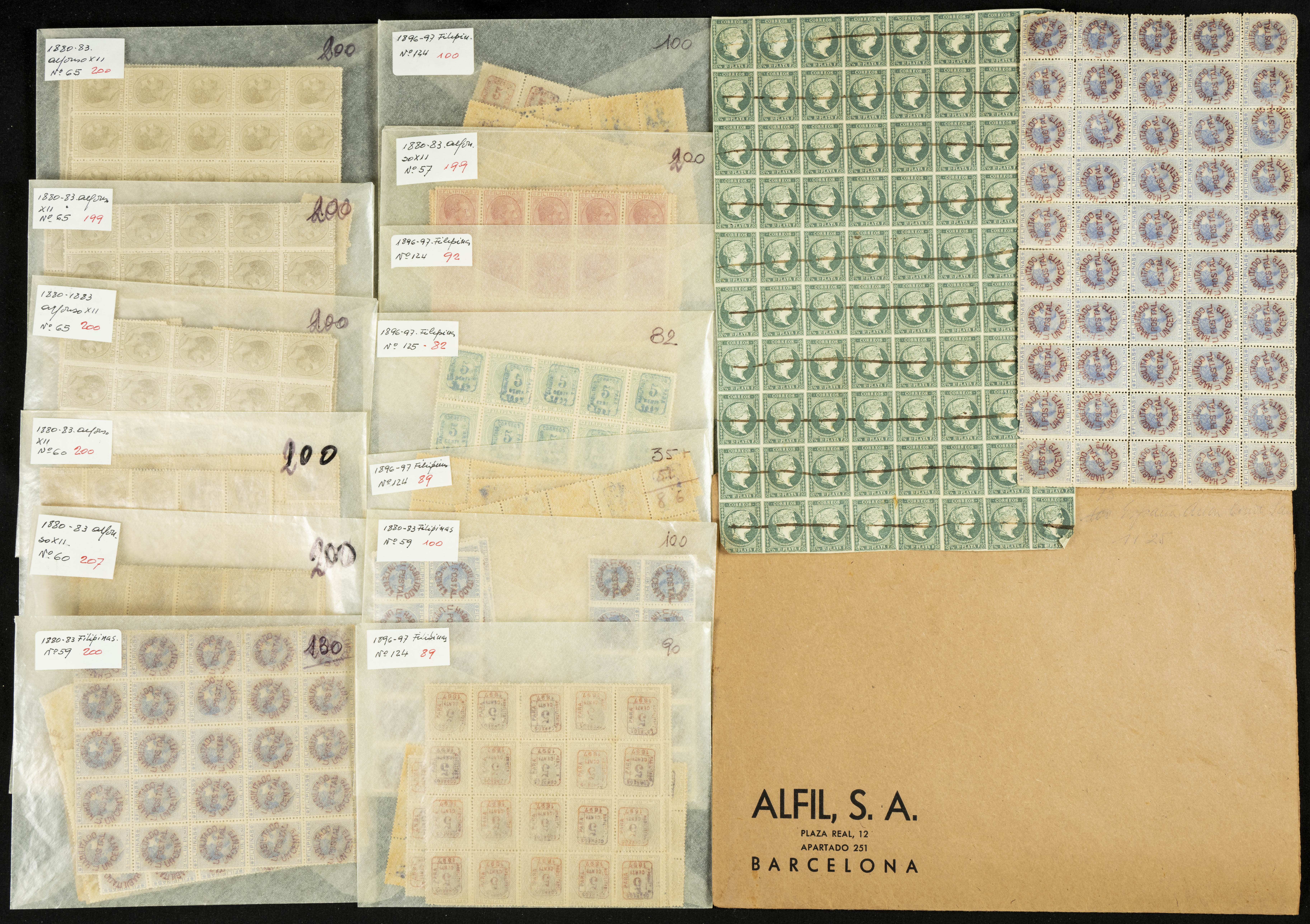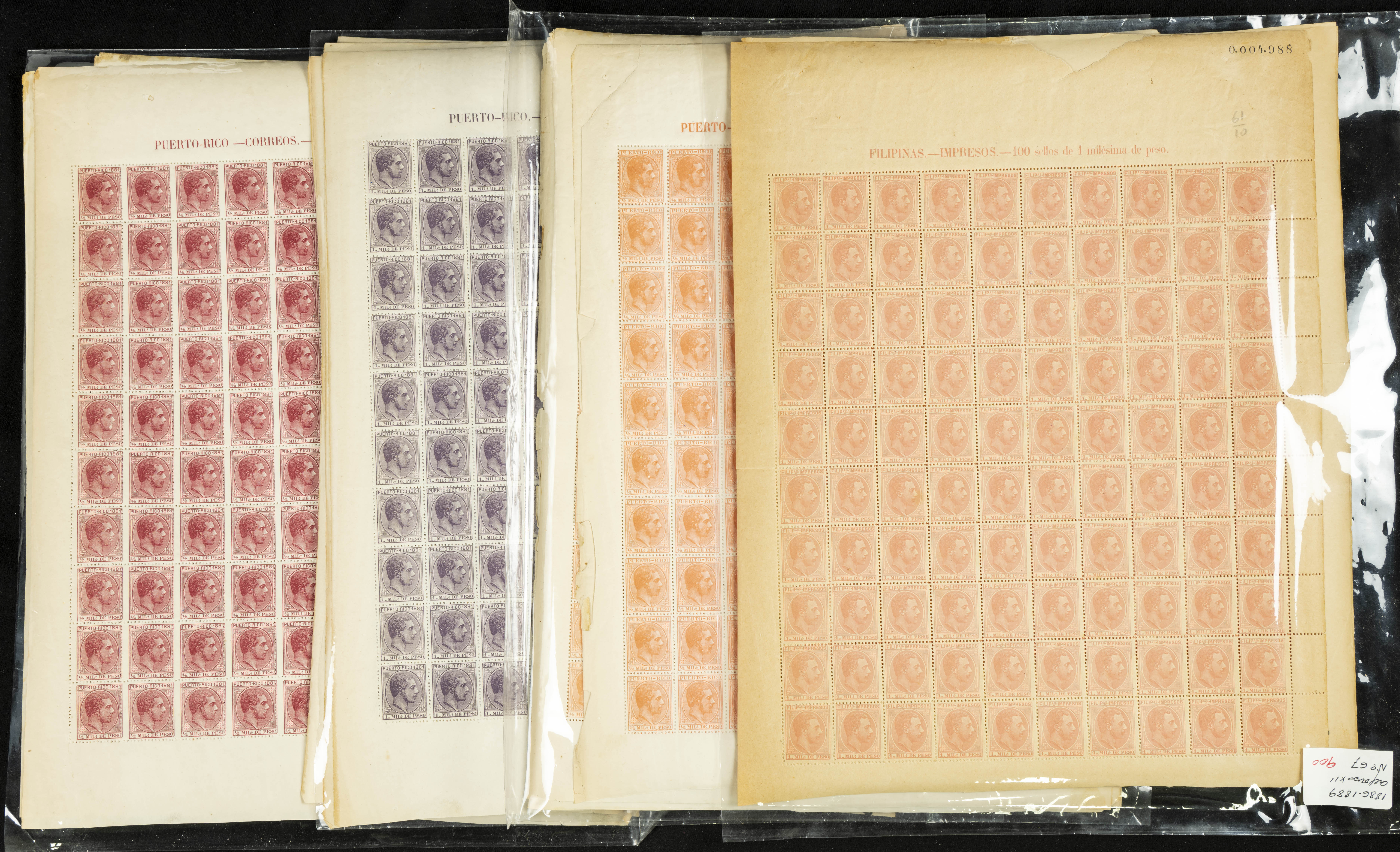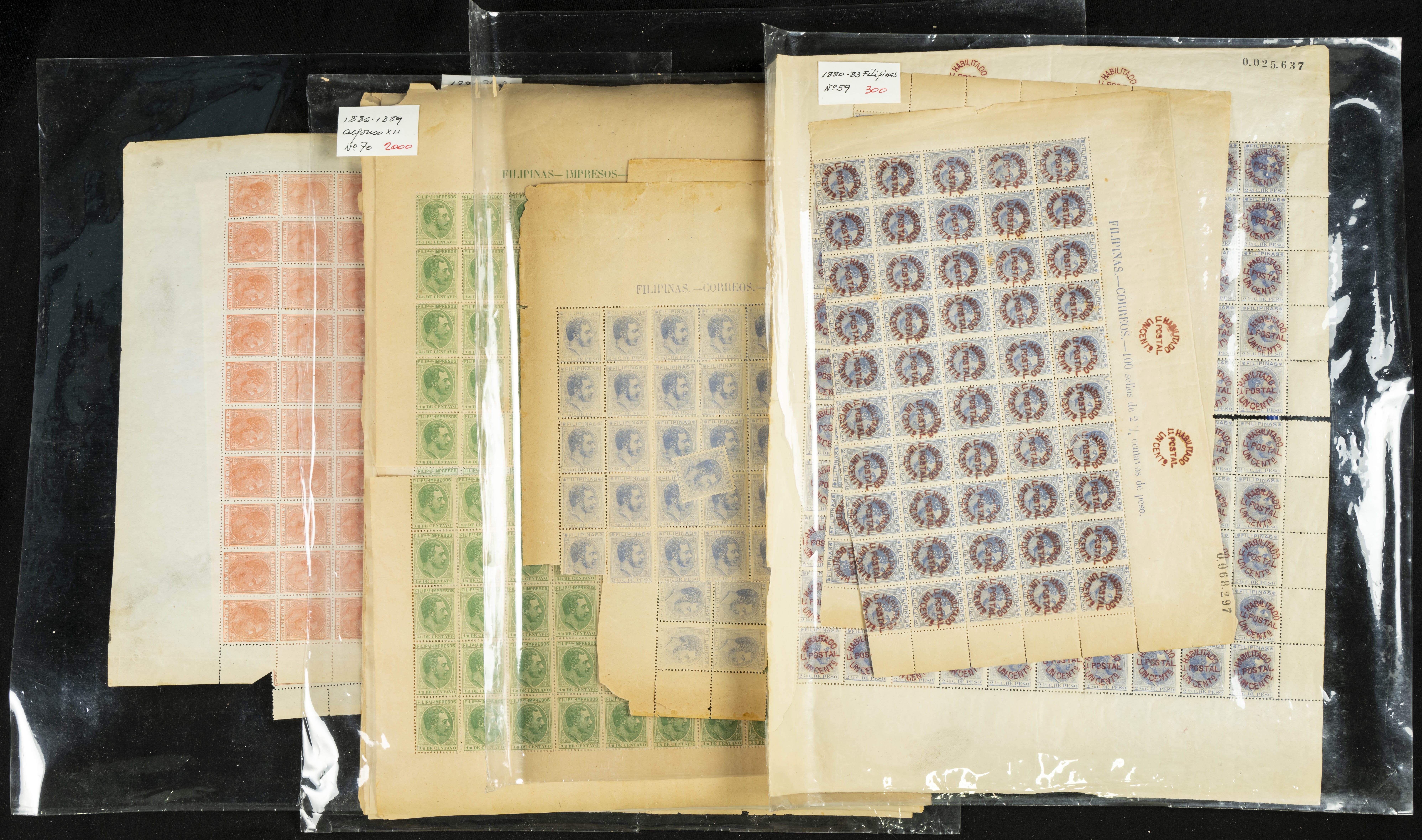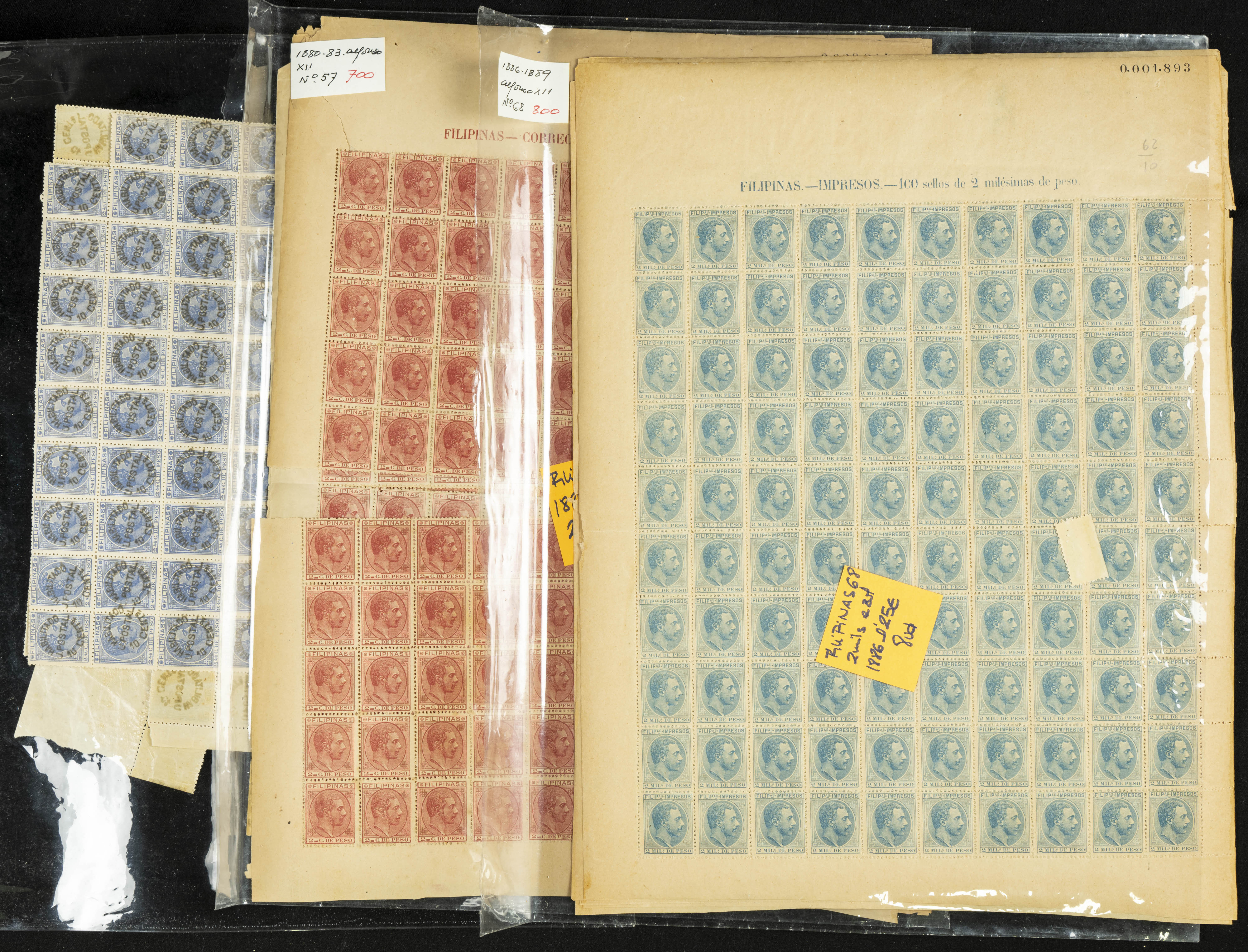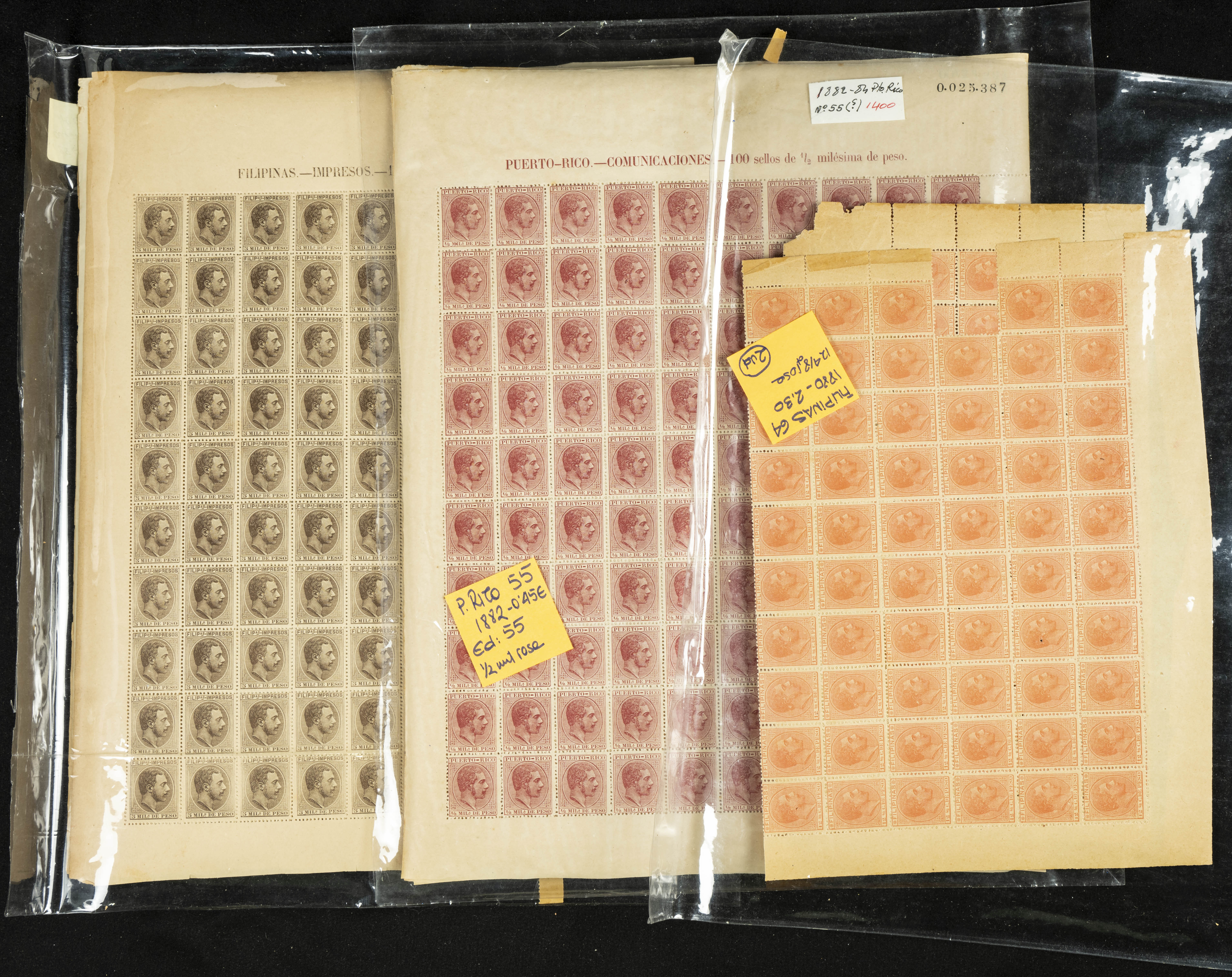 English ★★(1855ca). Interesting collection of thousands of stamps from the Philippines and Puerto Rico, mint and in sheets or large blocks, including some overprinted Philippine stamps and a block of eighty blue-green ½ real stamps from the Antilles, defaced with a pen. HIGH CATALOG VALUE. TO BE EXAMINED.