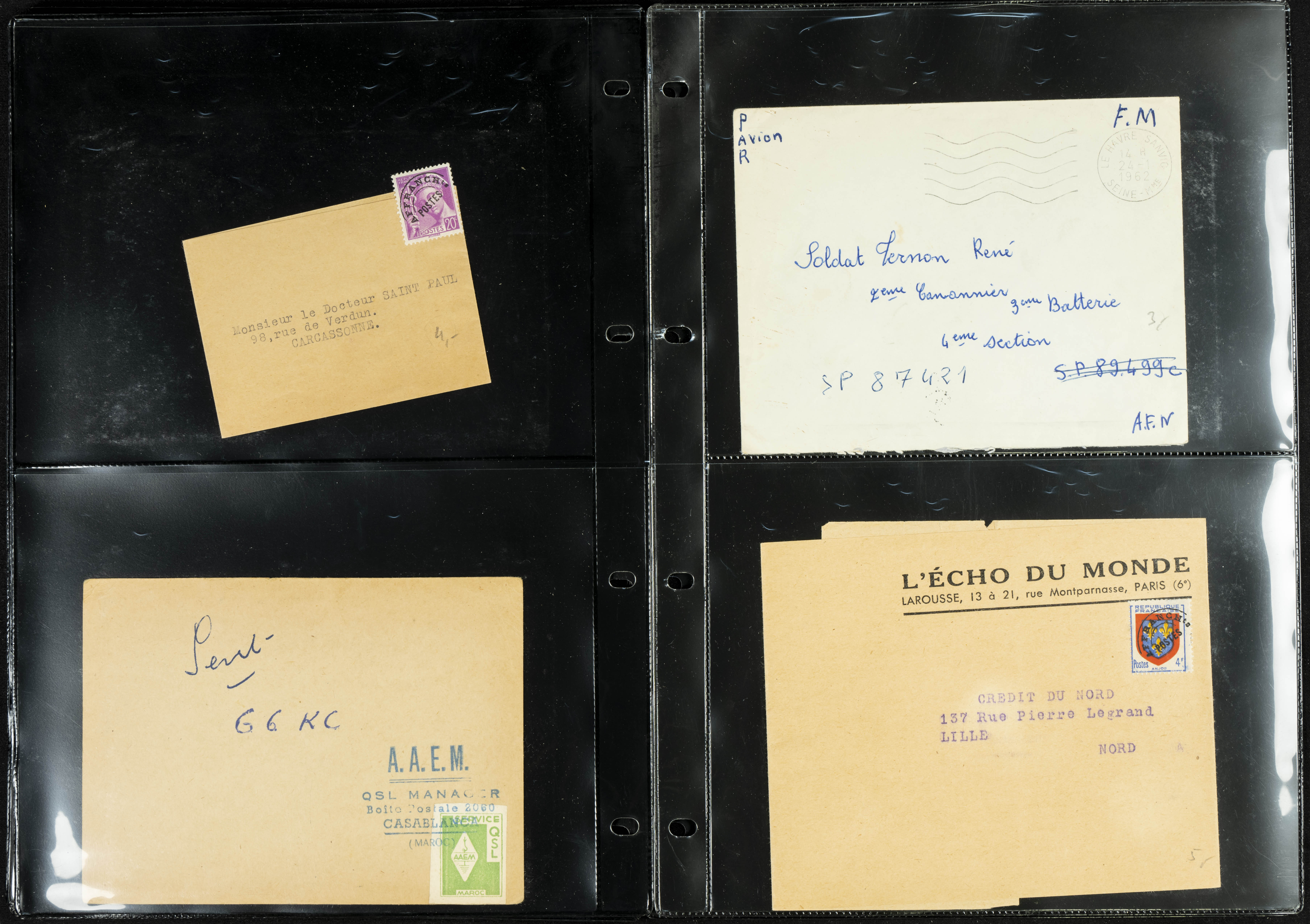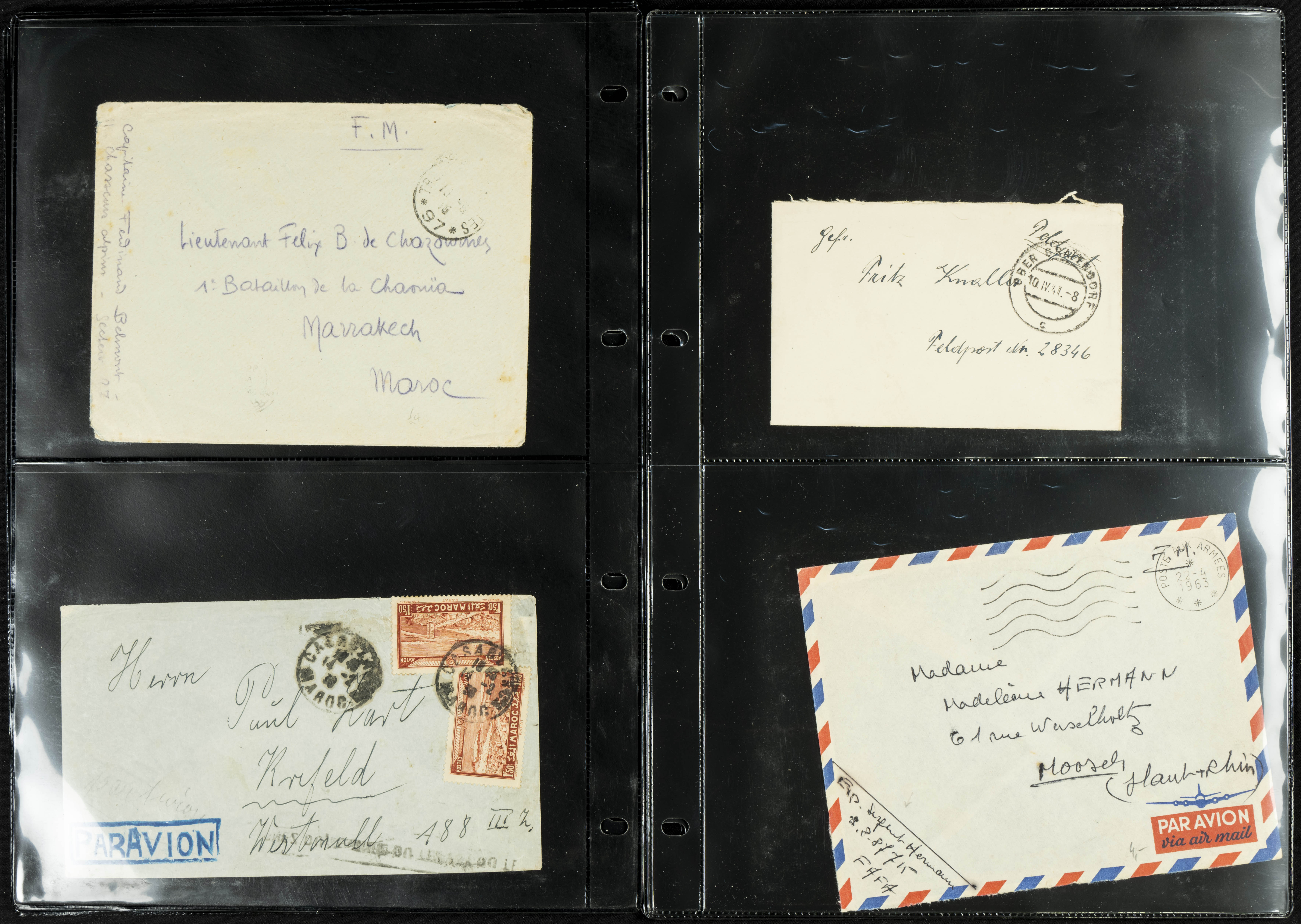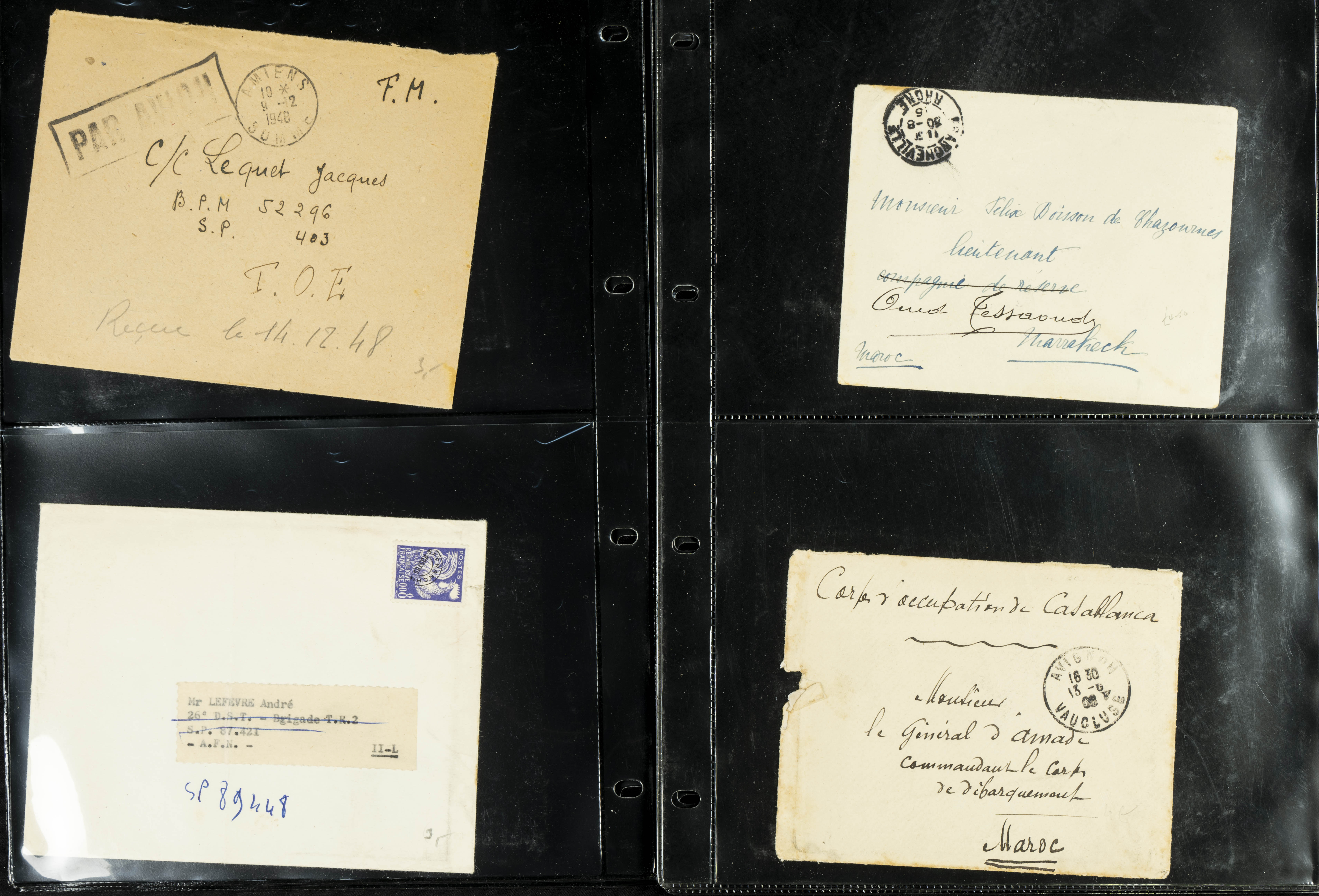 English (circa 1921). Collection of more than twenty letters and postcards from France (including some other countries) circulated between 1921 and 1963, several with military postmarks addressed to Morocco, one from Spain originating from the Rota naval base, and two with French military "roller" postmarks. TO BE EXAMINED.
