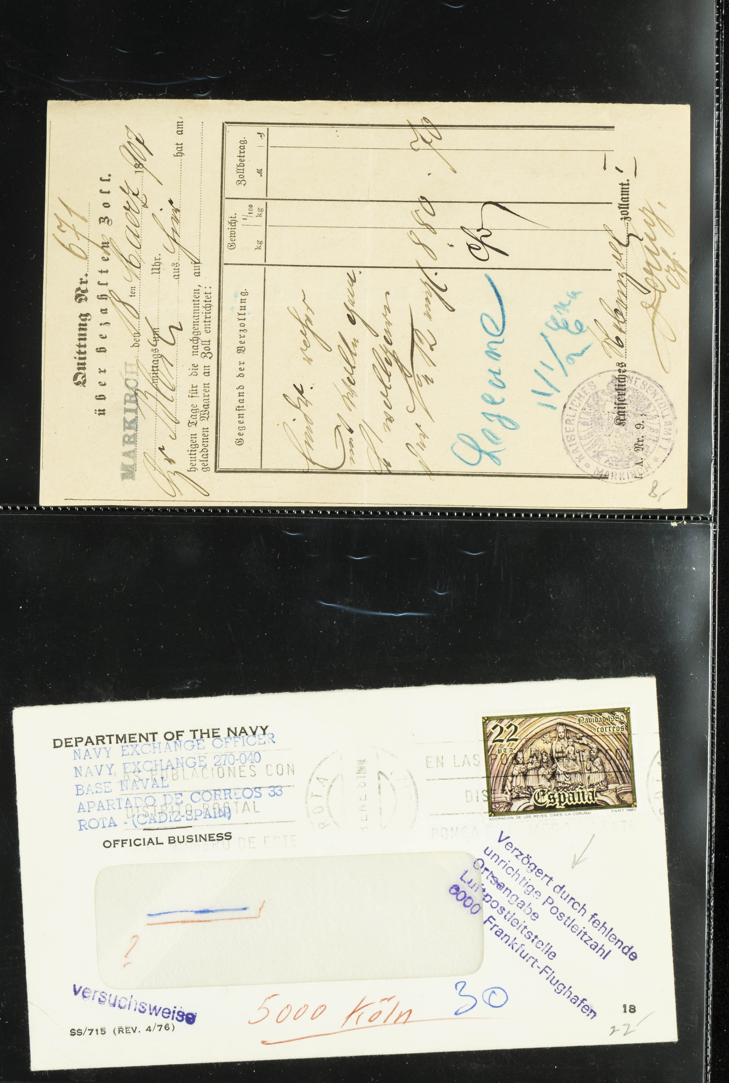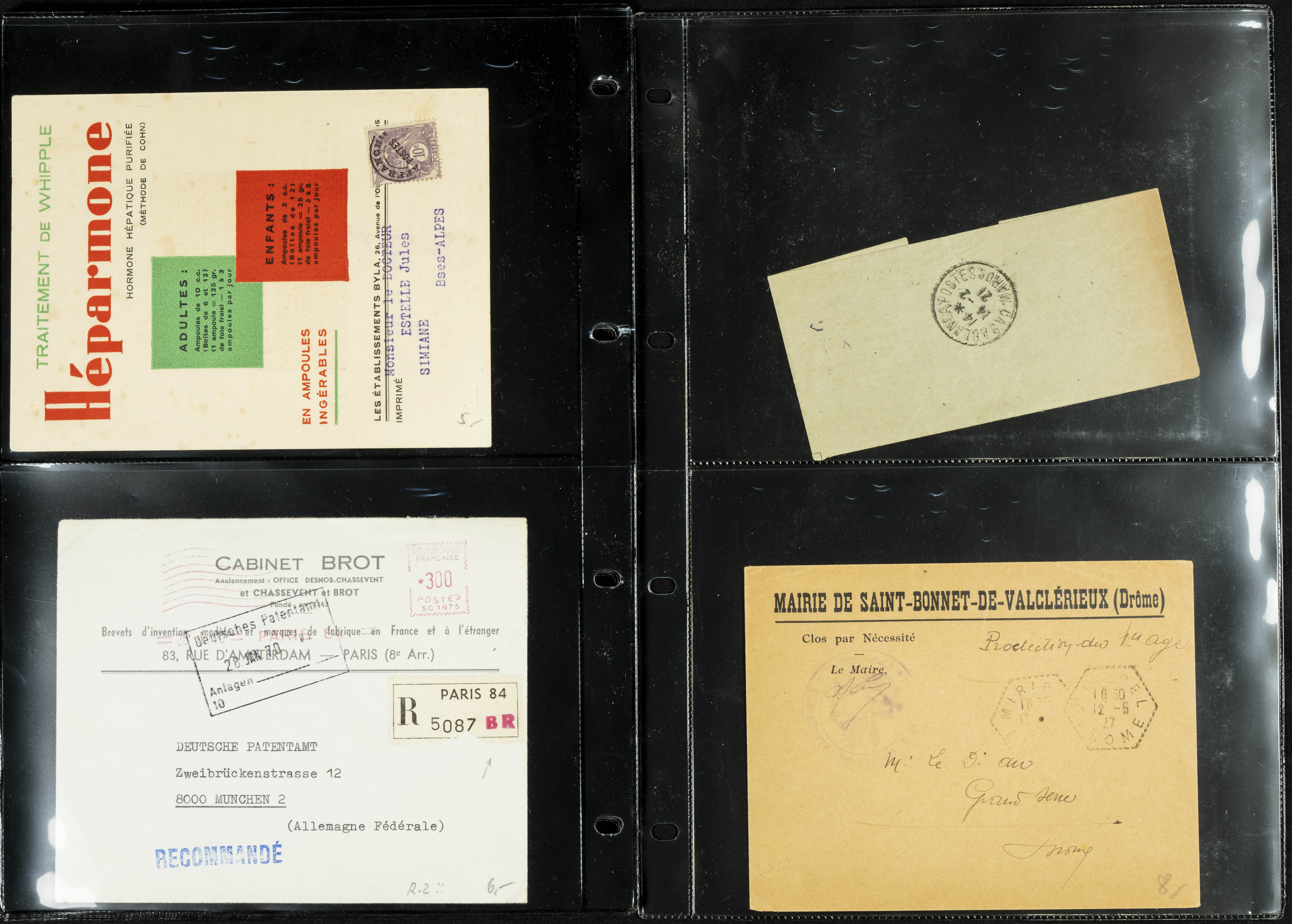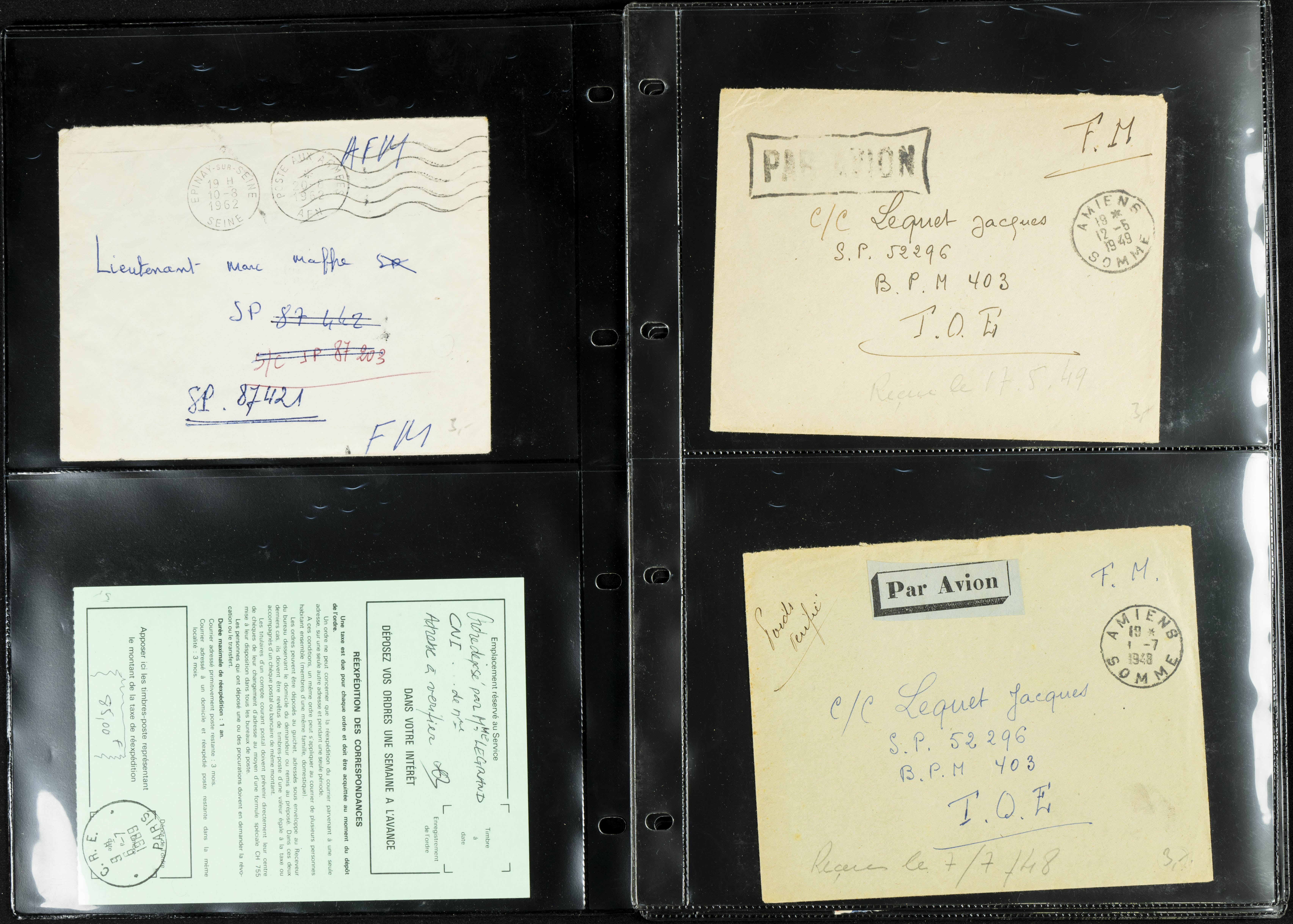English (circa 1921). Collection of more than twenty letters and postcards from France (including some other countries) circulated between 1921 and 1963, several with military postmarks addressed to Morocco, one from Spain originating from the Rota naval base, and two with French military "roller" postmarks. TO BE EXAMINED.