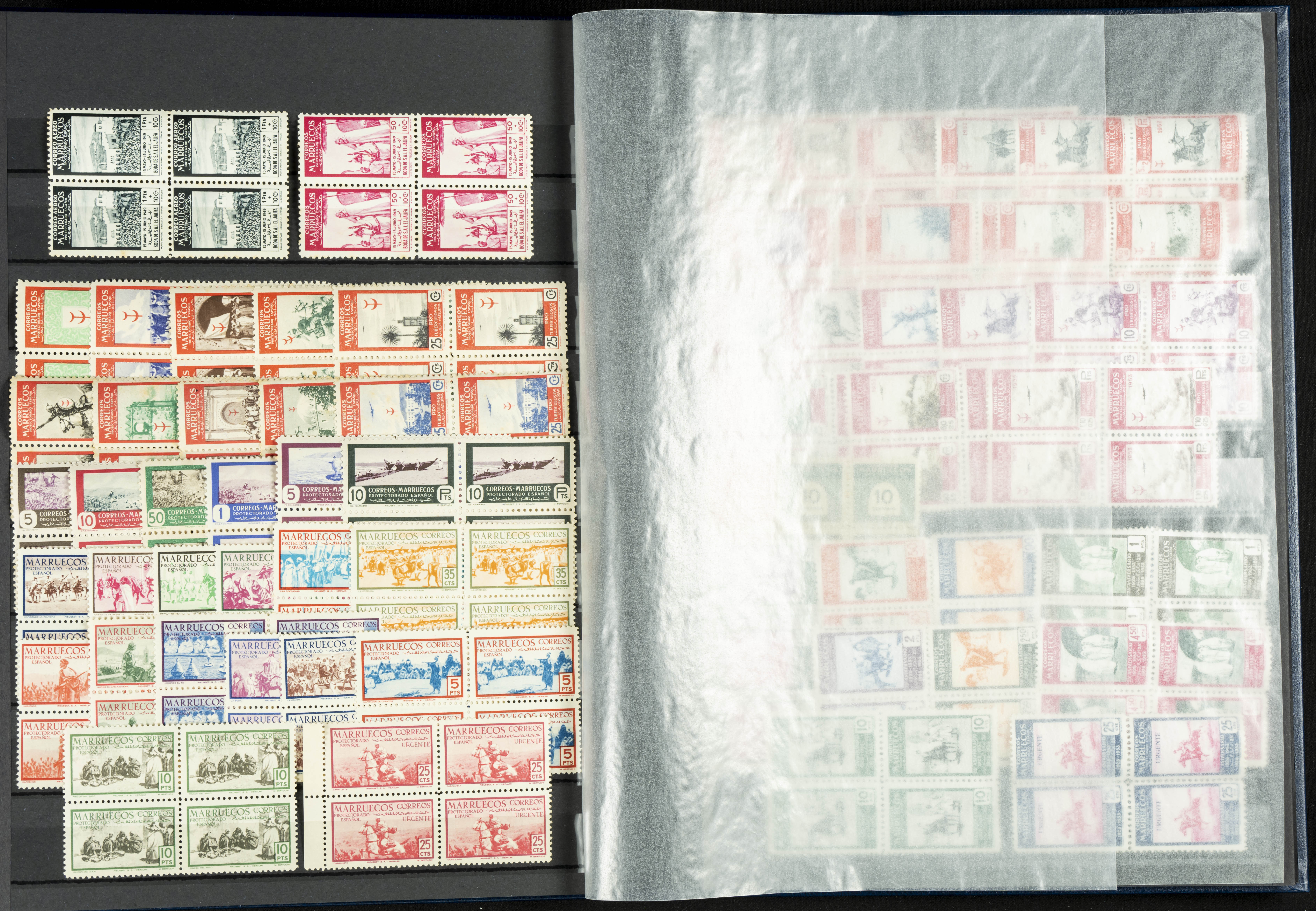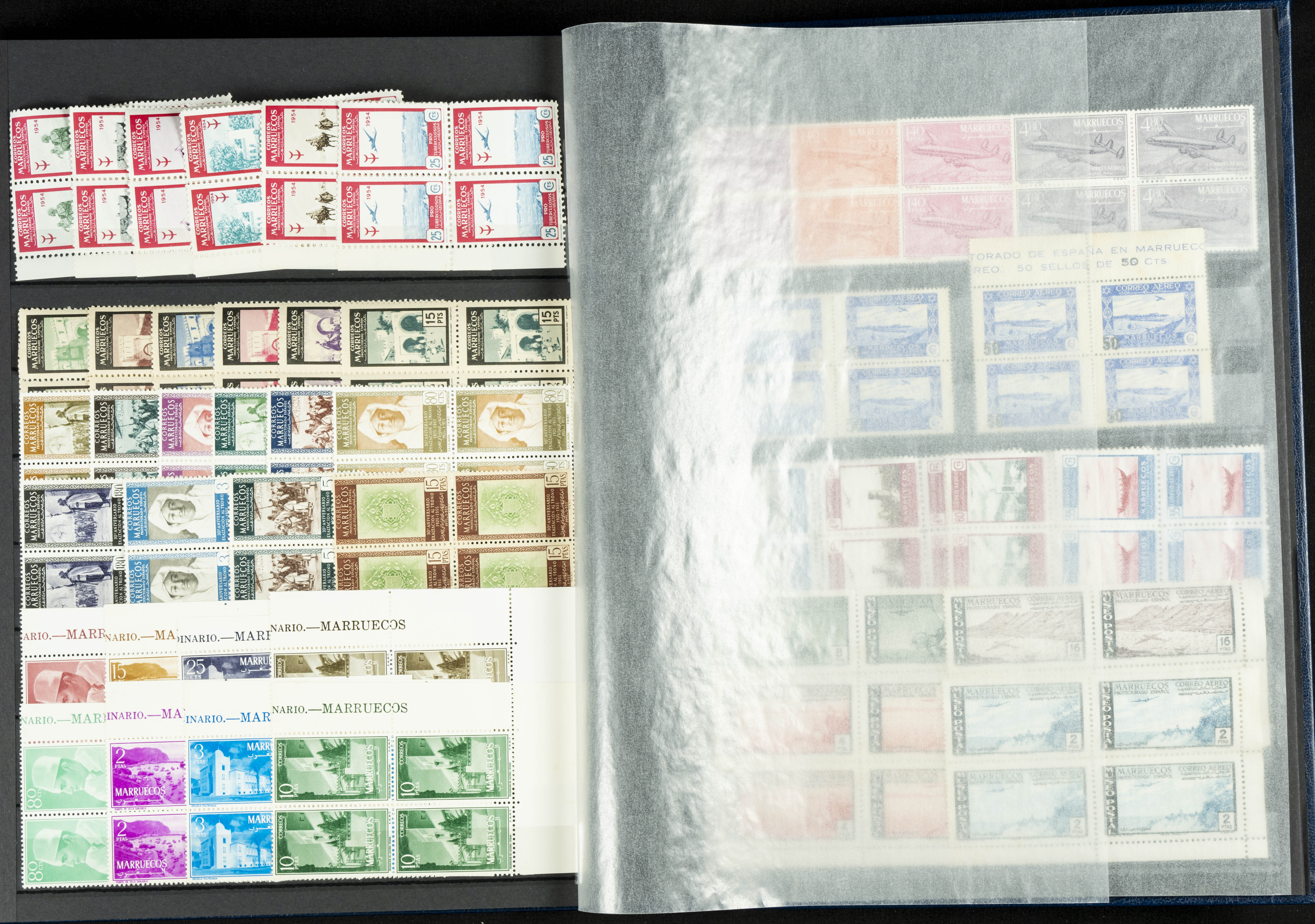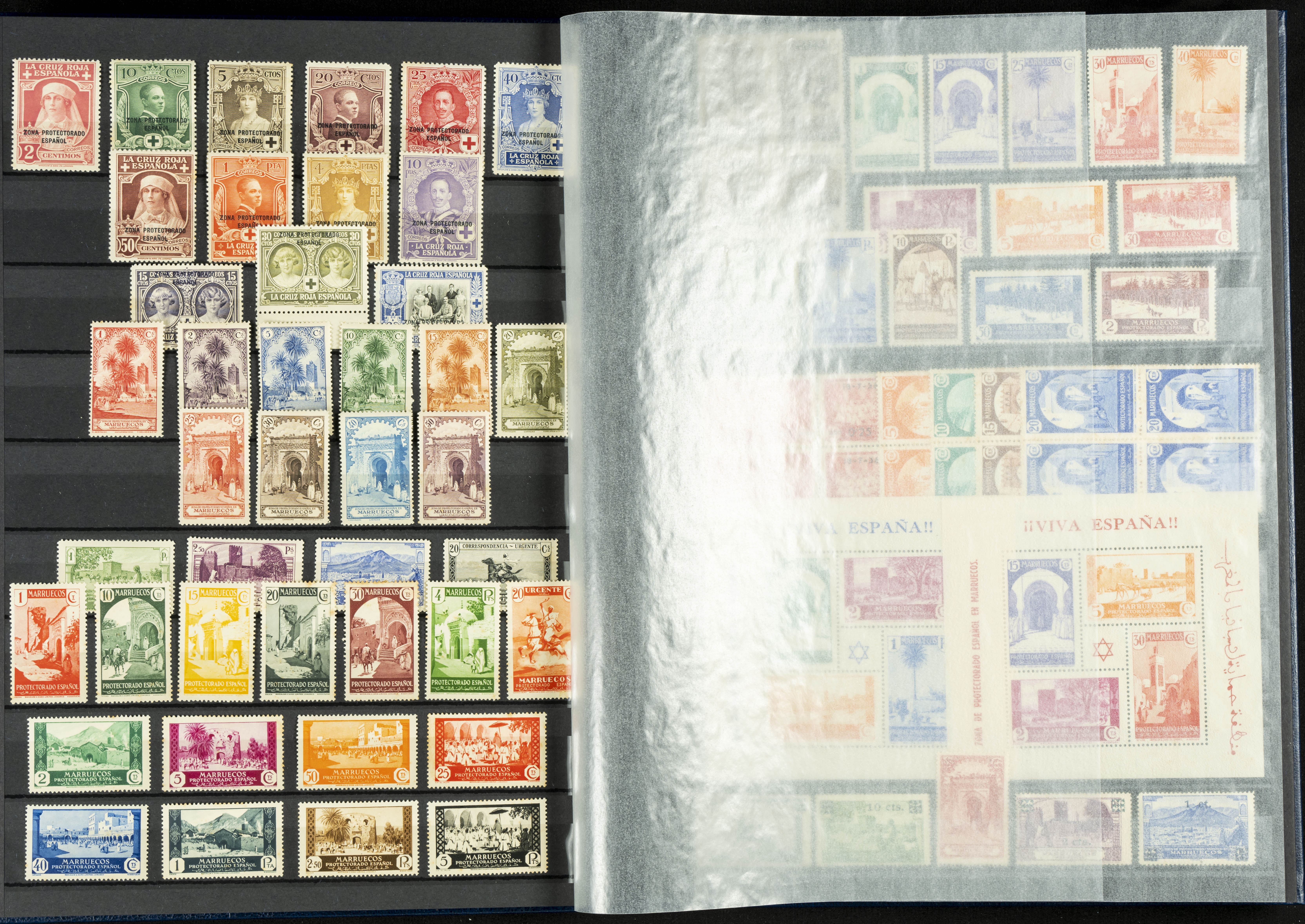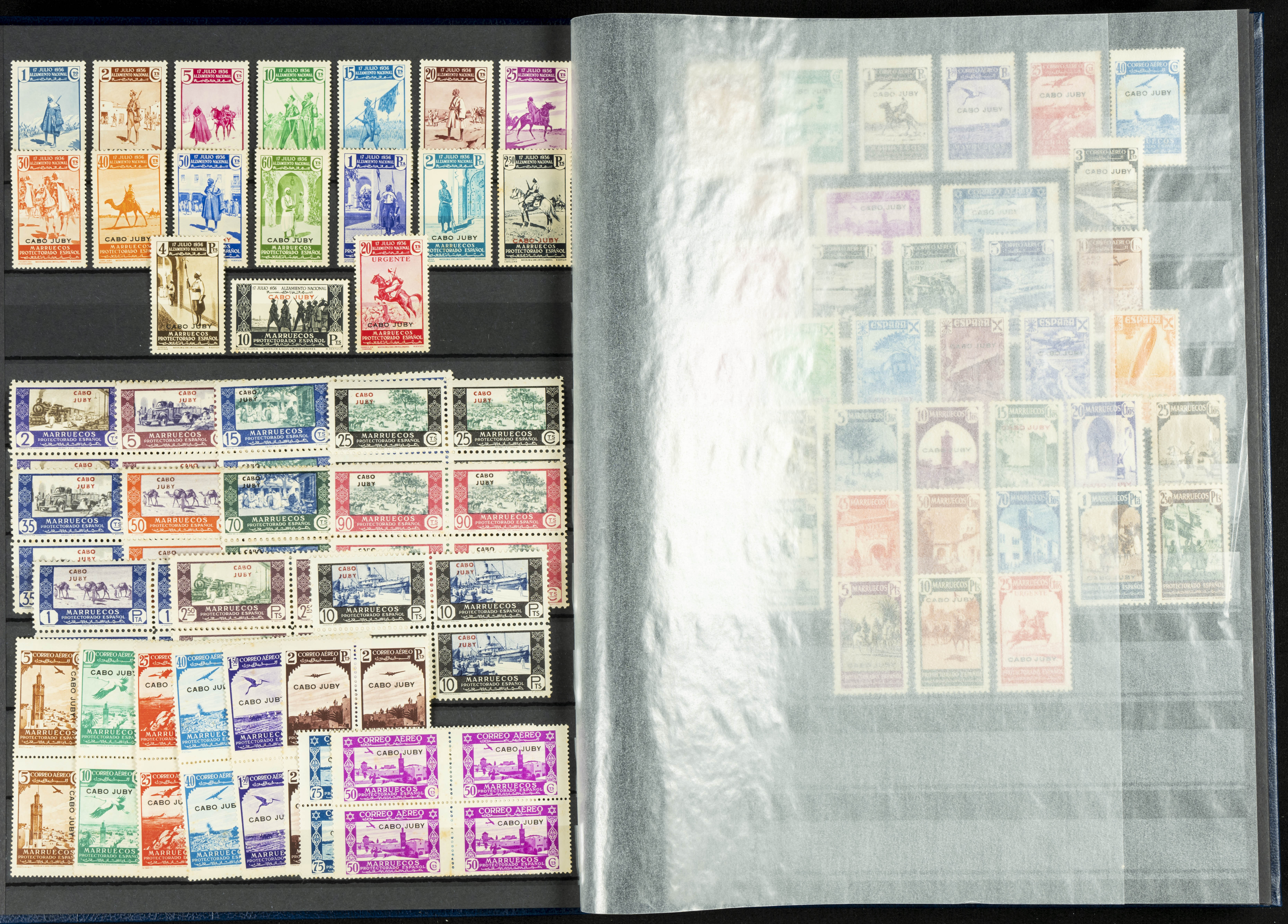 English ★(1903ca). A very interesting collection of Moroccan stamps from 1903 to 1956, in mint condition (some used), with many complete sets of four, especially from the later period. It includes stamps and series from Cape Juby and Tangier, as well as some modern series from Ifni and the Sahara. Extremely high catalog value. A must-see.