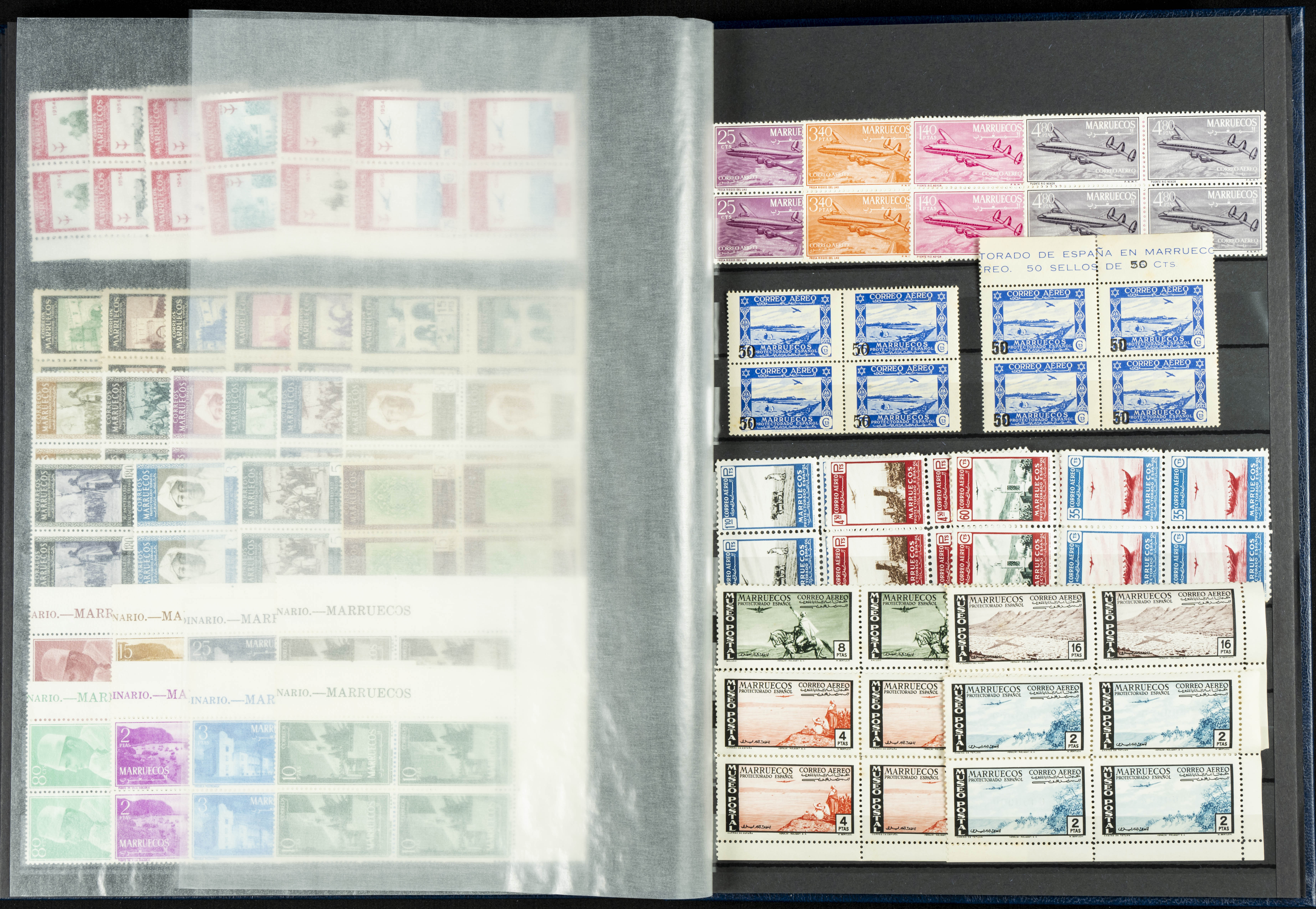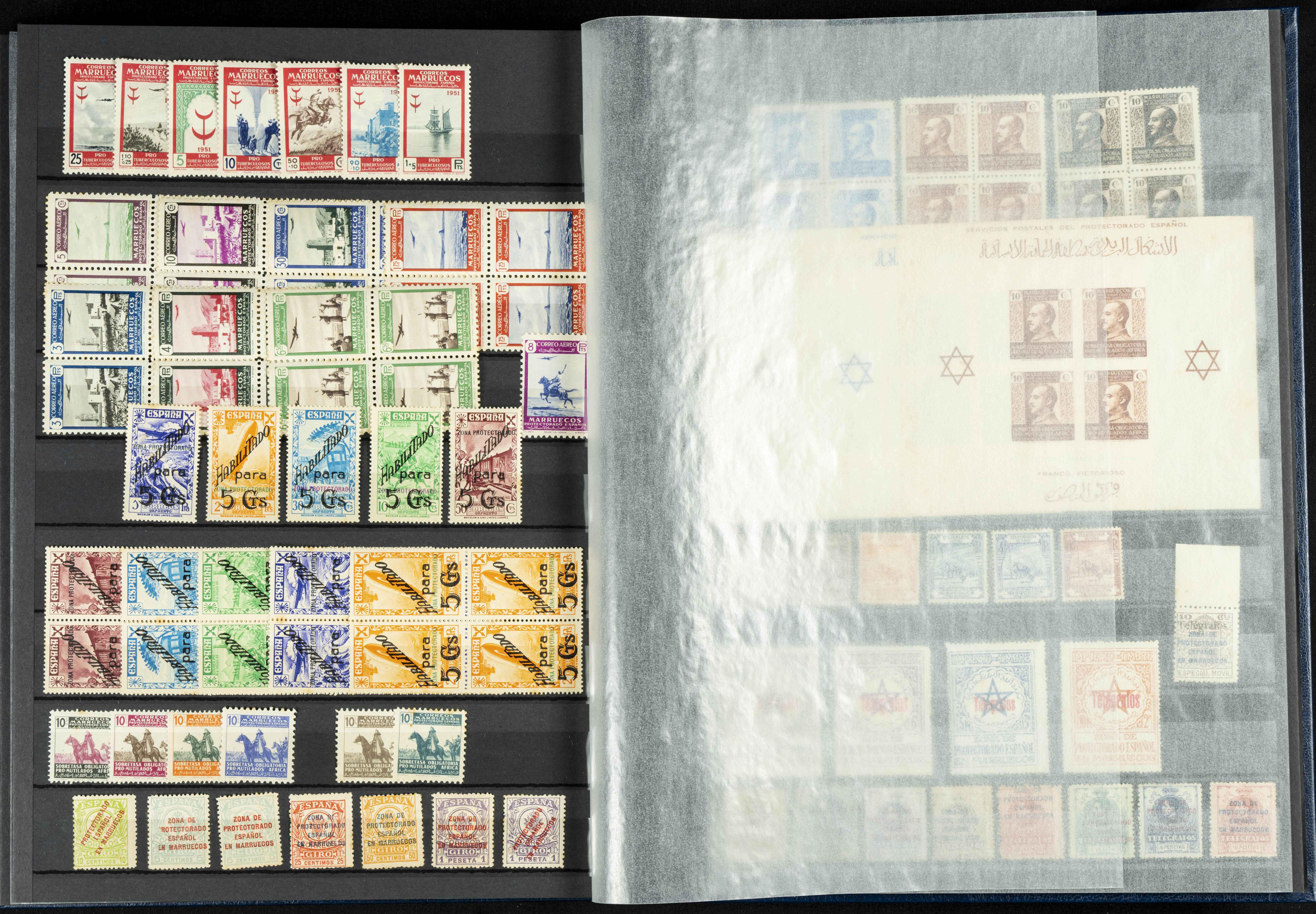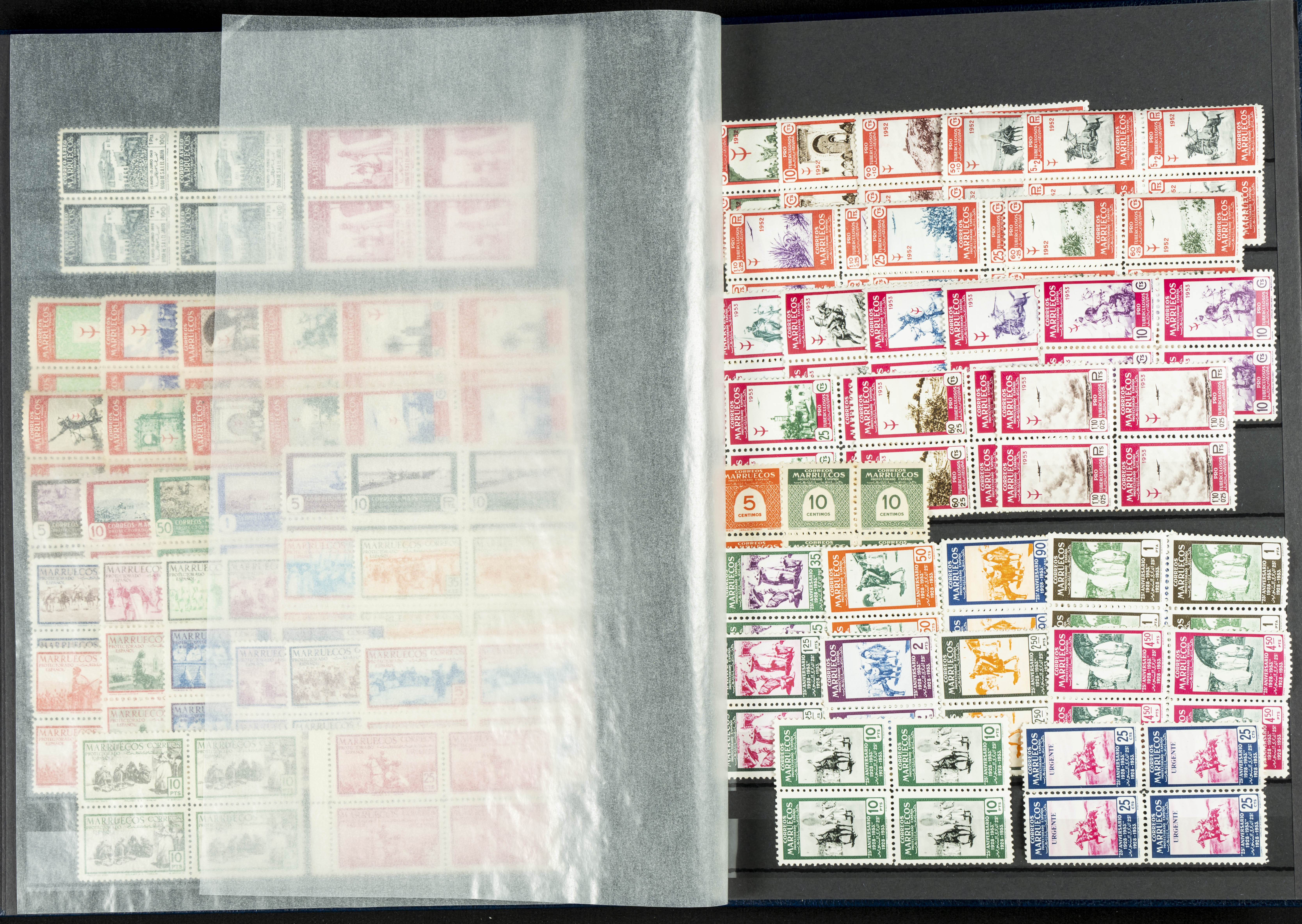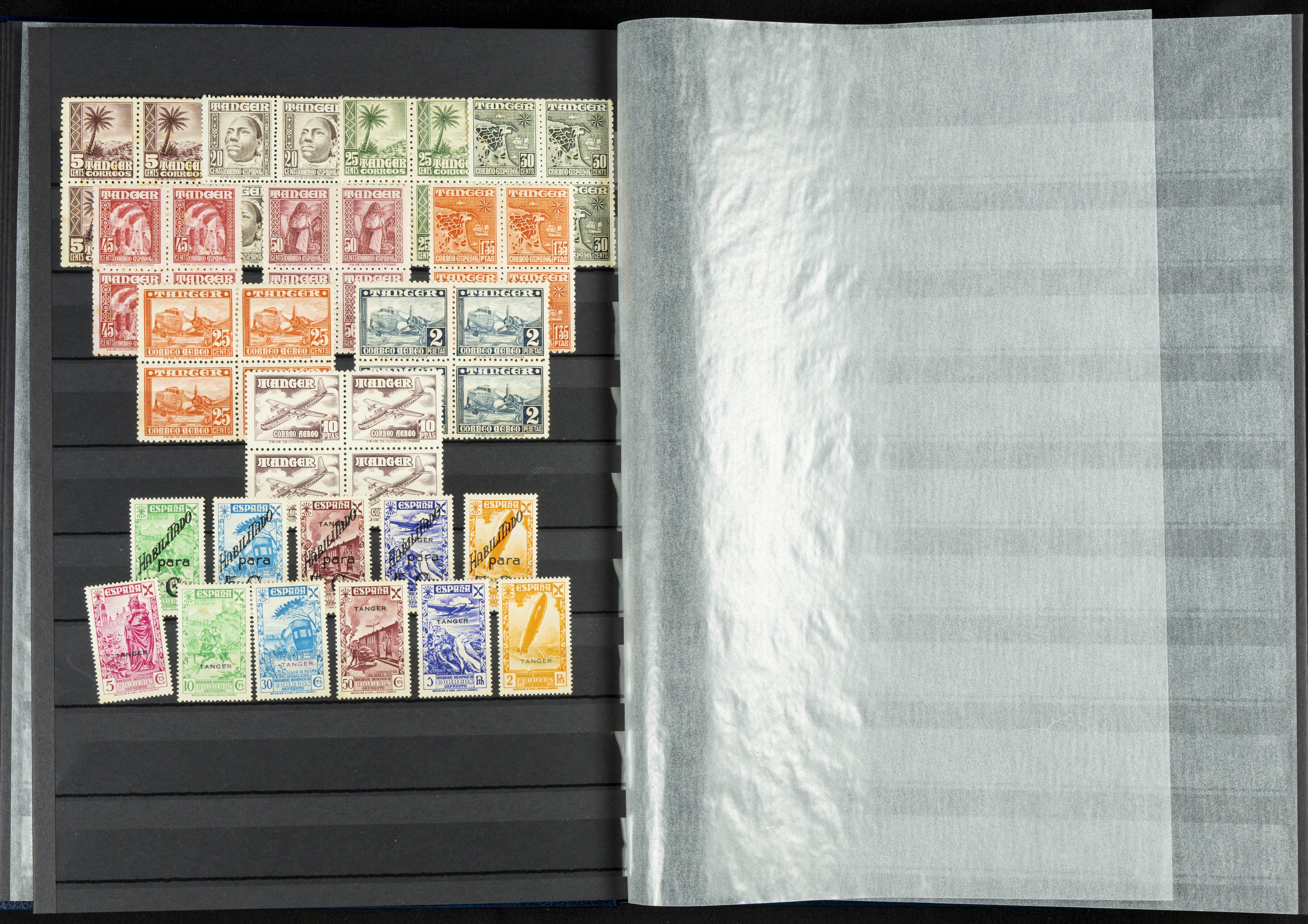 English ★(1903ca). A very interesting collection of Moroccan stamps from 1903 to 1956, in mint condition (some used), with many complete sets of four, especially from the later period. It includes stamps and series from Cape Juby and Tangier, as well as some modern series from Ifni and the Sahara. Extremely high catalog value. A must-see.