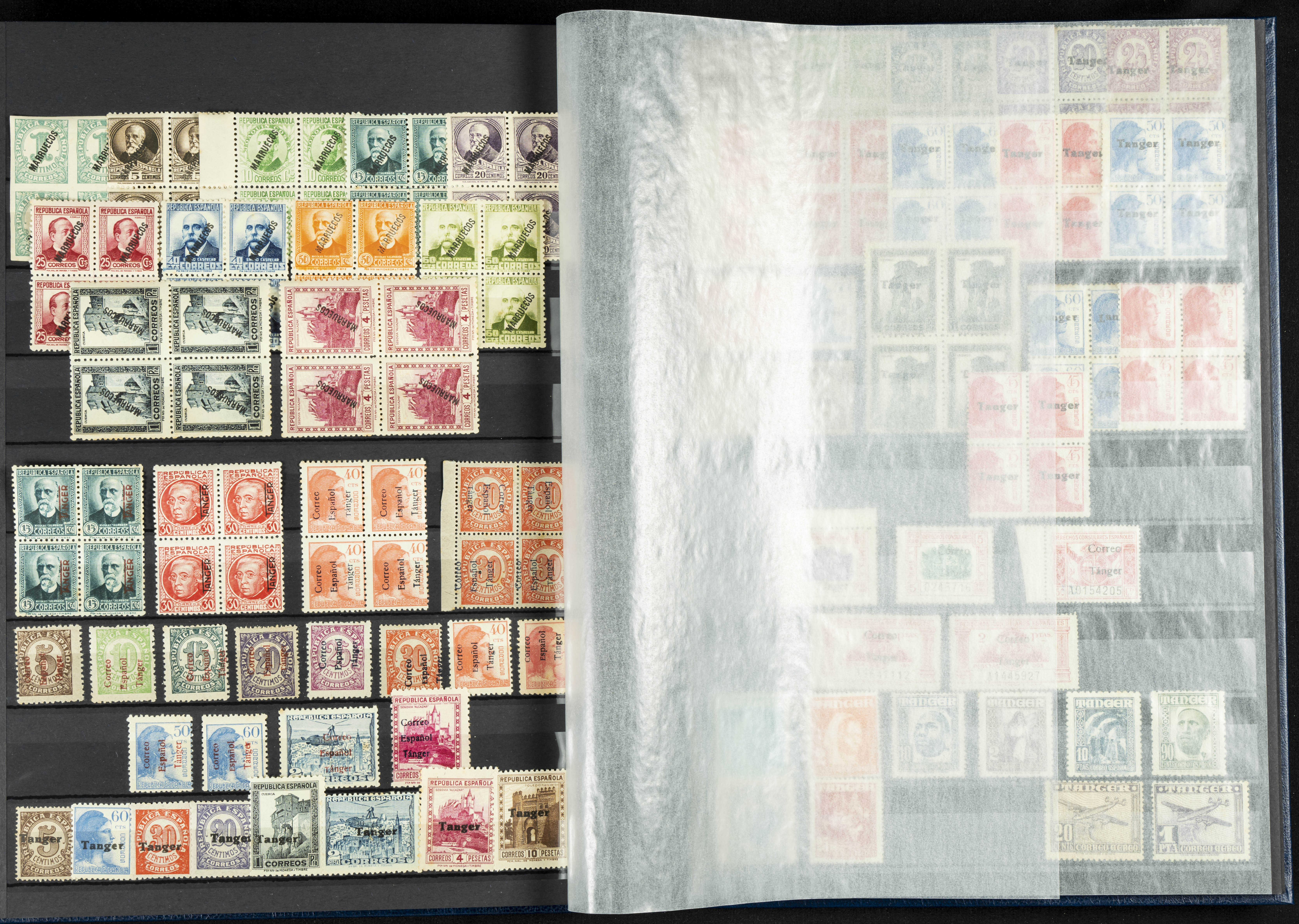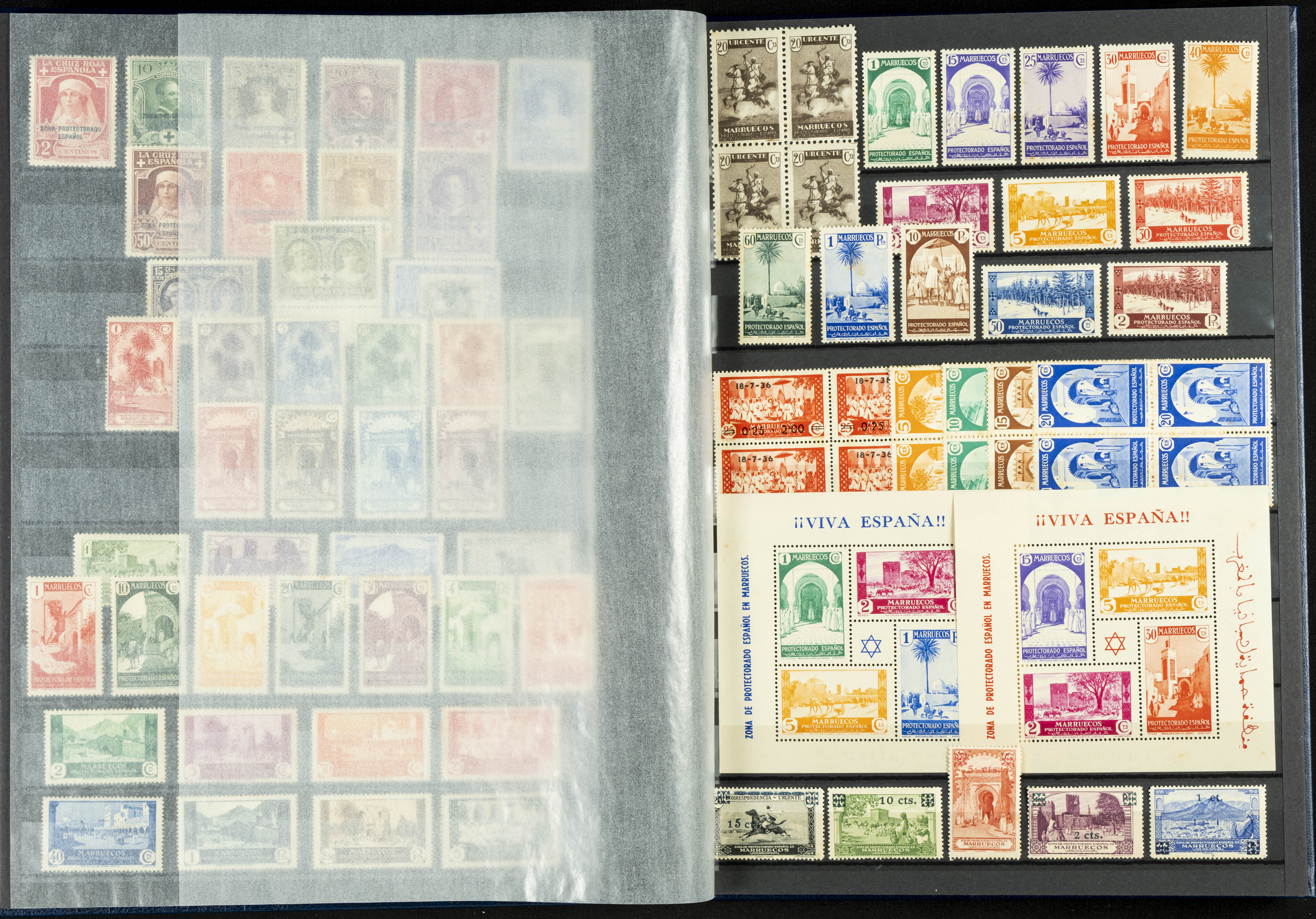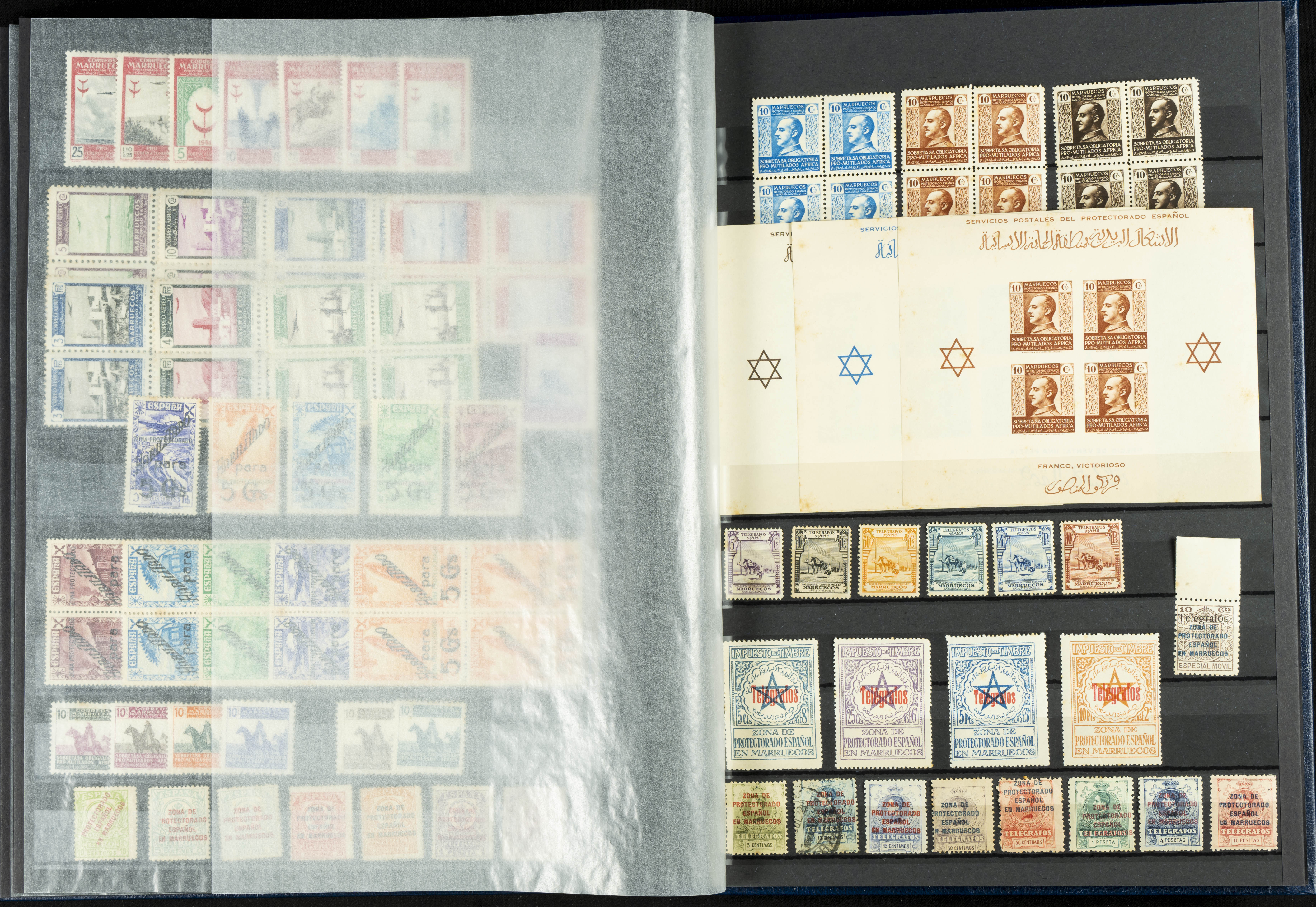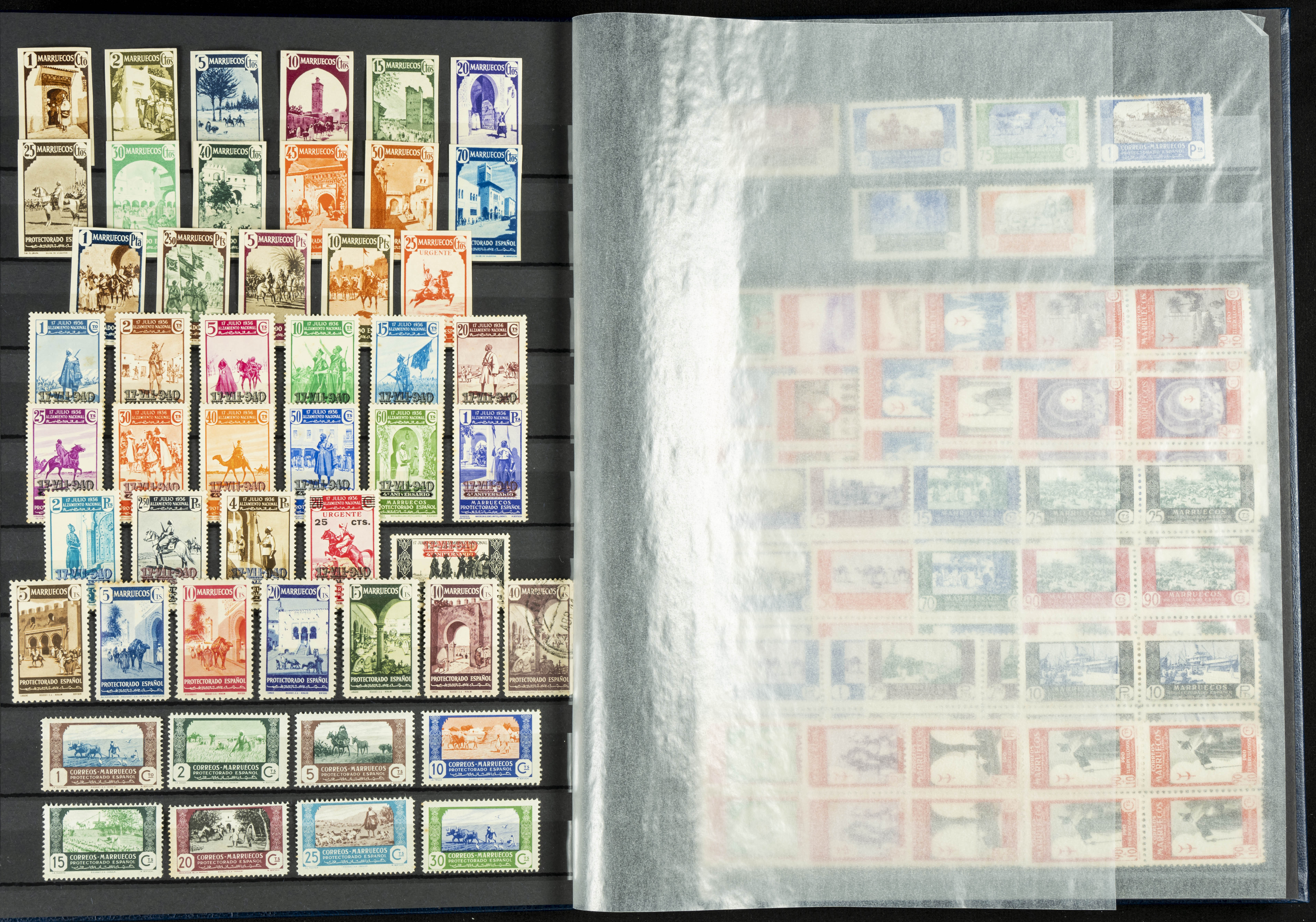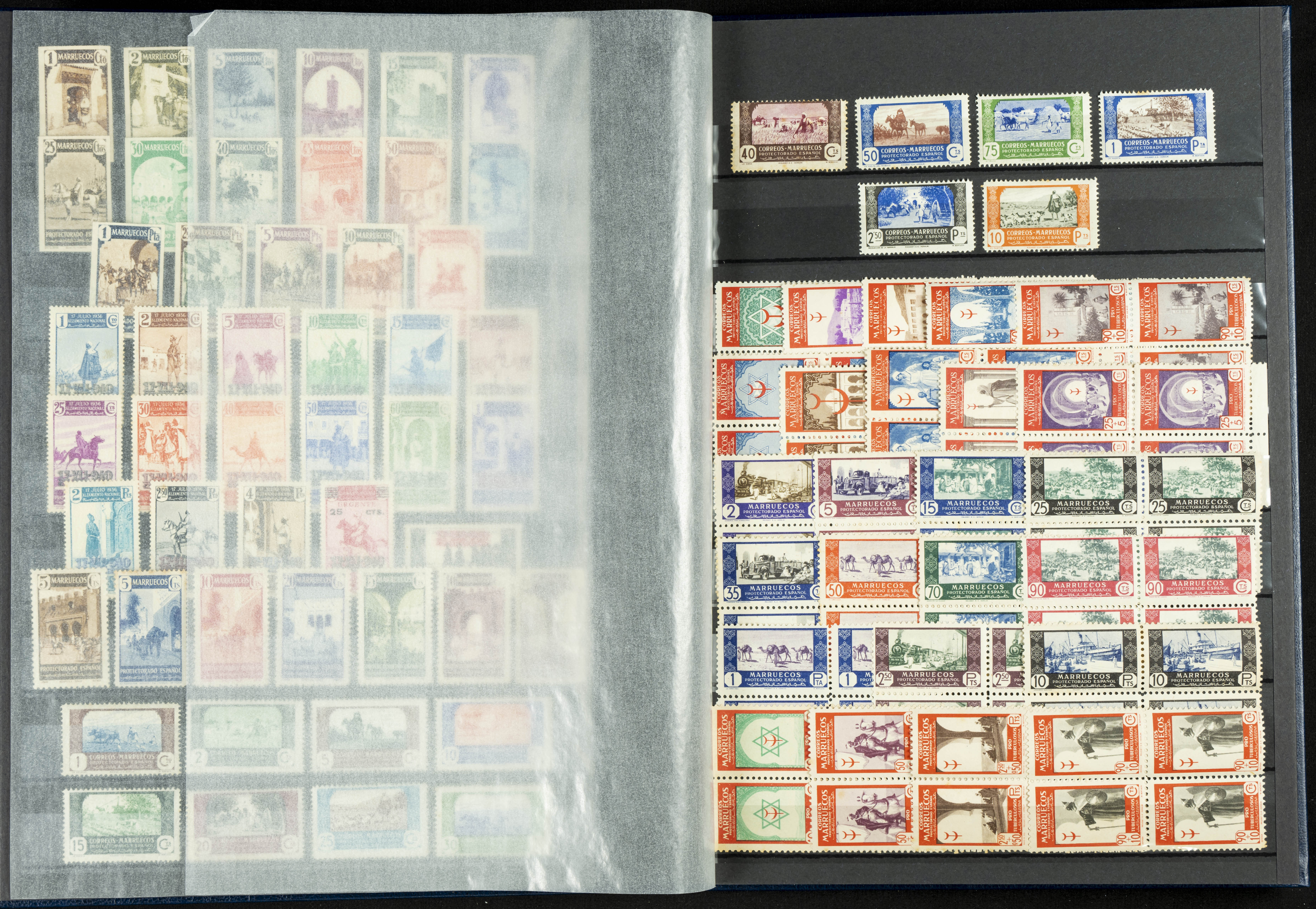English ★(1903ca). A very interesting collection of Moroccan stamps from 1903 to 1956, in mint condition (some used), with many complete sets of four, especially from the later period. It includes stamps and series from Cape Juby and Tangier, as well as some modern series from Ifni and the Sahara. Extremely high catalog value. A must-see.