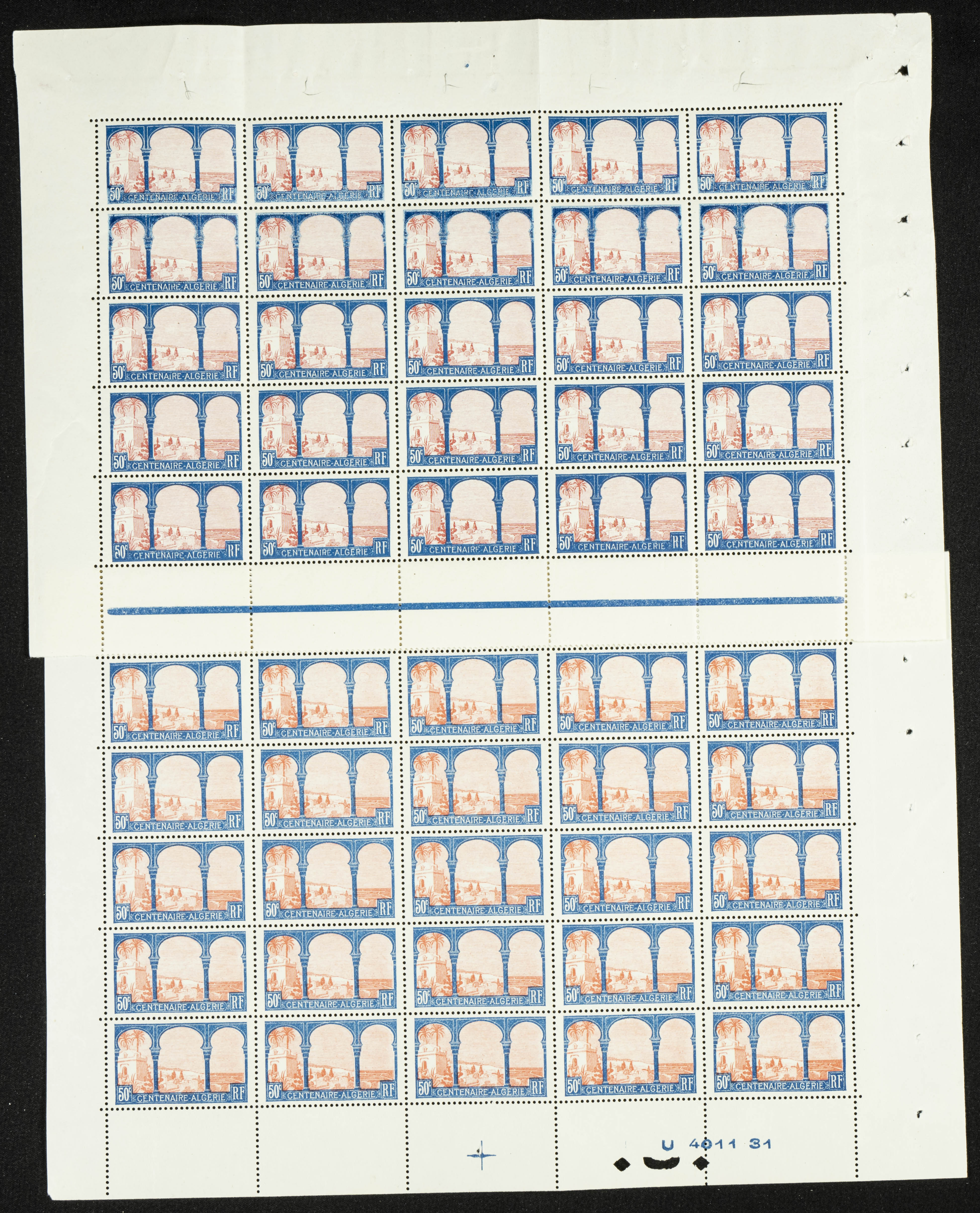 Yvert 263(50). 1930. Set of fifty French stamps CENTENARY OF ALGERIA 1930, in mint condition (twenty-five with different tones). TO BE EXAMINED. Yvert 2026: 350 Euros