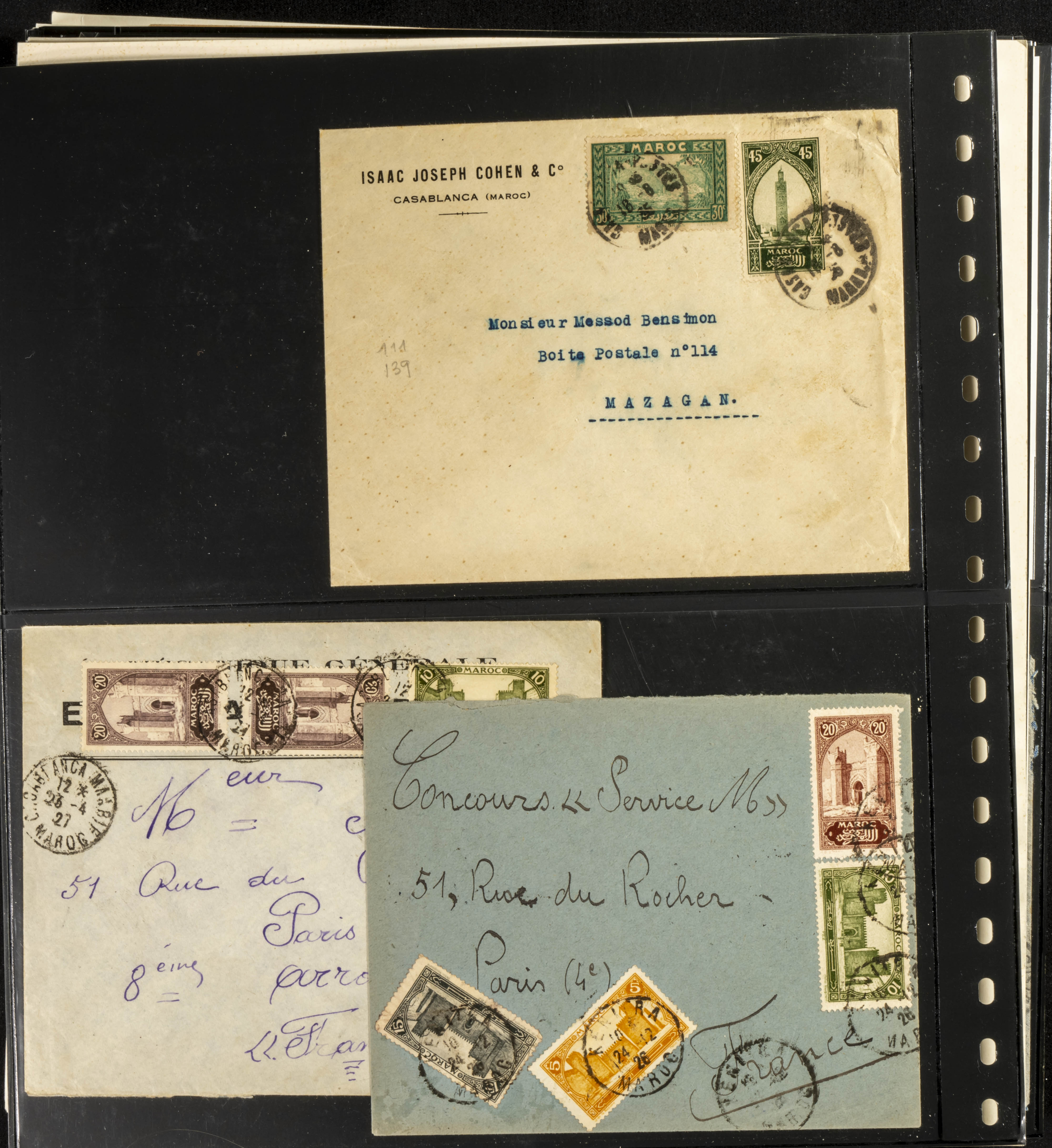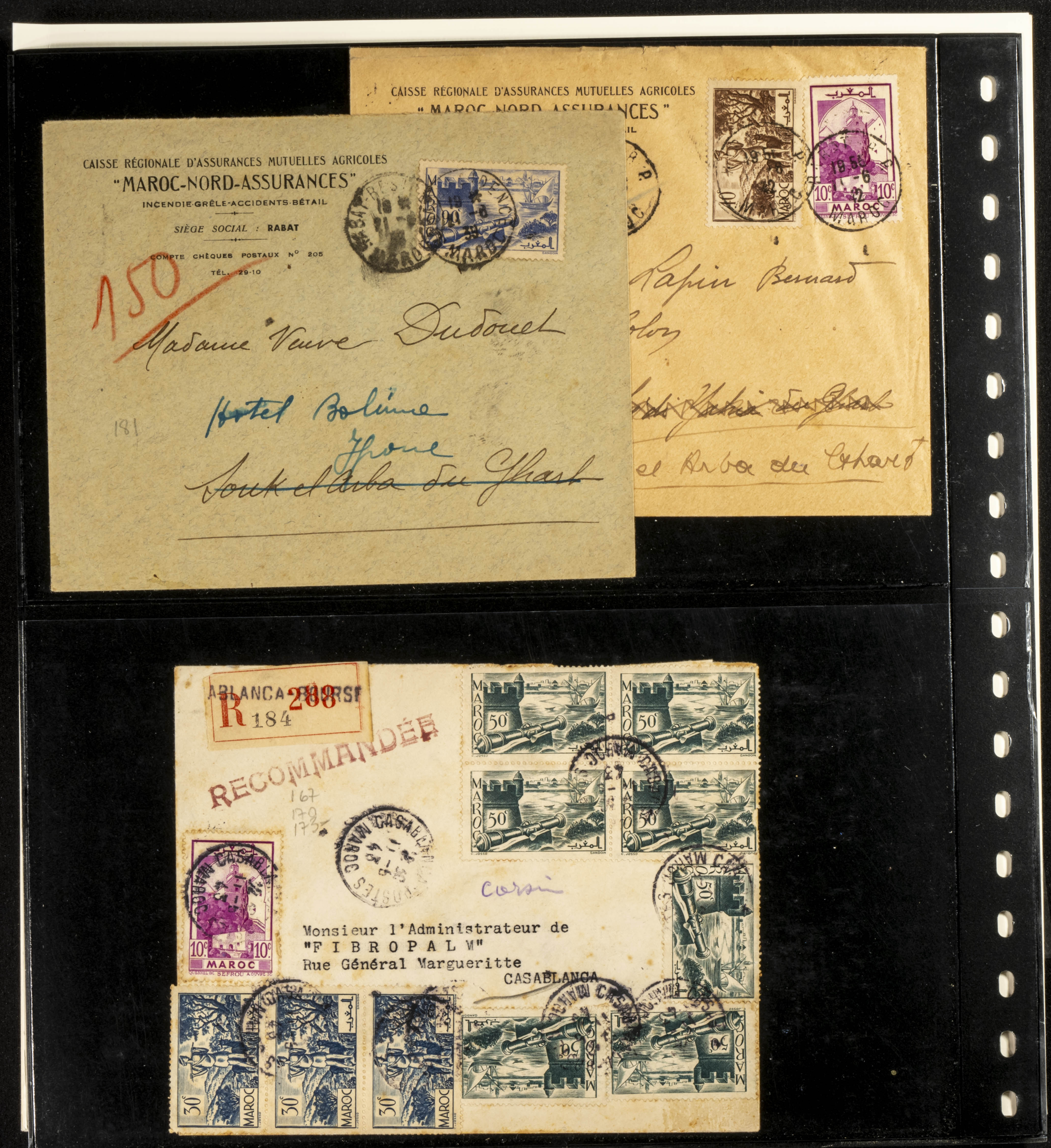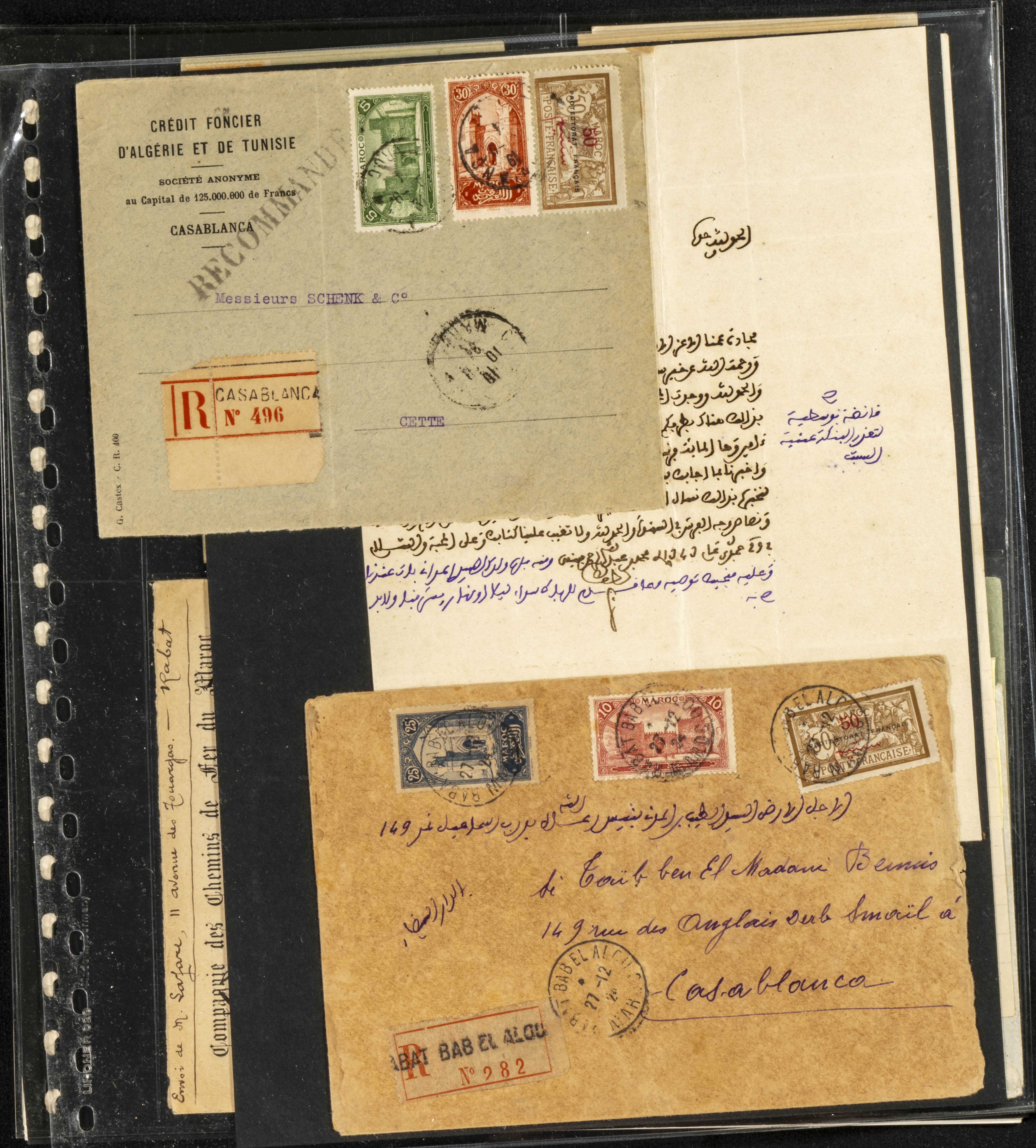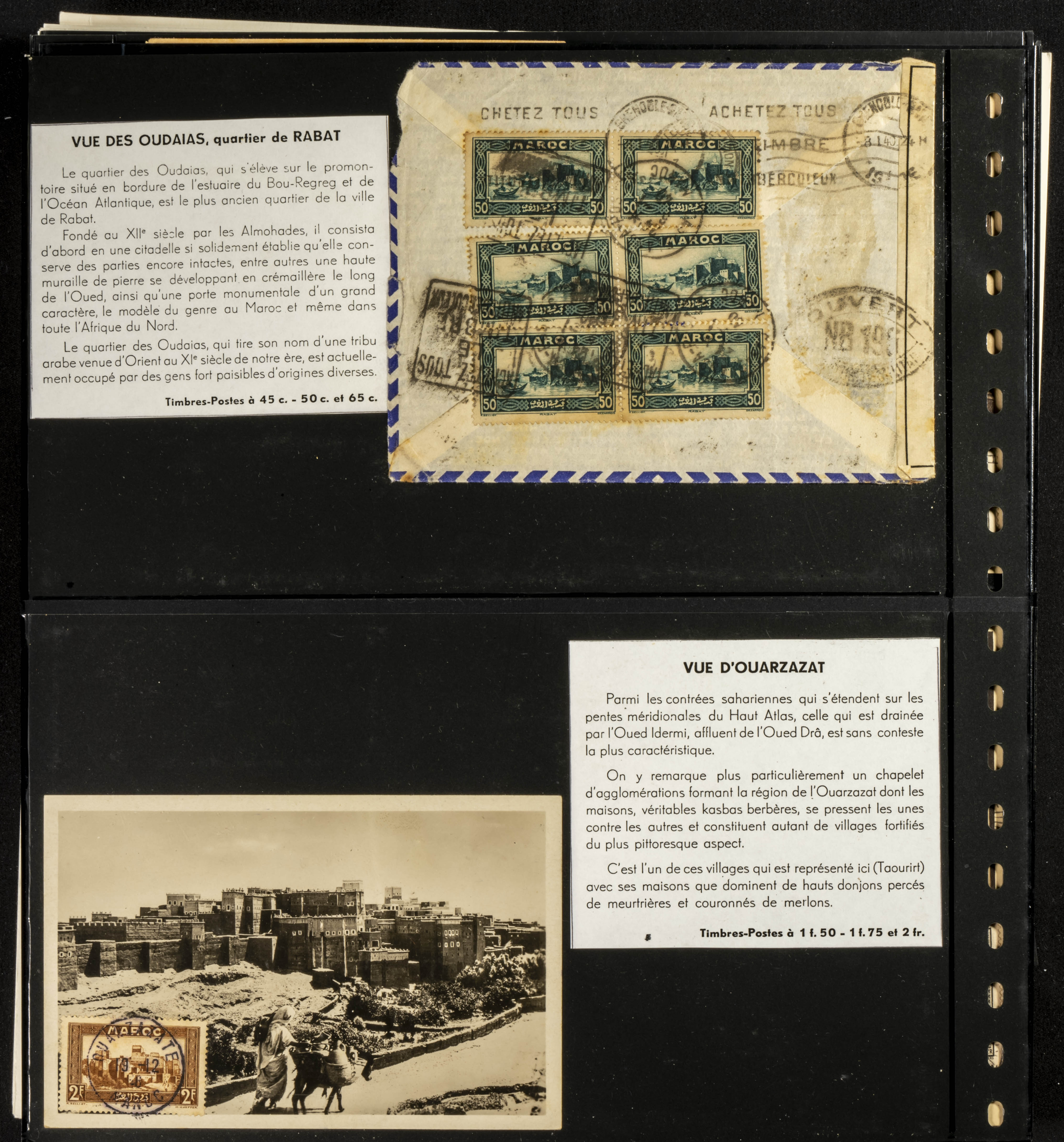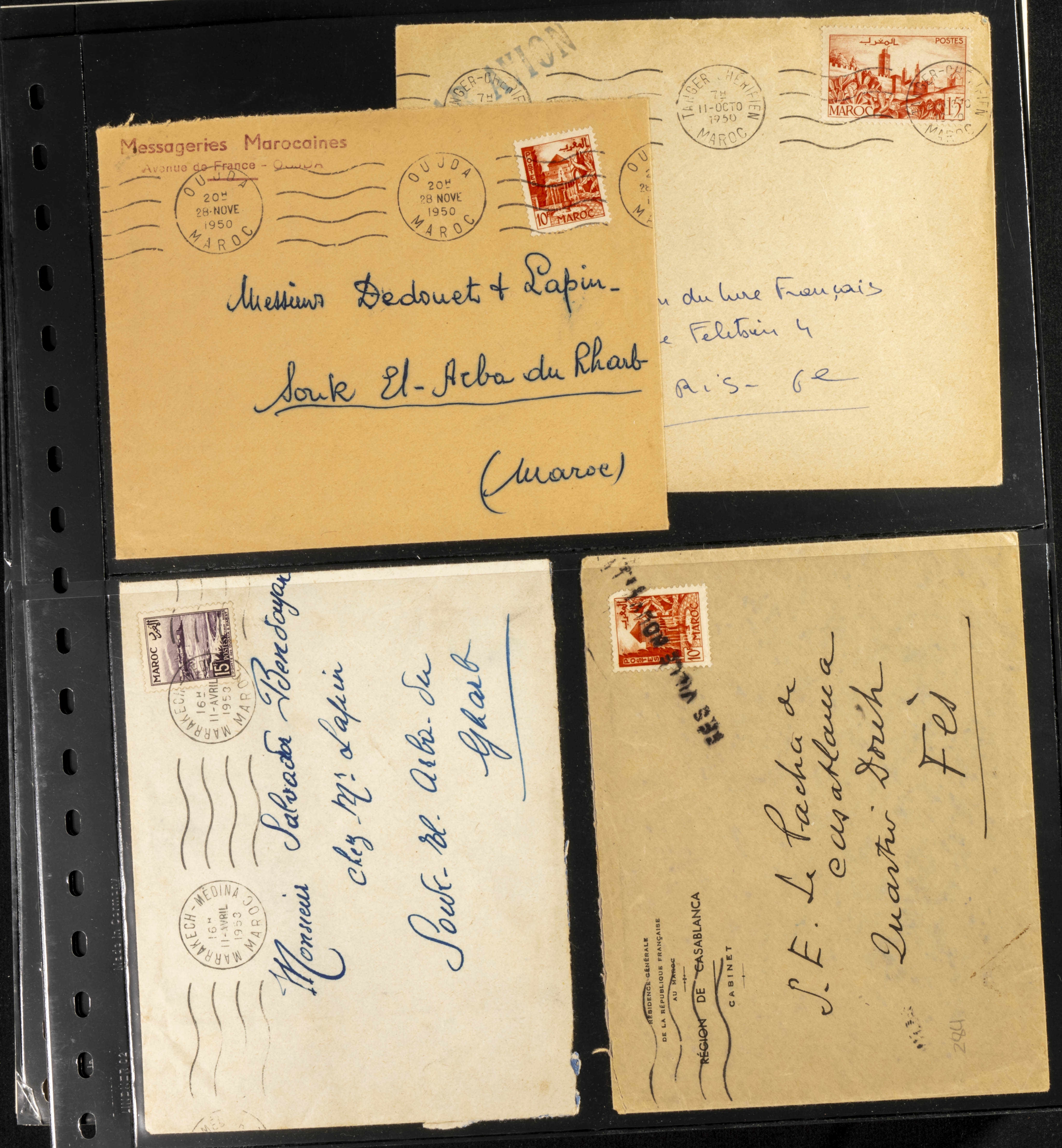 (circa 1891). Spectacular collection of used loose stamps and Postal History of French Morocco between 1891 and 1957. Includes early issues of French stamps with Moroccan postmarks, hundreds of circulated letters and postcards, some sent by registered mail, many with varied letterheads and unusual postage, hundreds of stamps with diverse postmarks (organized by issue alongside the letters), machine-printed postage, airmail, etc. EXAMINATION IS ESSENTIAL.