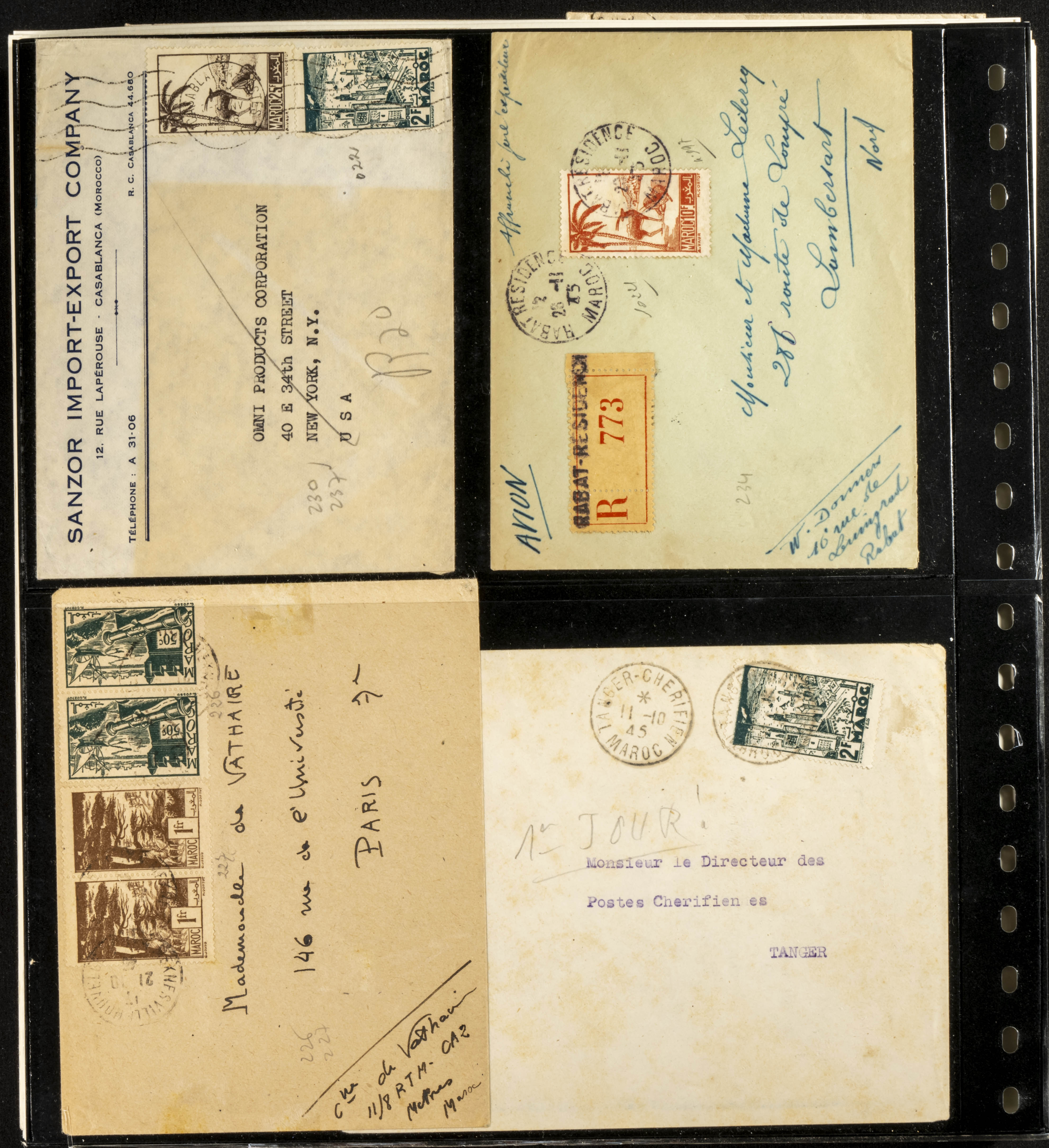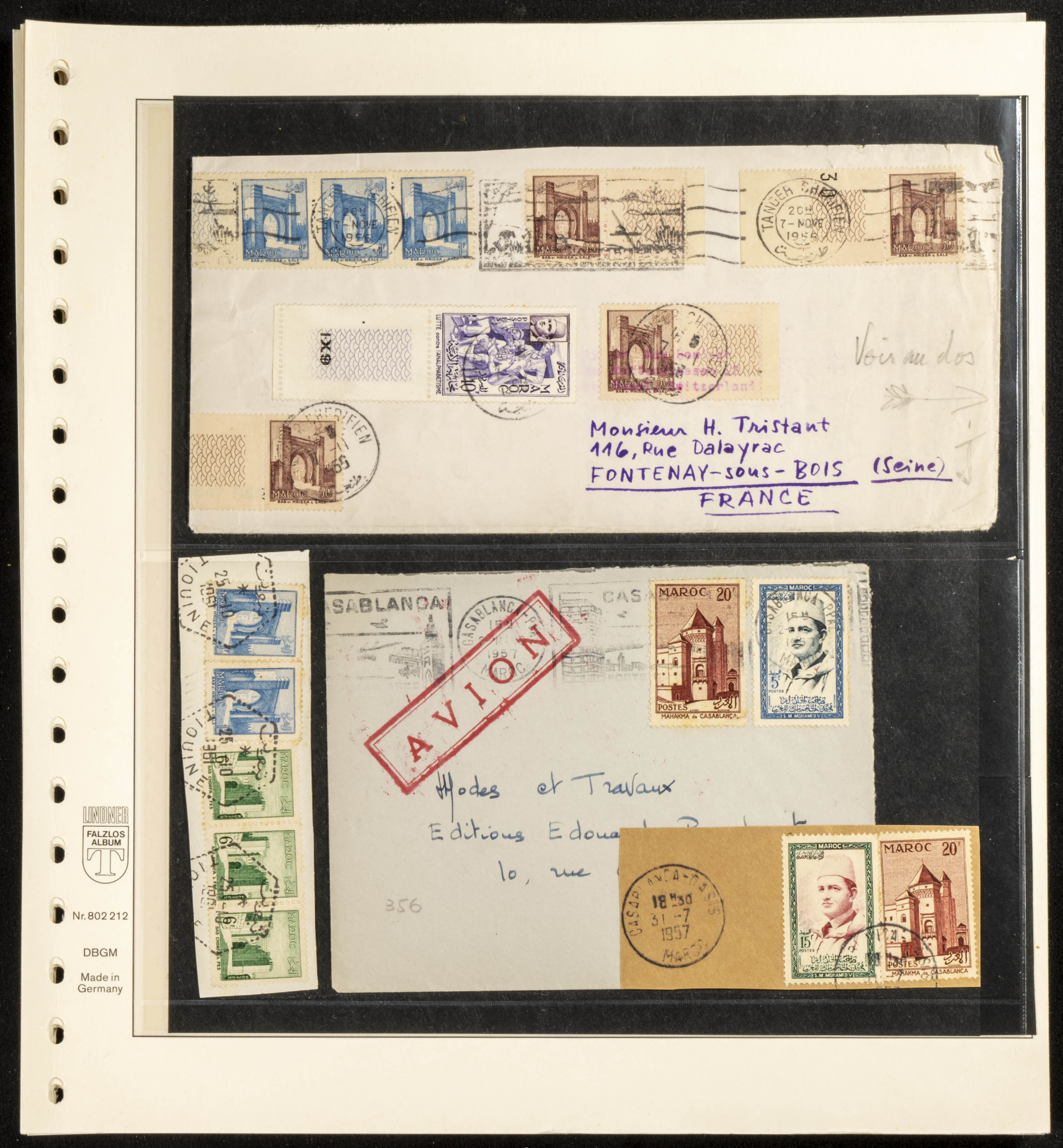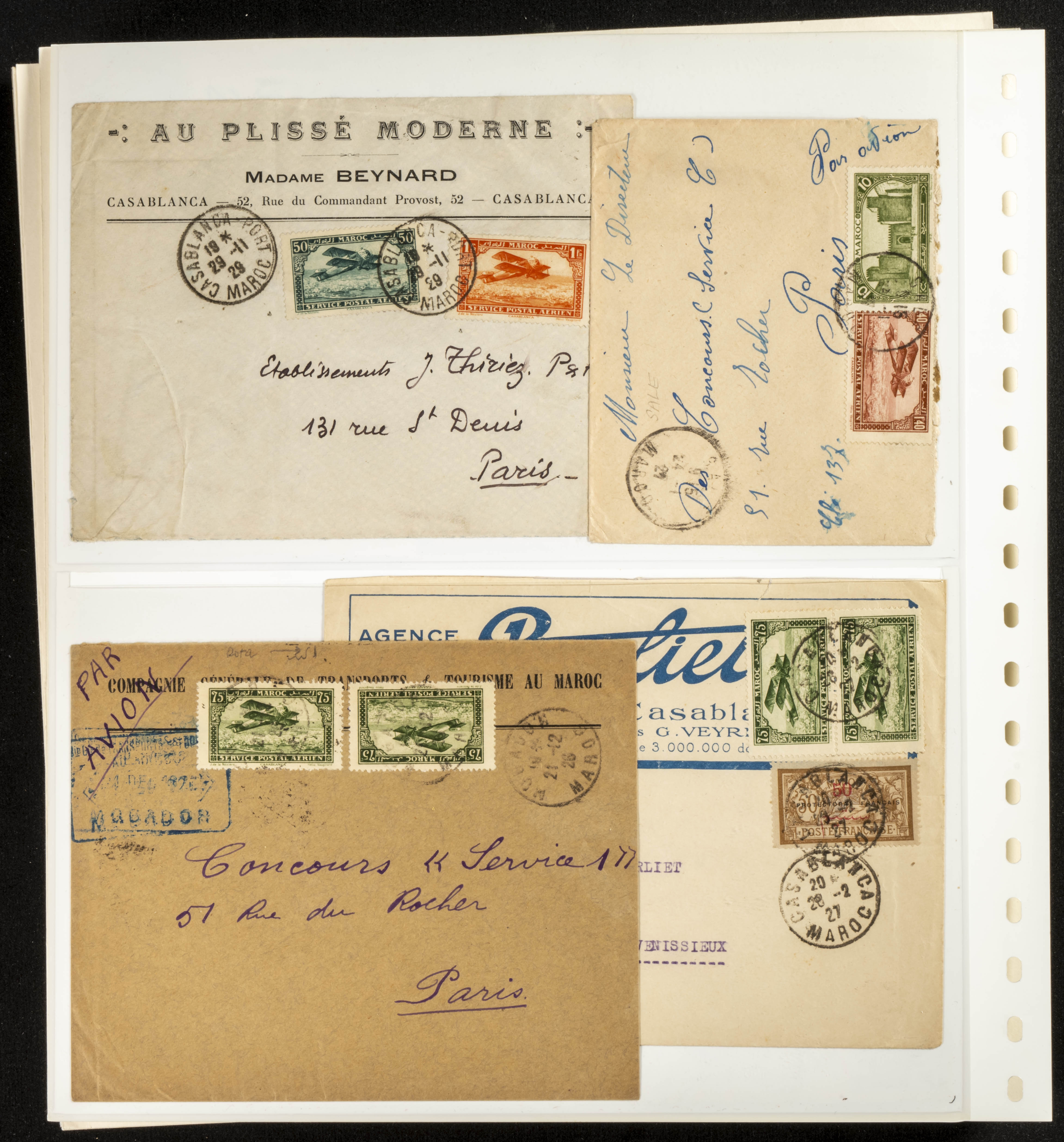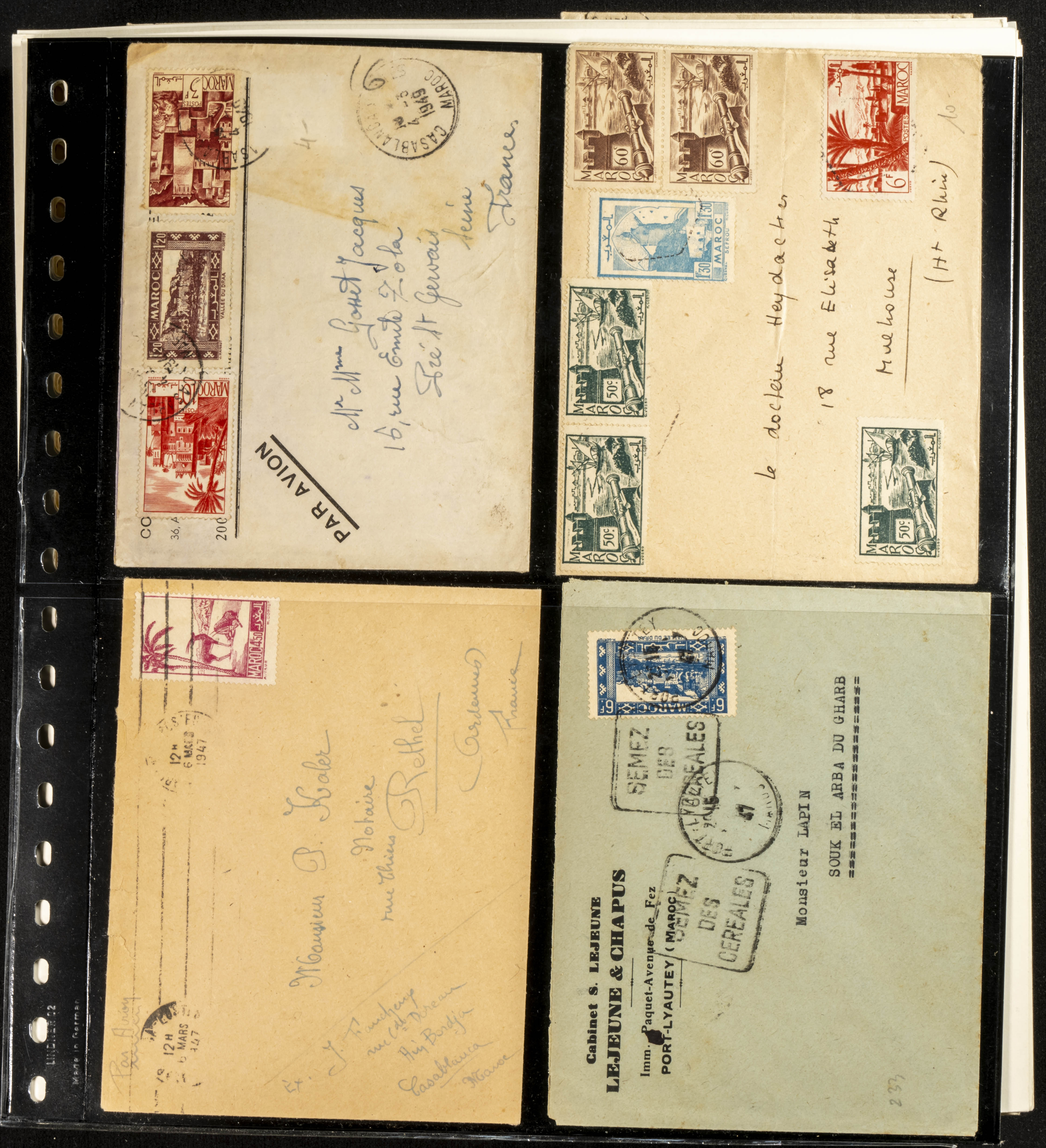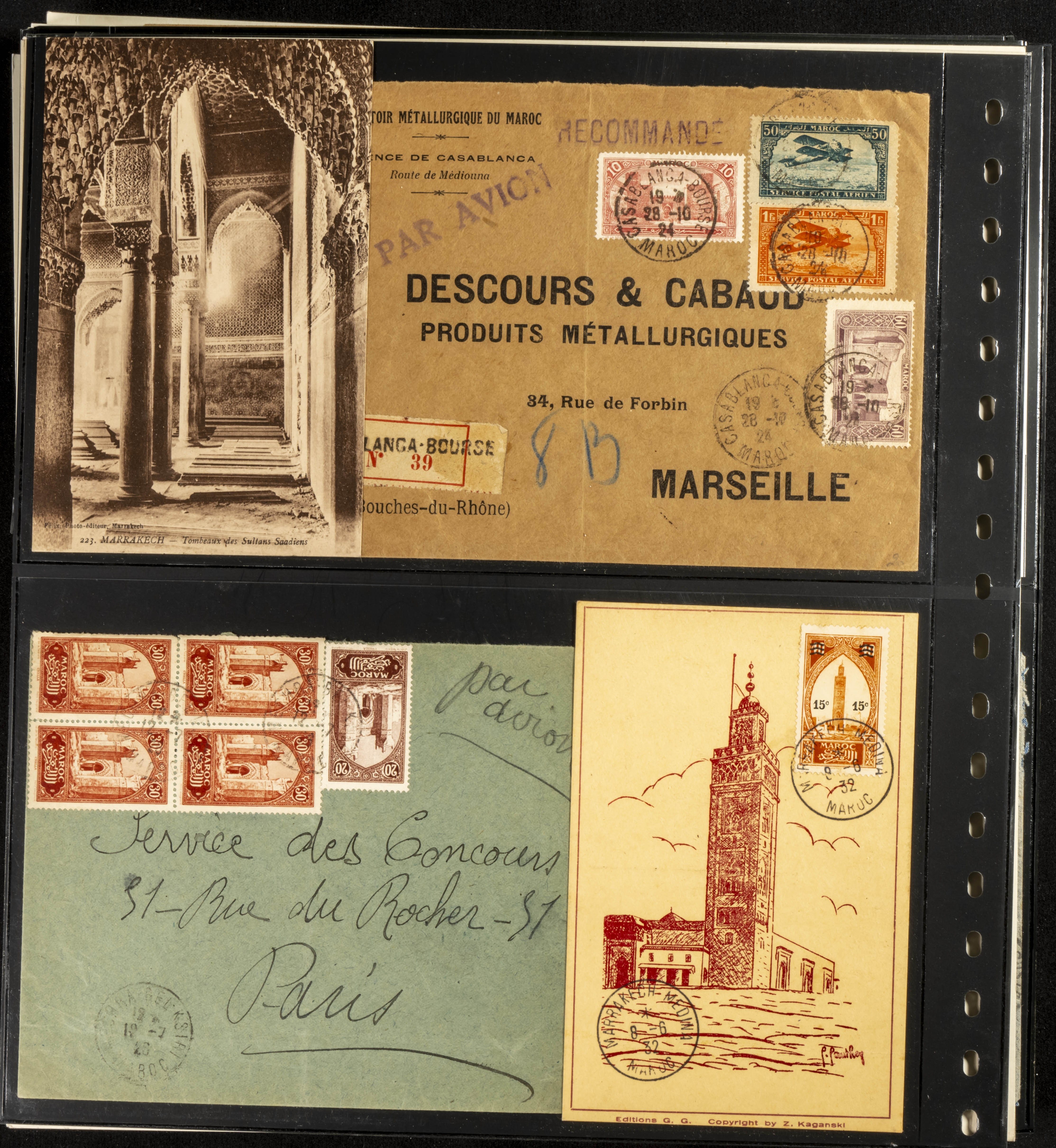 (circa 1891). Spectacular collection of used loose stamps and Postal History of French Morocco between 1891 and 1957. Includes early issues of French stamps with Moroccan postmarks, hundreds of circulated letters and postcards, some sent by registered mail, many with varied letterheads and unusual postage, hundreds of stamps with diverse postmarks (organized by issue alongside the letters), machine-printed postage, airmail, etc. EXAMINATION IS ESSENTIAL.