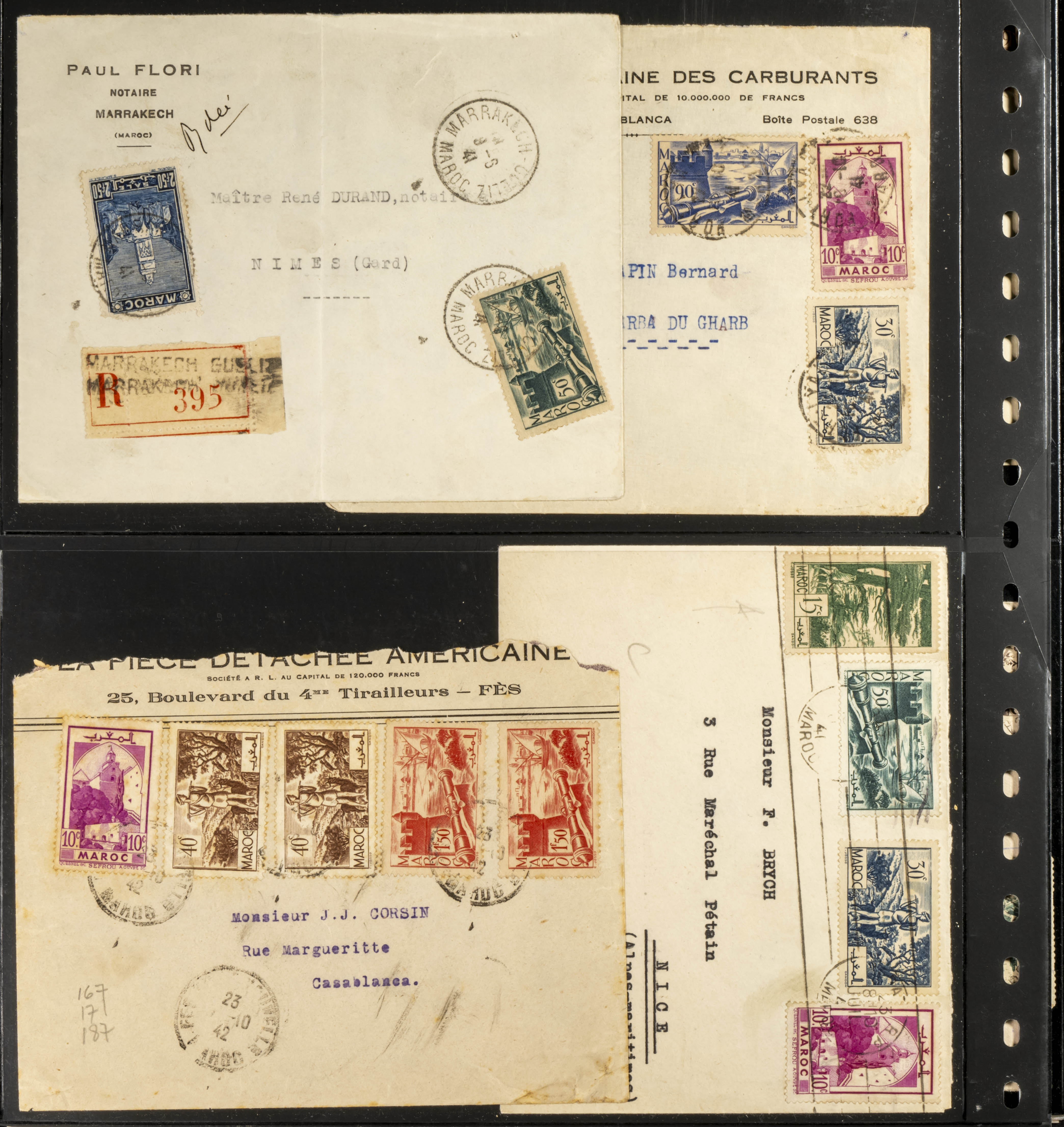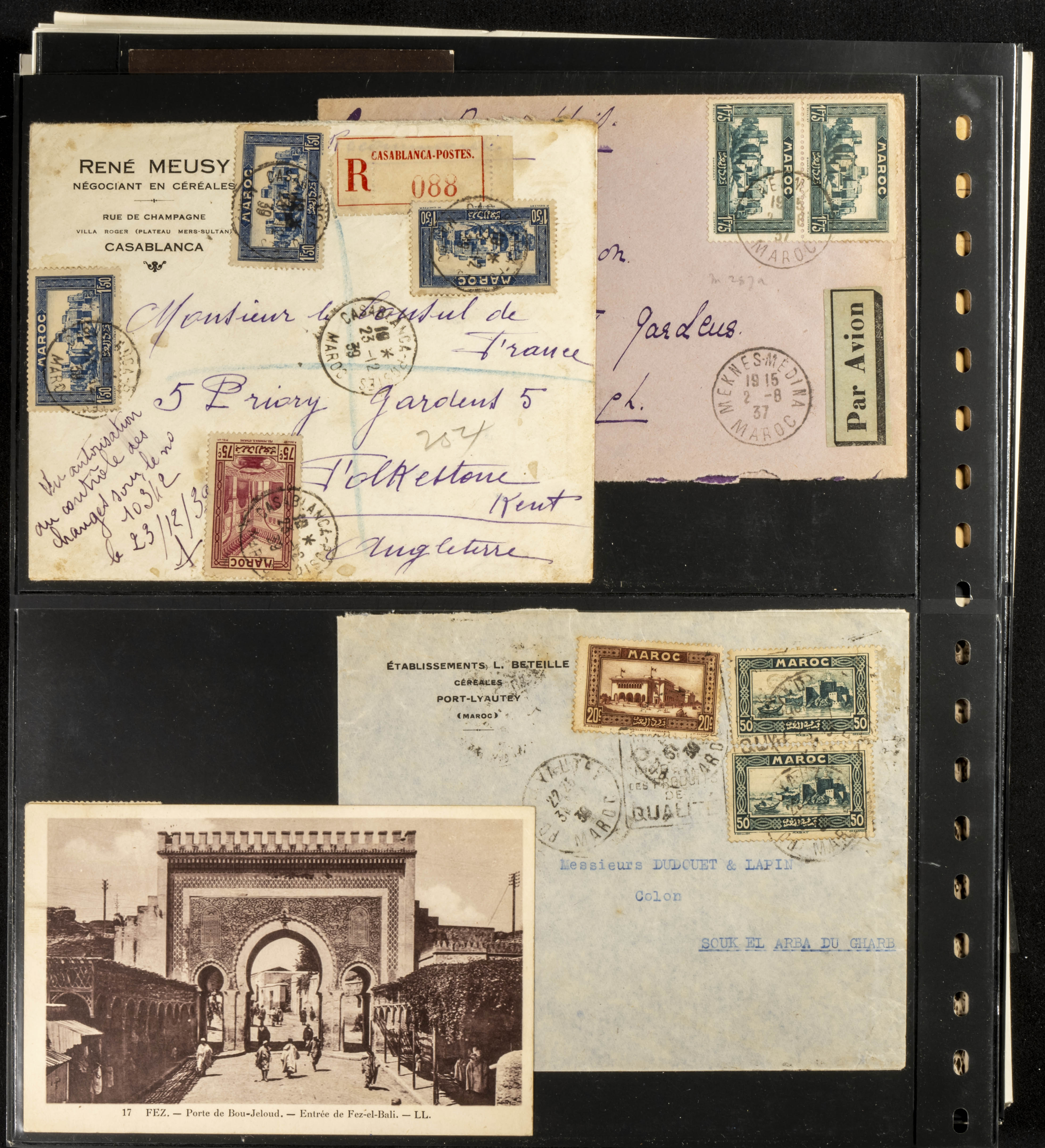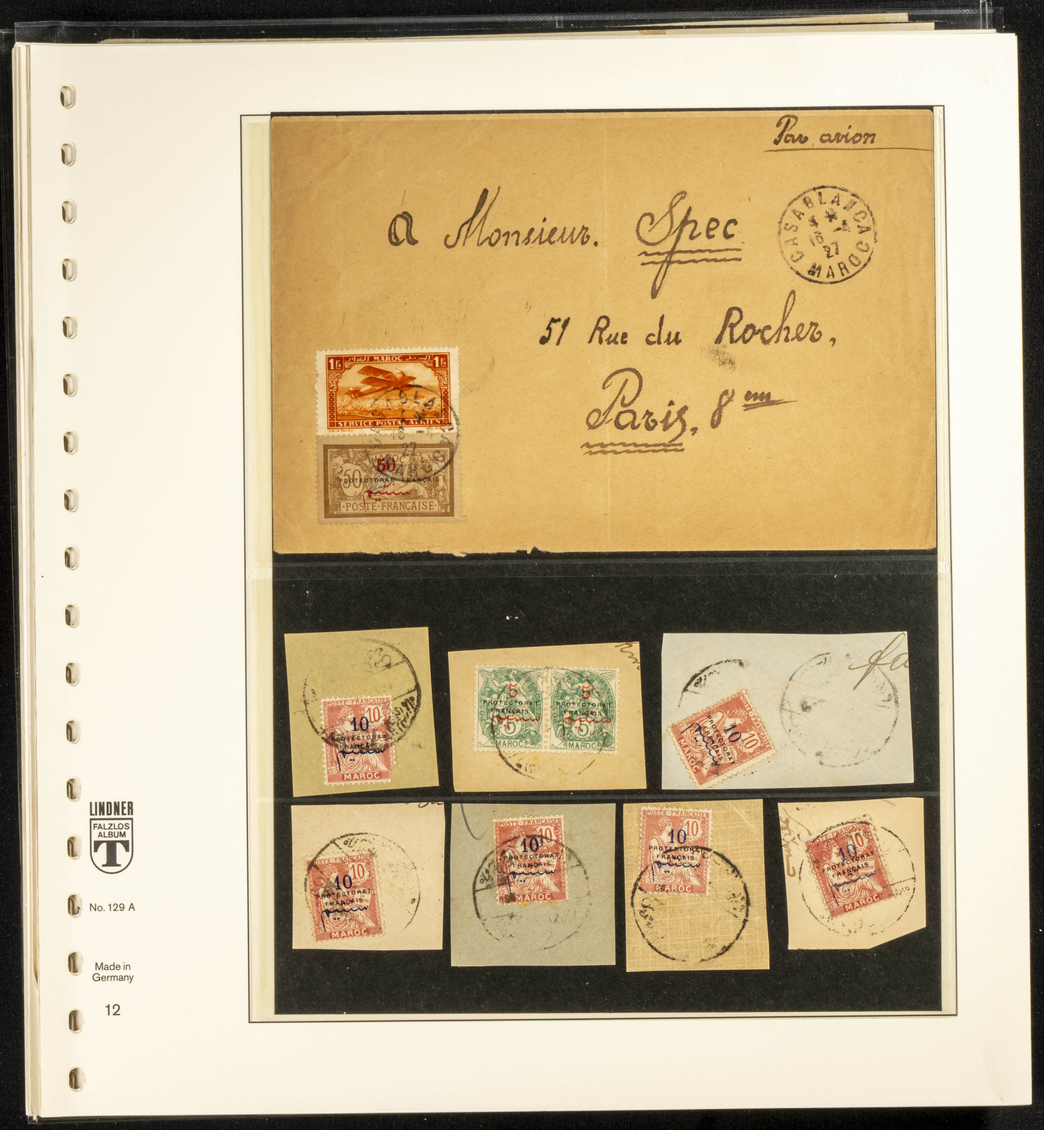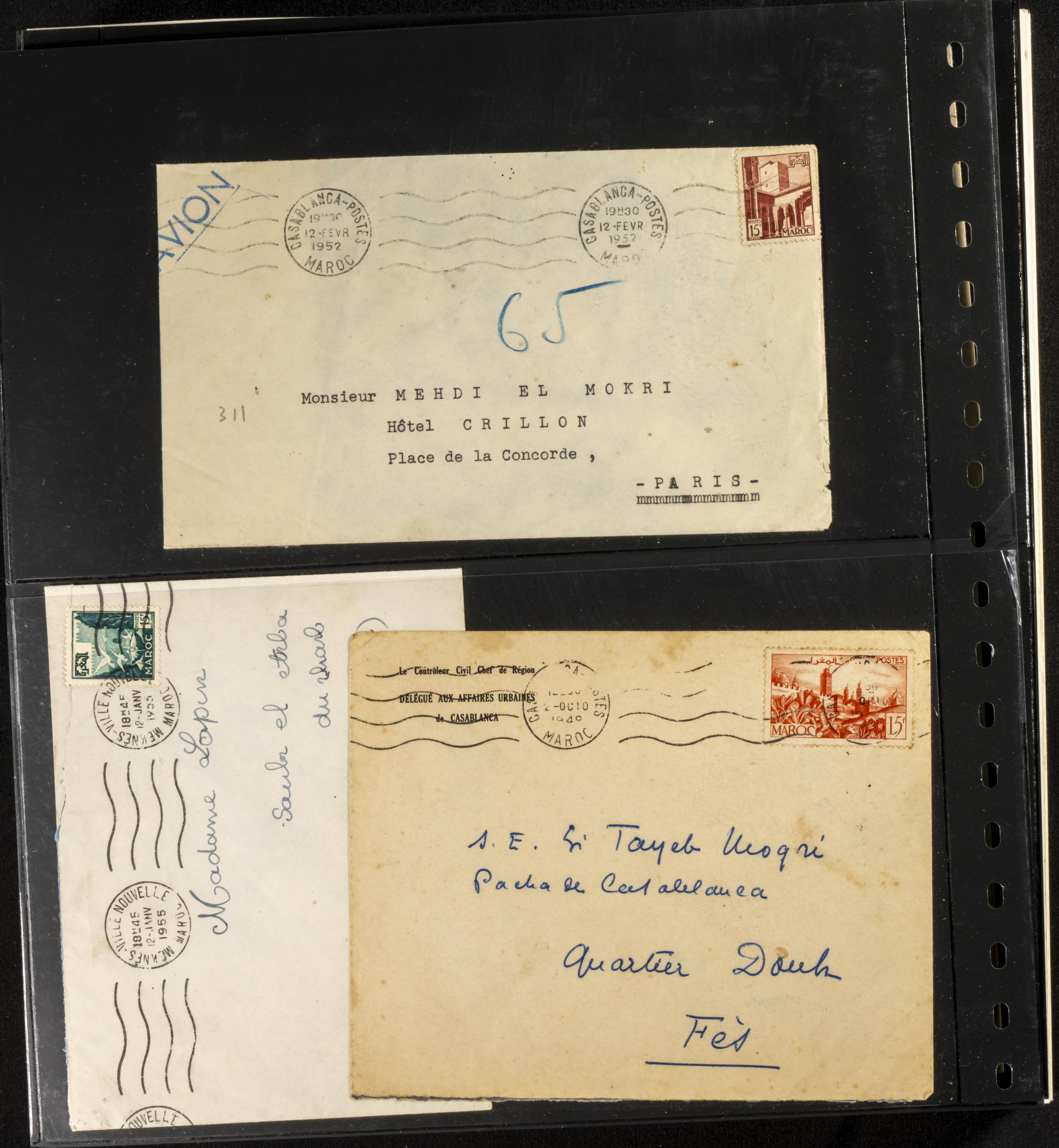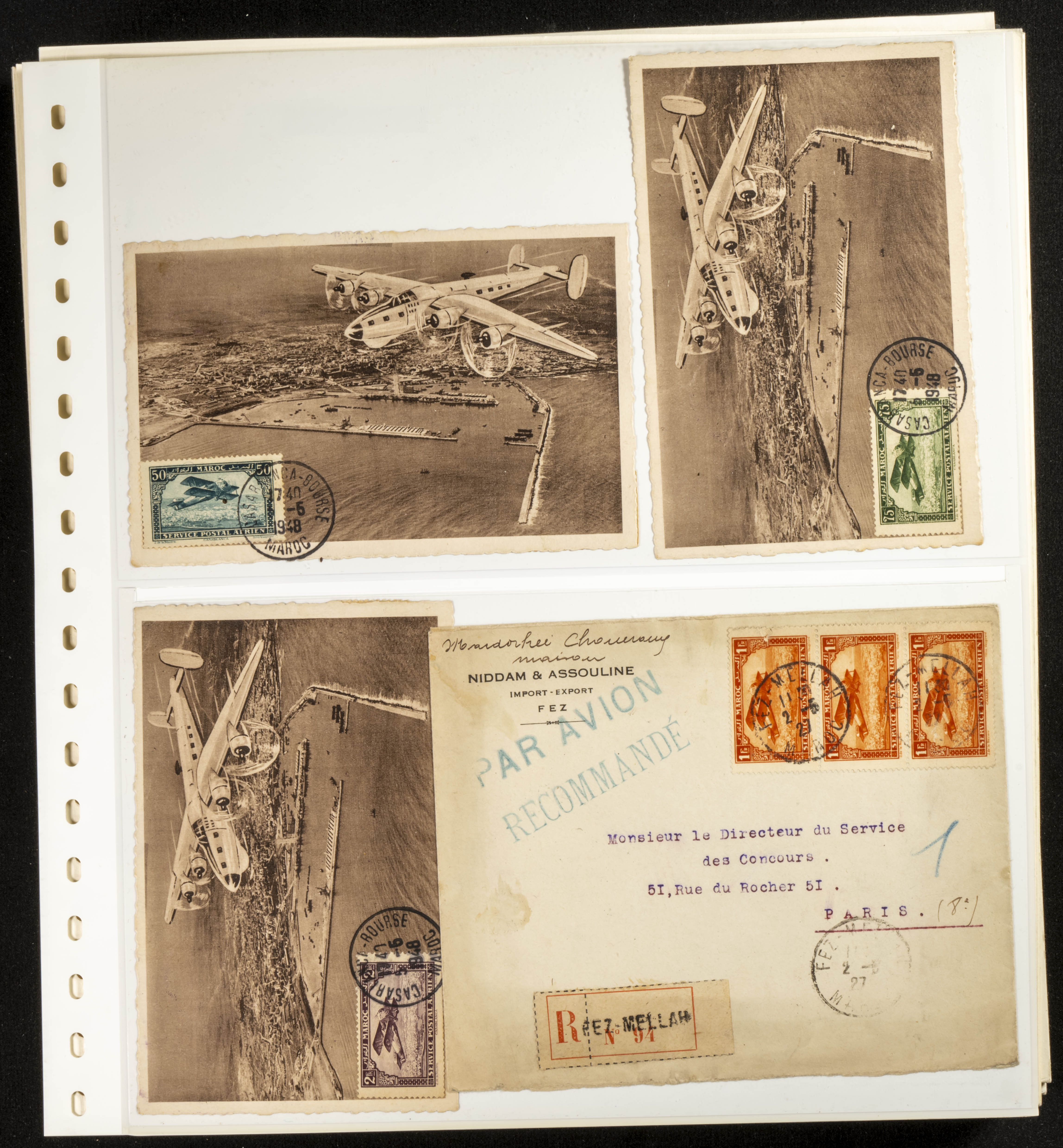 (circa 1891). Spectacular collection of used loose stamps and Postal History of French Morocco between 1891 and 1957. Includes early issues of French stamps with Moroccan postmarks, hundreds of circulated letters and postcards, some sent by registered mail, many with varied letterheads and unusual postage, hundreds of stamps with diverse postmarks (organized by issue alongside the letters), machine-printed postage, airmail, etc. EXAMINATION IS ESSENTIAL.