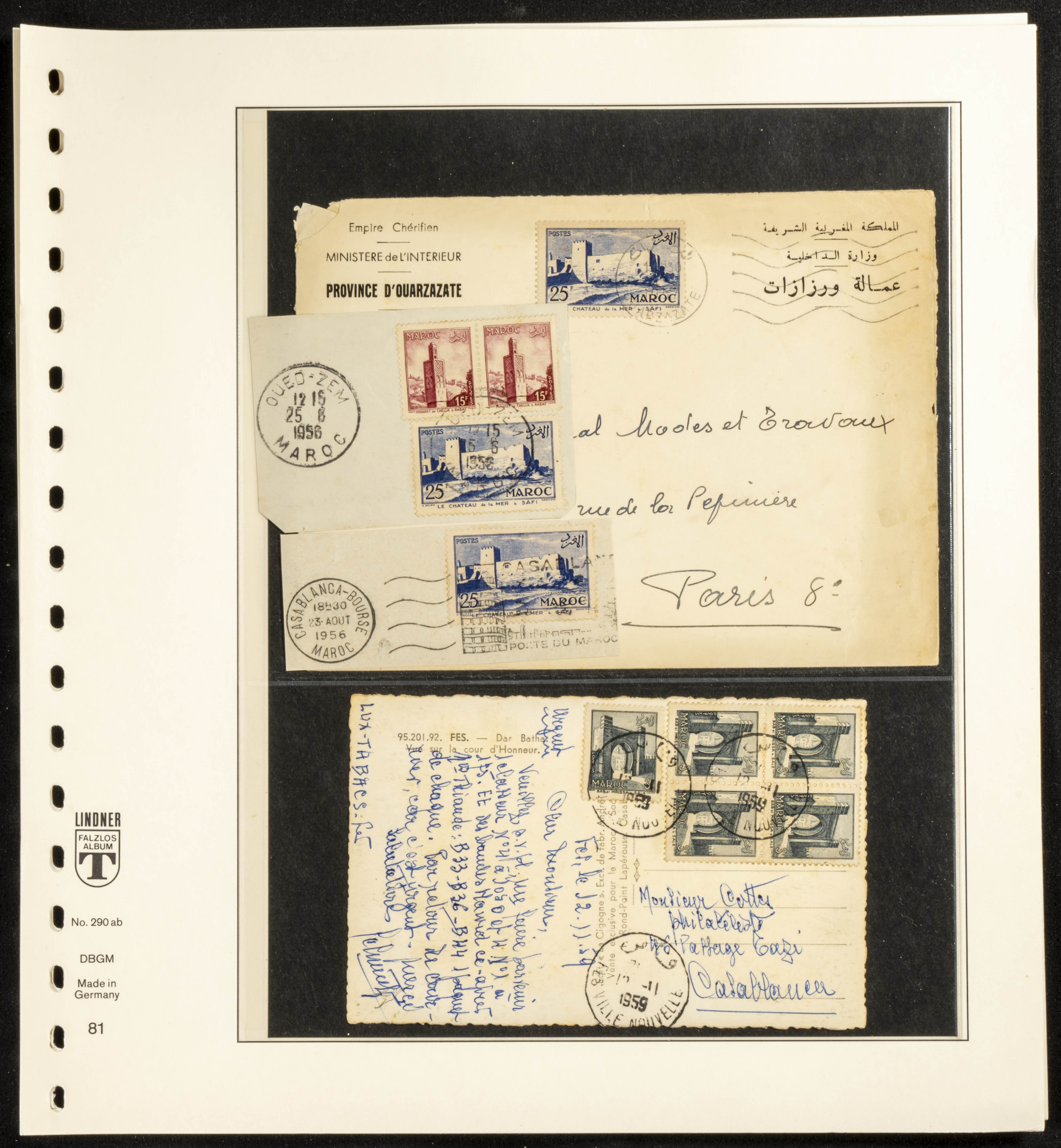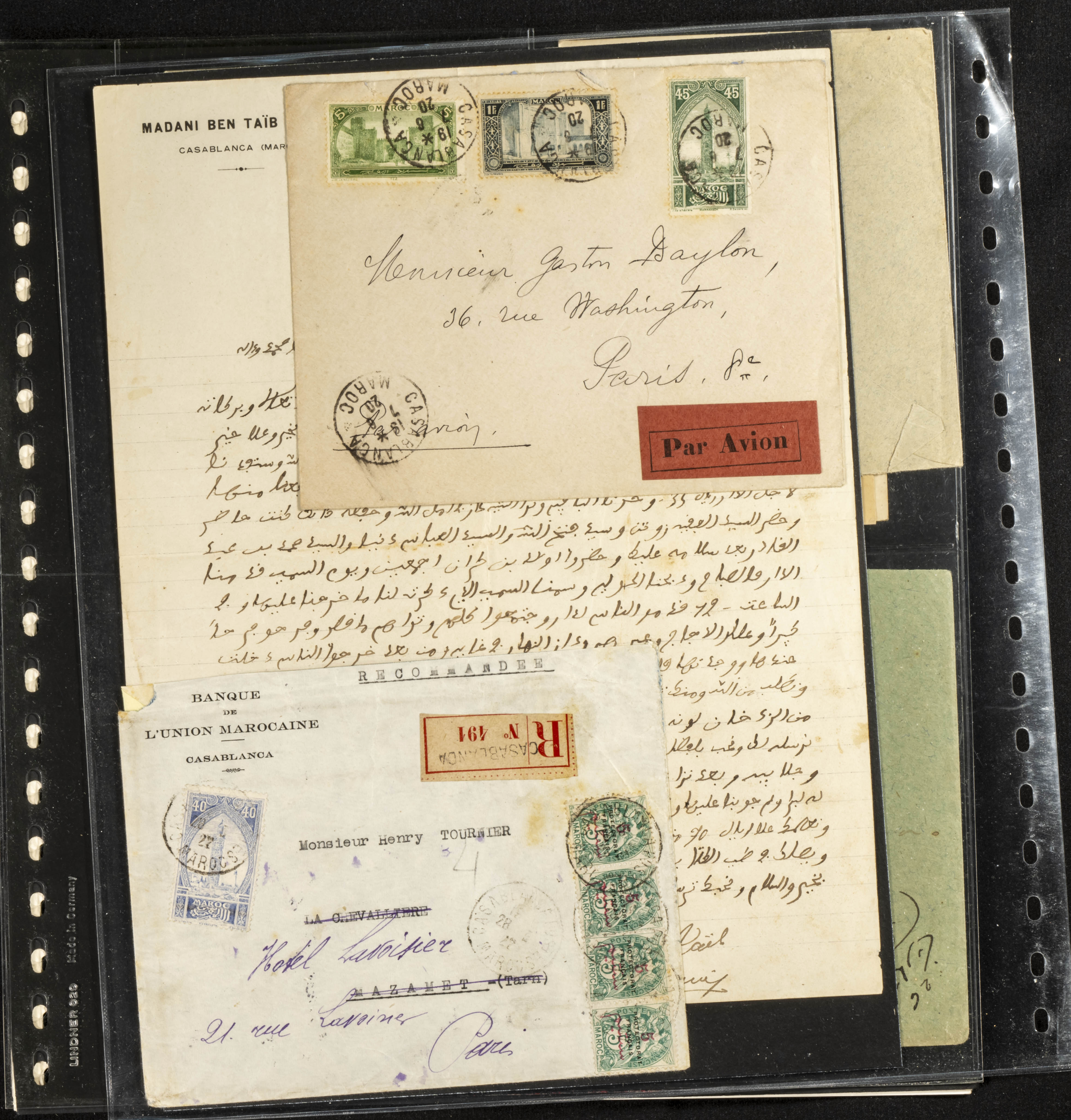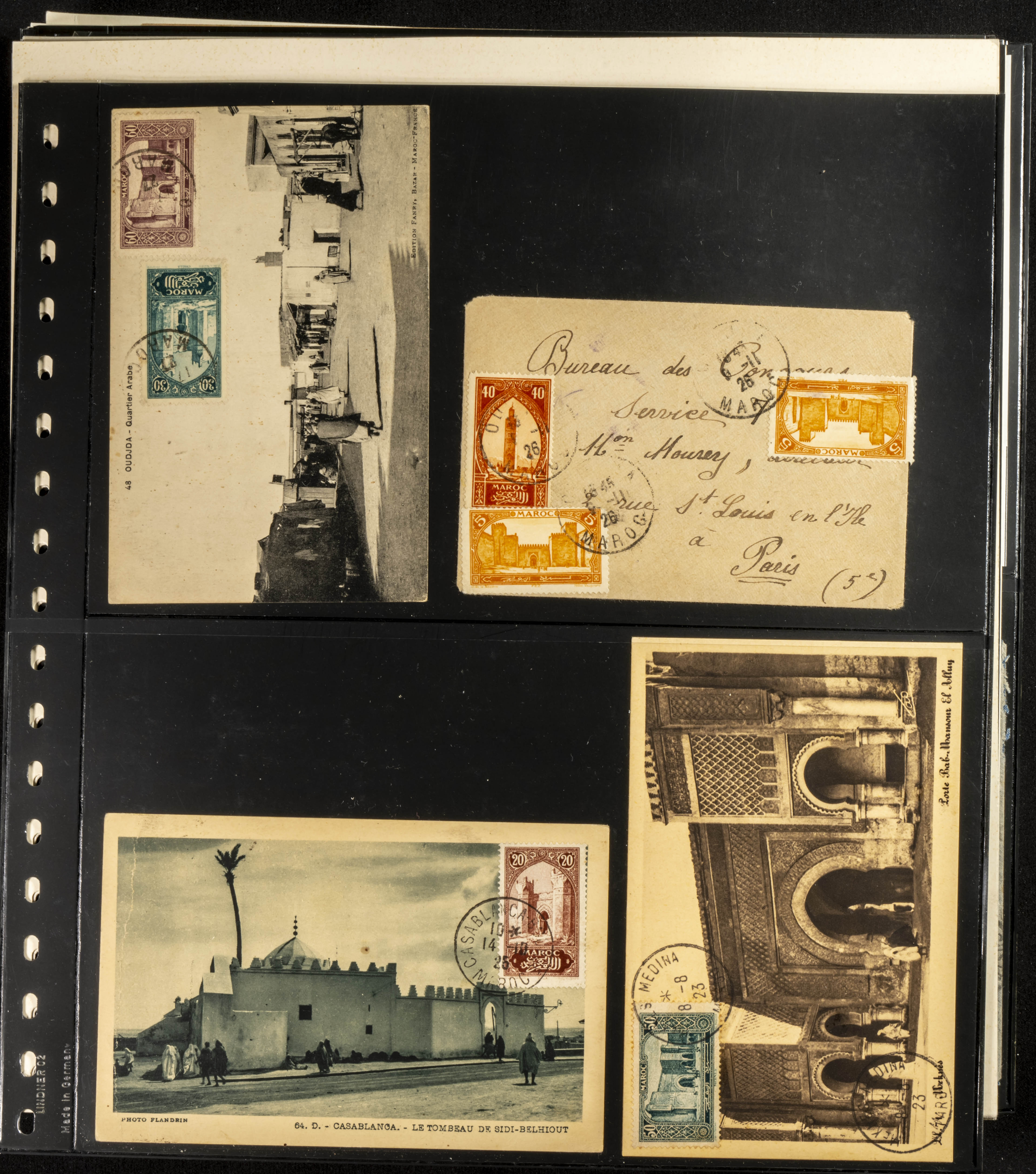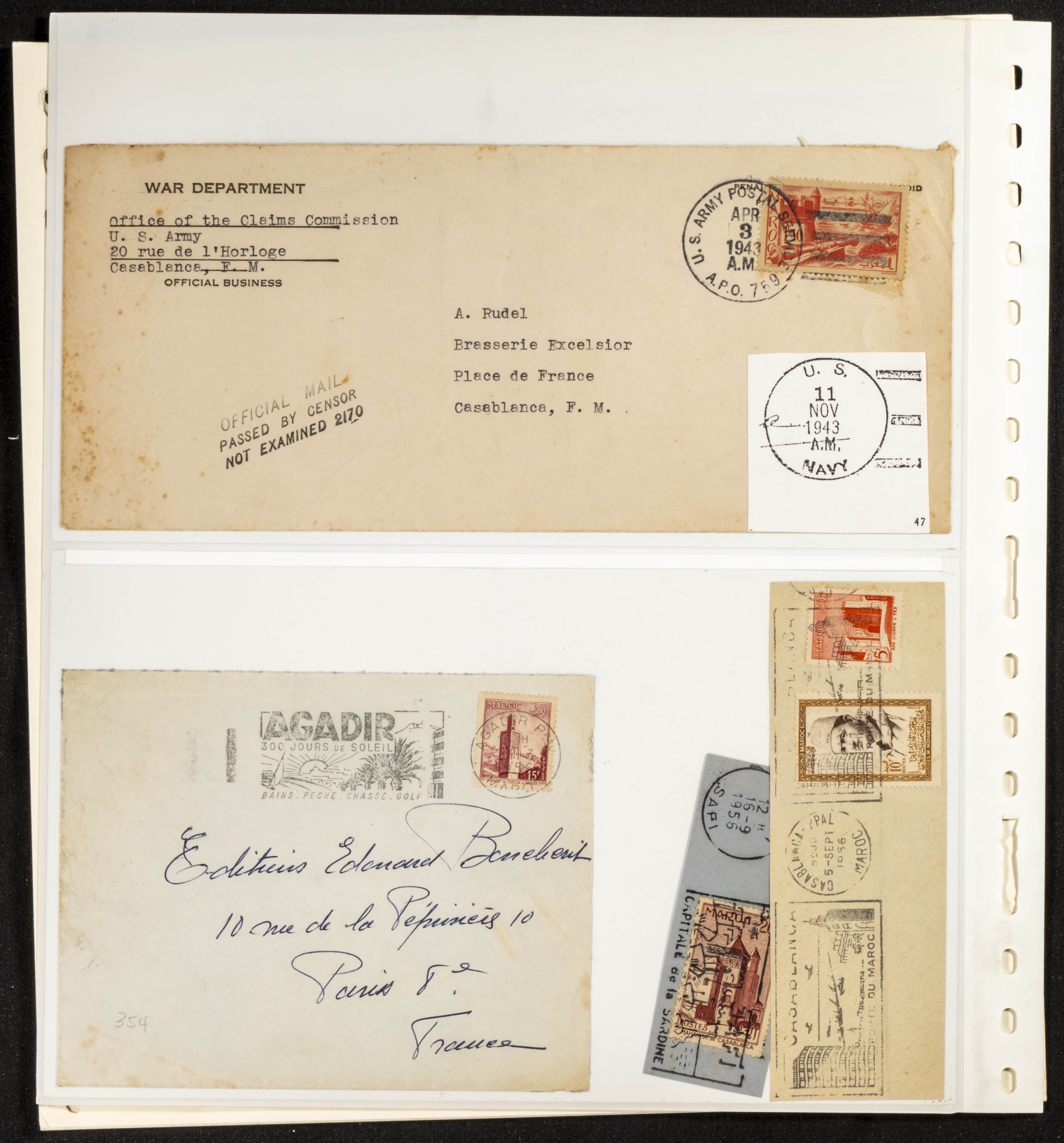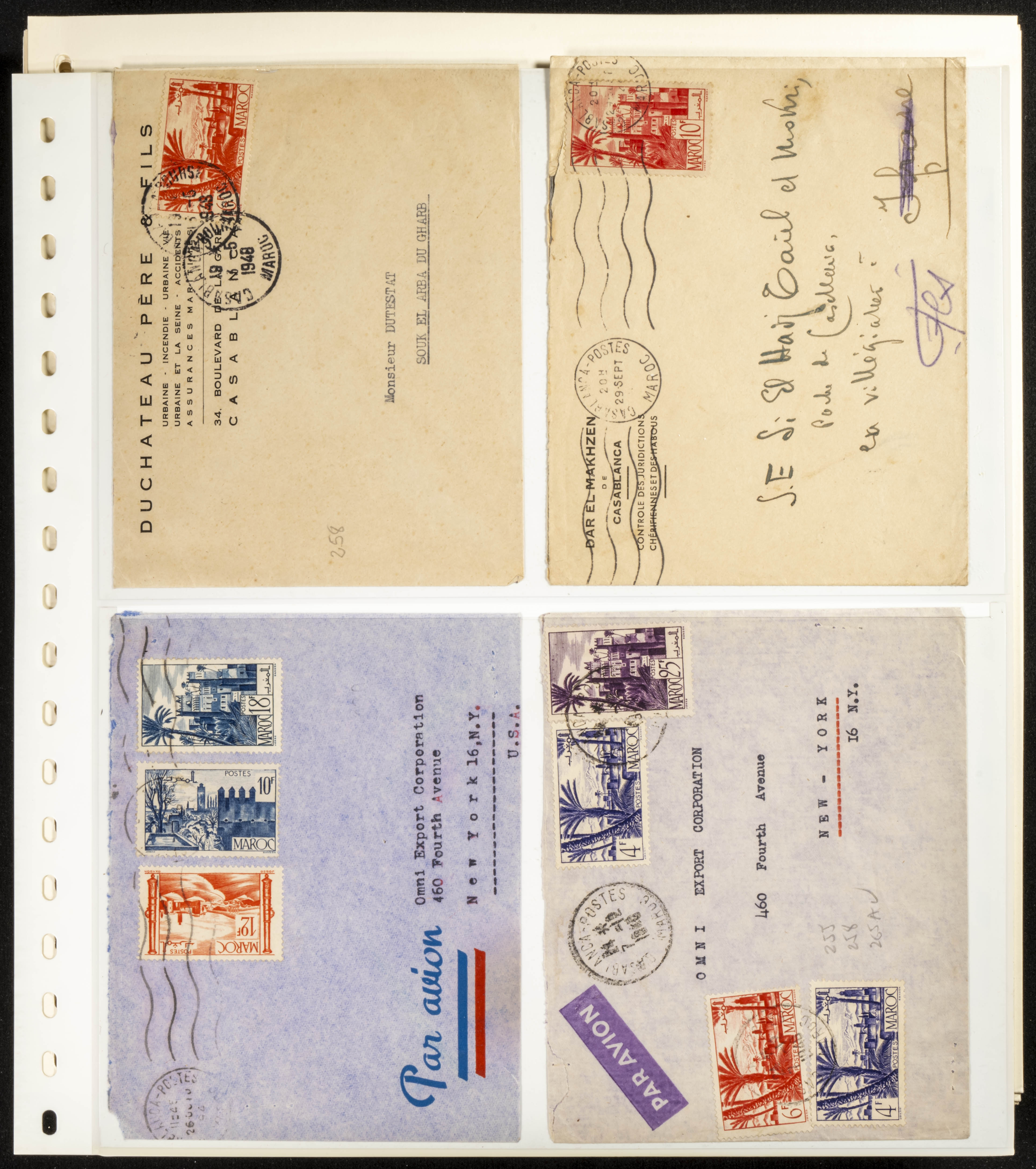 (circa 1891). Spectacular collection of used loose stamps and Postal History of French Morocco between 1891 and 1957. Includes early issues of French stamps with Moroccan postmarks, hundreds of circulated letters and postcards, some sent by registered mail, many with varied letterheads and unusual postage, hundreds of stamps with diverse postmarks (organized by issue alongside the letters), machine-printed postage, airmail, etc. EXAMINATION IS ESSENTIAL.