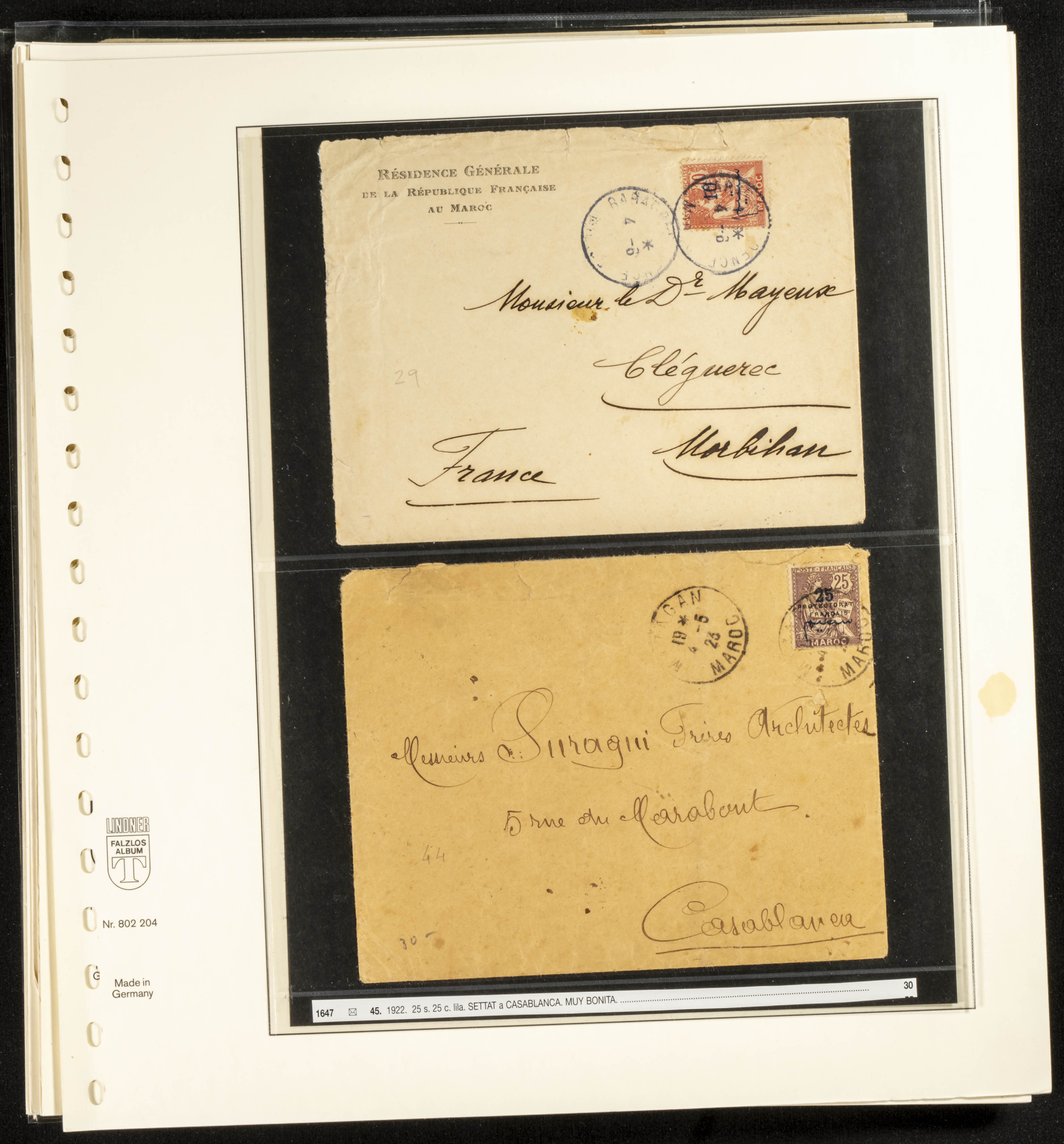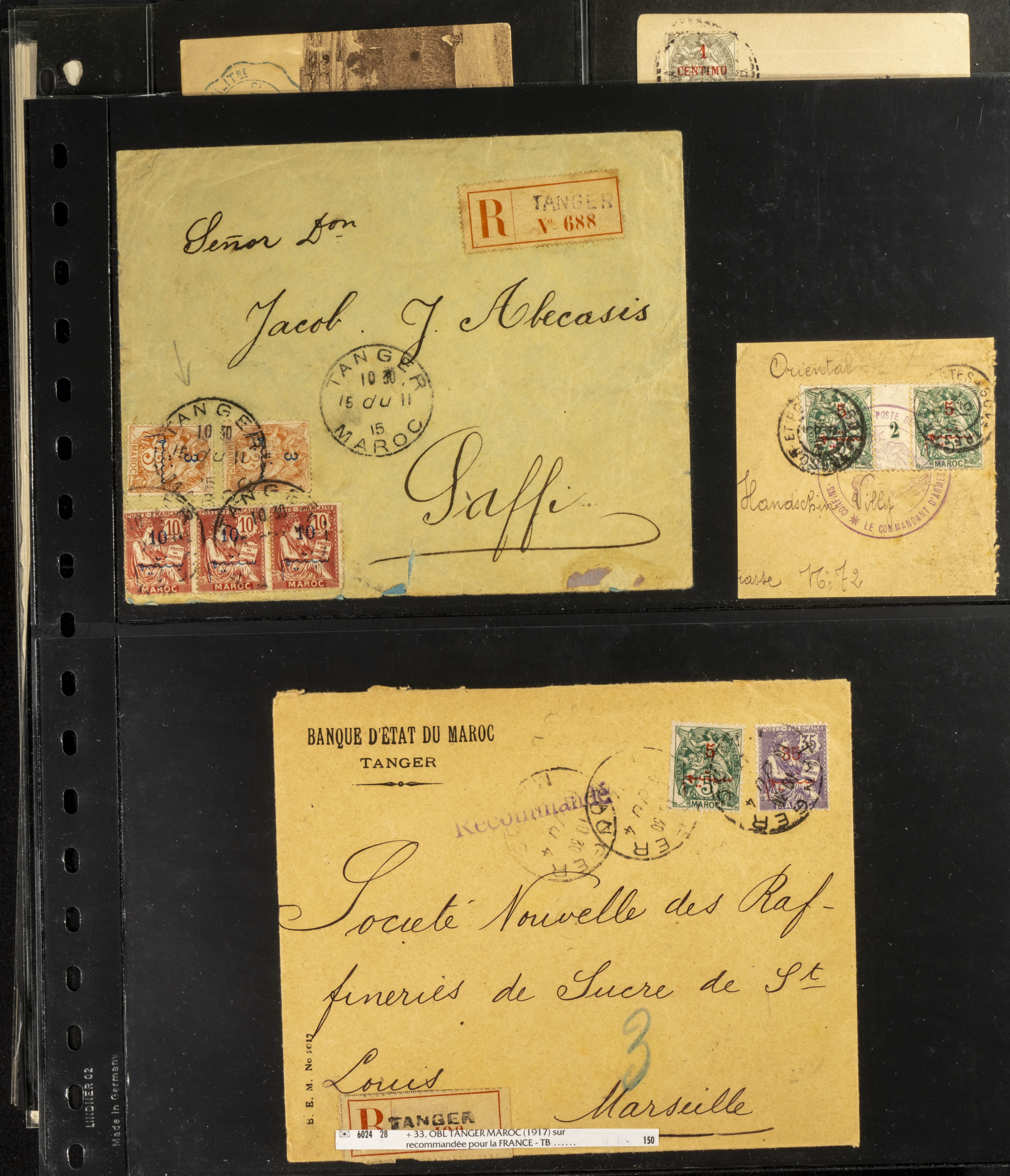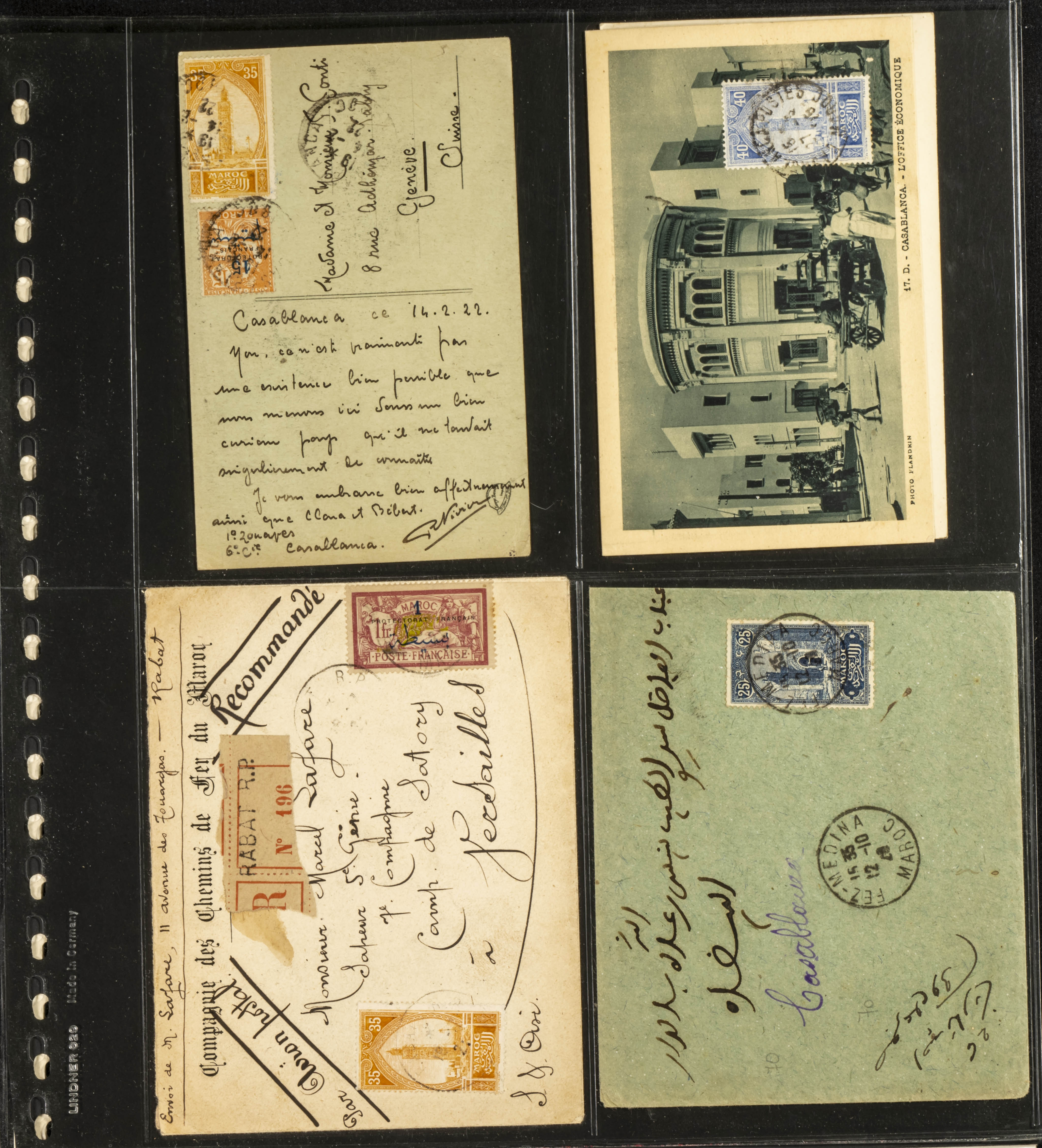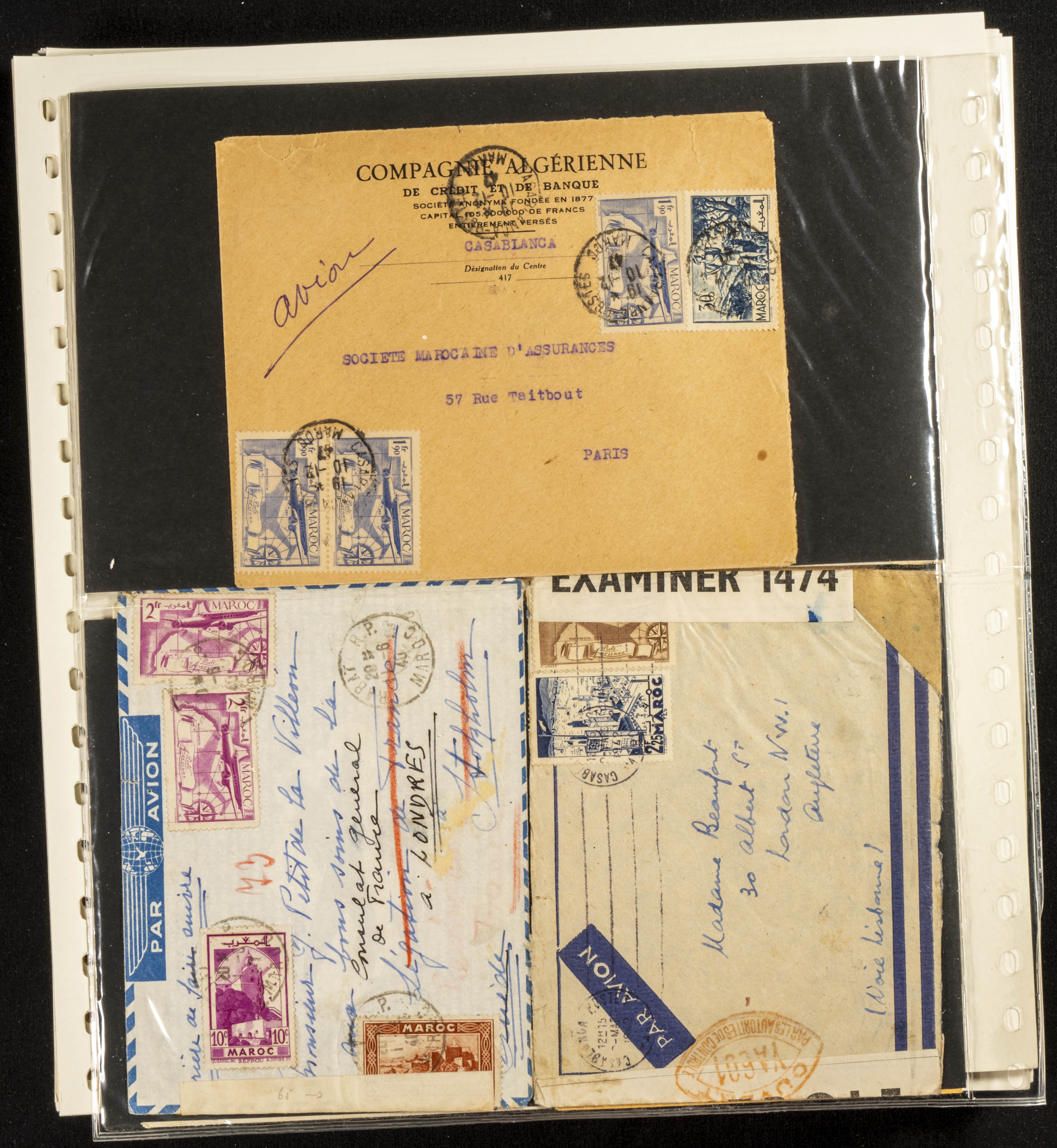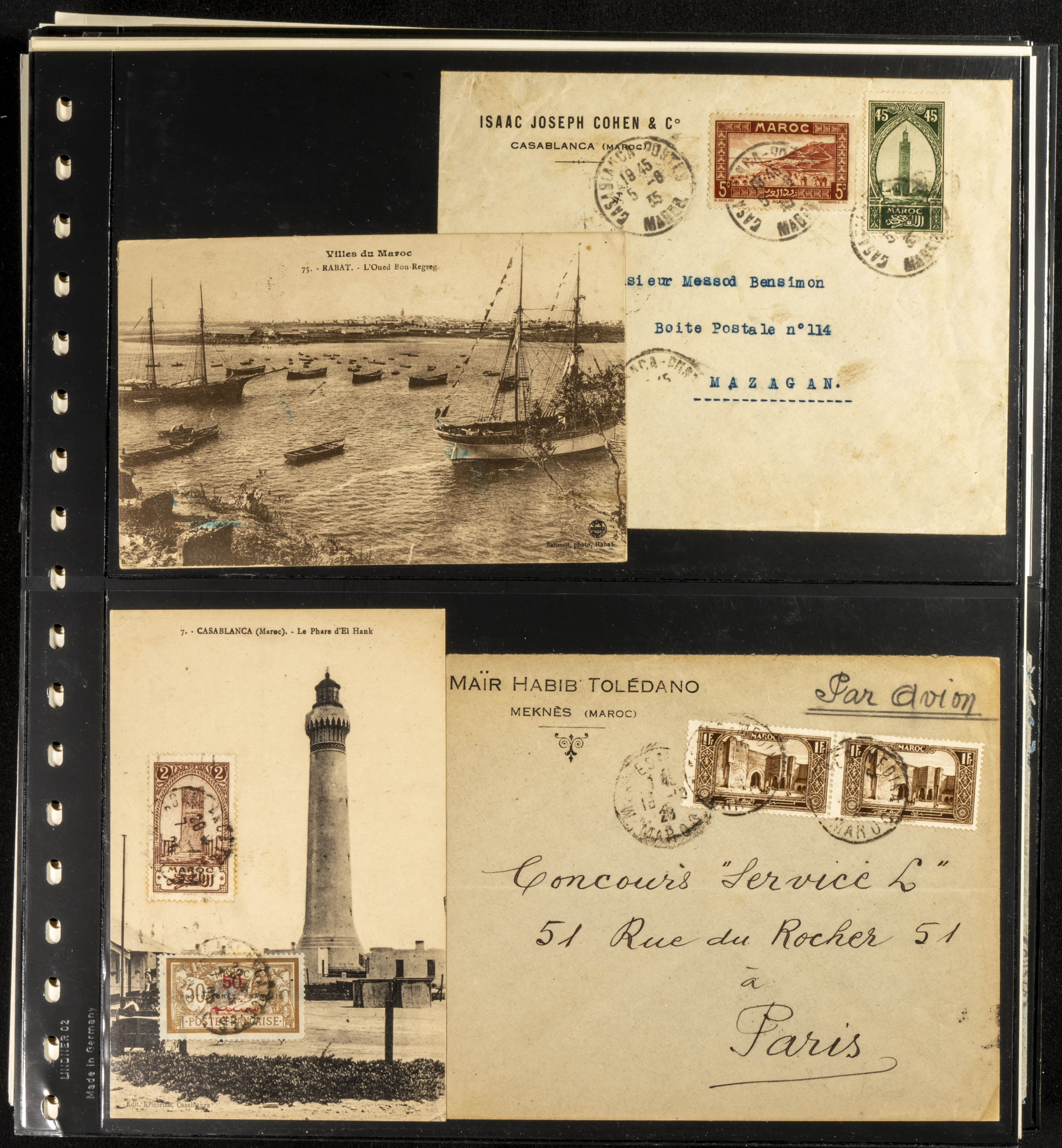 (circa 1891). Spectacular collection of used loose stamps and Postal History of French Morocco between 1891 and 1957. Includes early issues of French stamps with Moroccan postmarks, hundreds of circulated letters and postcards, some sent by registered mail, many with varied letterheads and unusual postage, hundreds of stamps with diverse postmarks (organized by issue alongside the letters), machine-printed postage, airmail, etc. EXAMINATION IS ESSENTIAL.