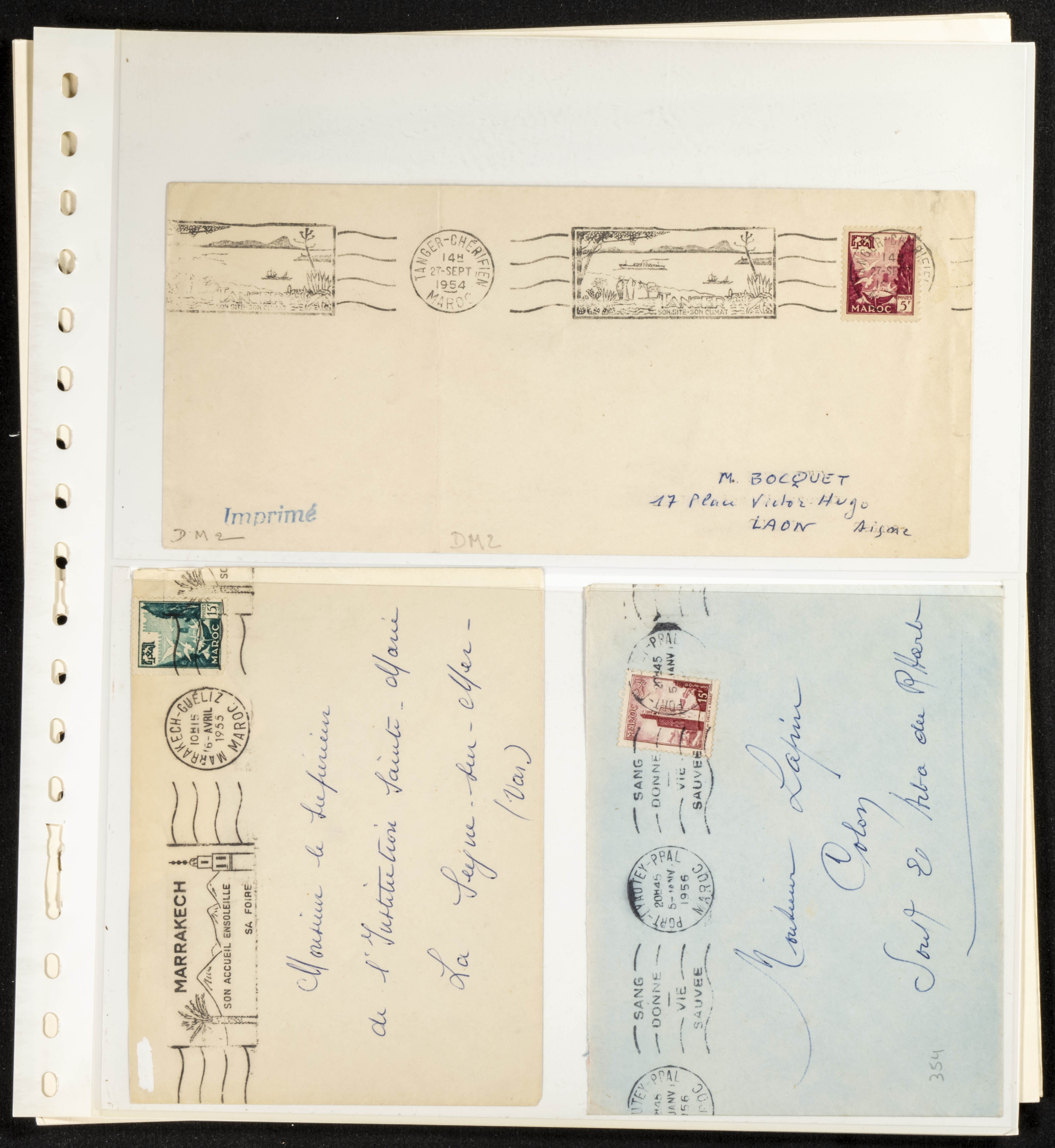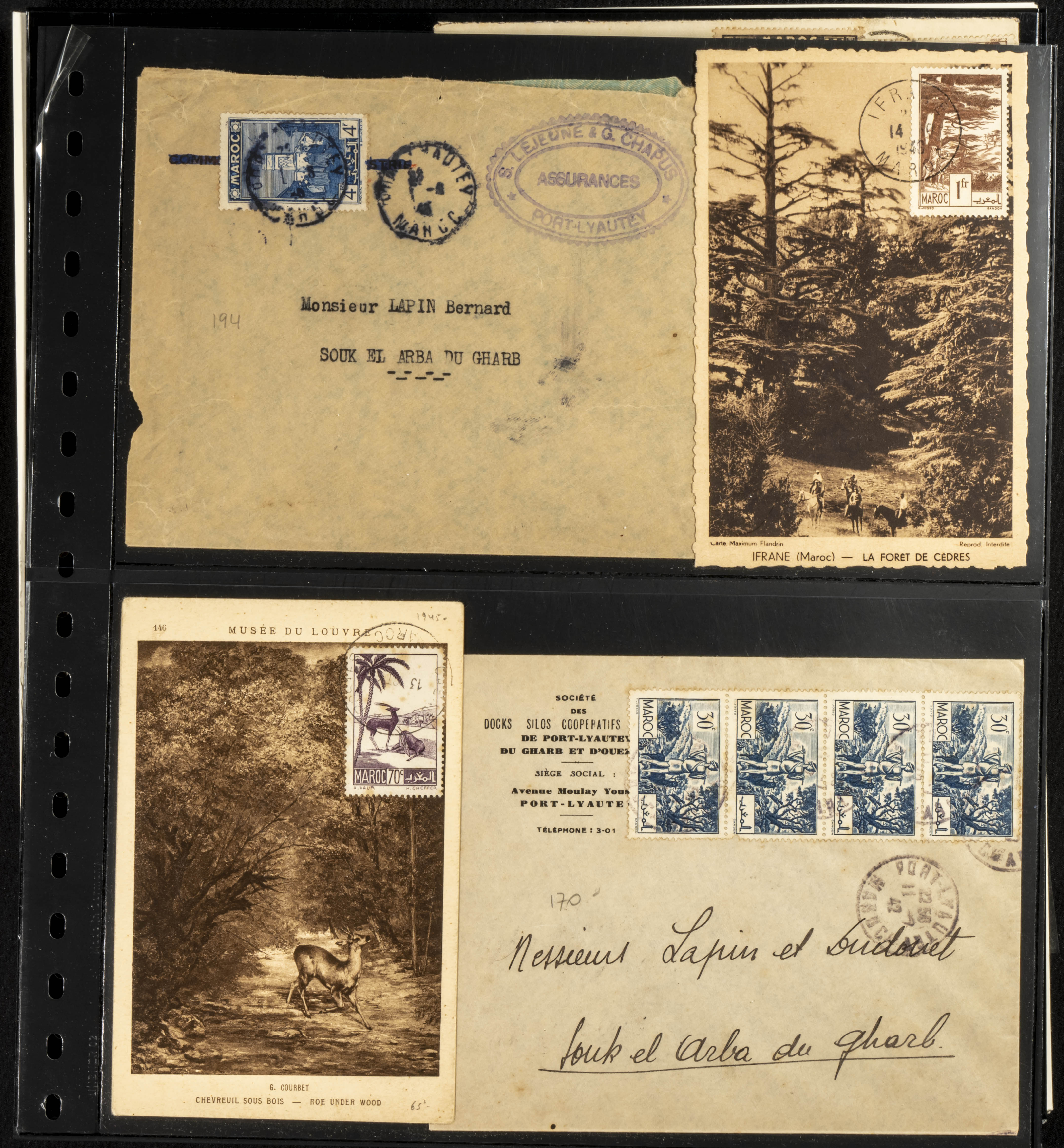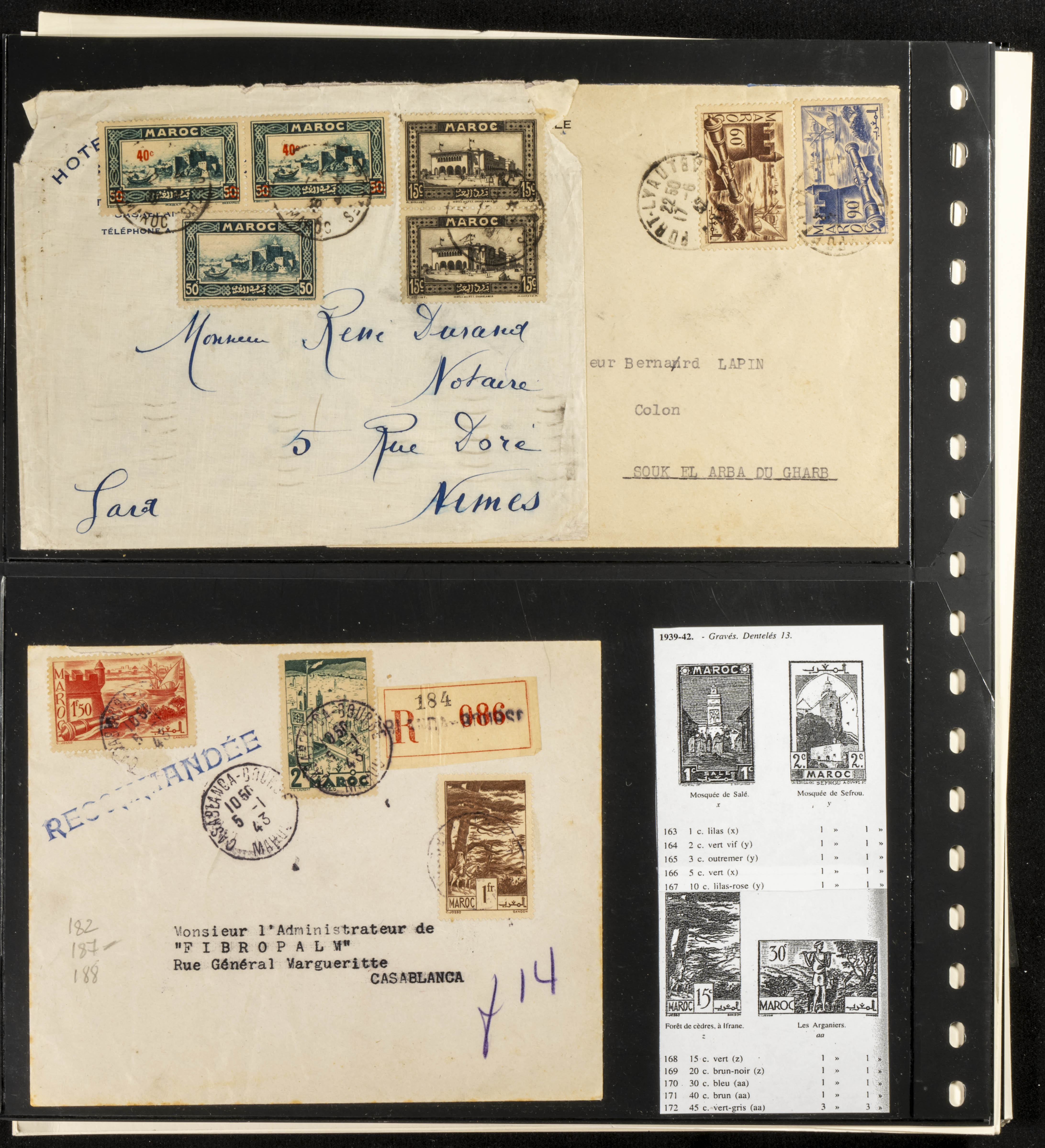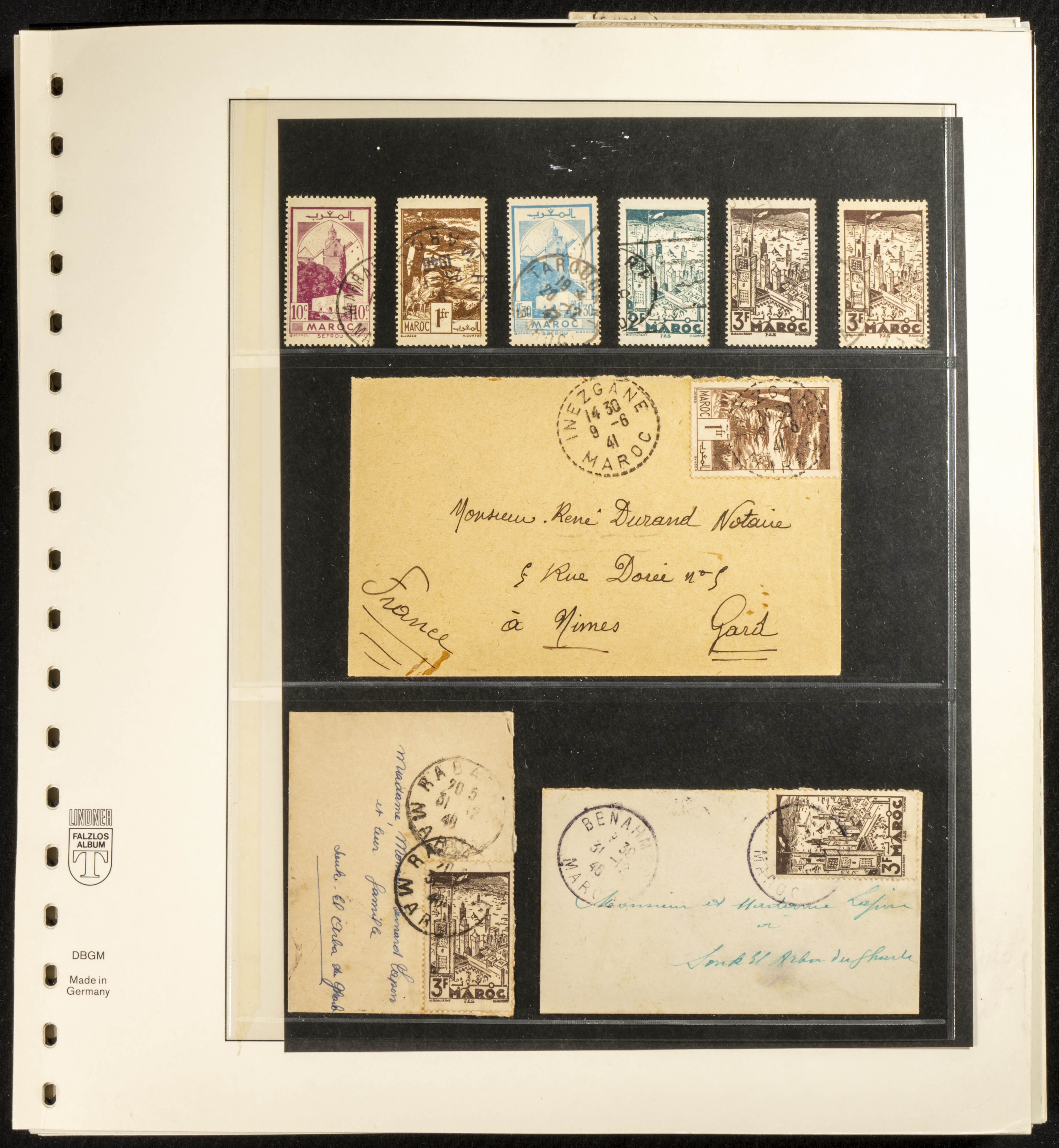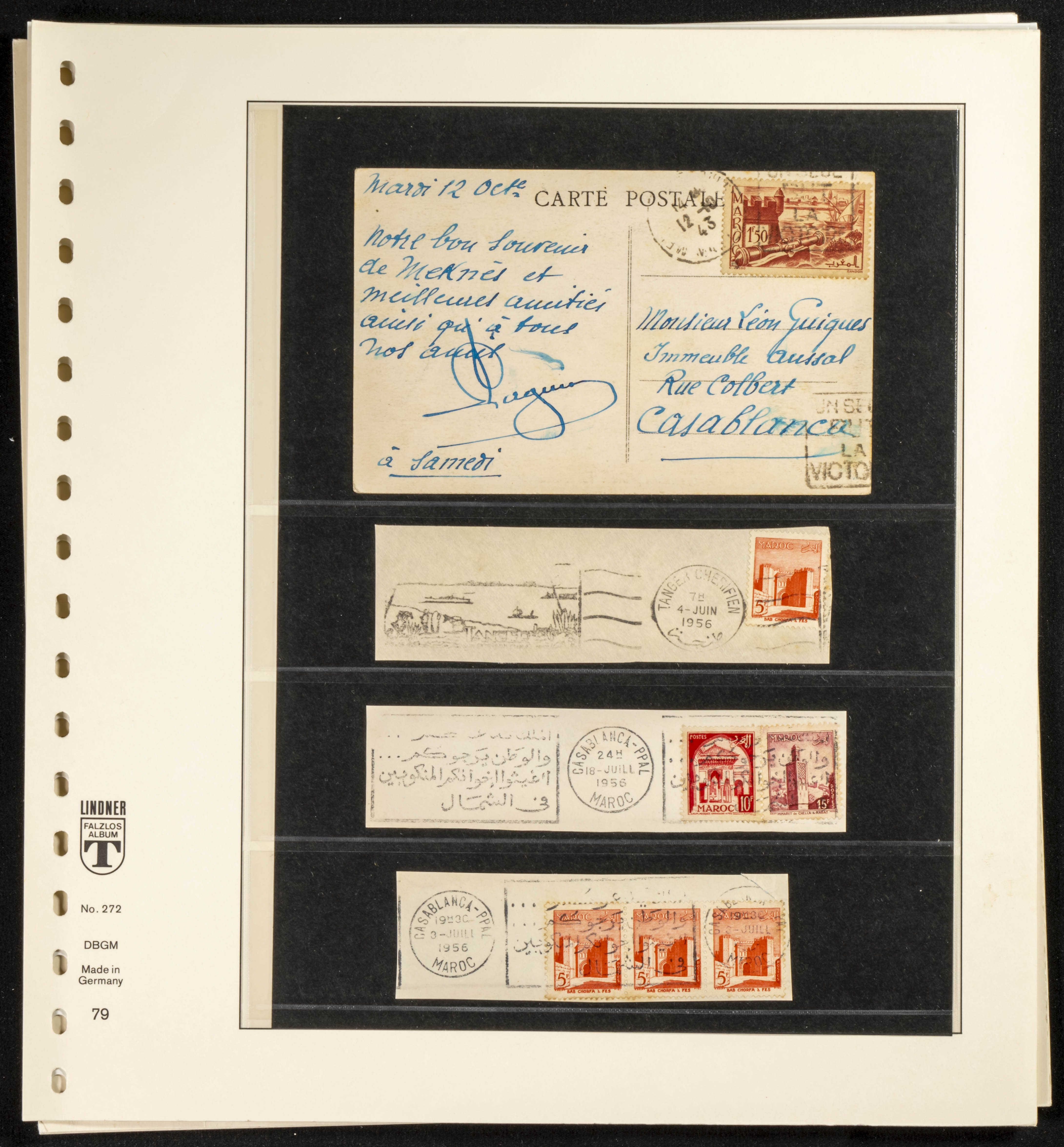 (circa 1891). Spectacular collection of used loose stamps and Postal History of French Morocco between 1891 and 1957. Includes early issues of French stamps with Moroccan postmarks, hundreds of circulated letters and postcards, some sent by registered mail, many with varied letterheads and unusual postage, hundreds of stamps with diverse postmarks (organized by issue alongside the letters), machine-printed postage, airmail, etc. EXAMINATION IS ESSENTIAL.
