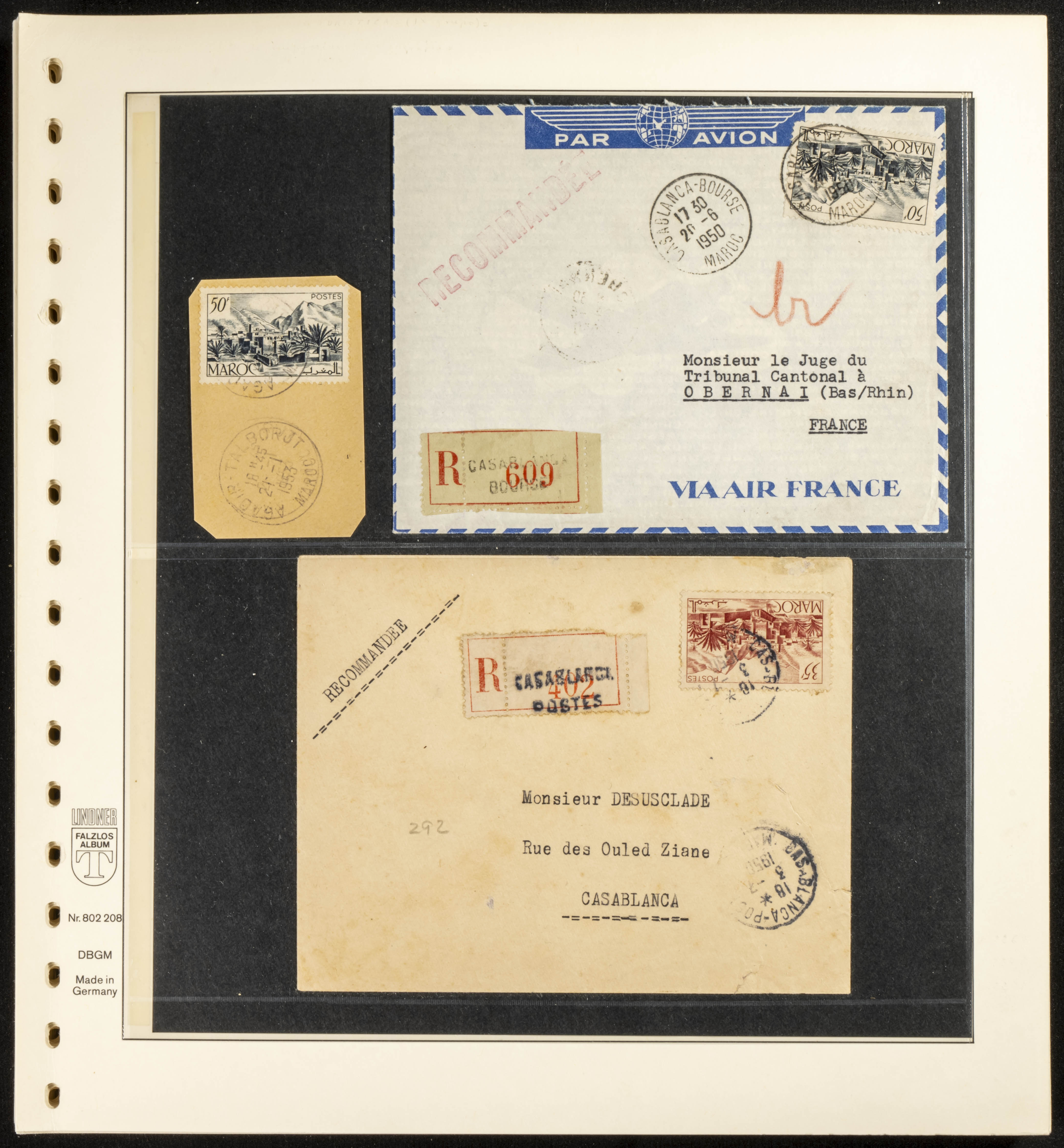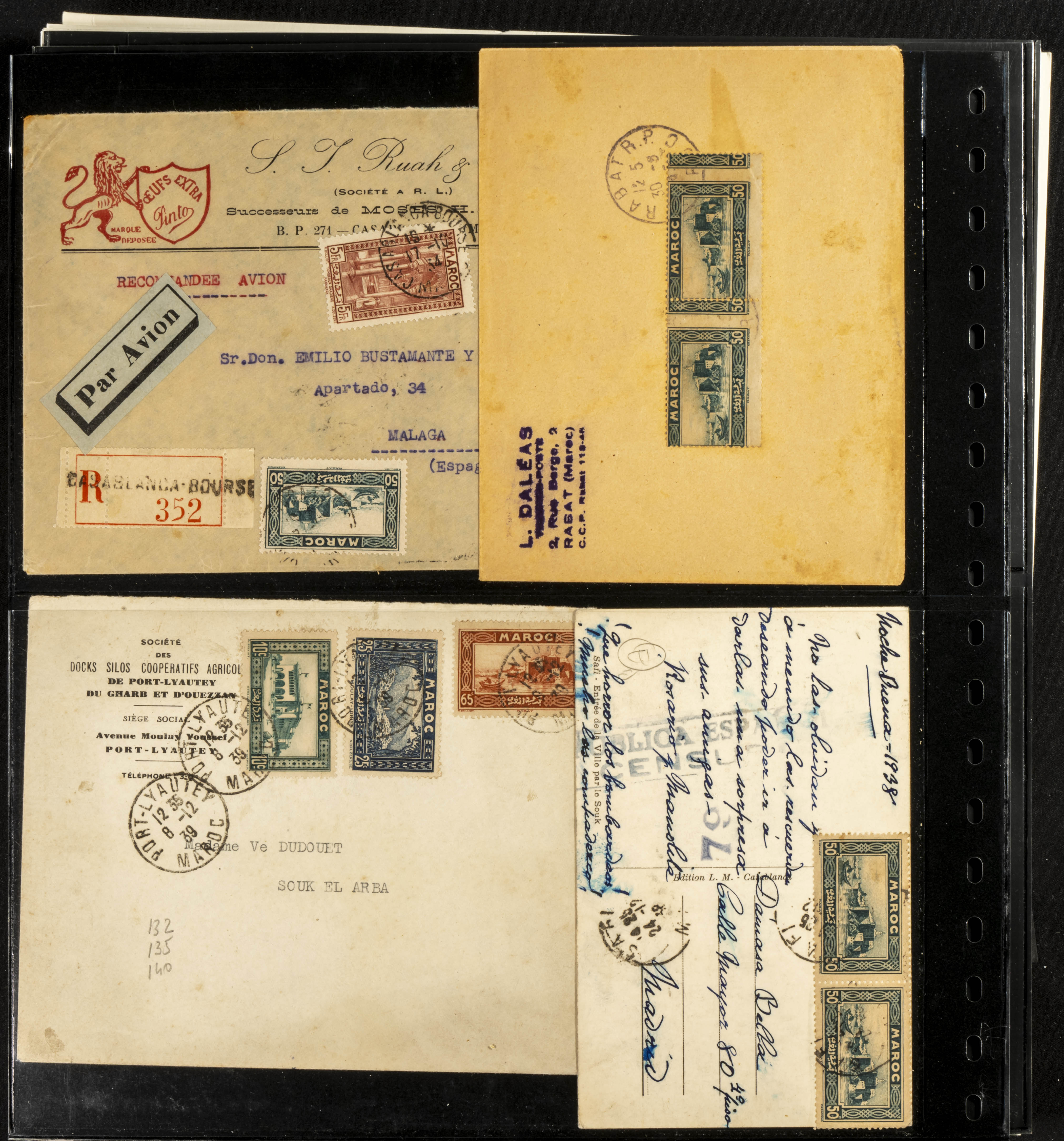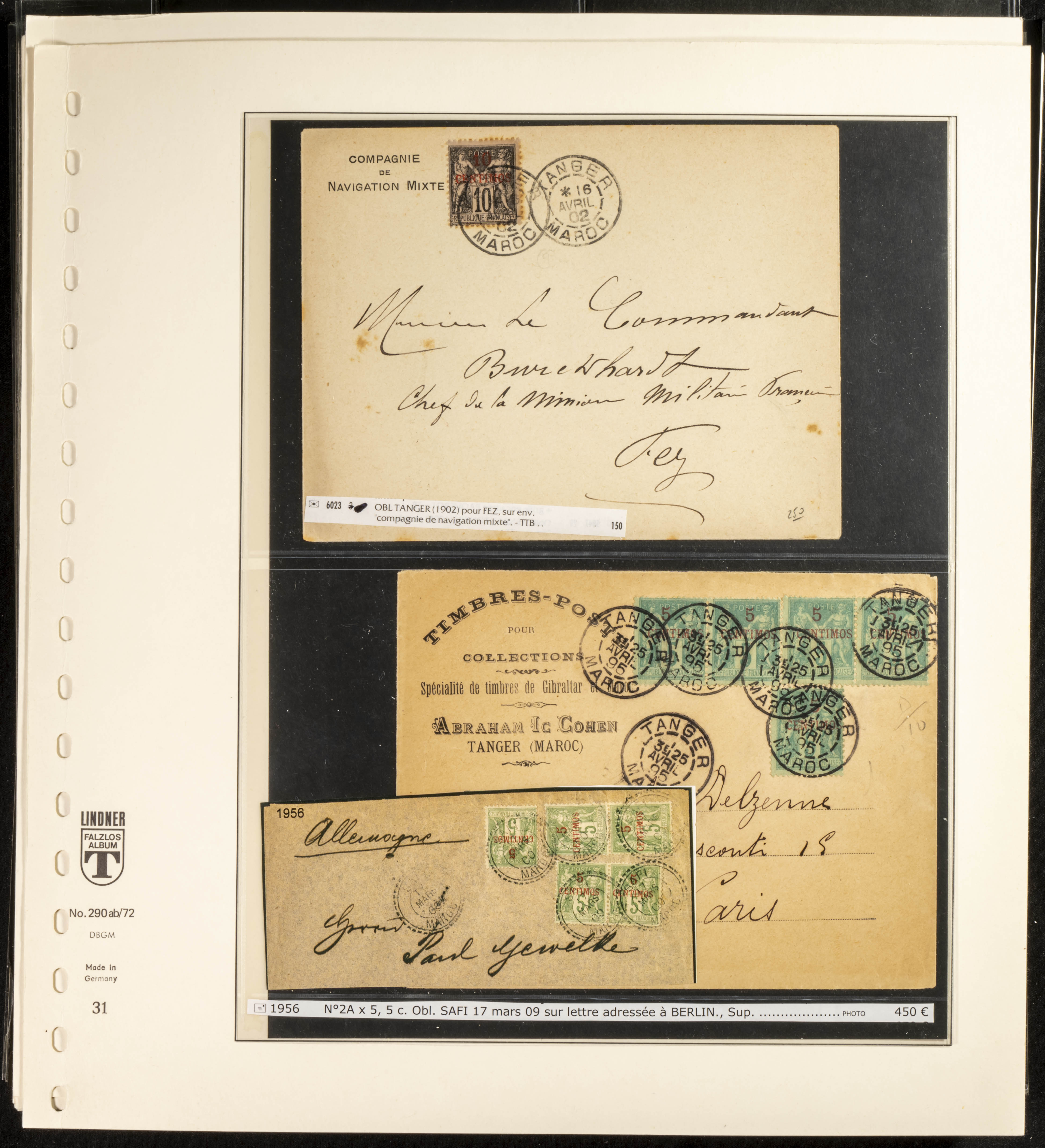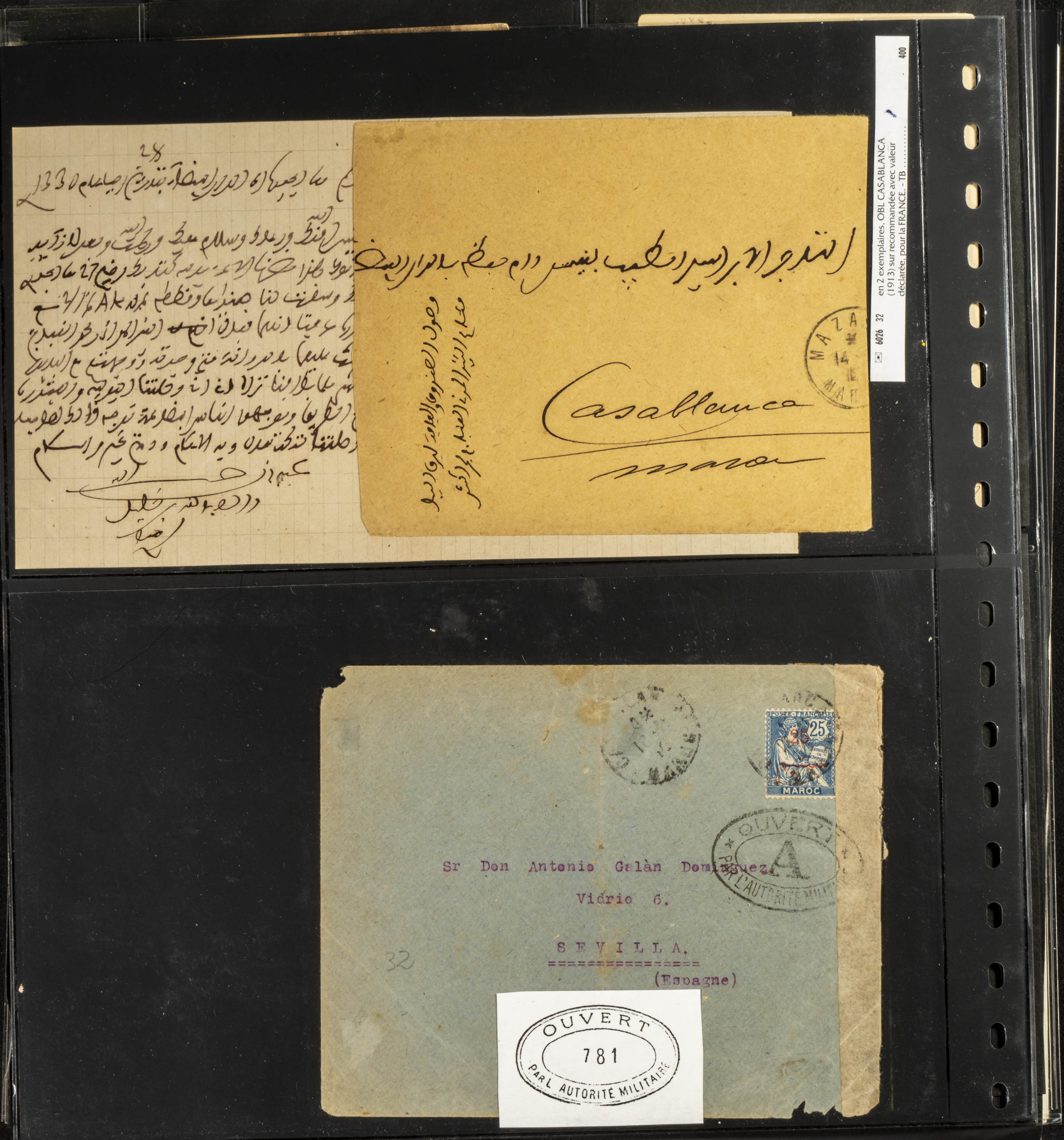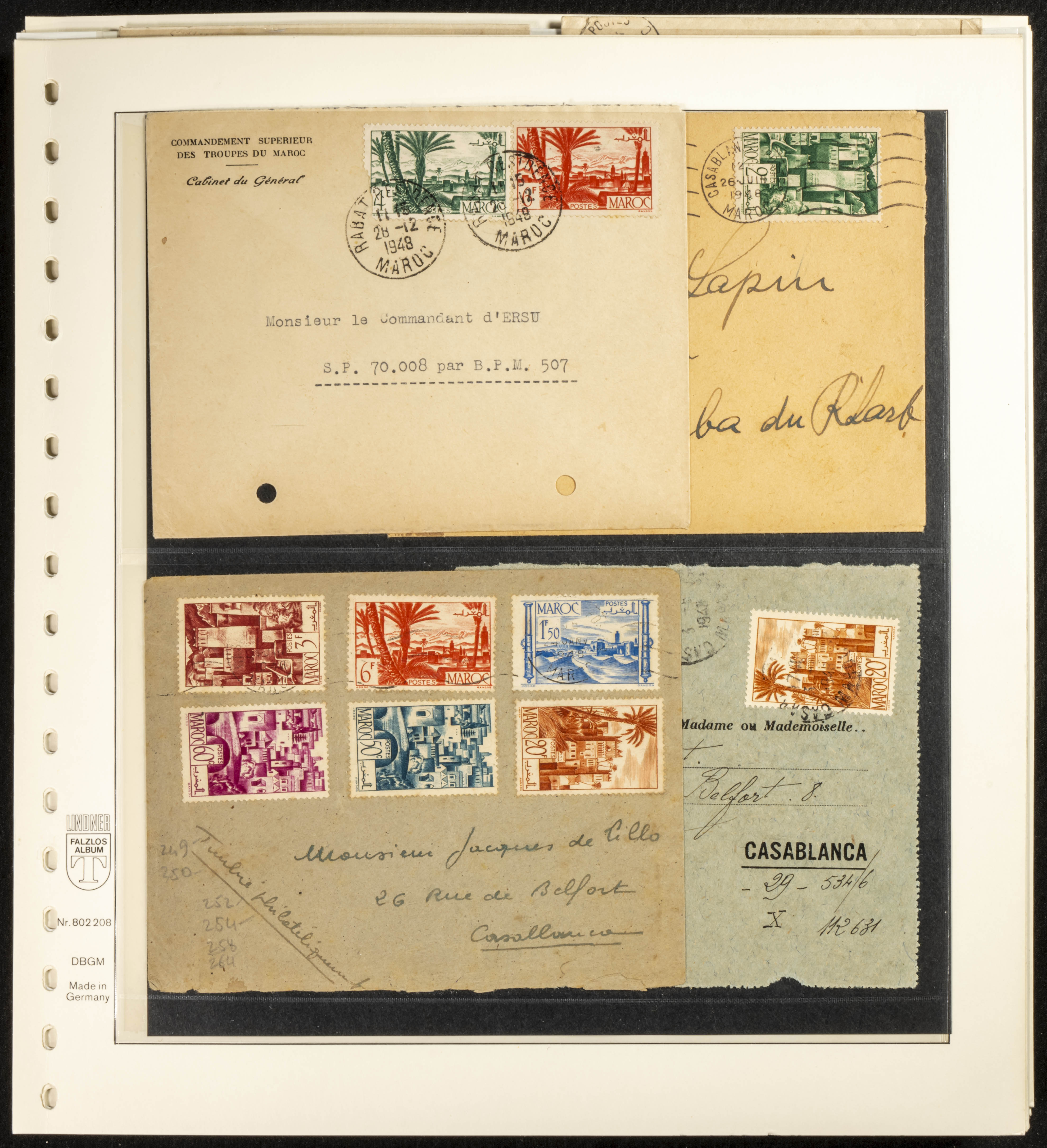 (circa 1891). Spectacular collection of used loose stamps and Postal History of French Morocco between 1891 and 1957. Includes early issues of French stamps with Moroccan postmarks, hundreds of circulated letters and postcards, some sent by registered mail, many with varied letterheads and unusual postage, hundreds of stamps with diverse postmarks (organized by issue alongside the letters), machine-printed postage, airmail, etc. EXAMINATION IS ESSENTIAL.