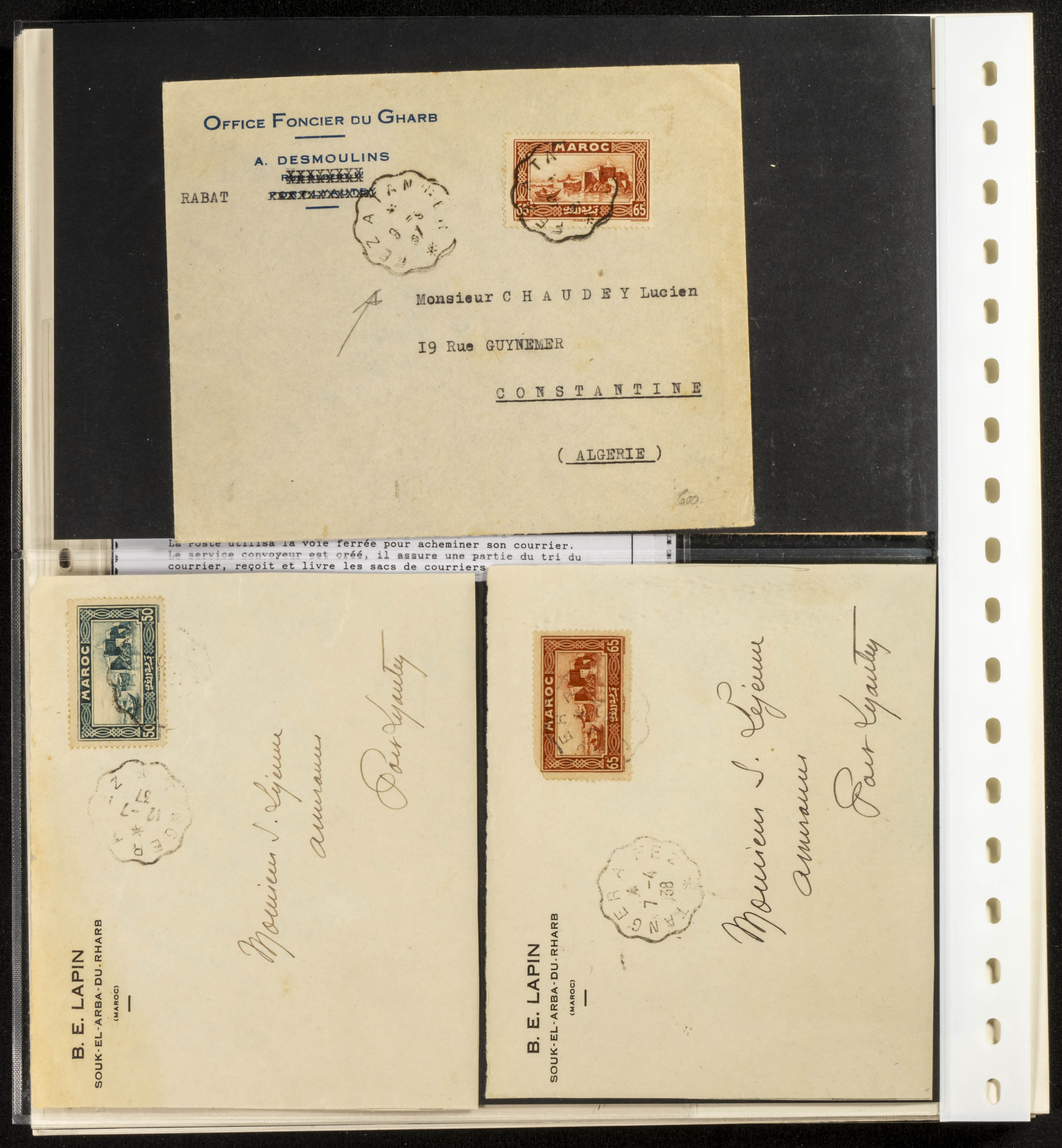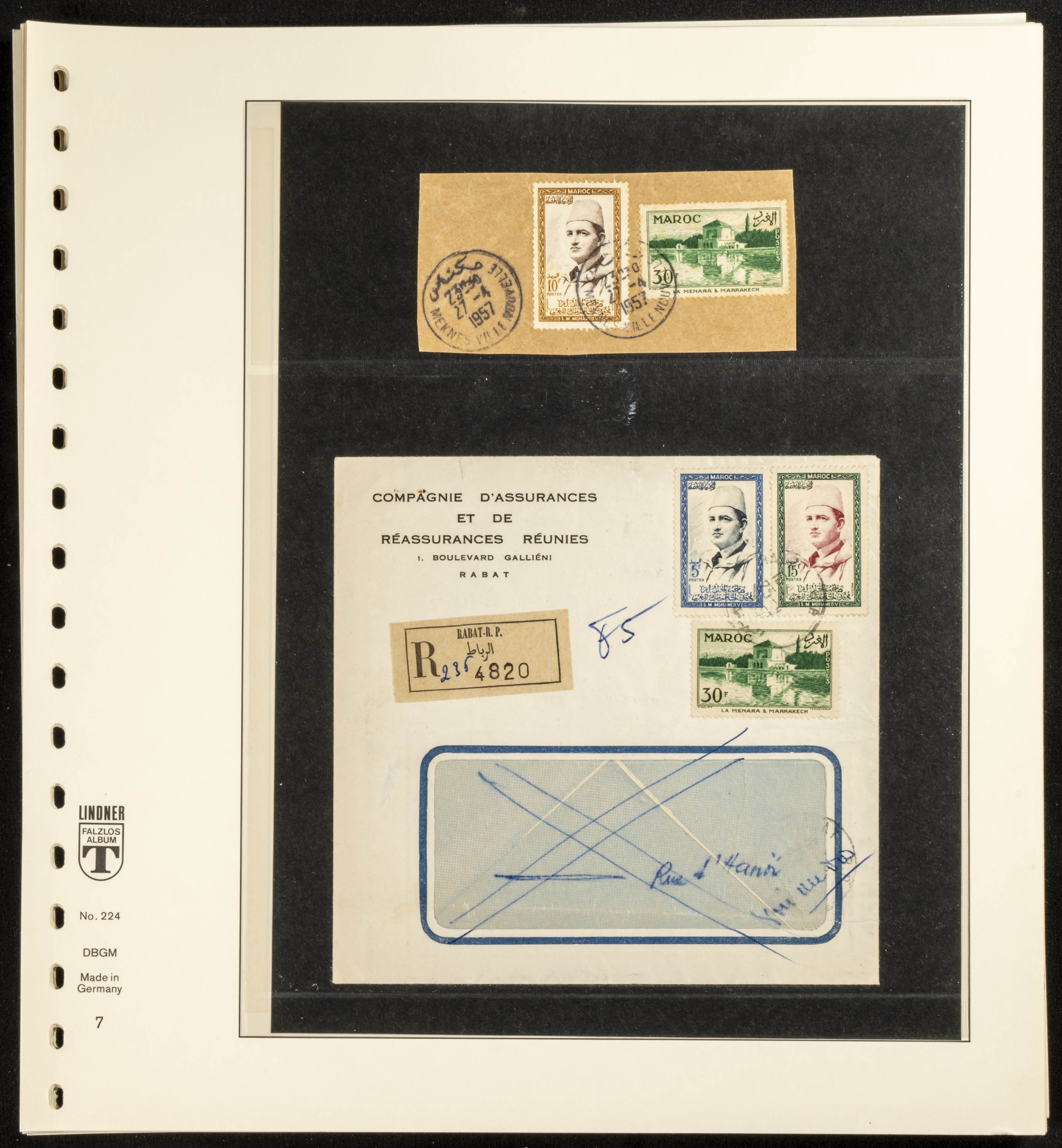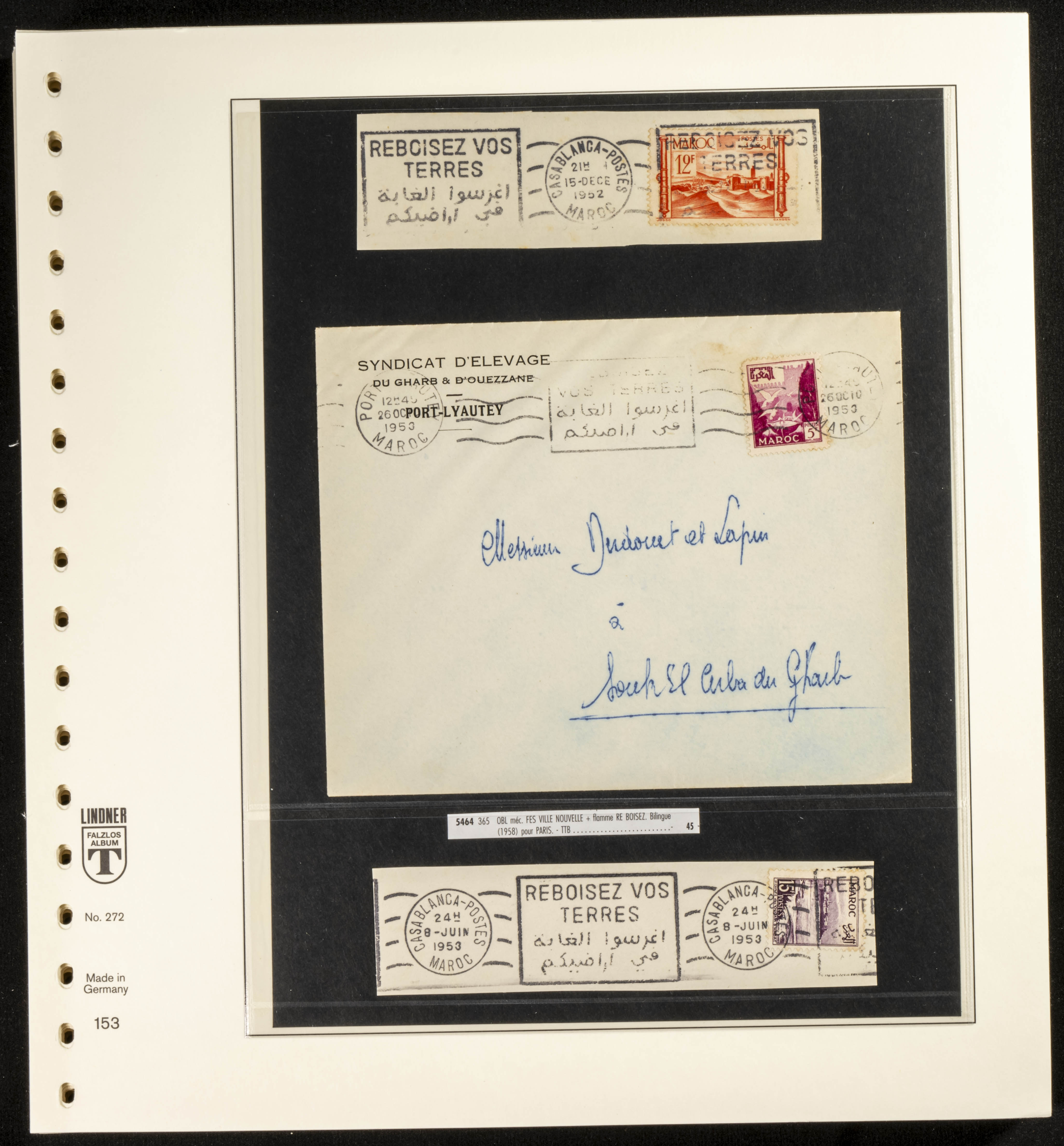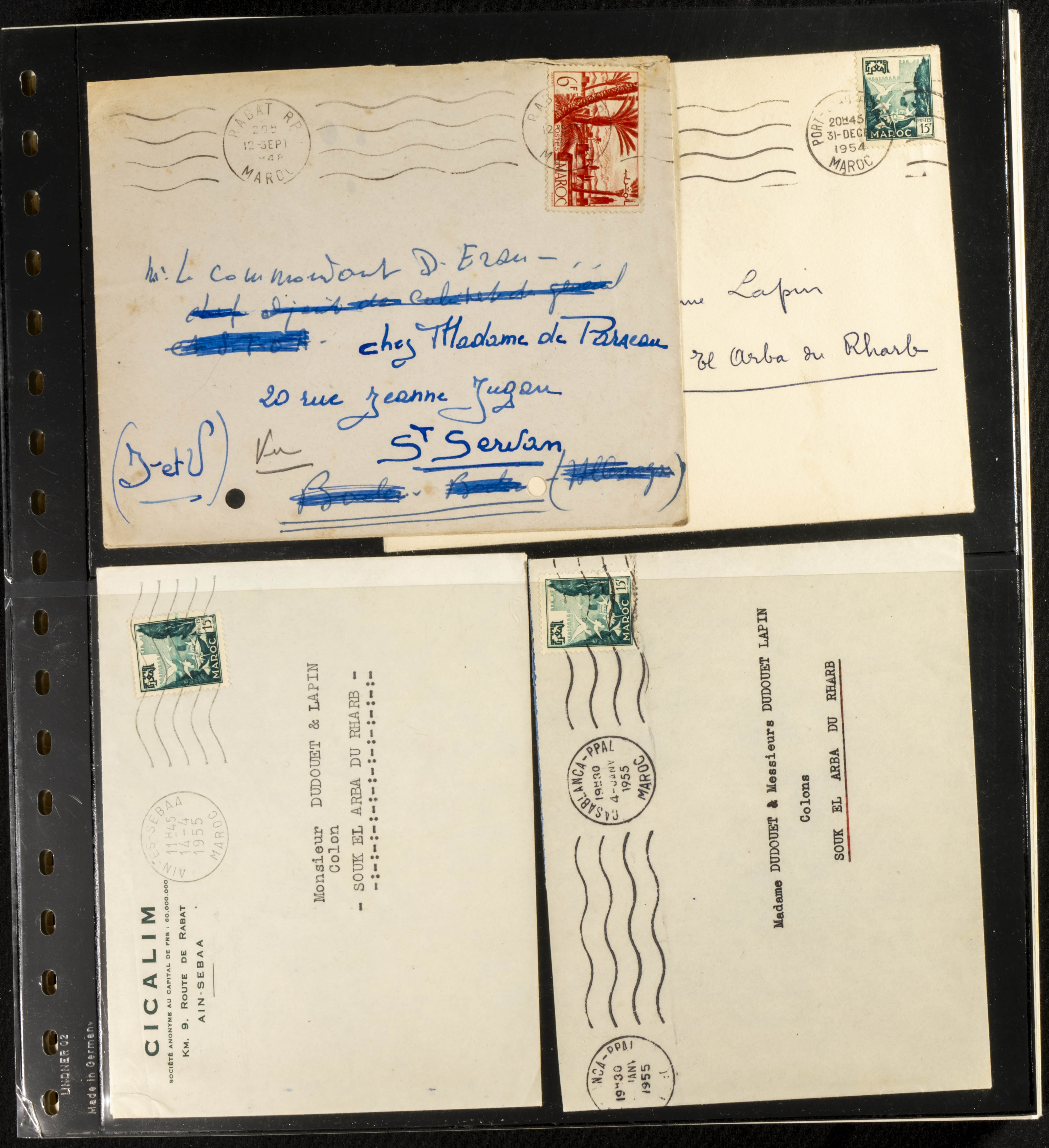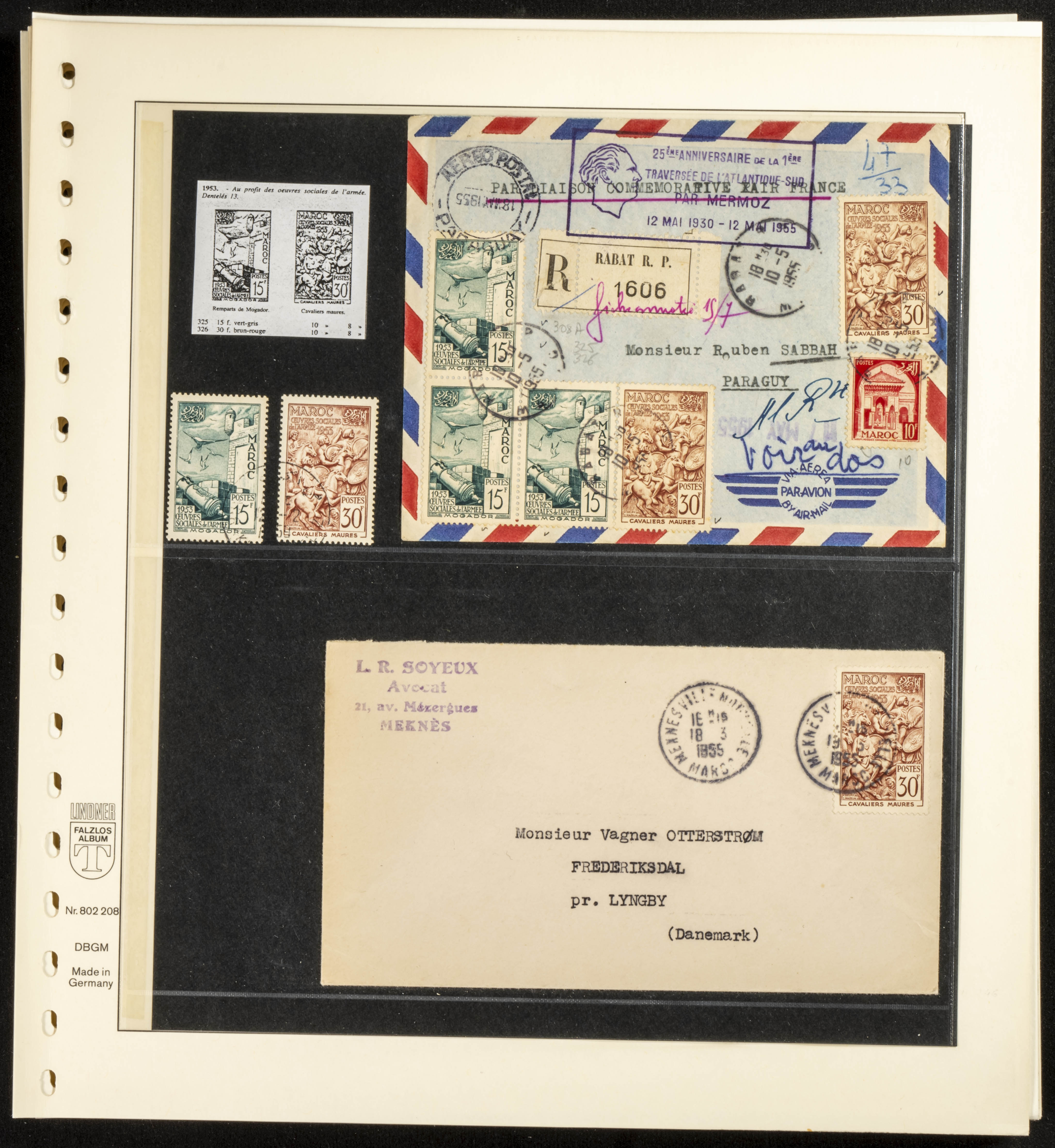 (circa 1891). Spectacular collection of used loose stamps and Postal History of French Morocco between 1891 and 1957. Includes early issues of French stamps with Moroccan postmarks, hundreds of circulated letters and postcards, some sent by registered mail, many with varied letterheads and unusual postage, hundreds of stamps with diverse postmarks (organized by issue alongside the letters), machine-printed postage, airmail, etc. EXAMINATION IS ESSENTIAL.
